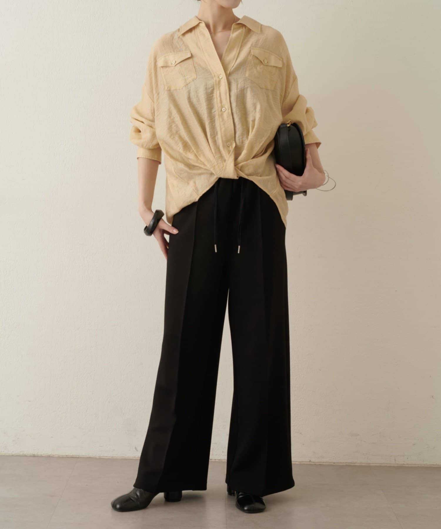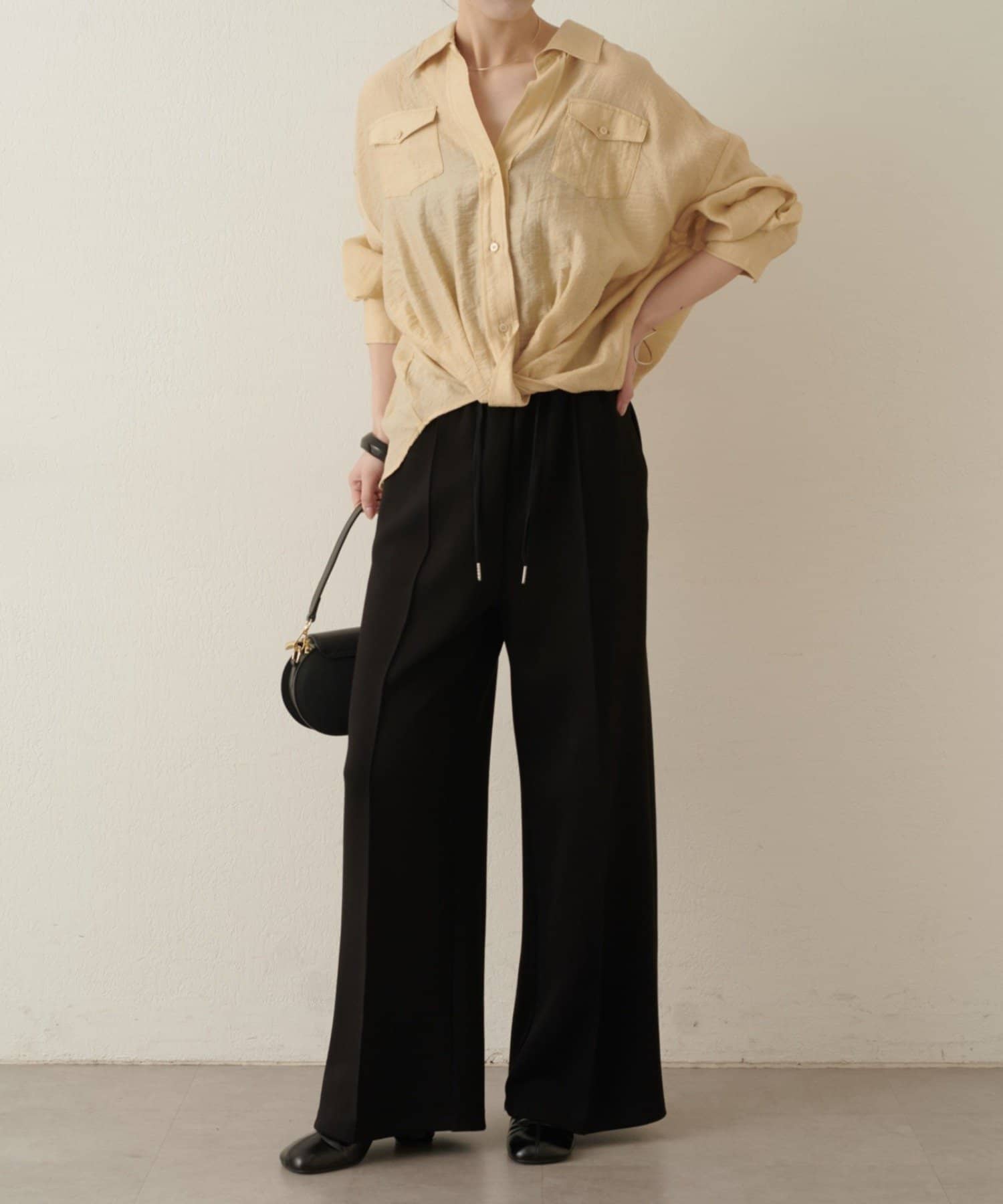 ・ウエストのツイストデザインとが、一枚でこなれ感あるコーディネートを演出します。