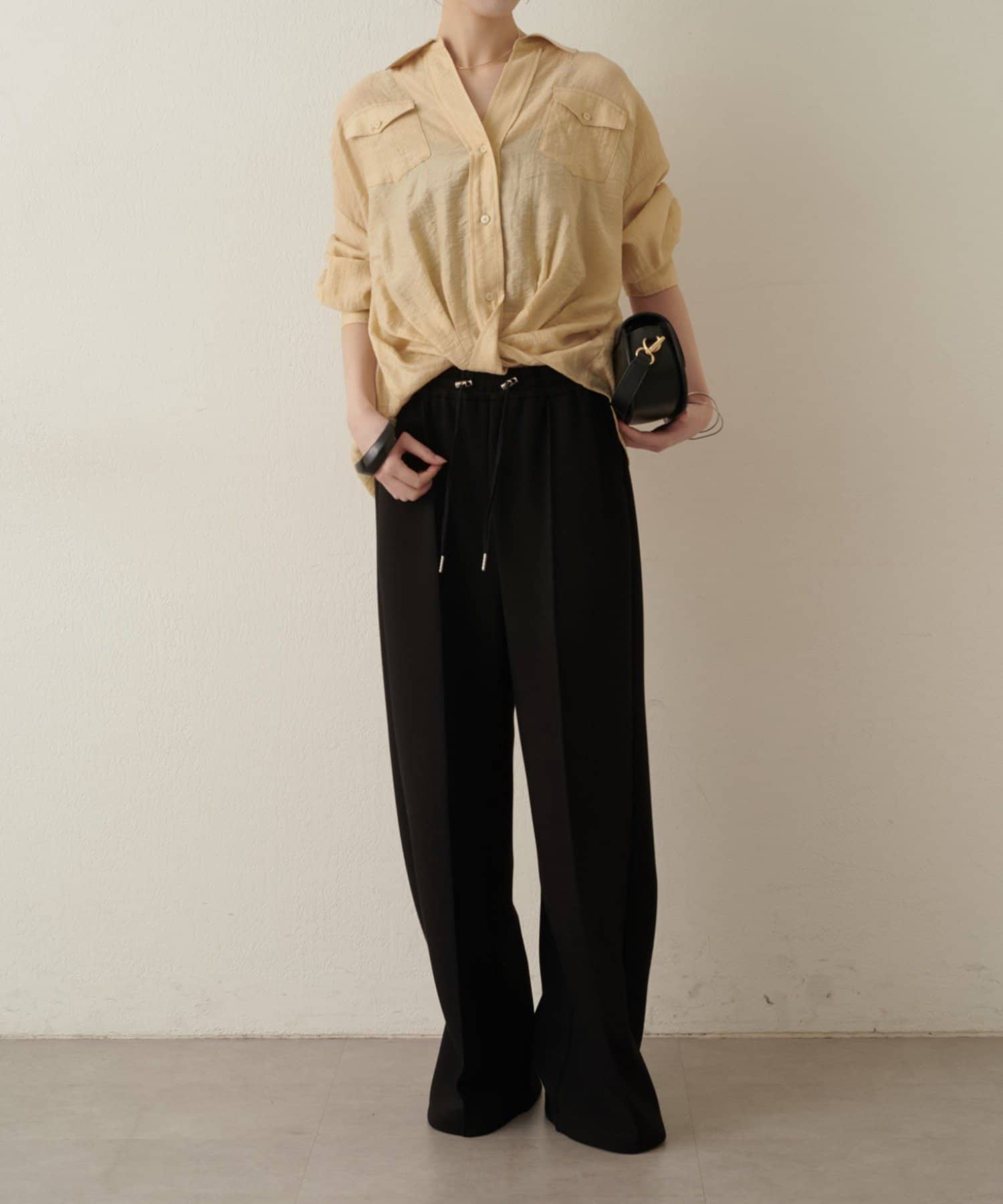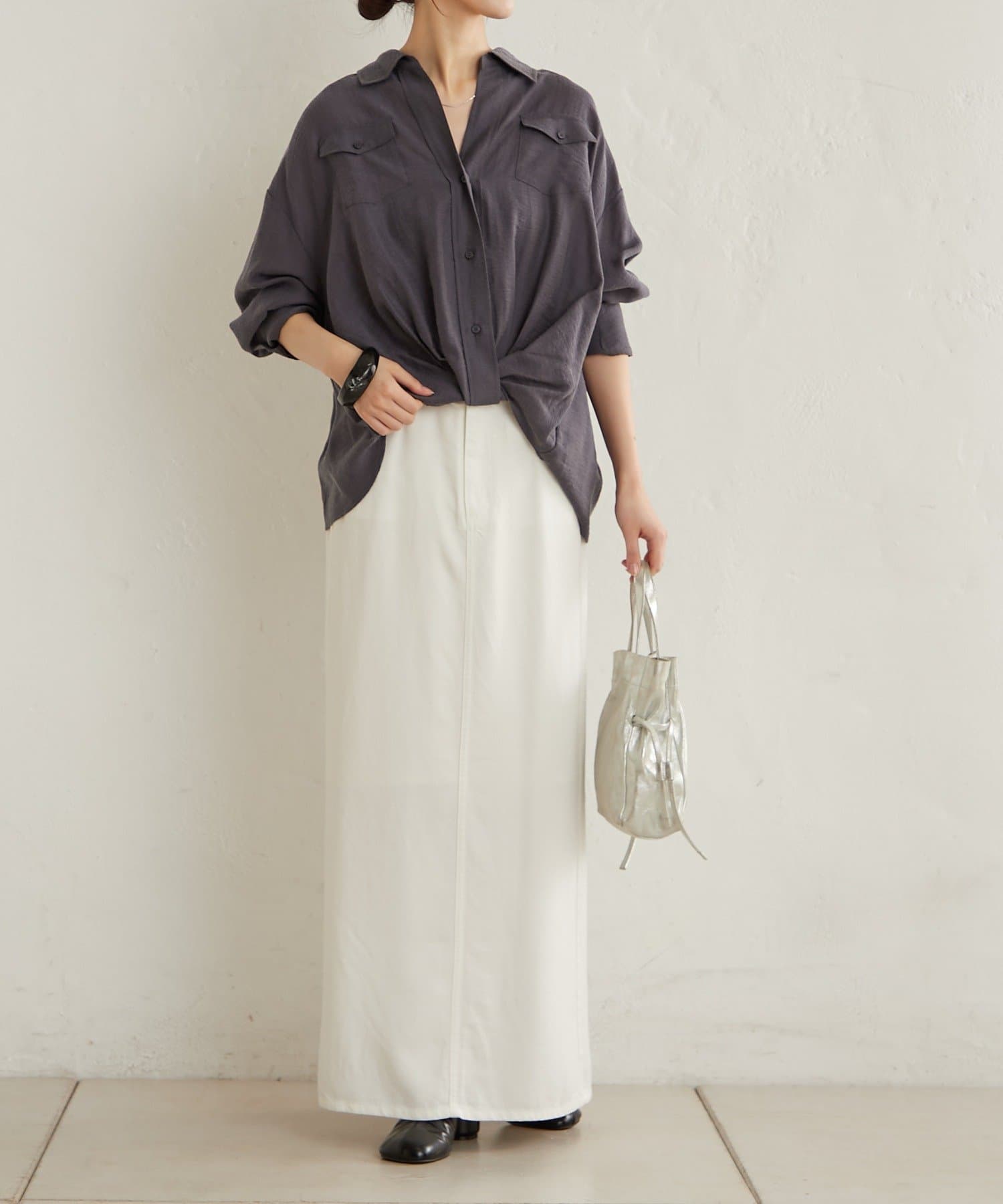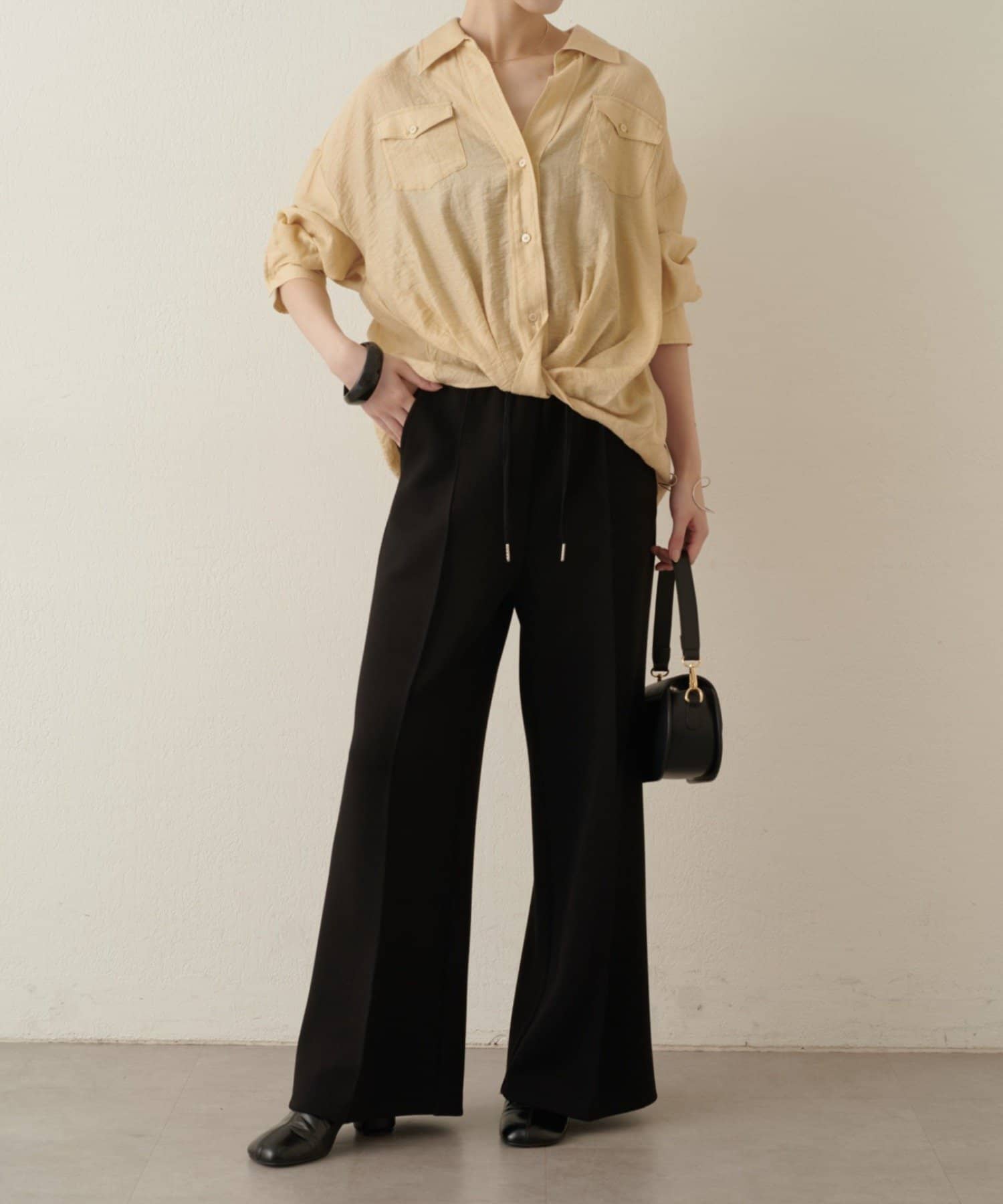 ・ウエストのツイストデザインとが、一枚でこなれ感あるコーディネートを演出します。