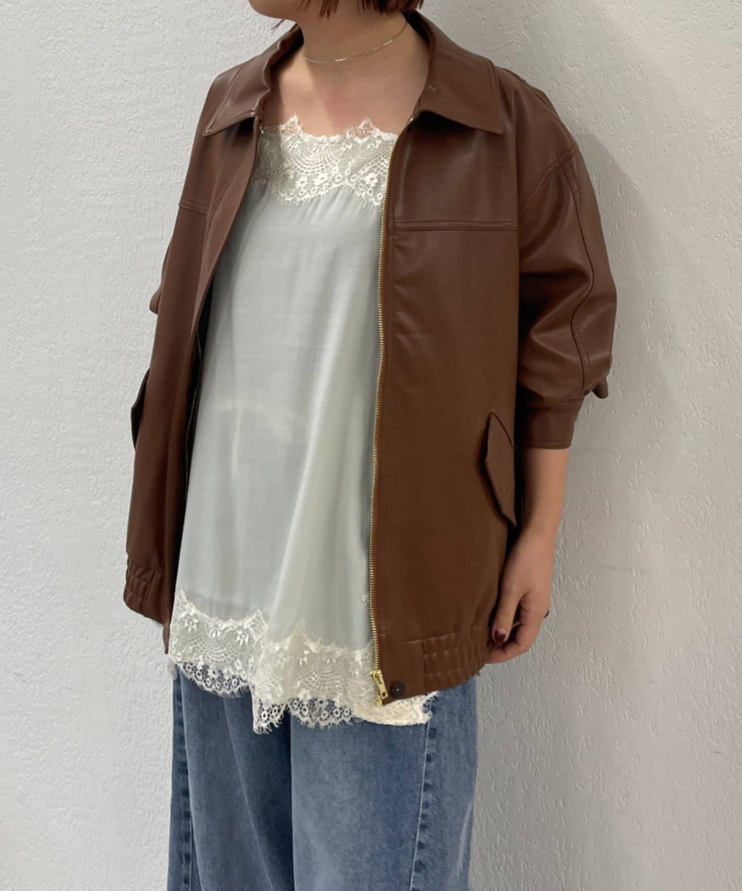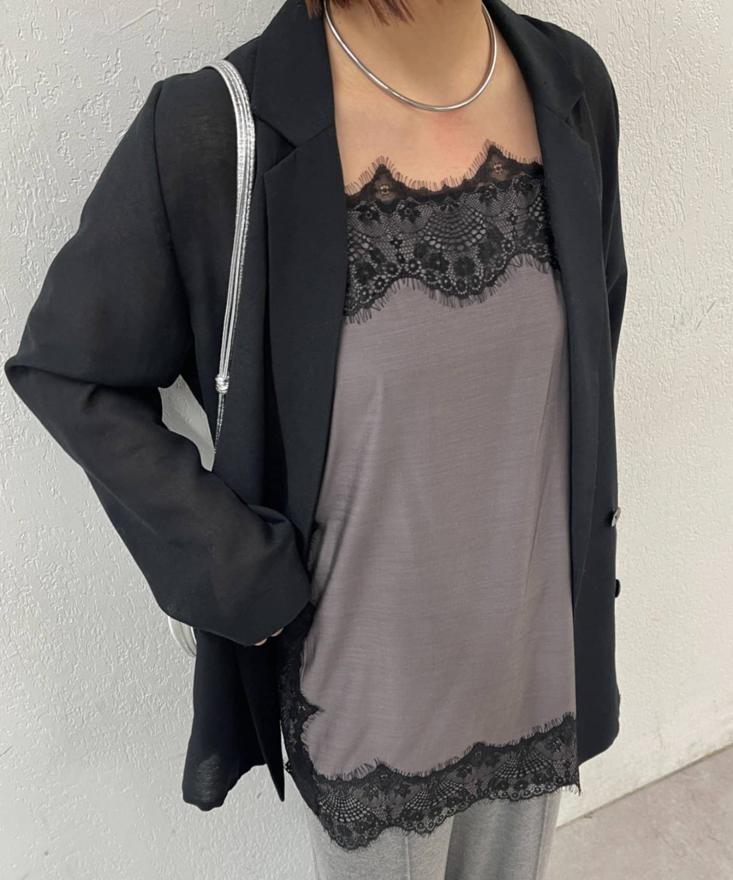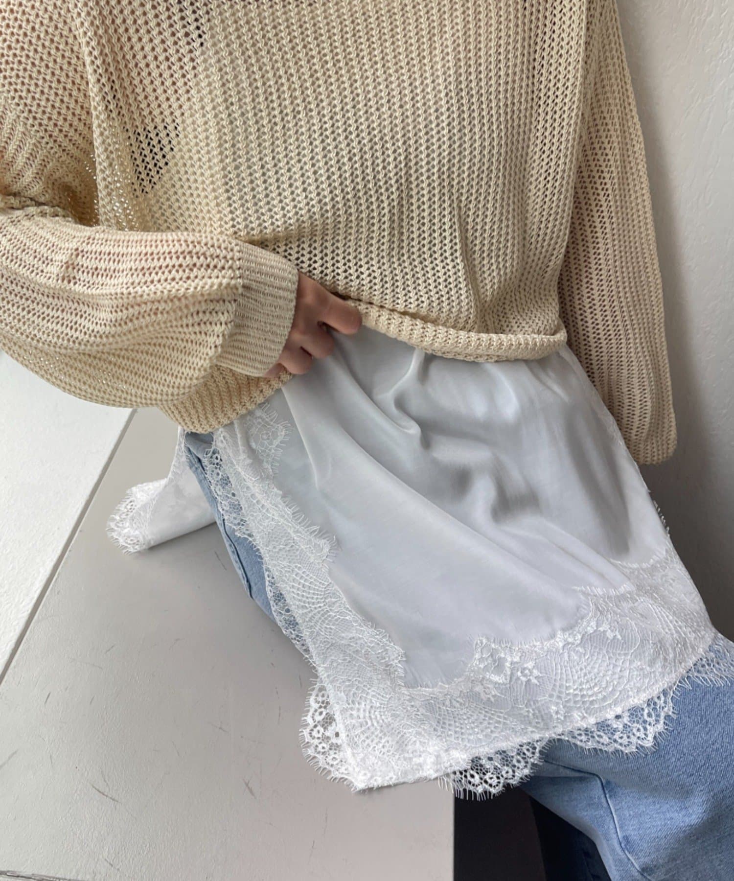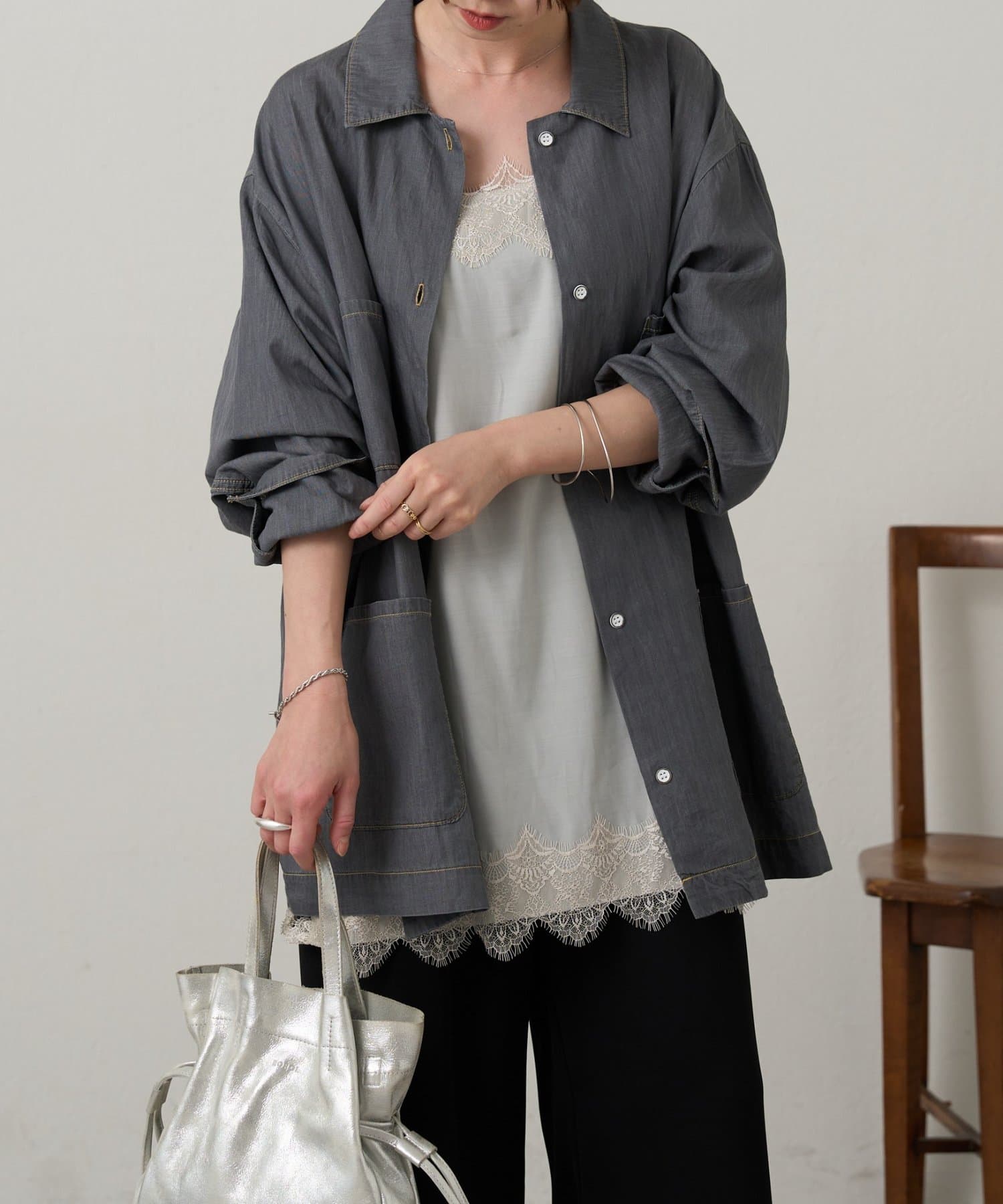 ・上品な艶感のある生地にレースをあしらうことで、大人可愛いコーデが叶う一枚。