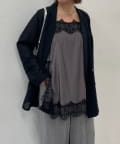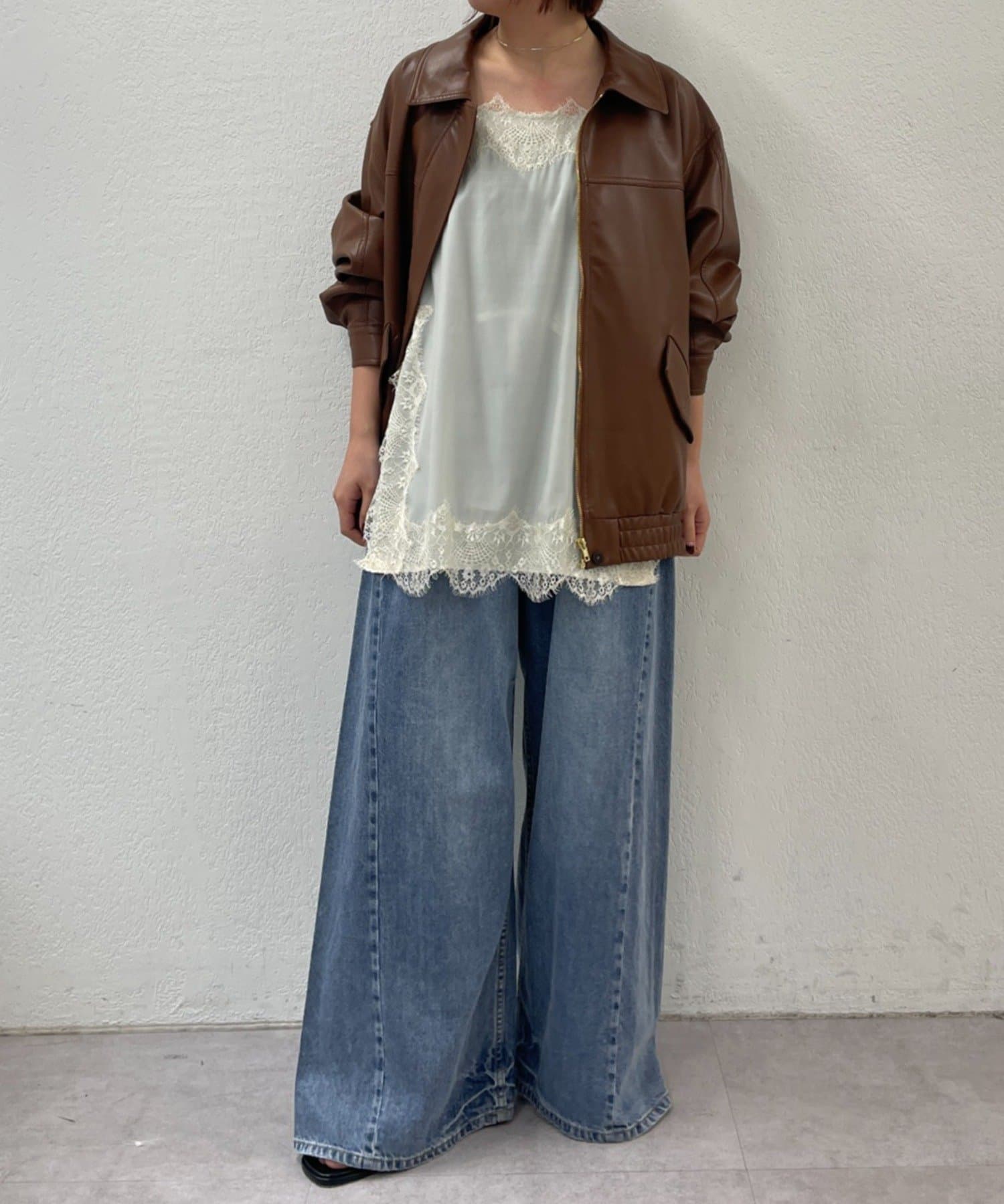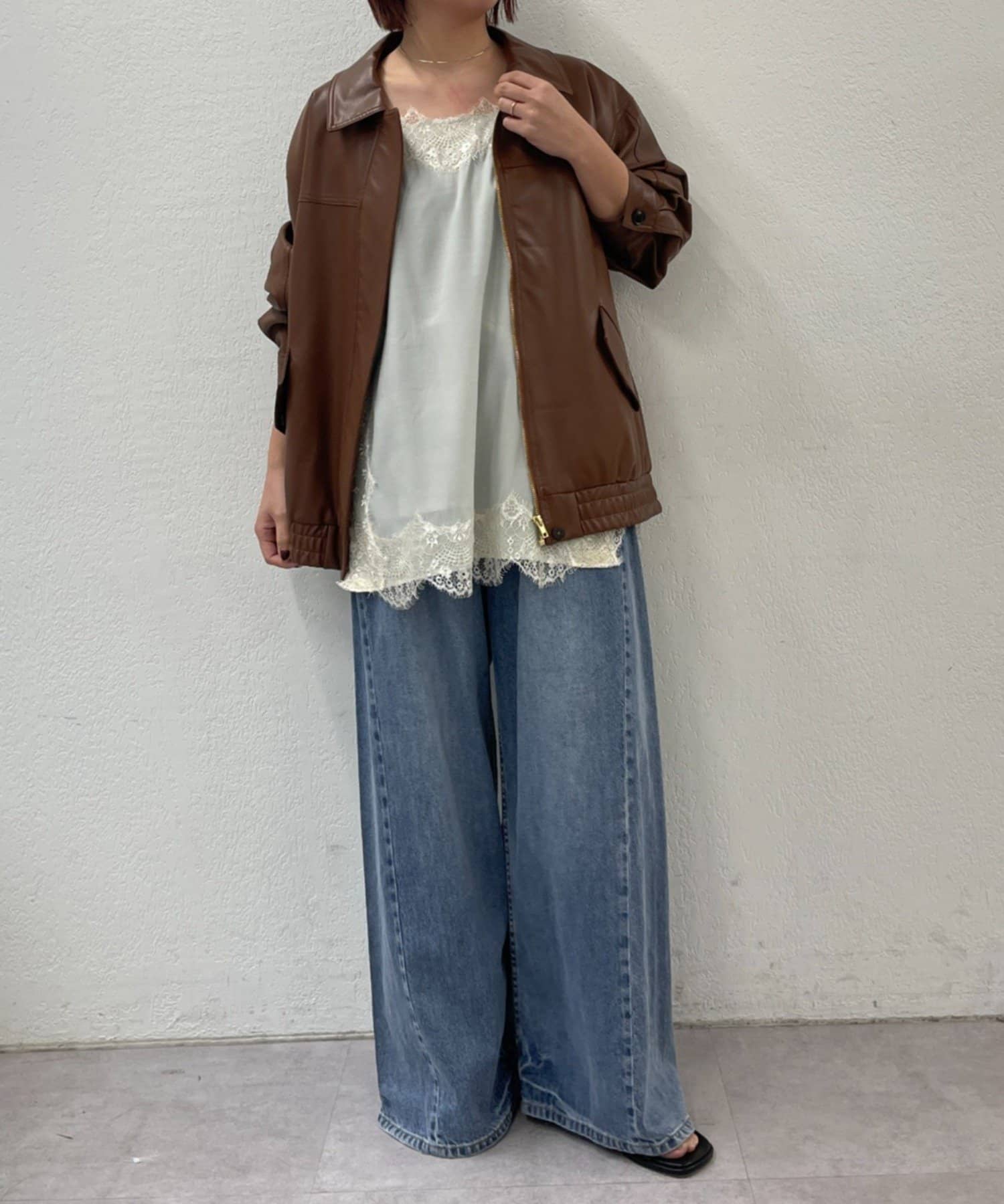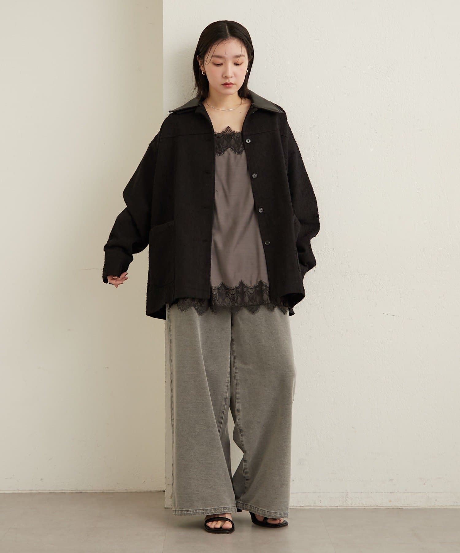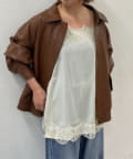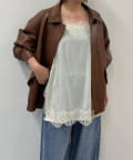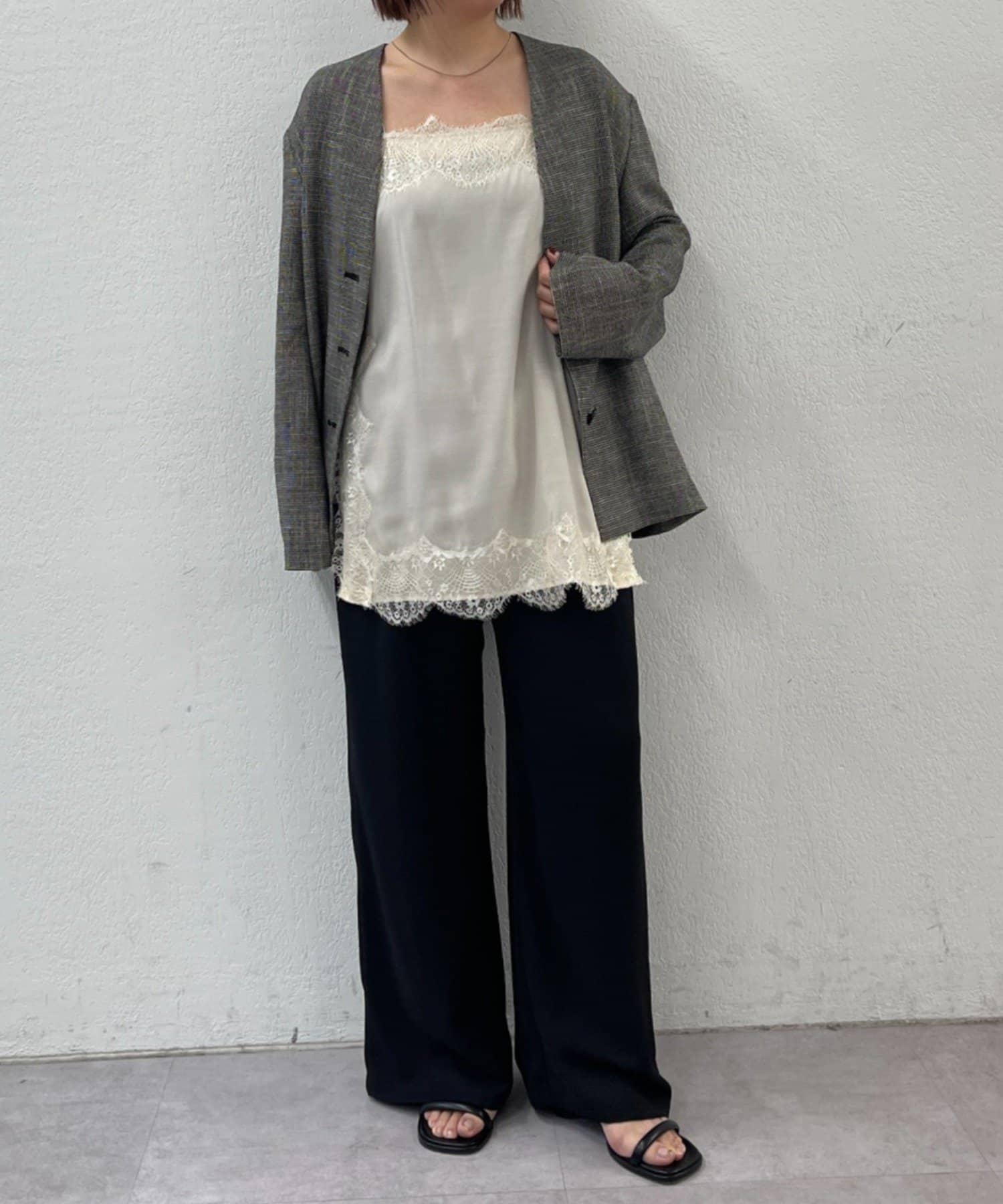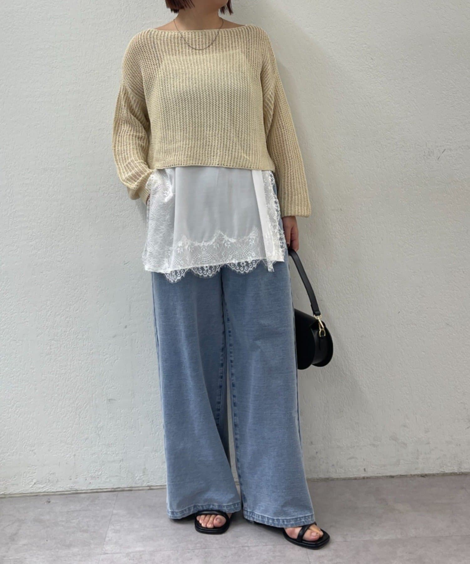 ・上品な艶感のある生地にレースをあしらうことで、大人可愛いコーデが叶う一枚。