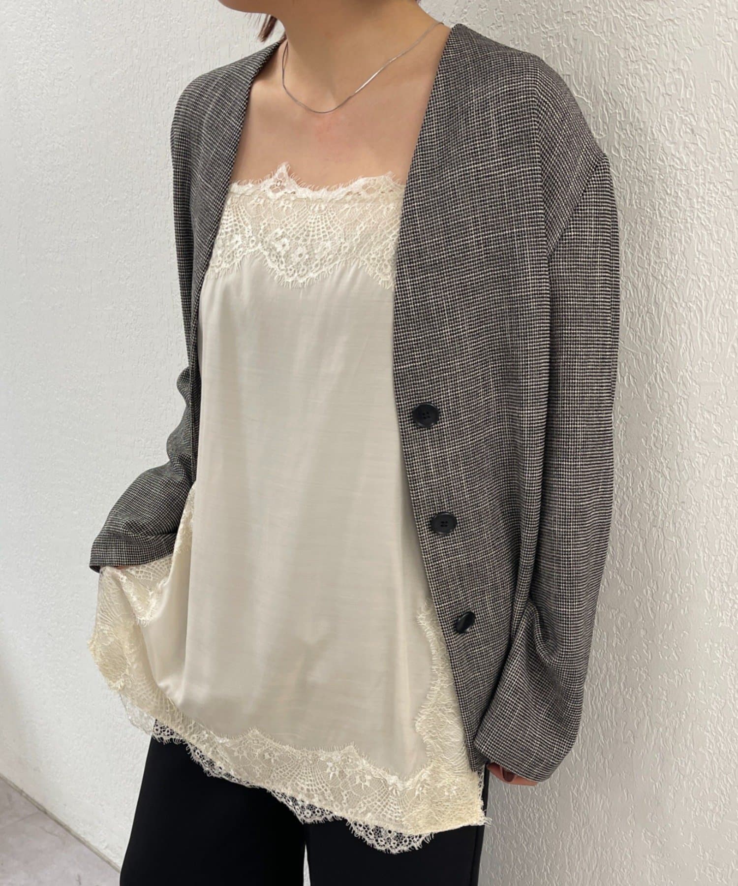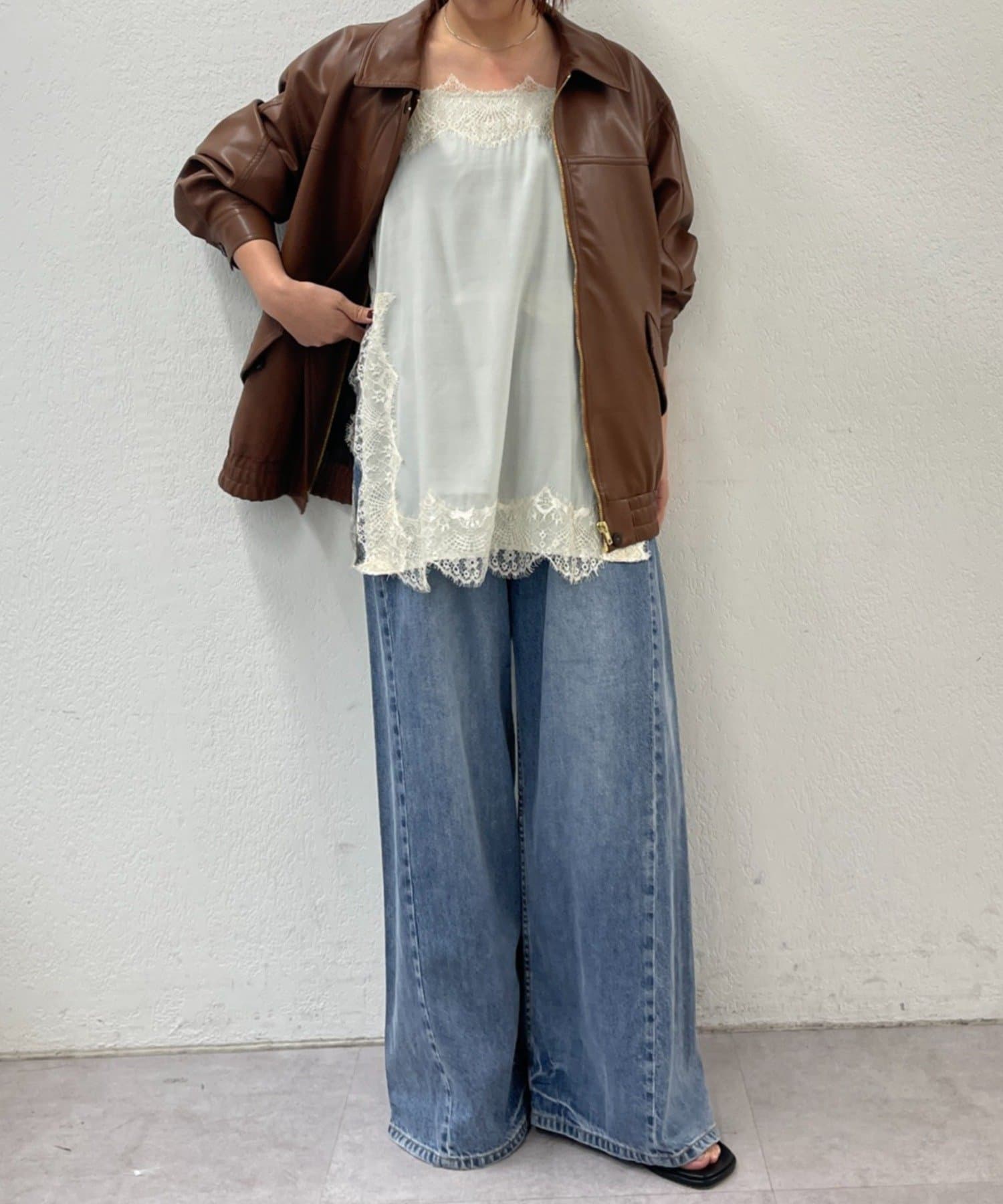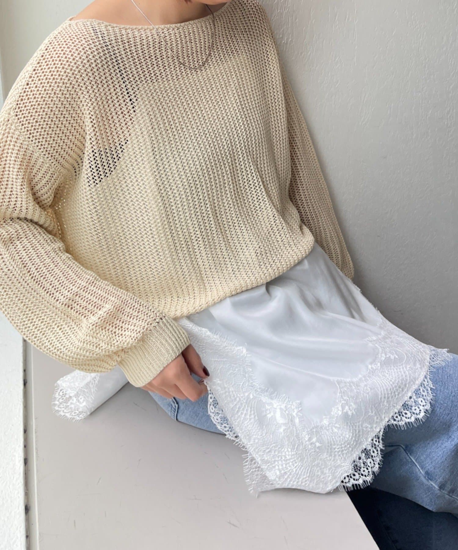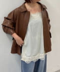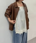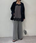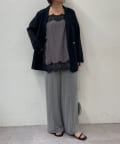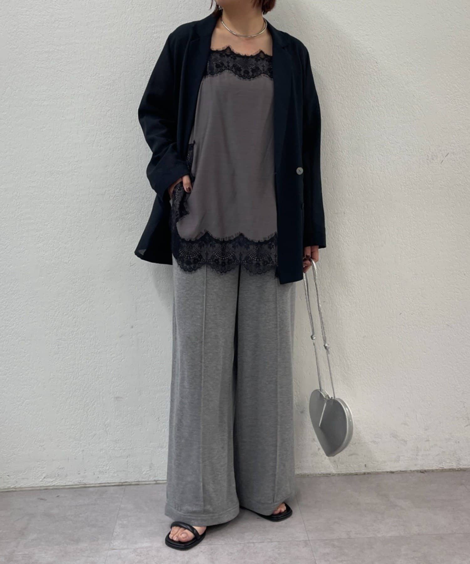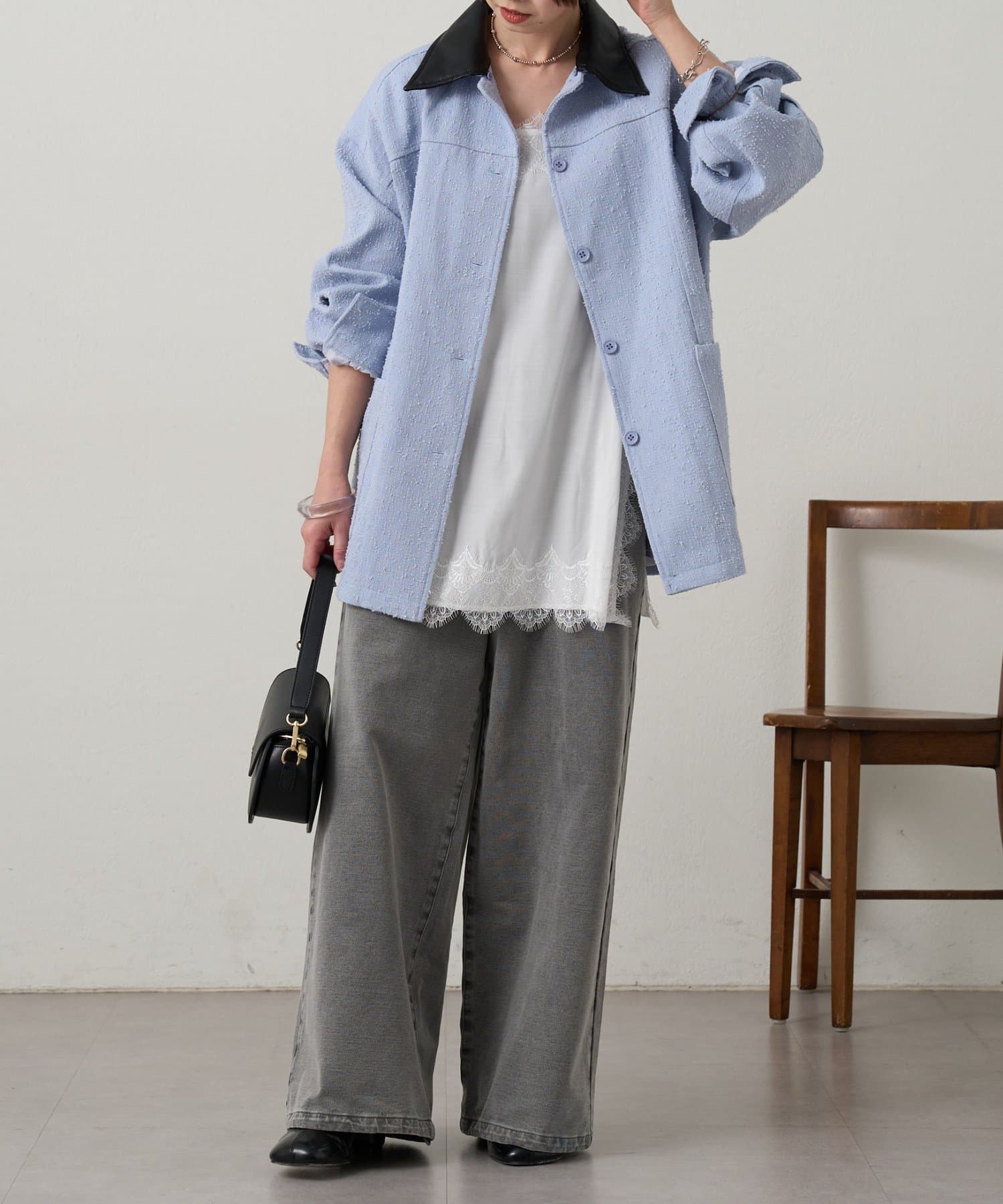 ・上品な艶感のある生地にレースをあしらうことで、大人可愛いコーデが叶う一枚。