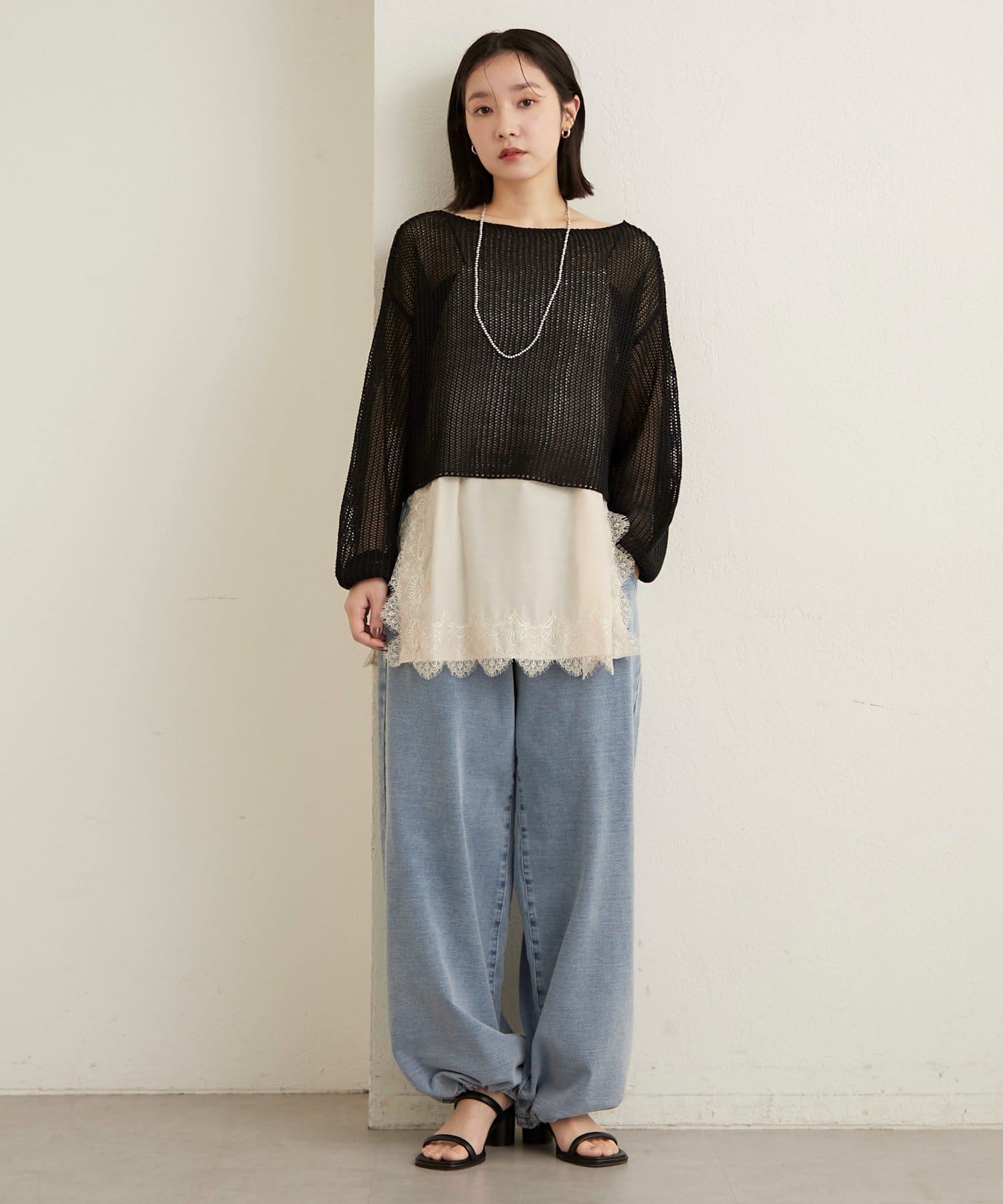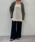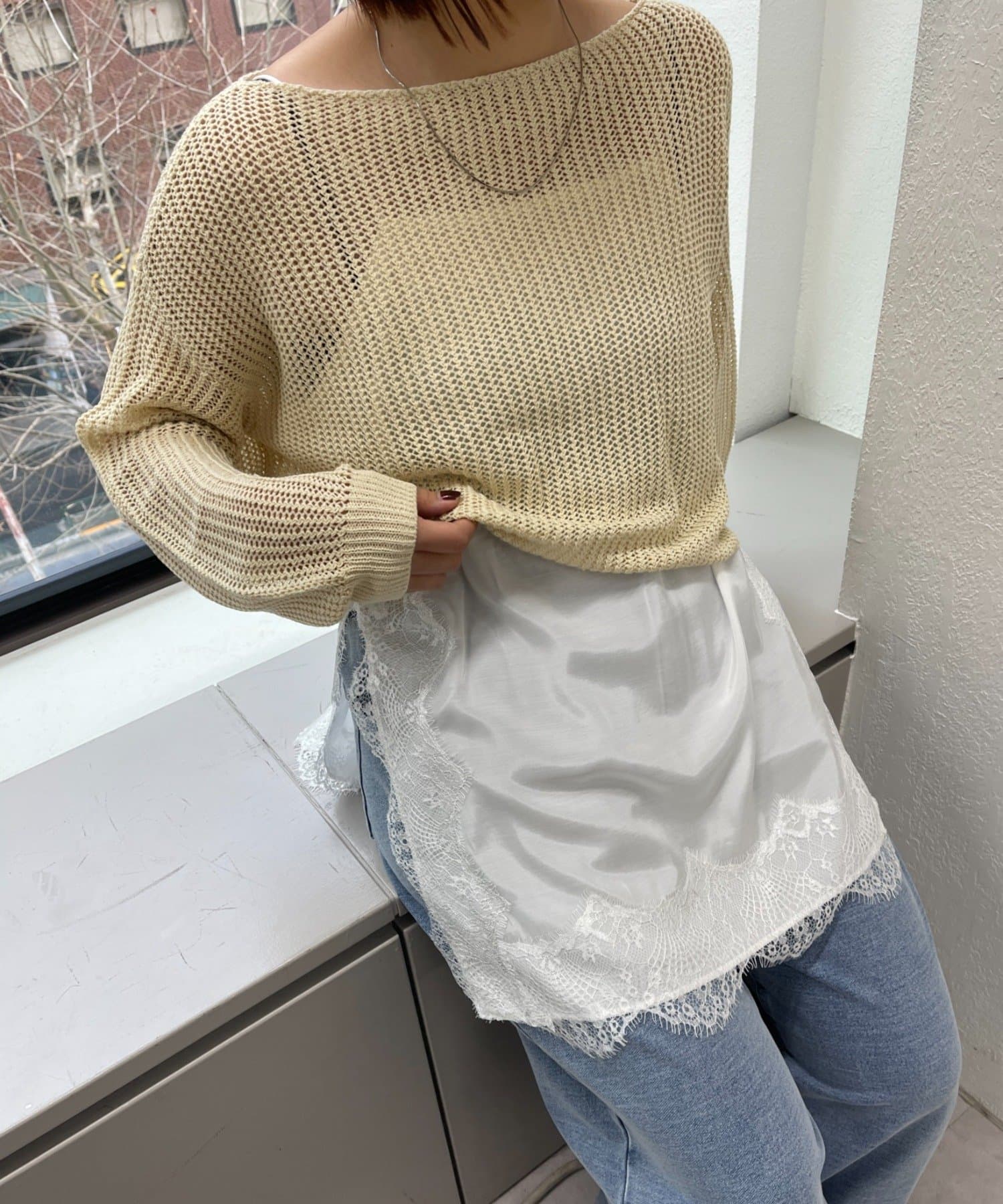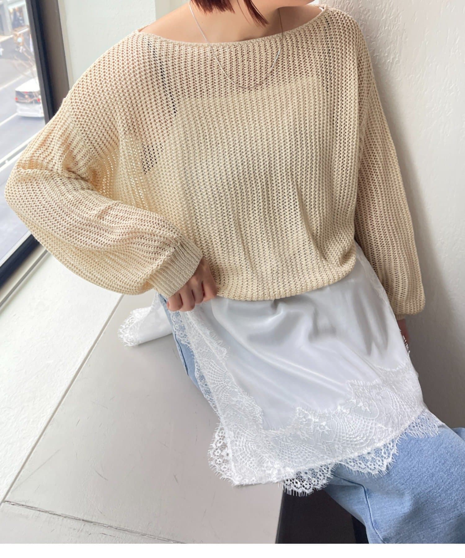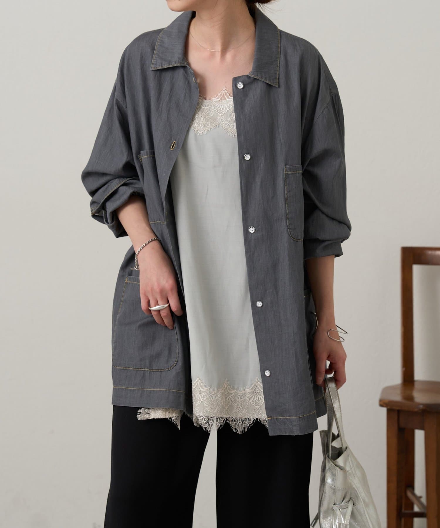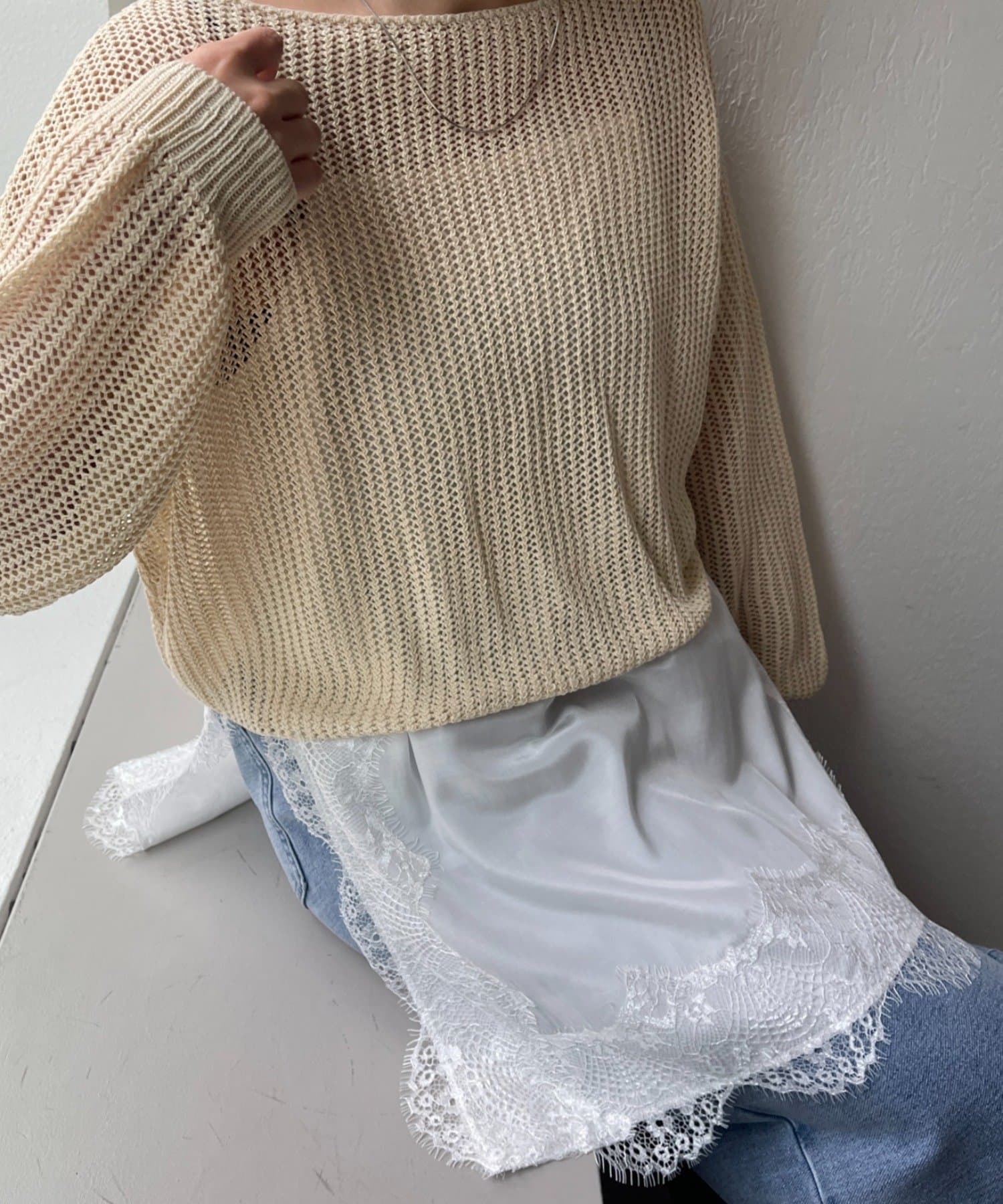 ・上品な艶感のある生地にレースをあしらうことで、大人可愛いコーデが叶う一枚。
