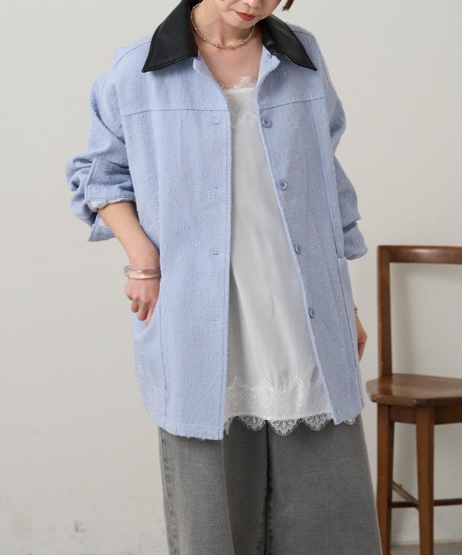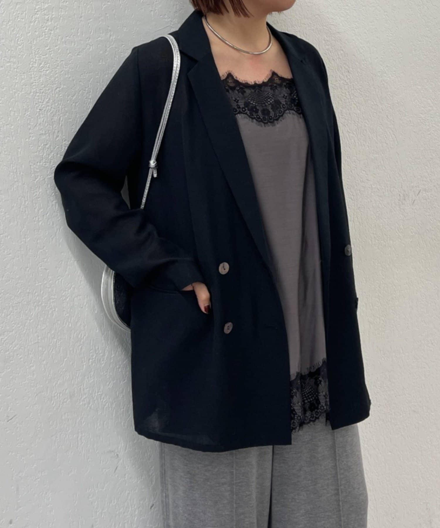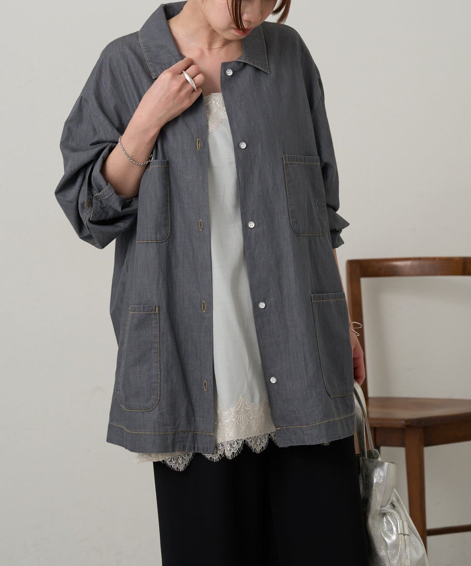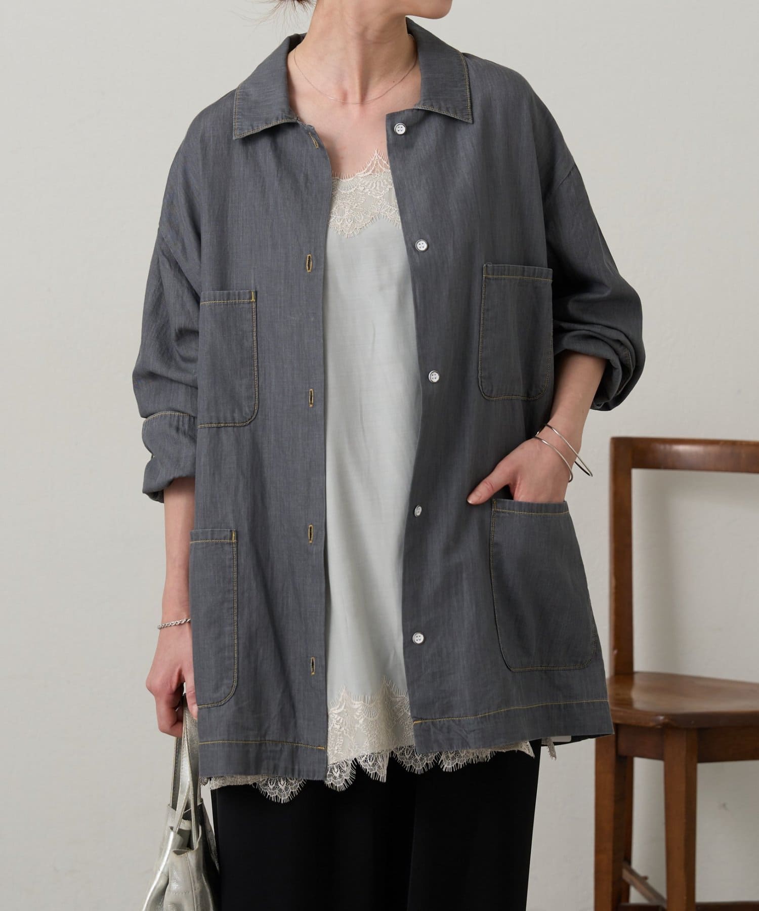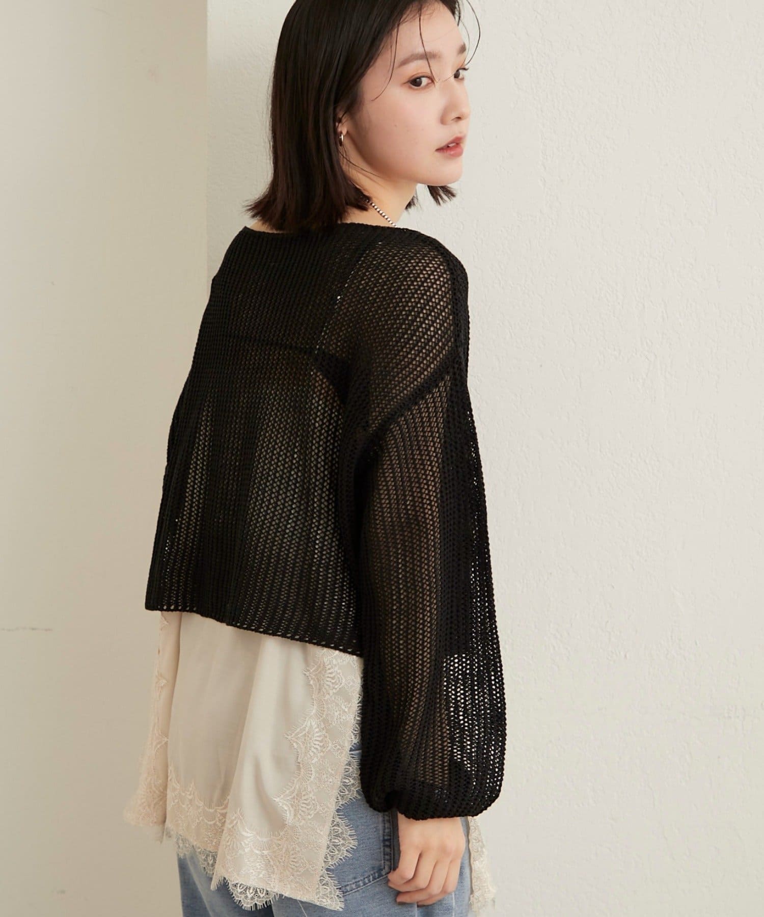 ・上品な艶感のある生地にレースをあしらうことで、大人可愛いコーデが叶う一枚。