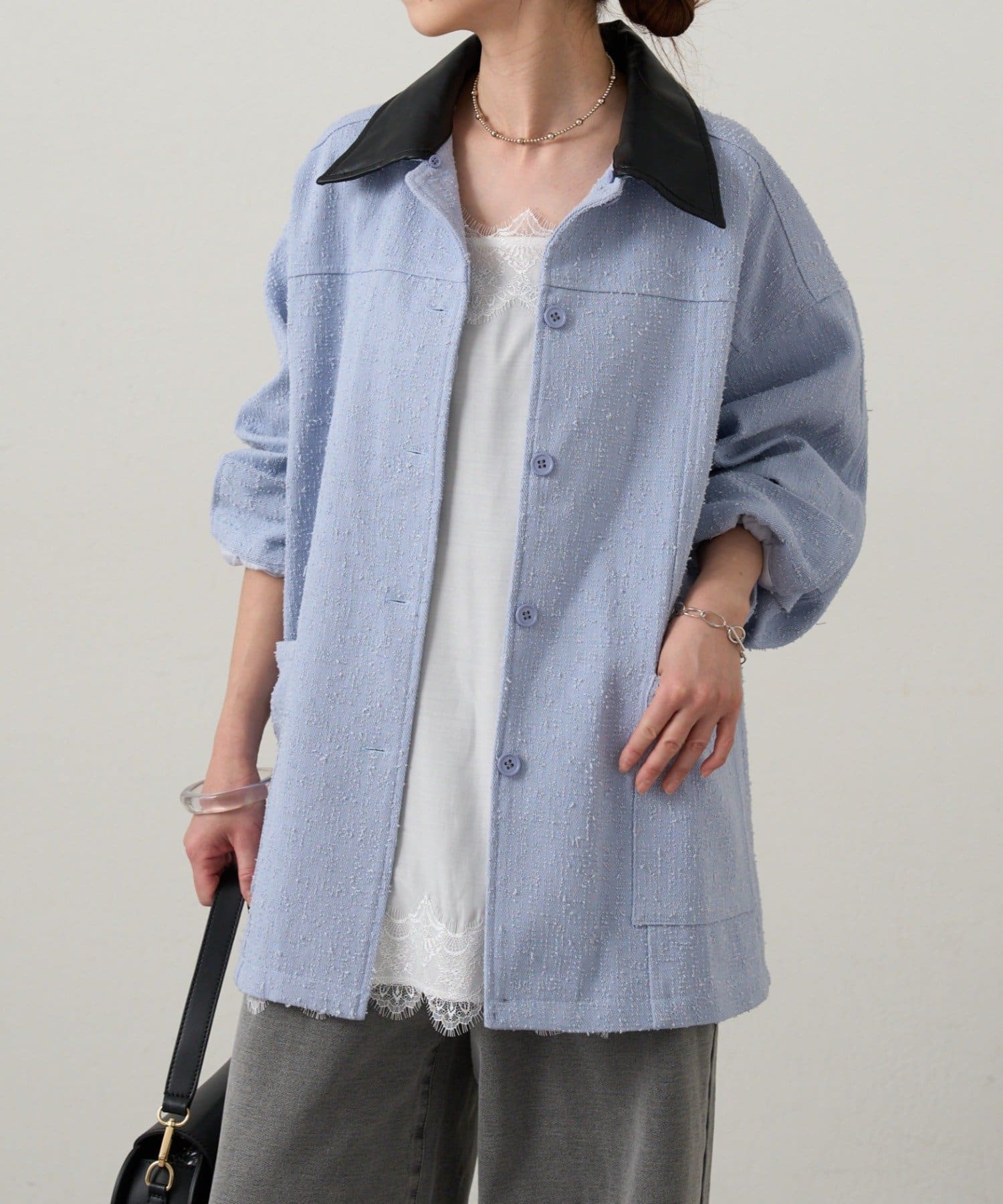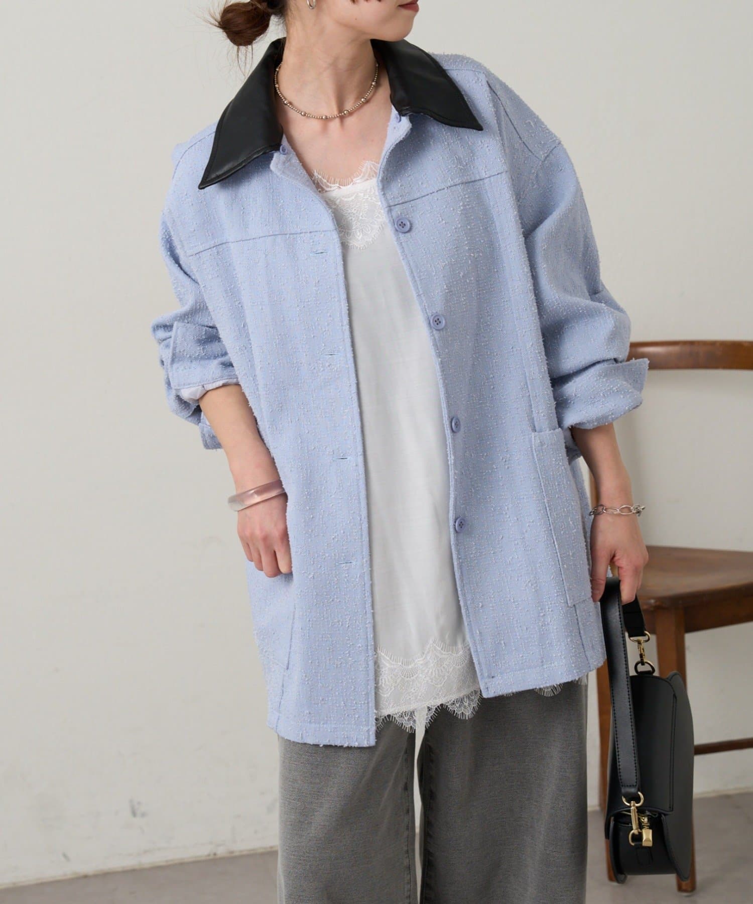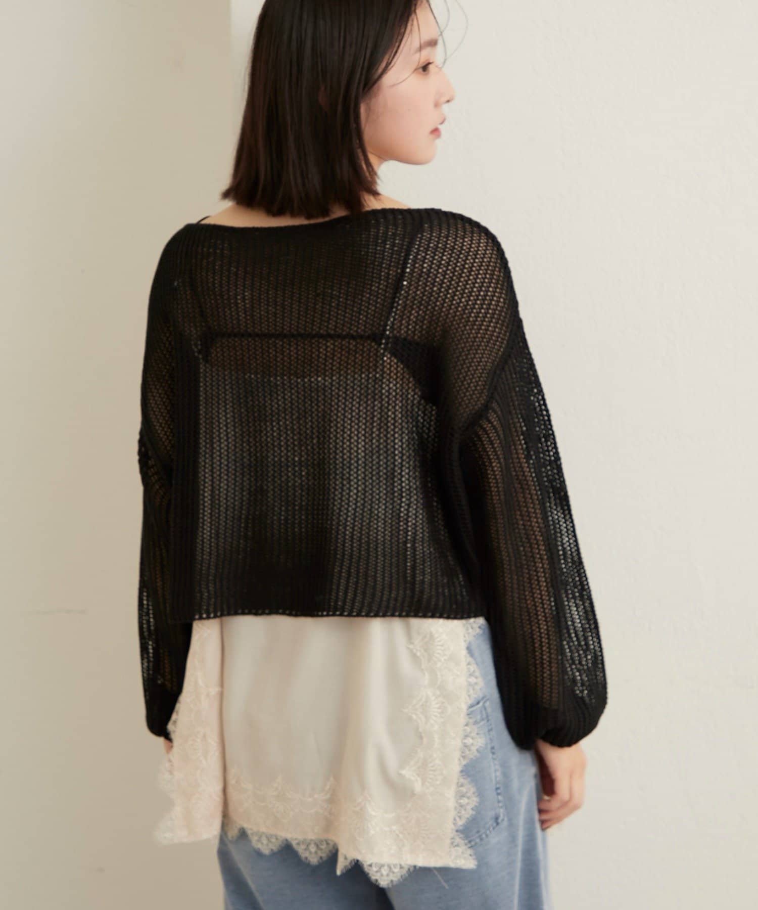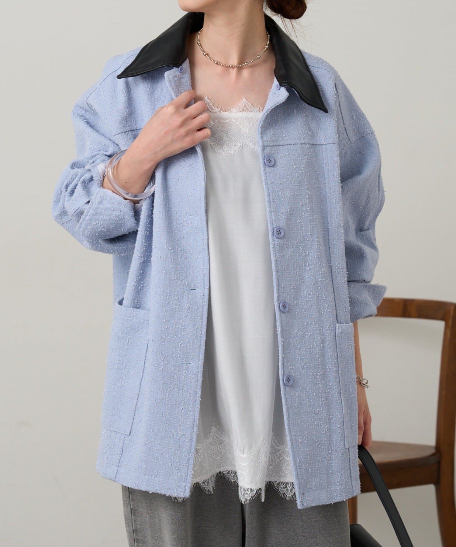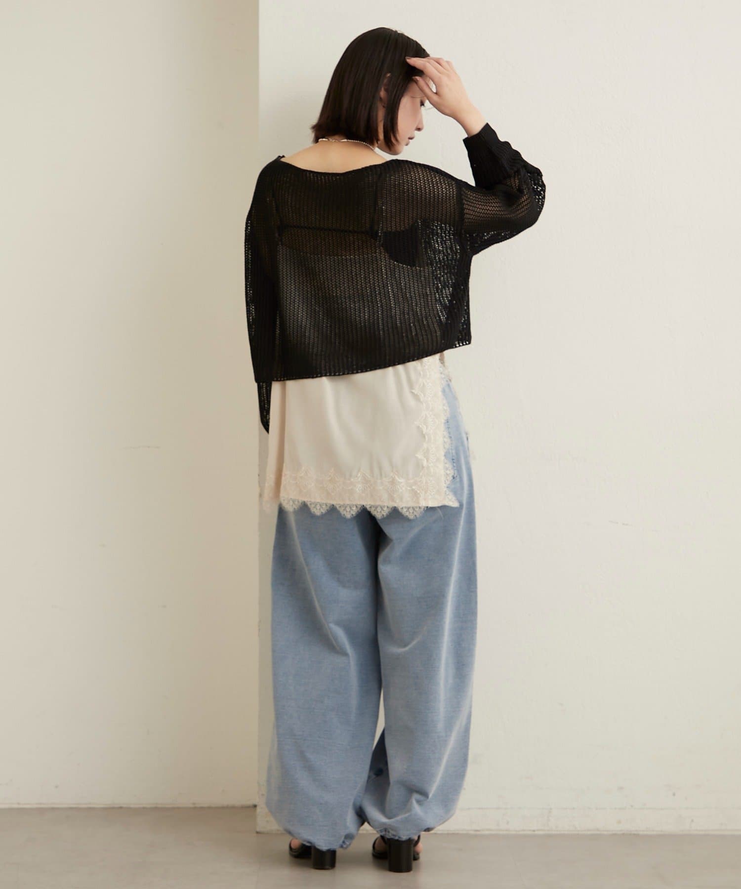 ・上品な艶感のある生地にレースをあしらうことで、大人可愛いコーデが叶う一枚。