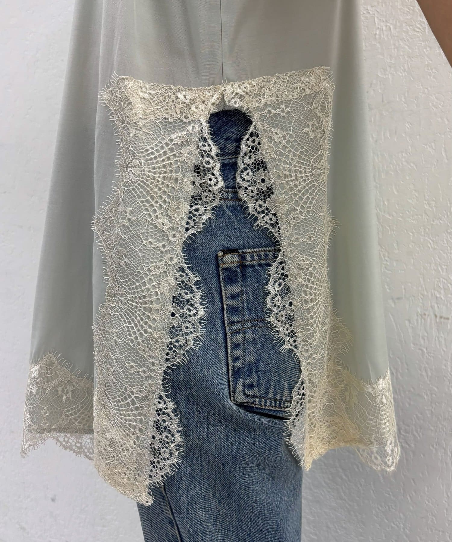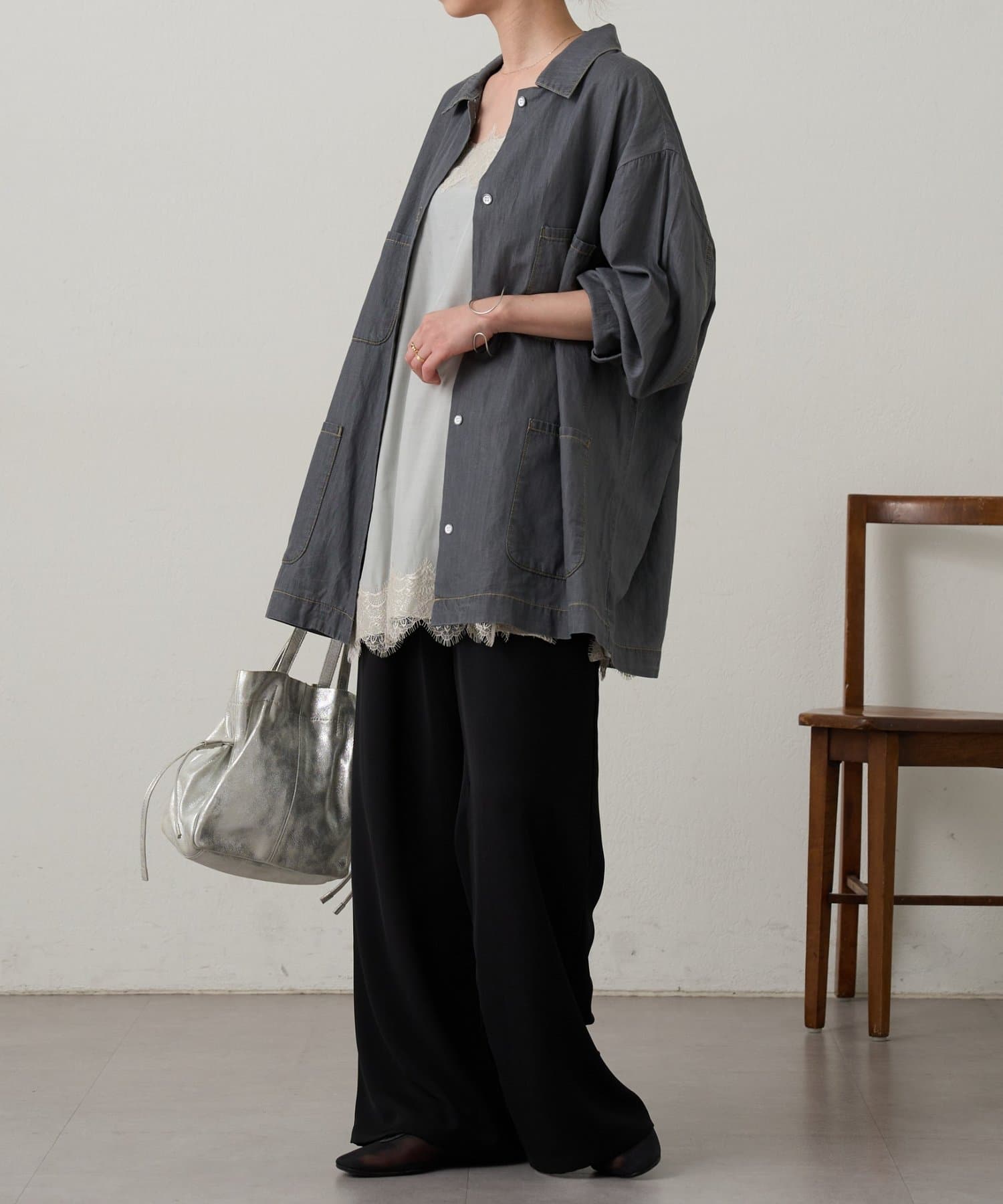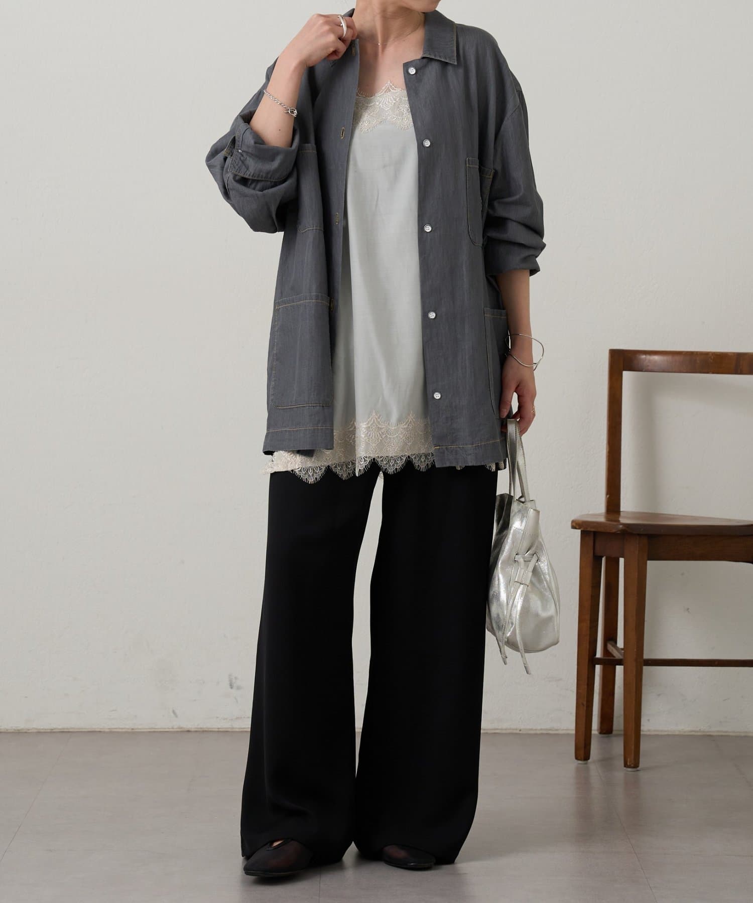 ・上品な艶感のある生地にレースをあしらうことで、大人可愛いコーデが叶う一枚。