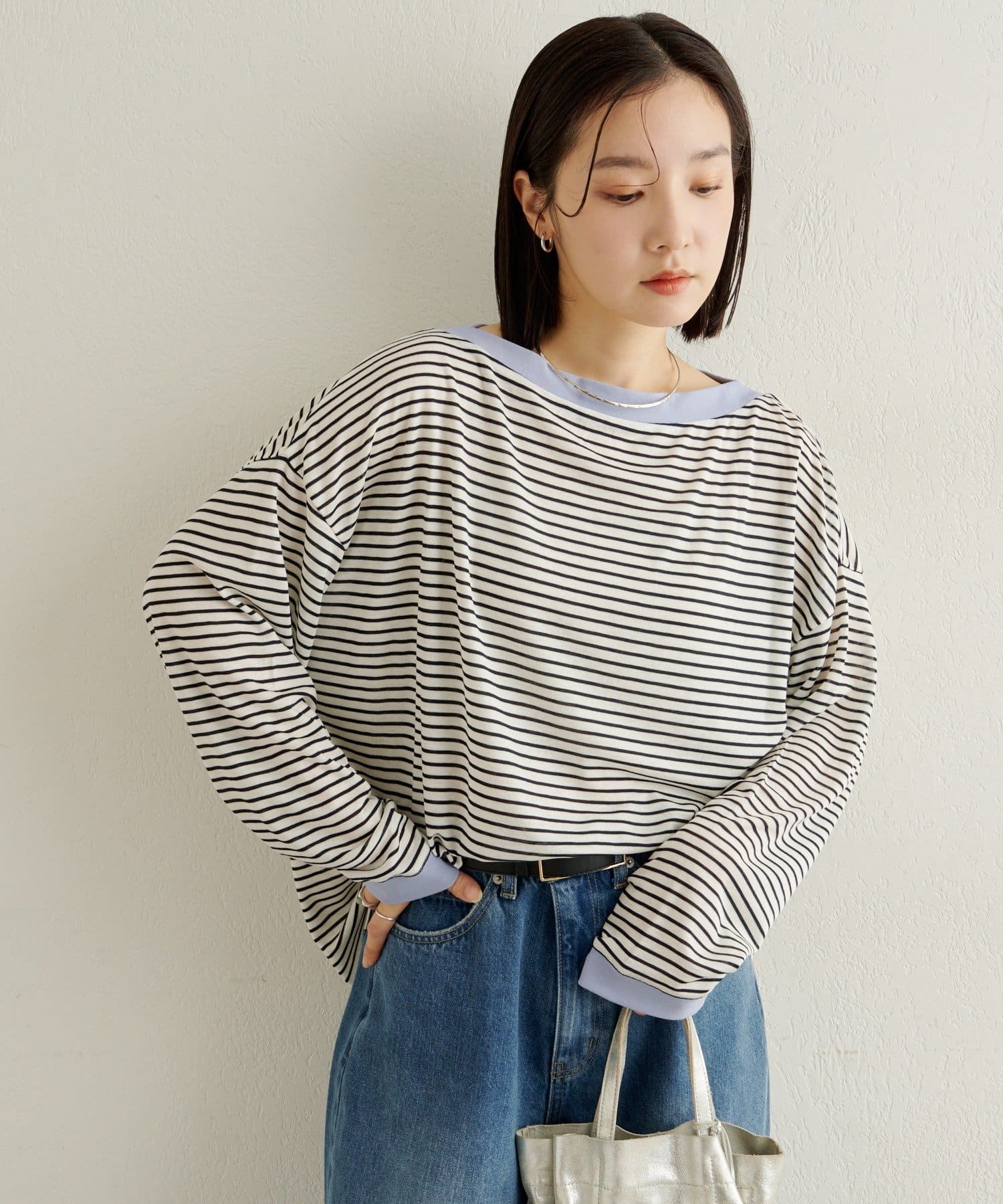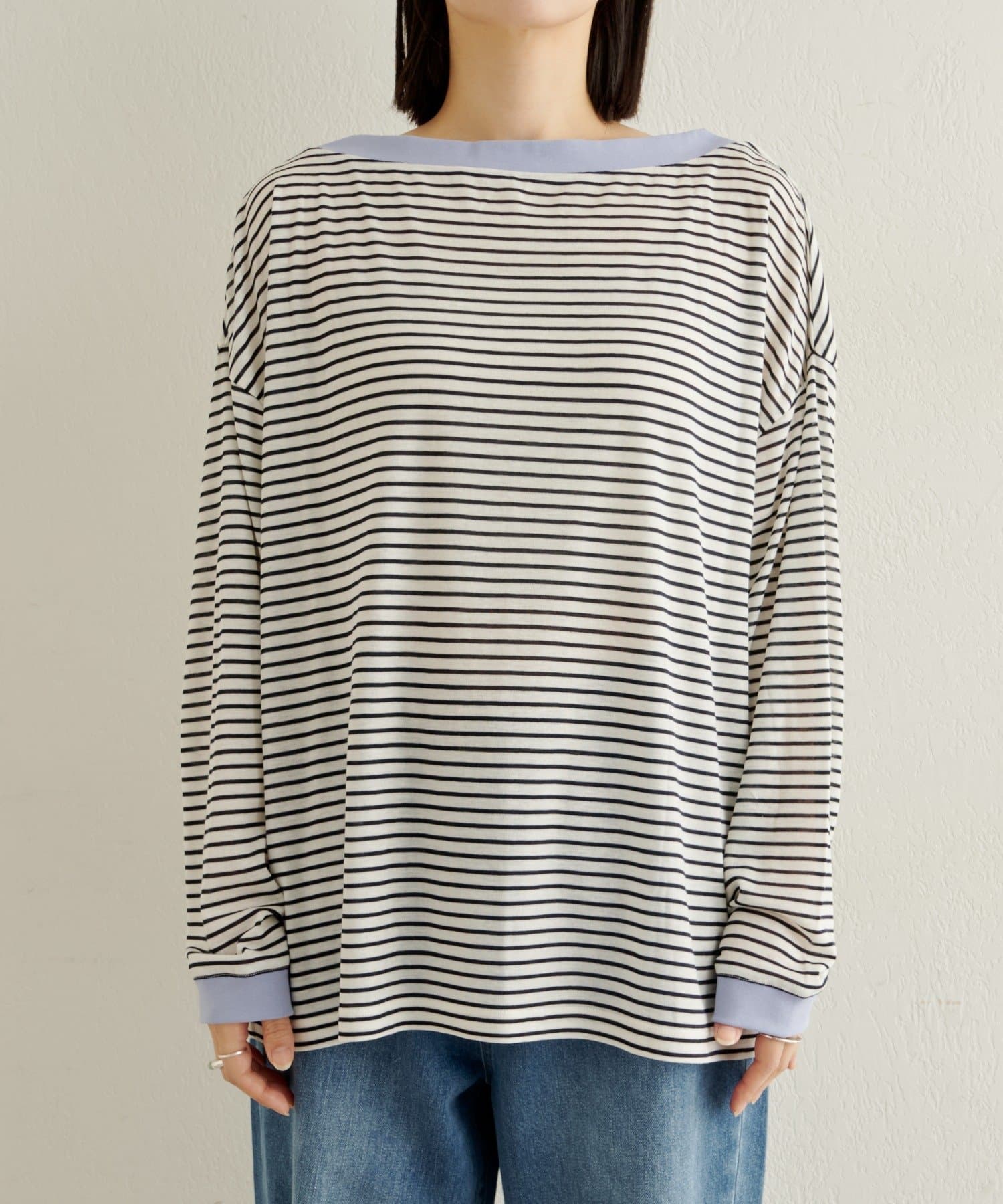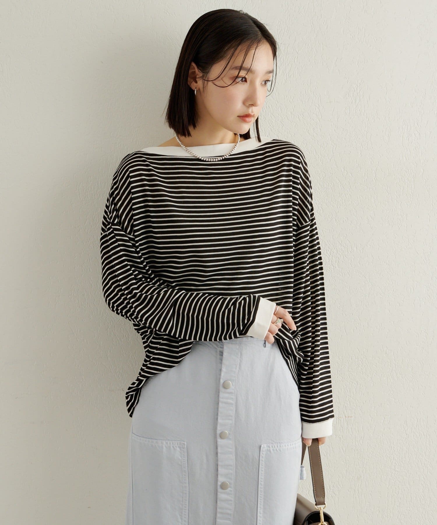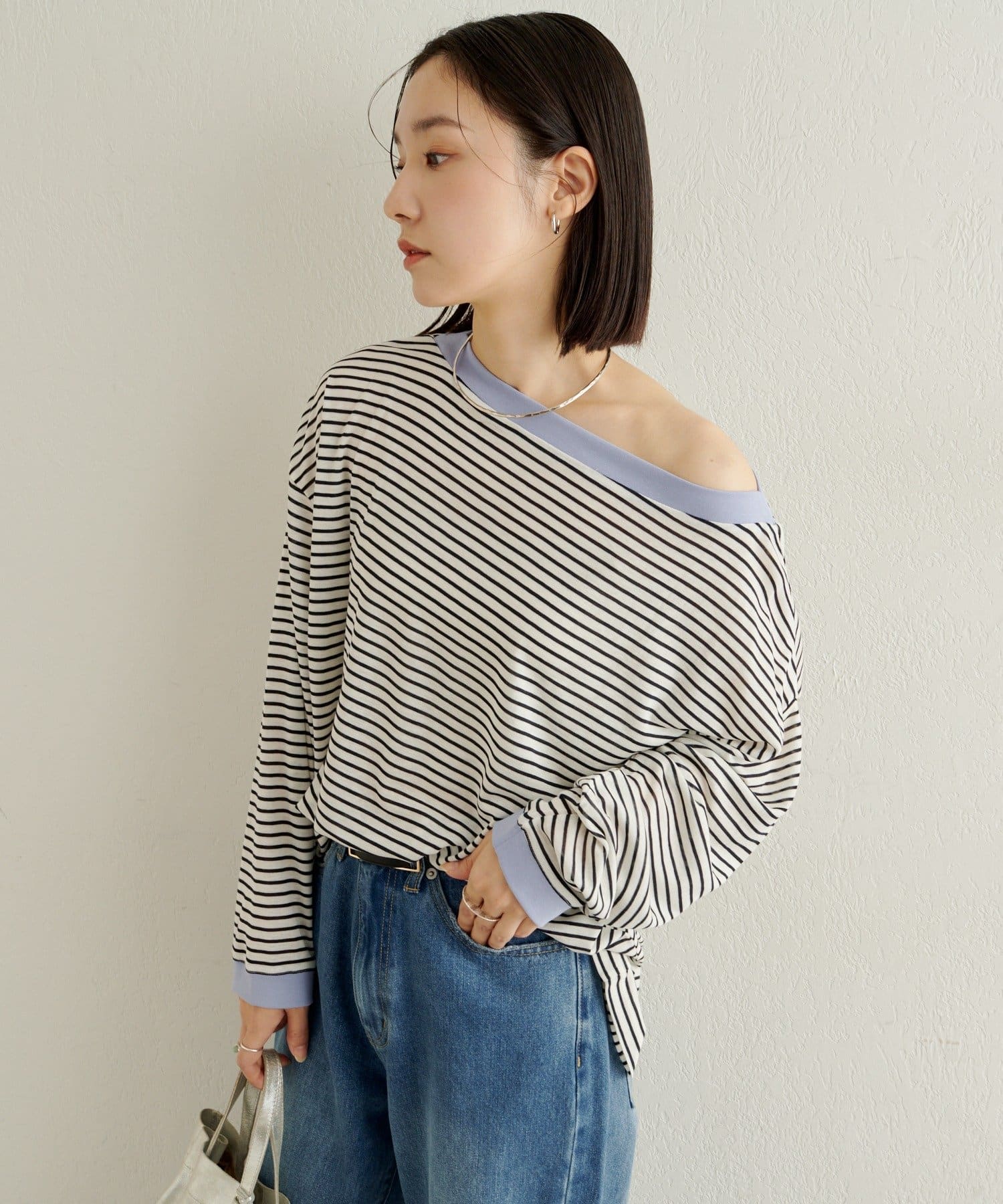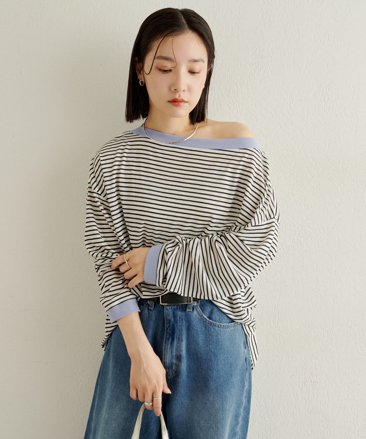 ・ネックのバイカラーな配色がアクセントになったボーダーオフショルロングTシャツ。