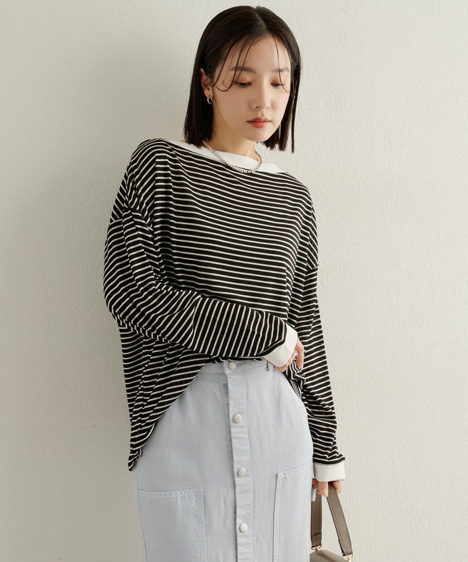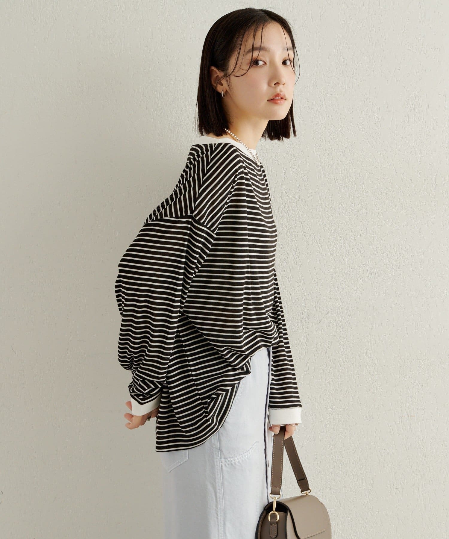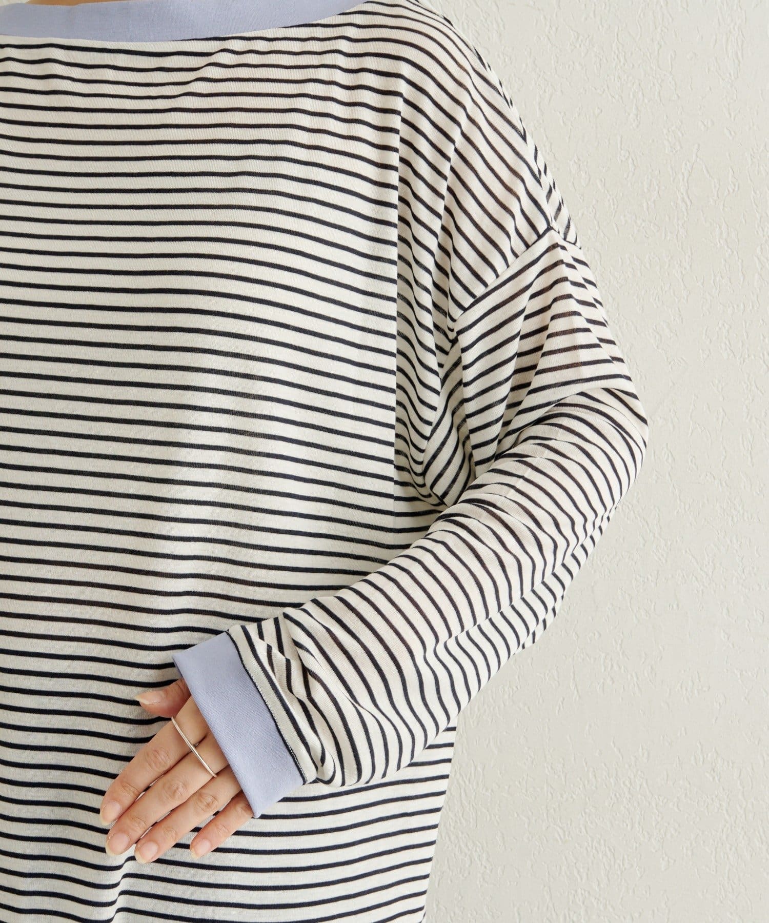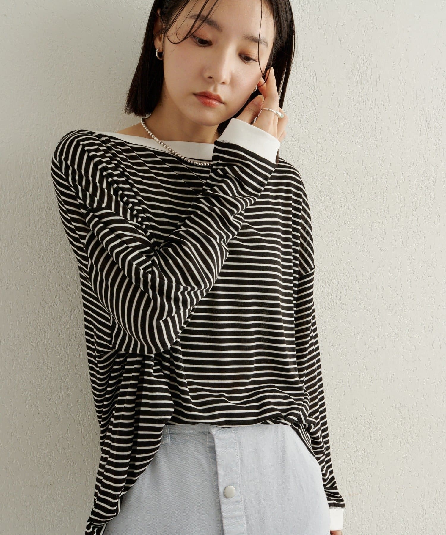 ・ネックのバイカラーな配色がアクセントになったボーダーオフショルロングTシャツ。