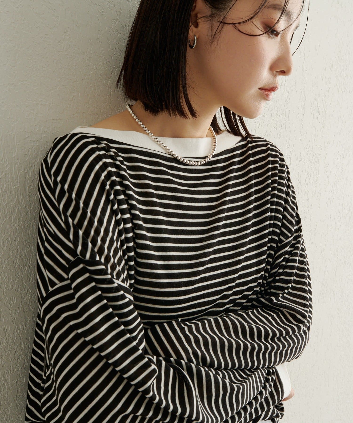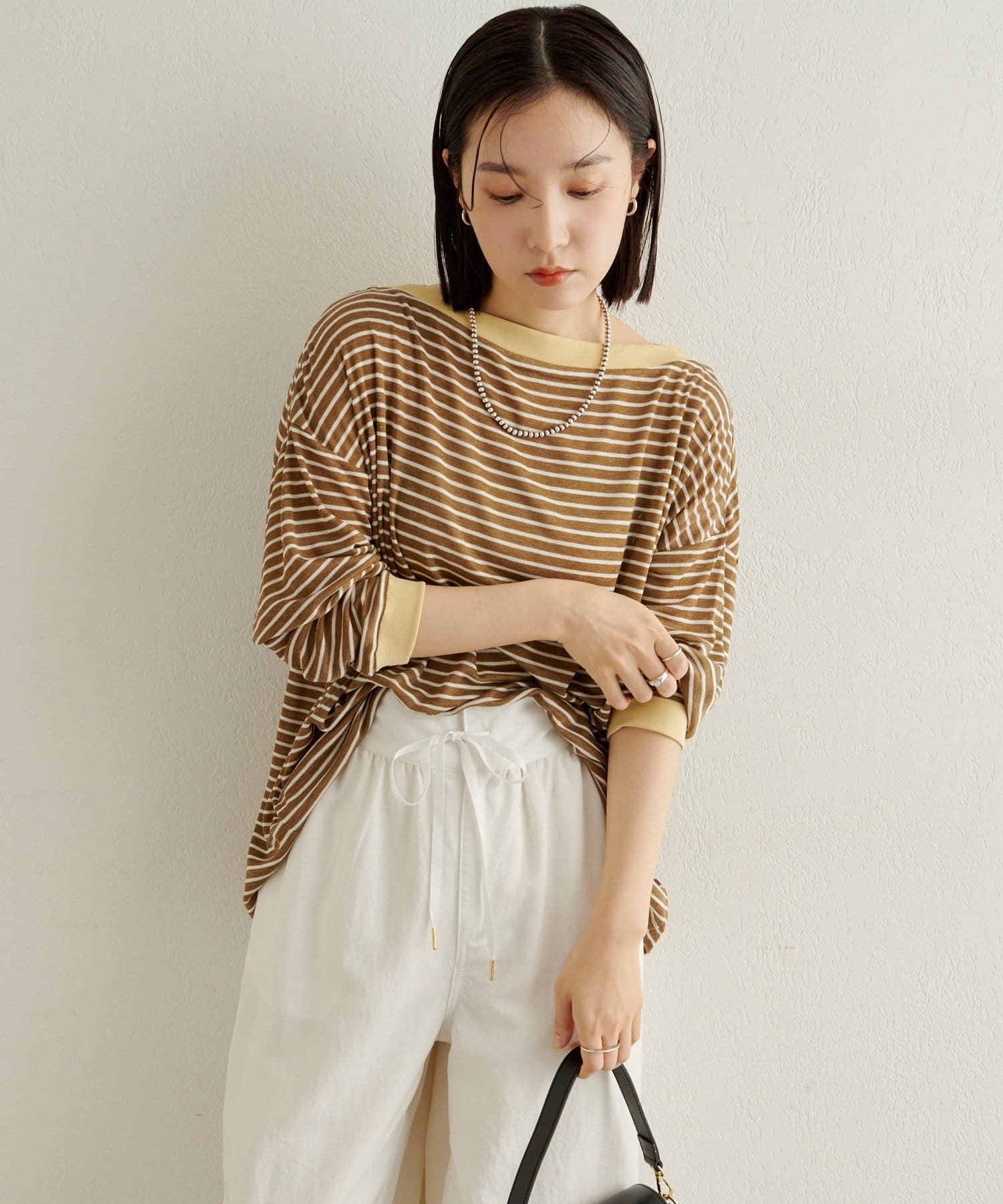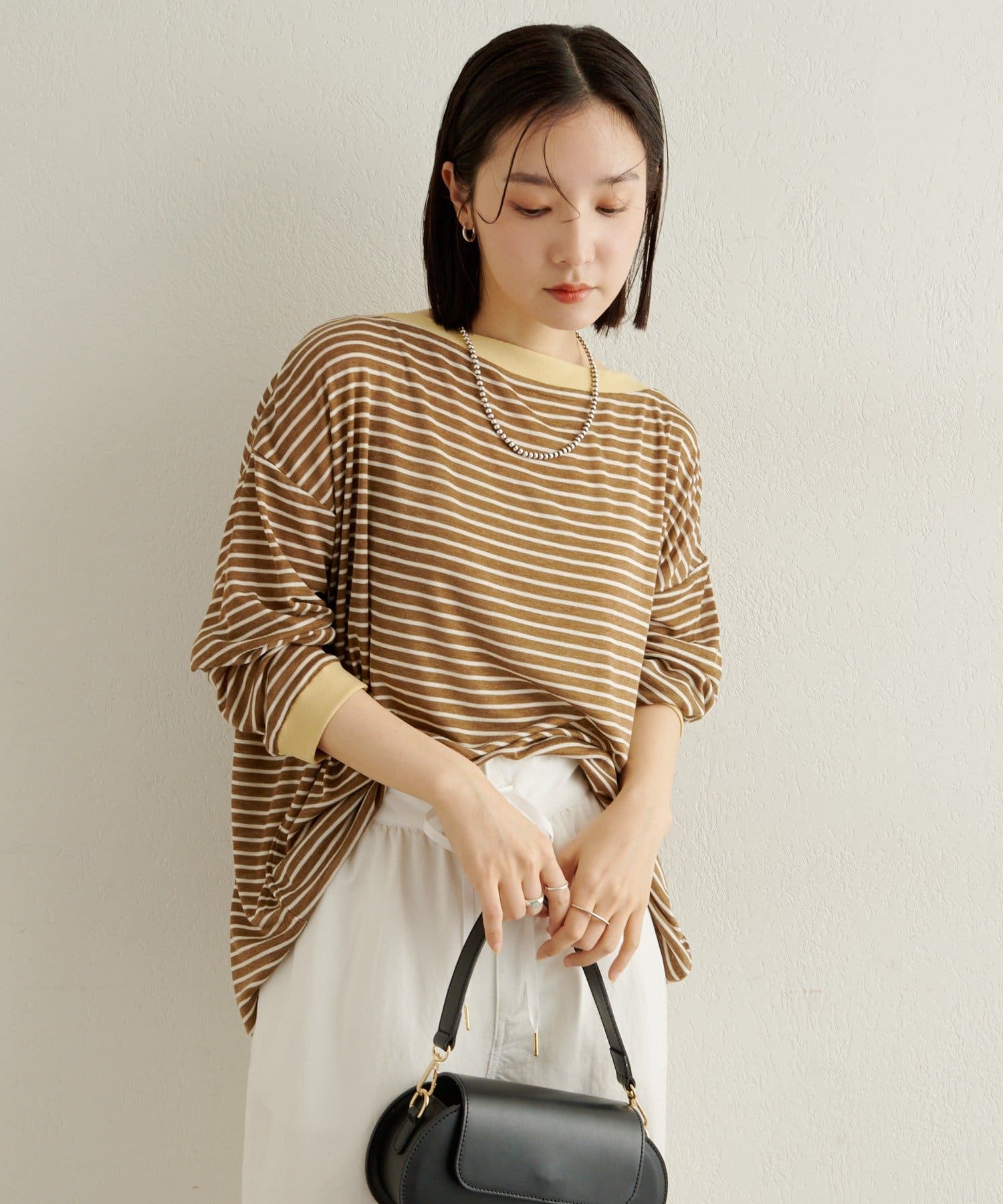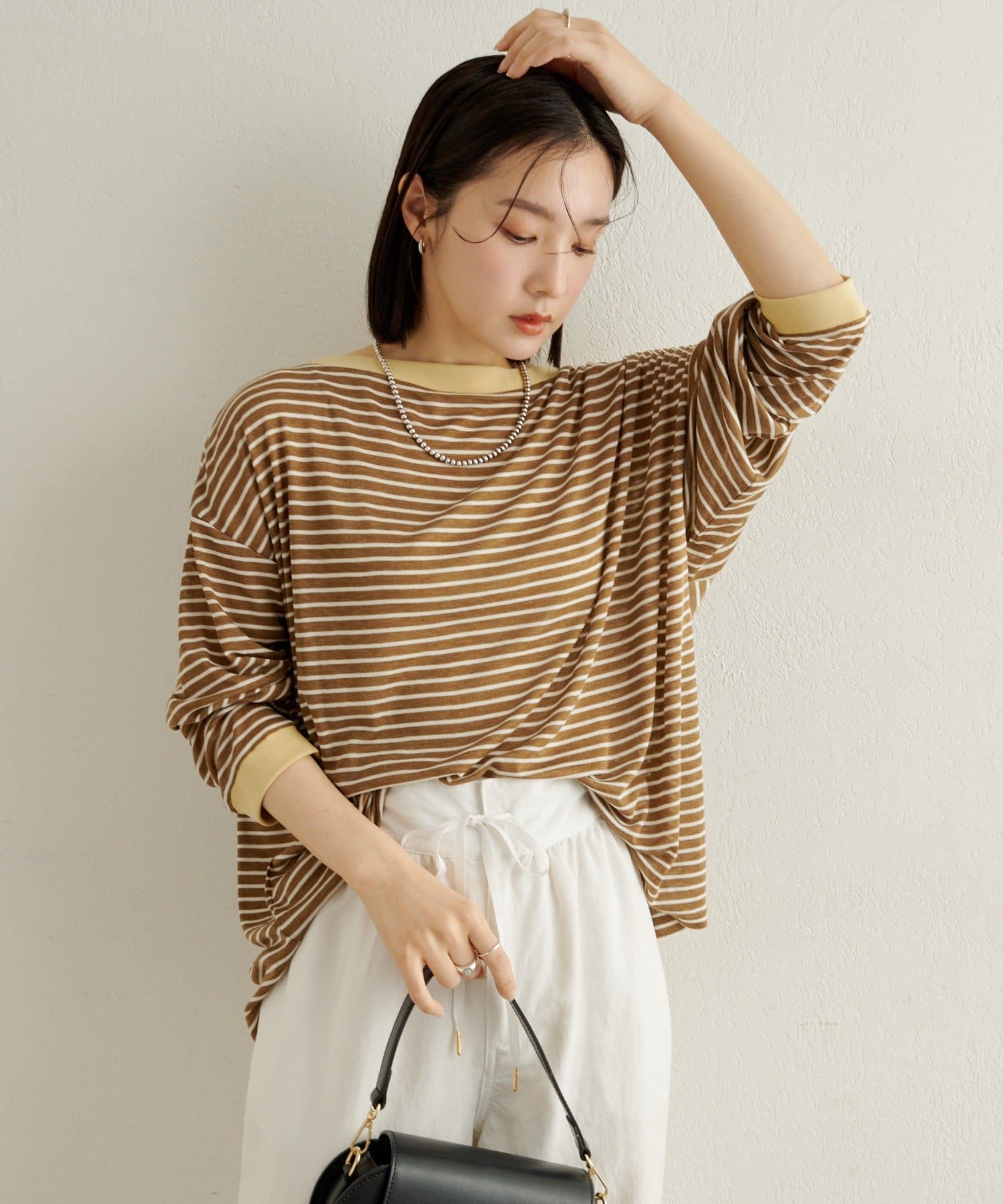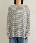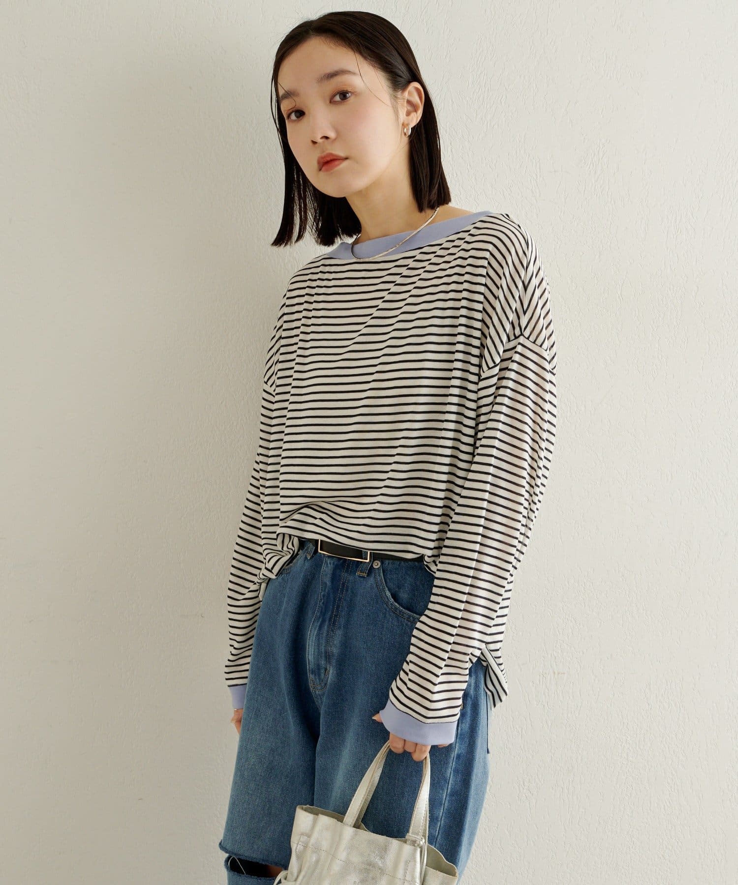 ・ネックのバイカラーな配色がアクセントになったボーダーオフショルロングTシャツ。