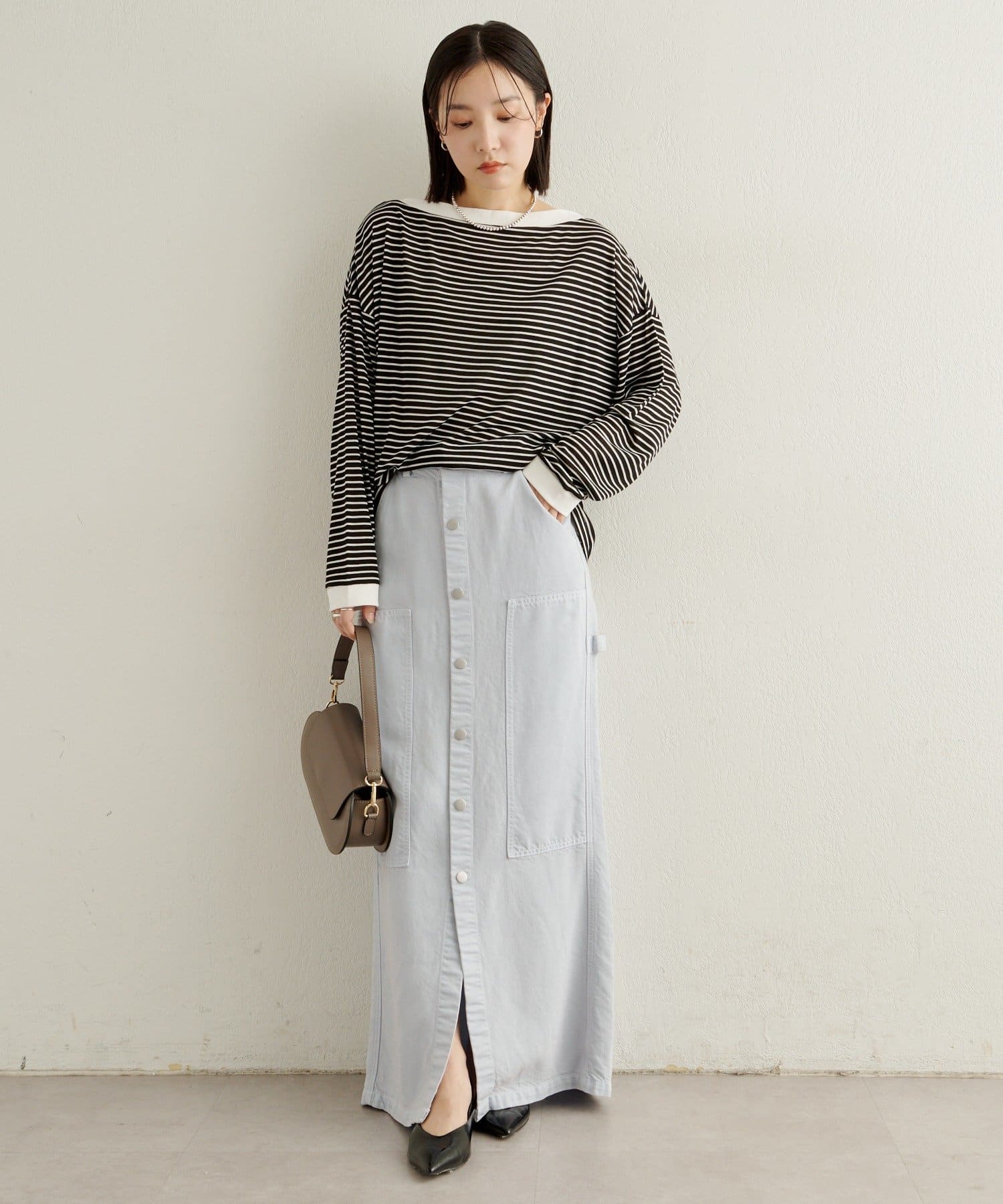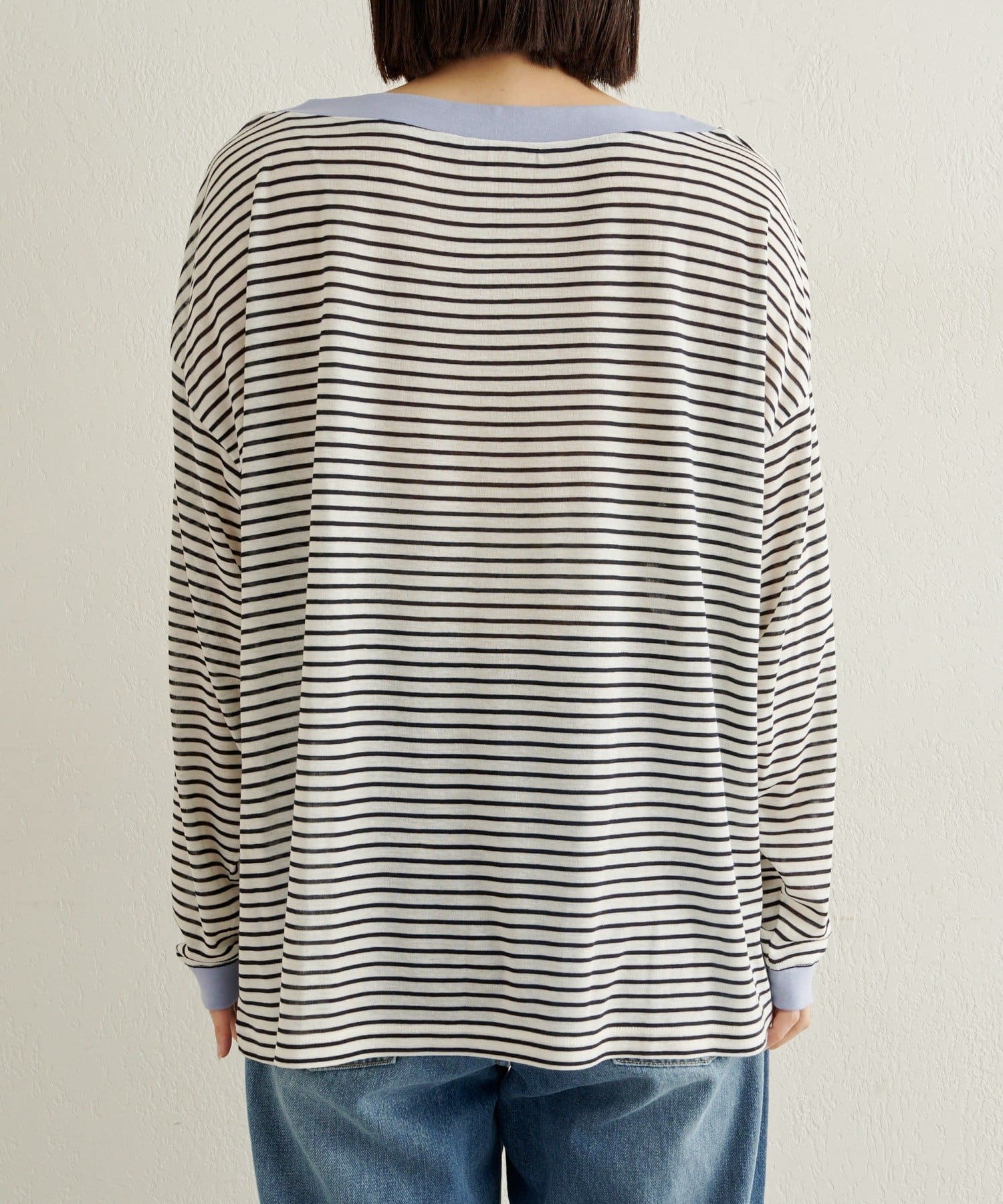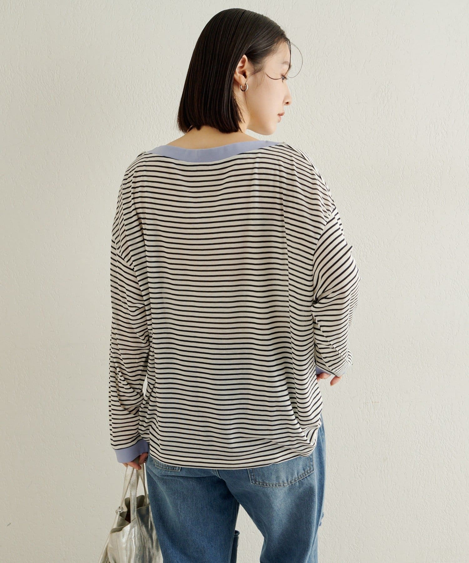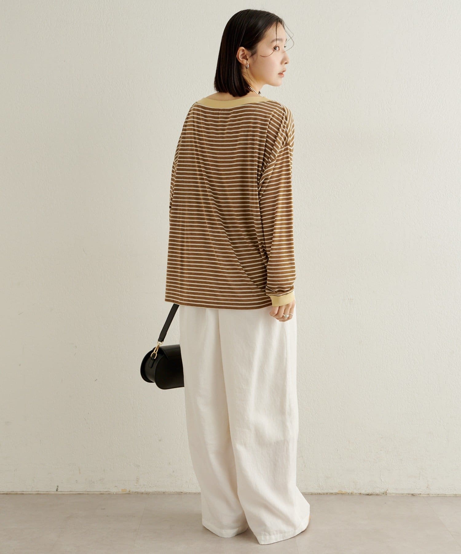 ・ネックのバイカラーな配色がアクセントになったボーダーオフショルロングTシャツ。