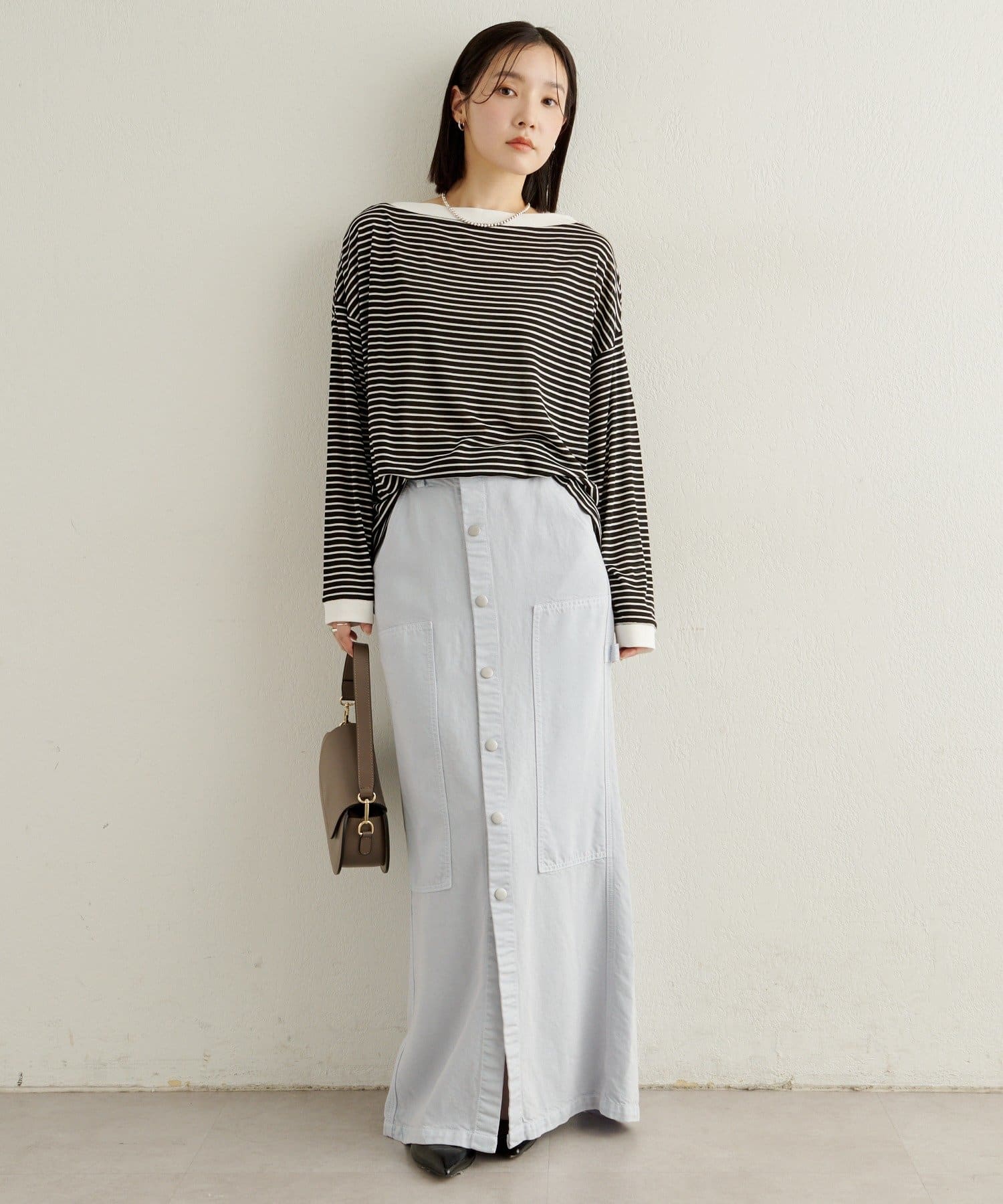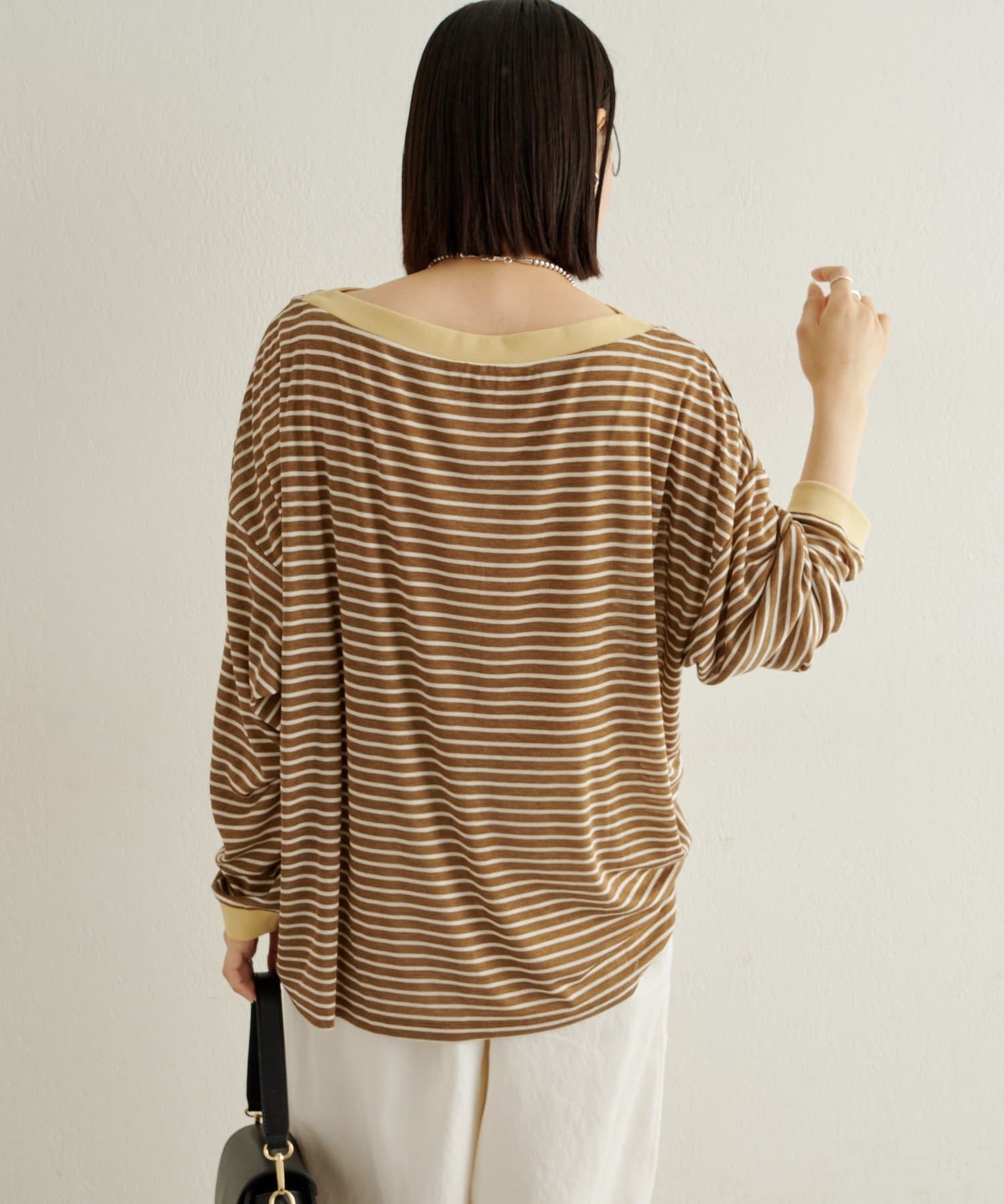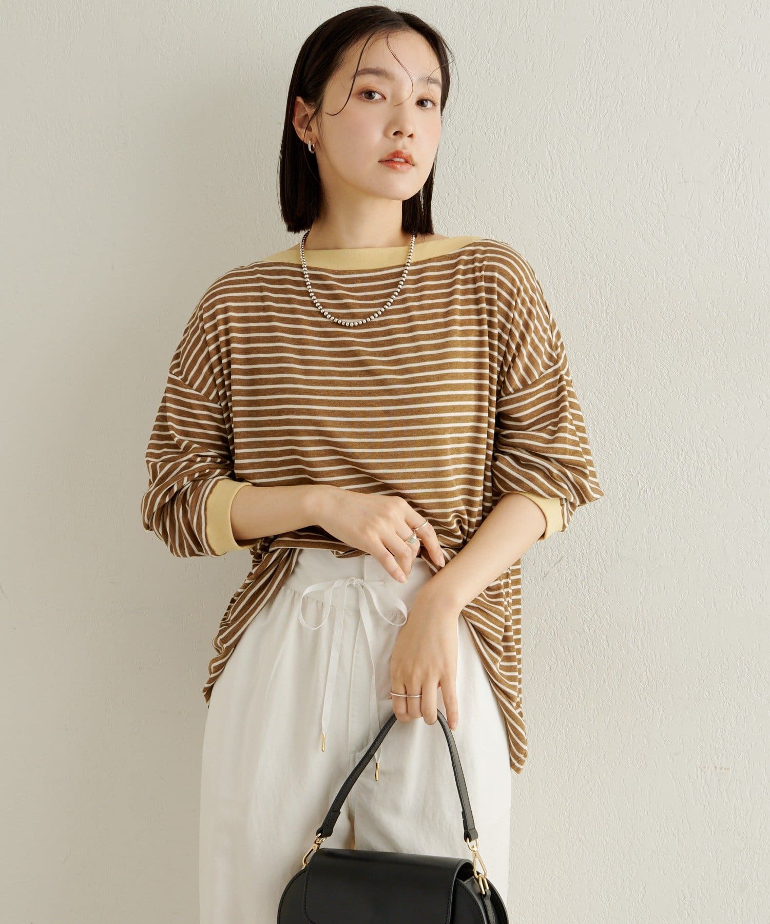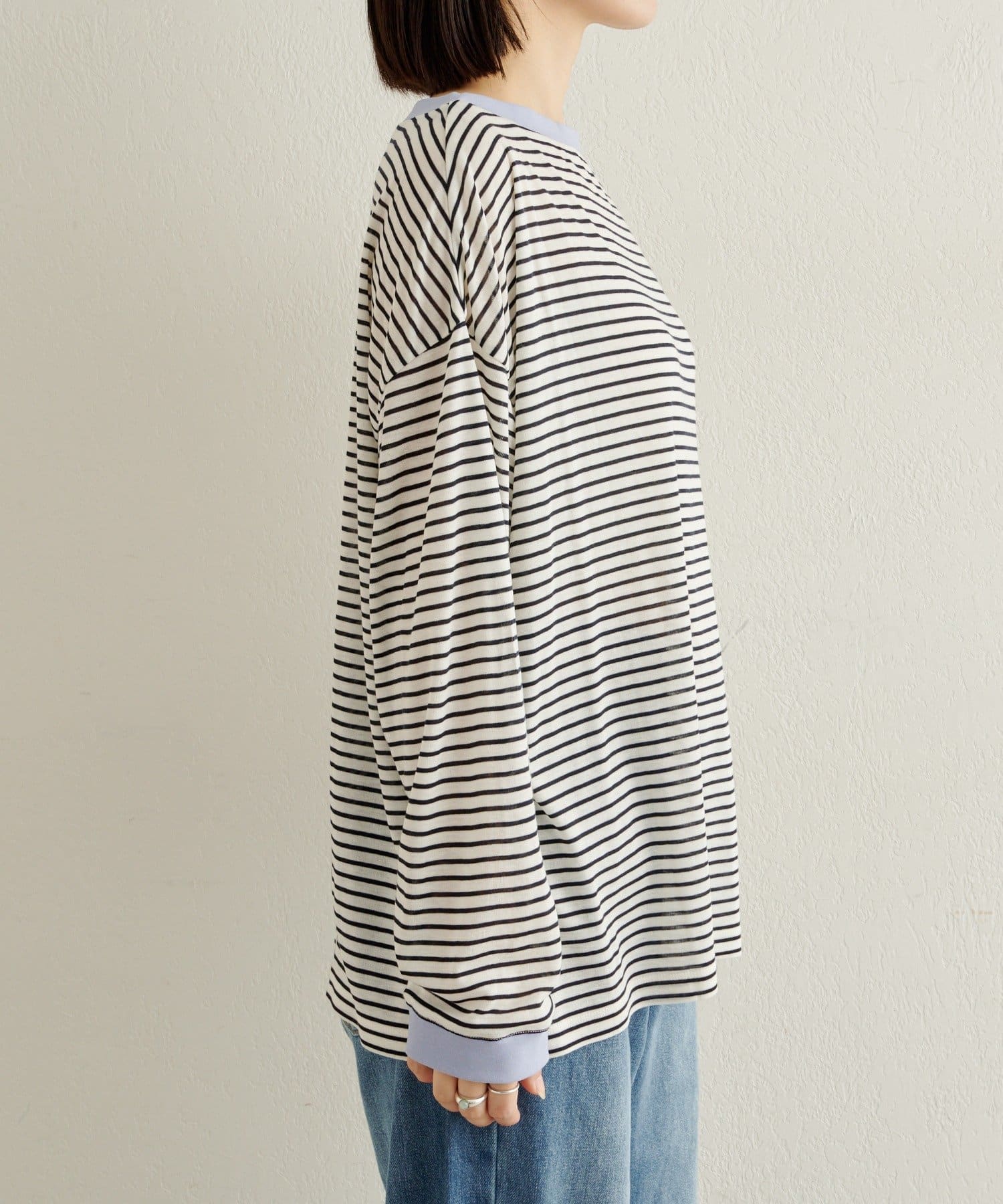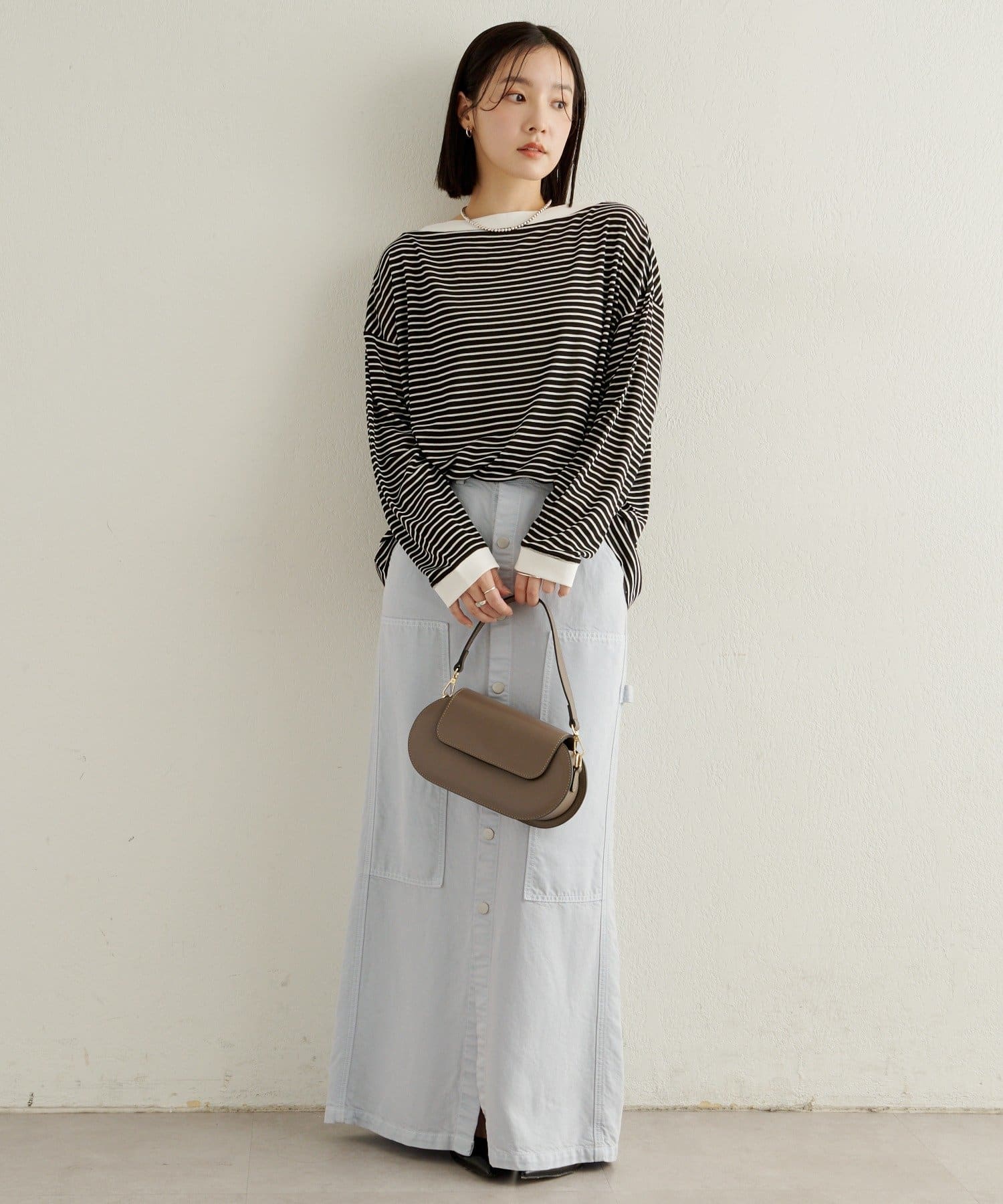 ・ネックのバイカラーな配色がアクセントになったボーダーオフショルロングTシャツ。