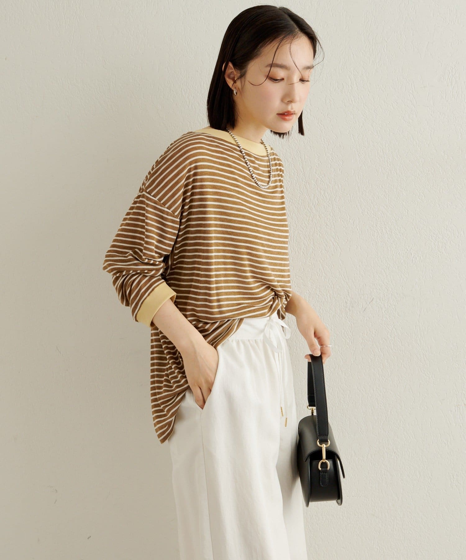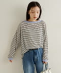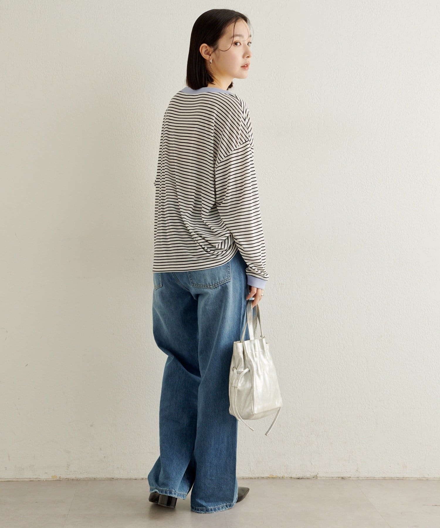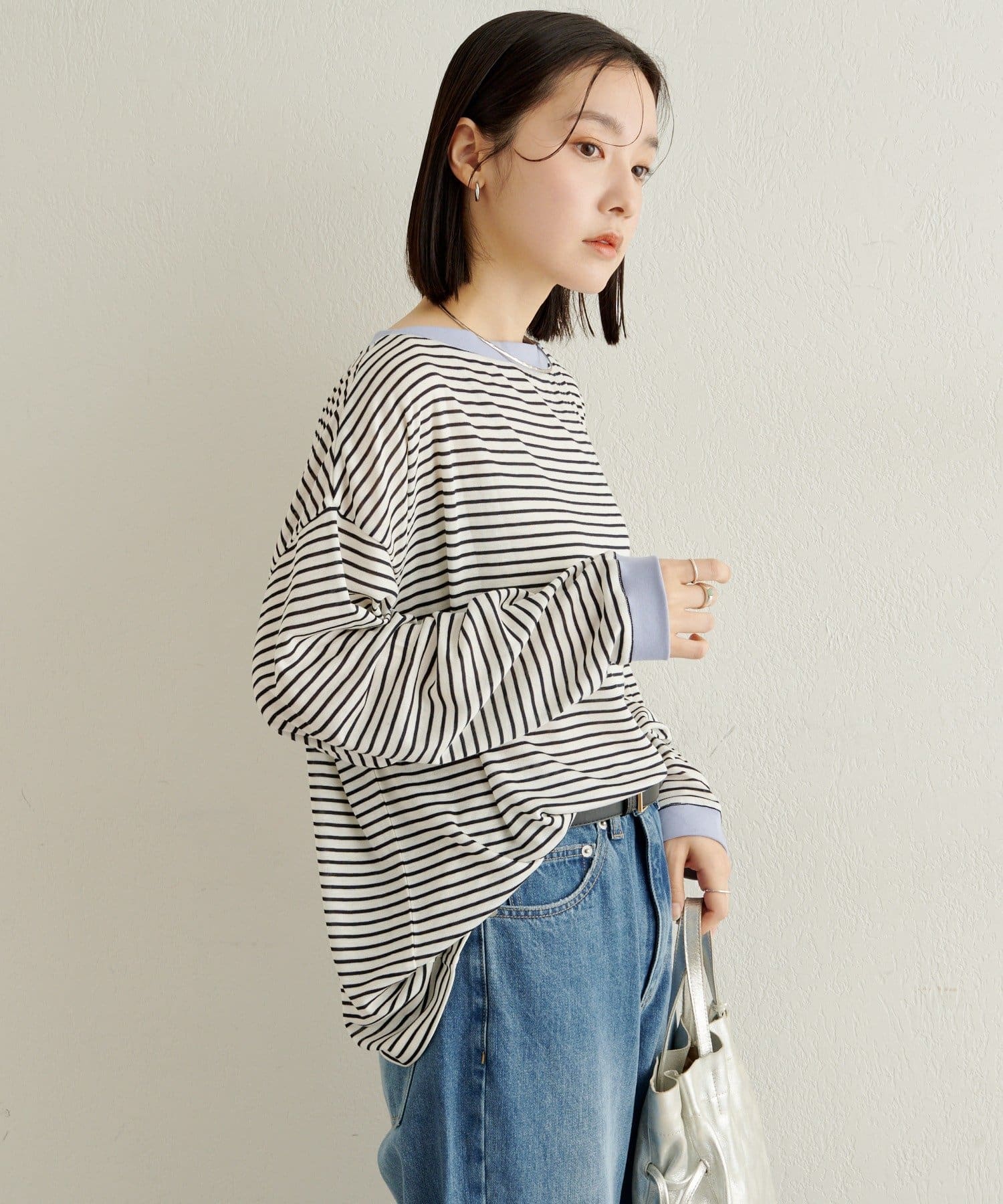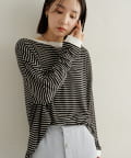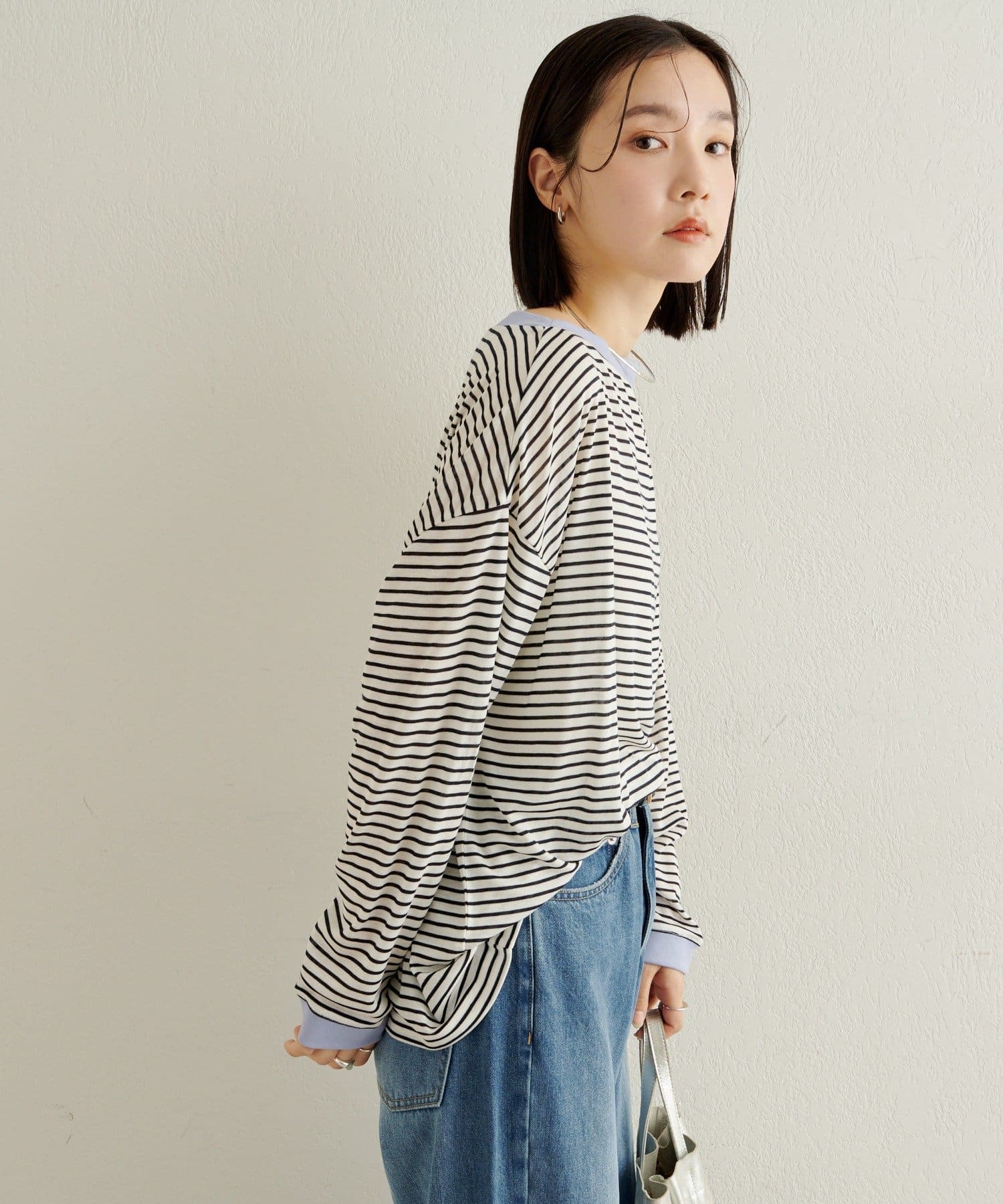 ・ネックのバイカラーな配色がアクセントになったボーダーオフショルロングTシャツ。