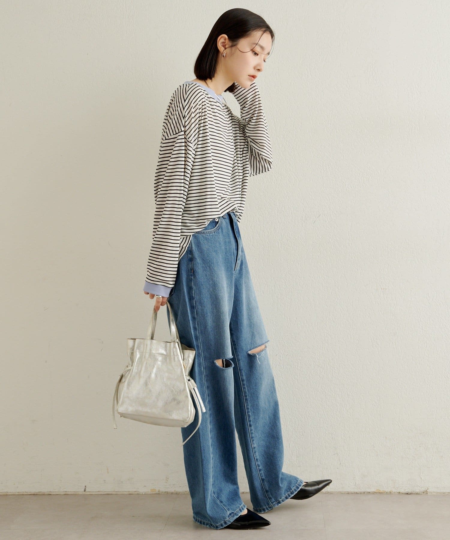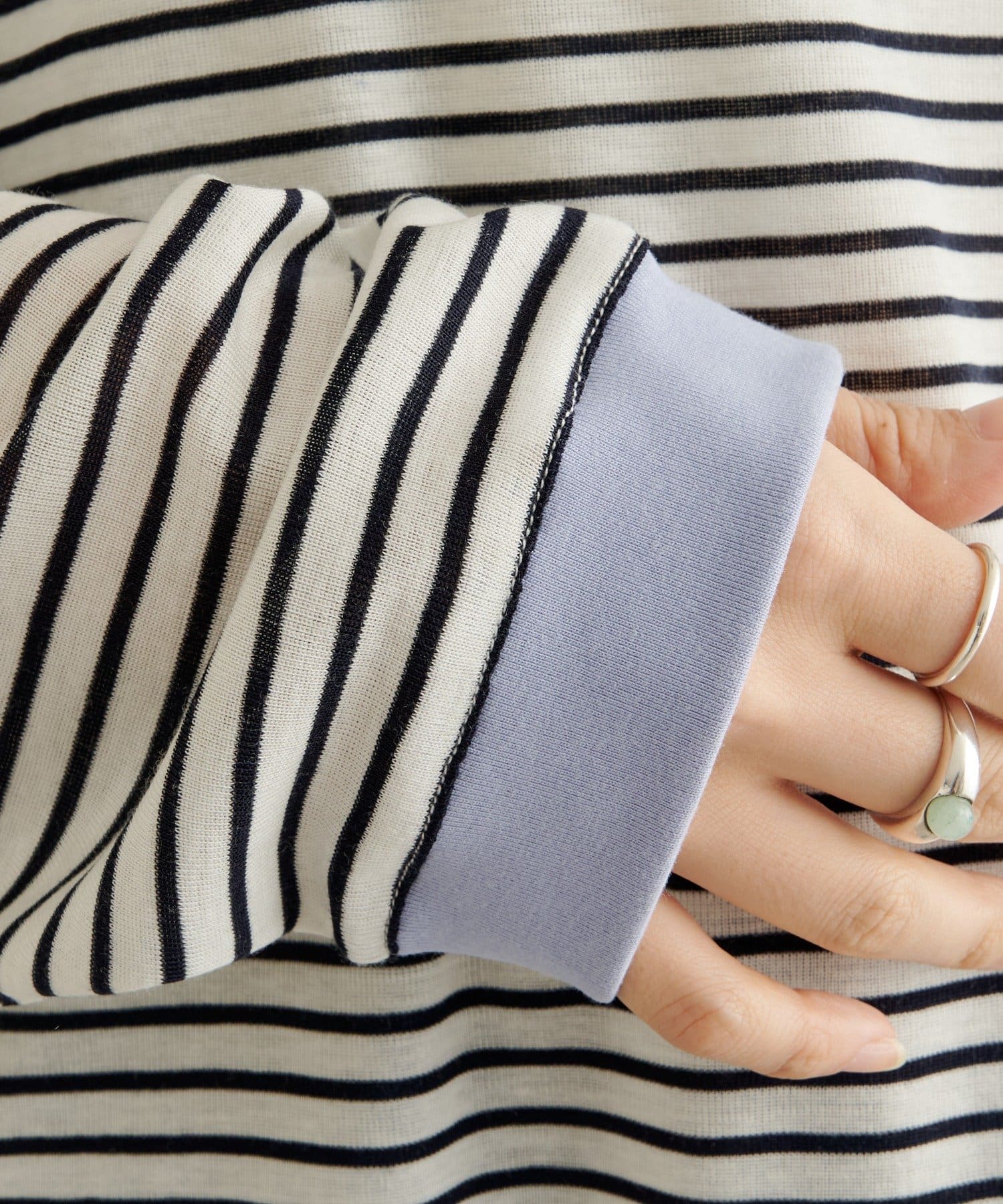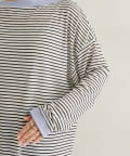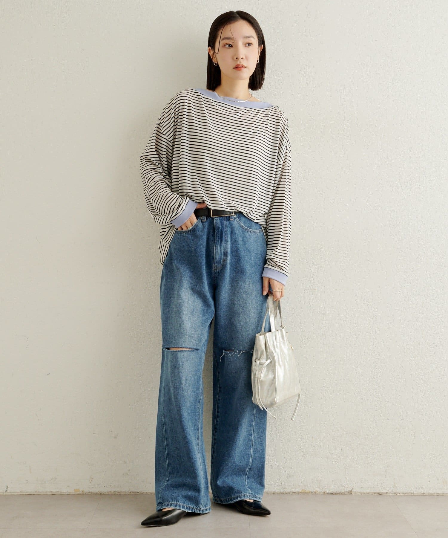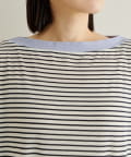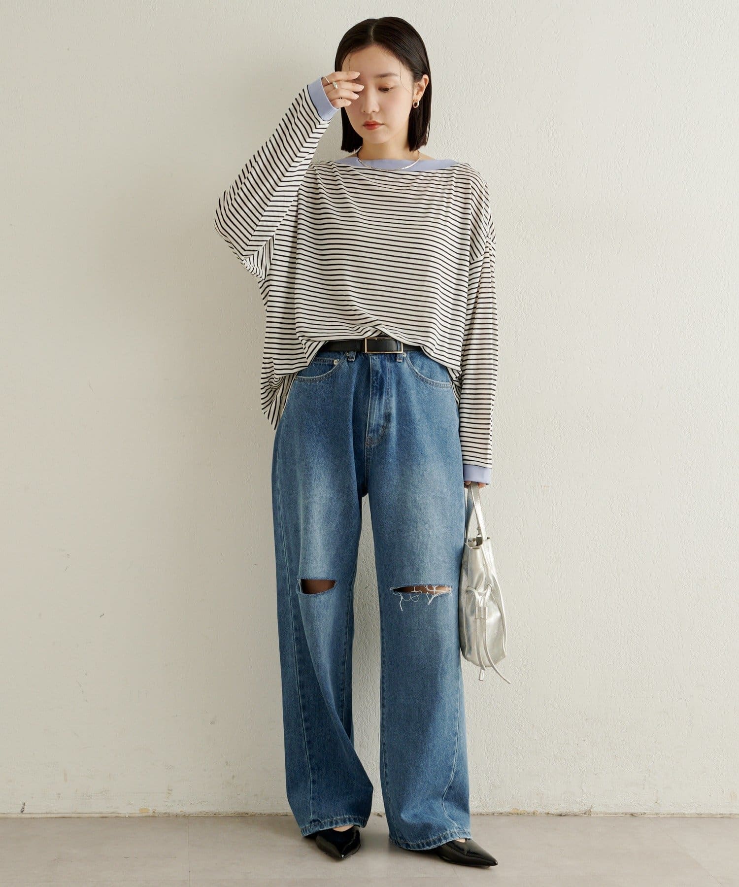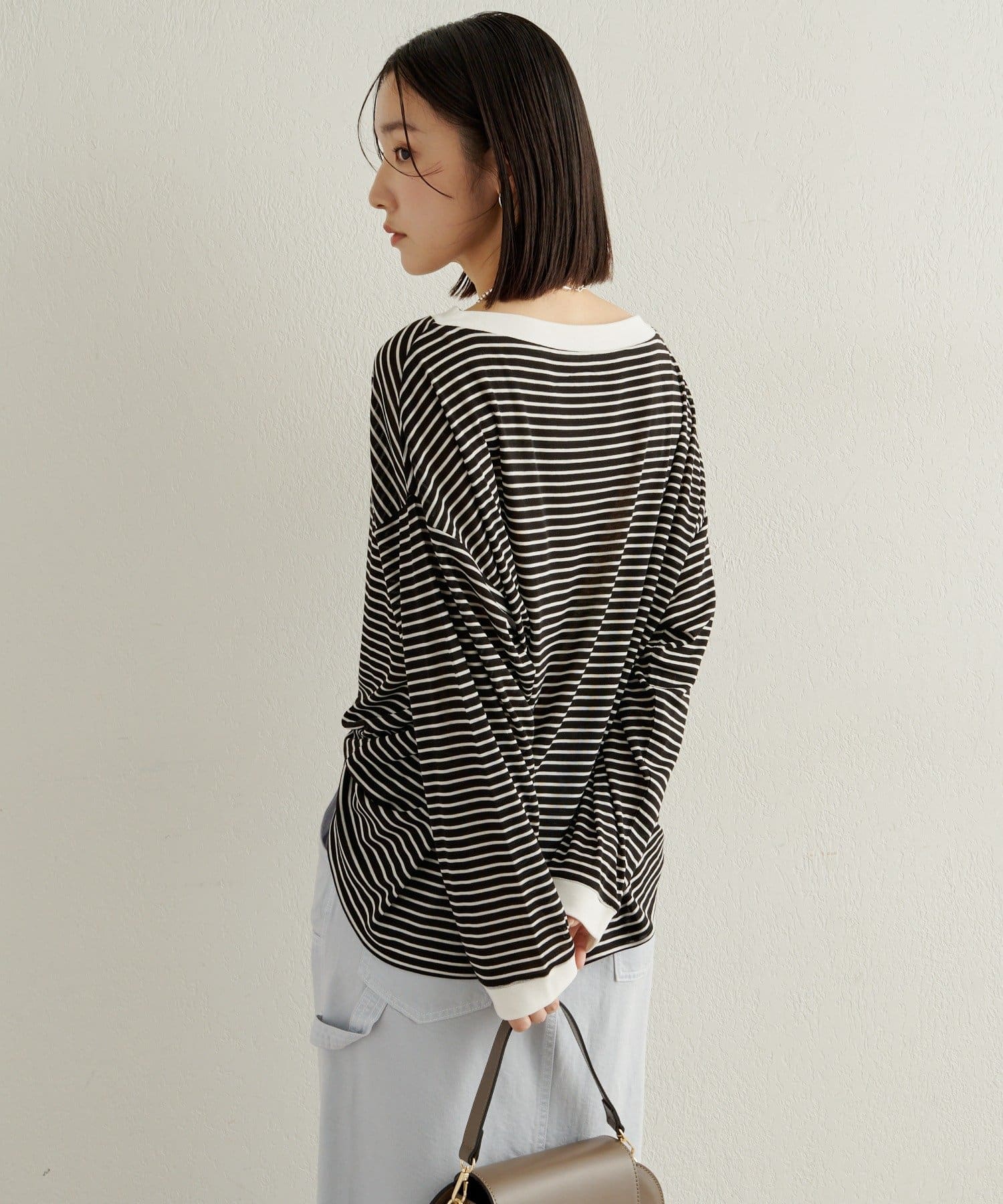 ・ネックのバイカラーな配色がアクセントになったボーダーオフショルロングTシャツ。