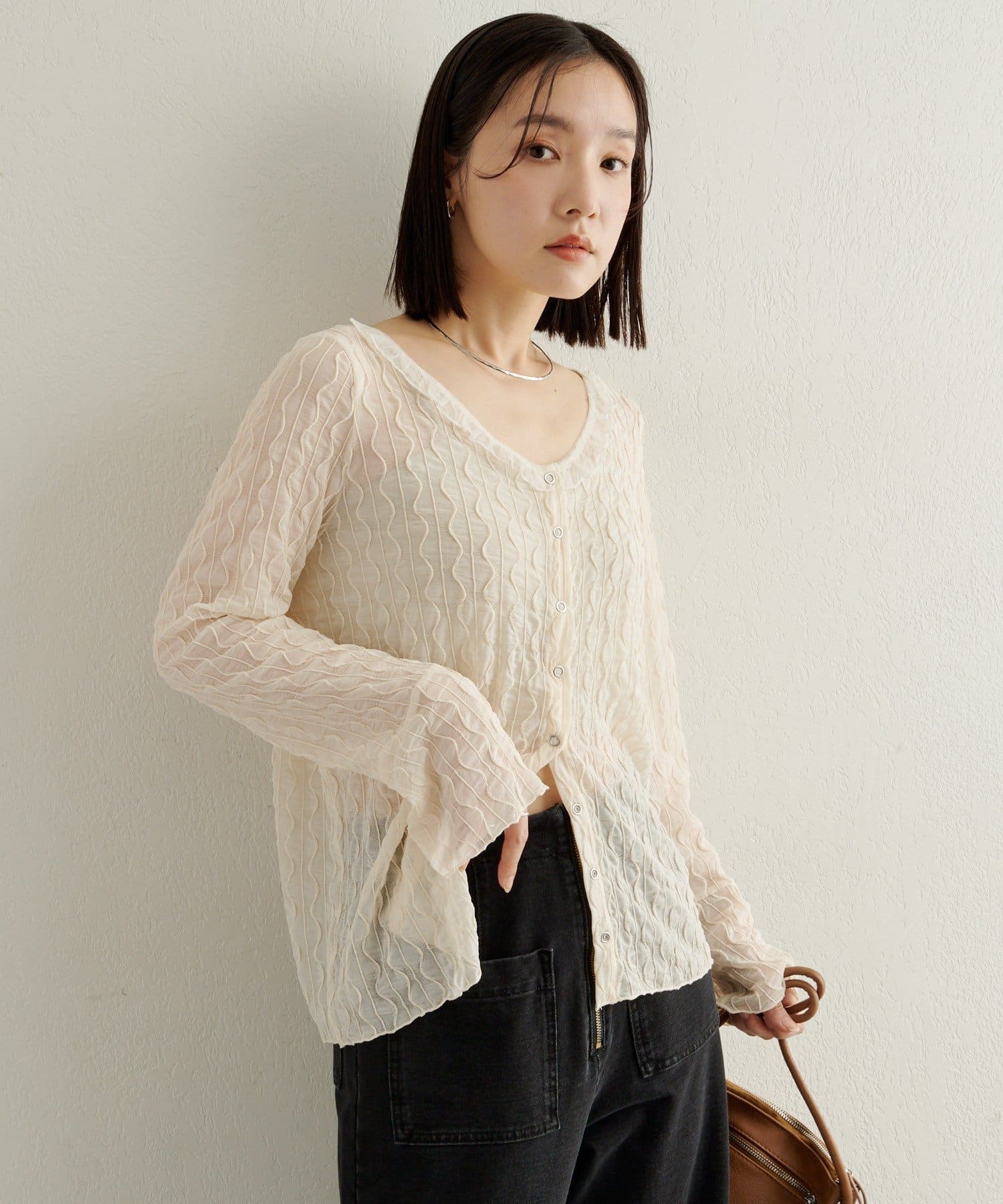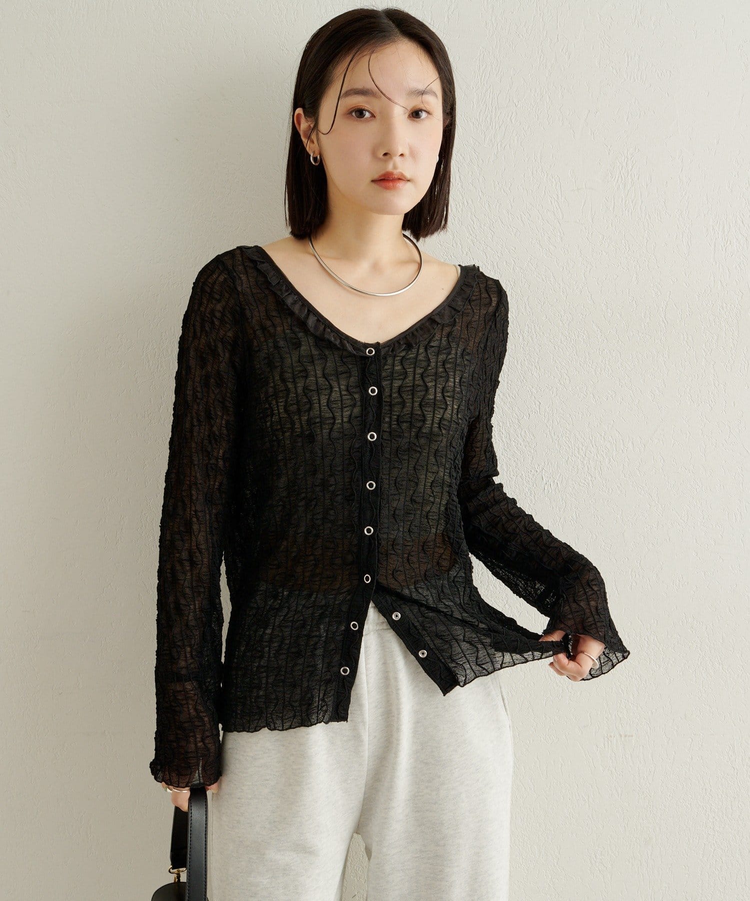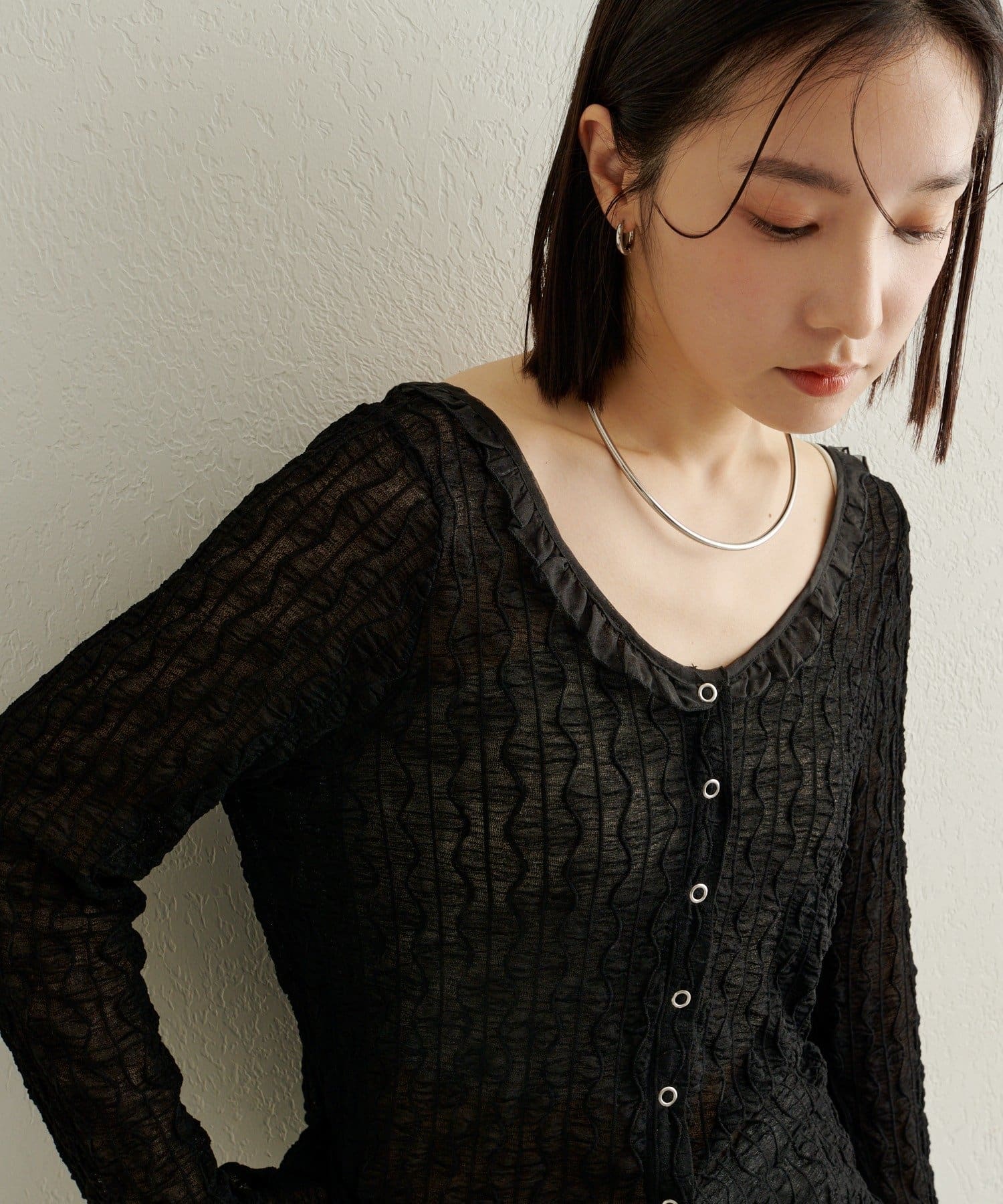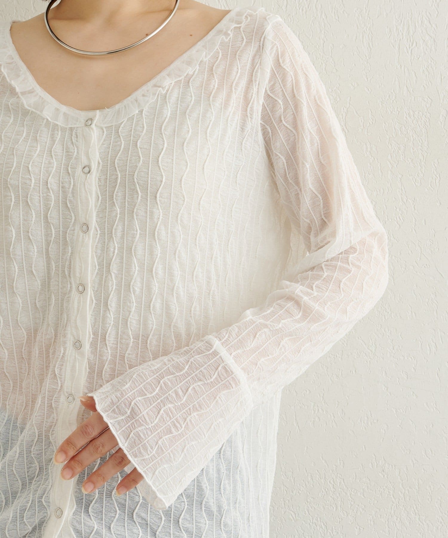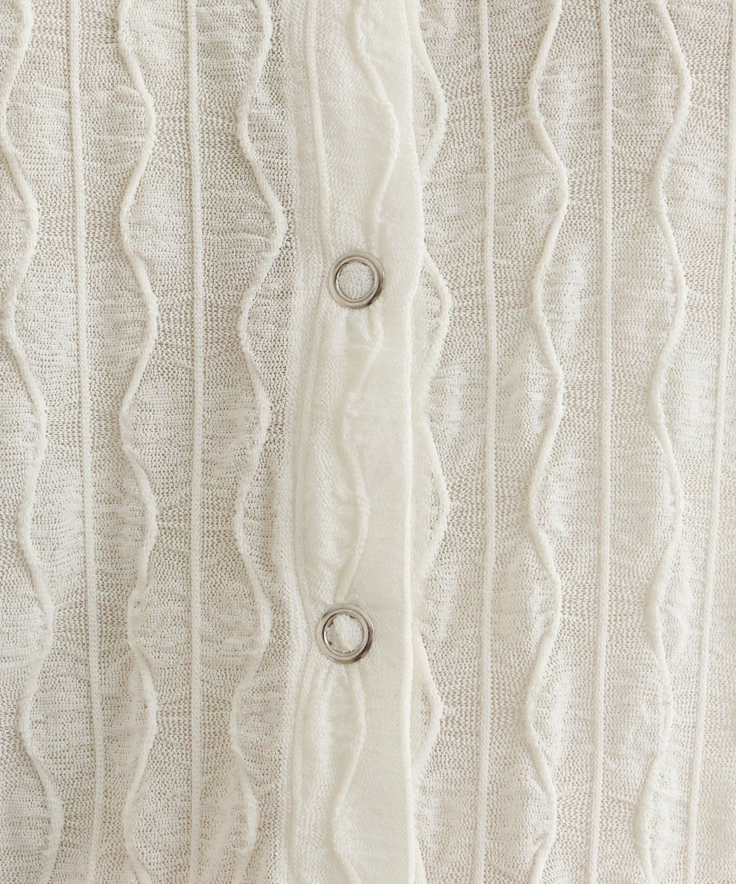 ・ウェーブの独特な柄とシアー感、フリルデザインが、スタイリングにフェミニンな印象をプラスしてくれるカーディガン