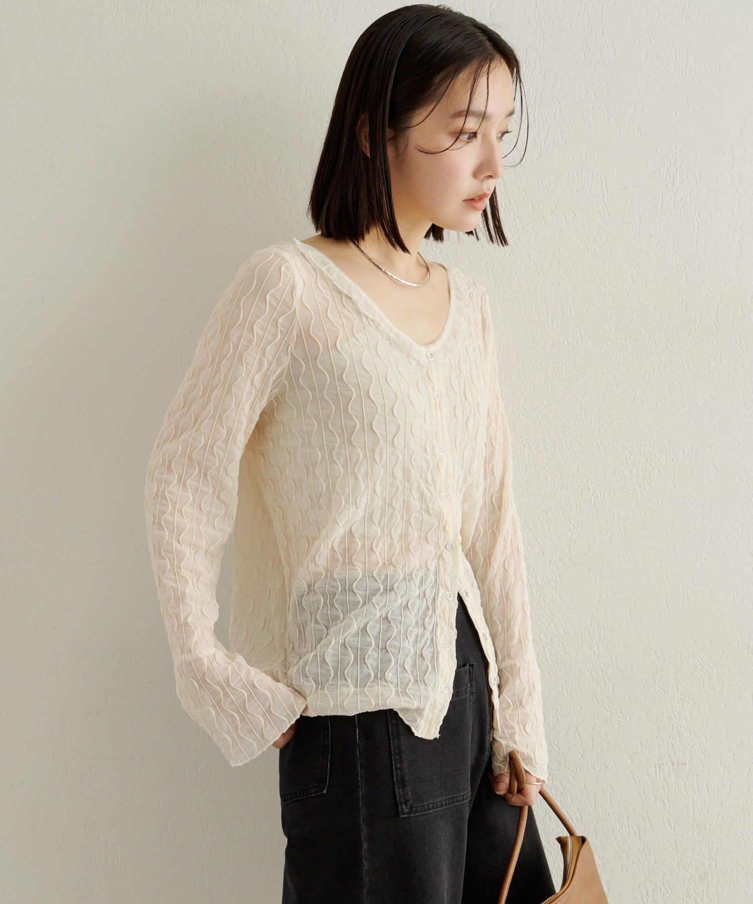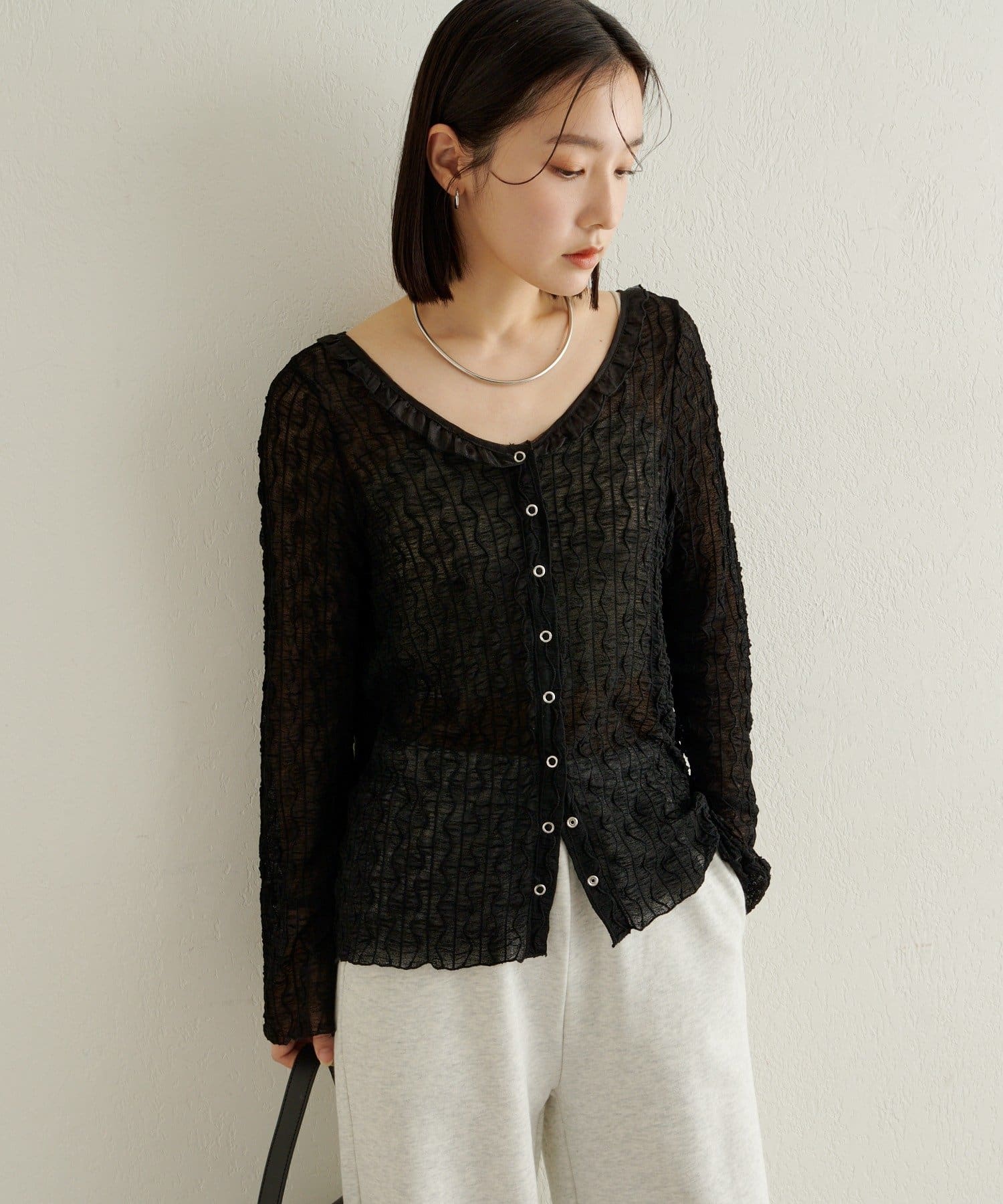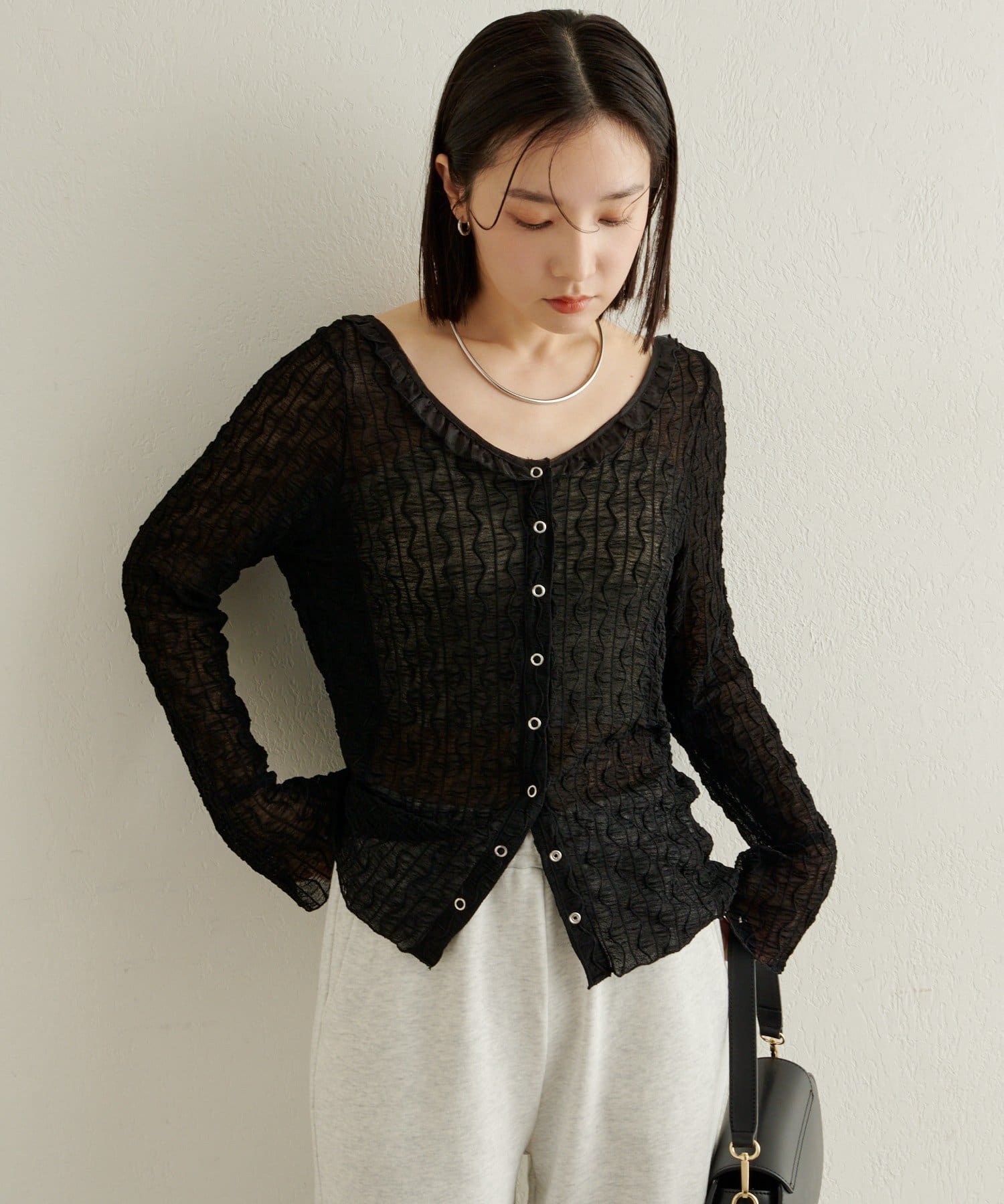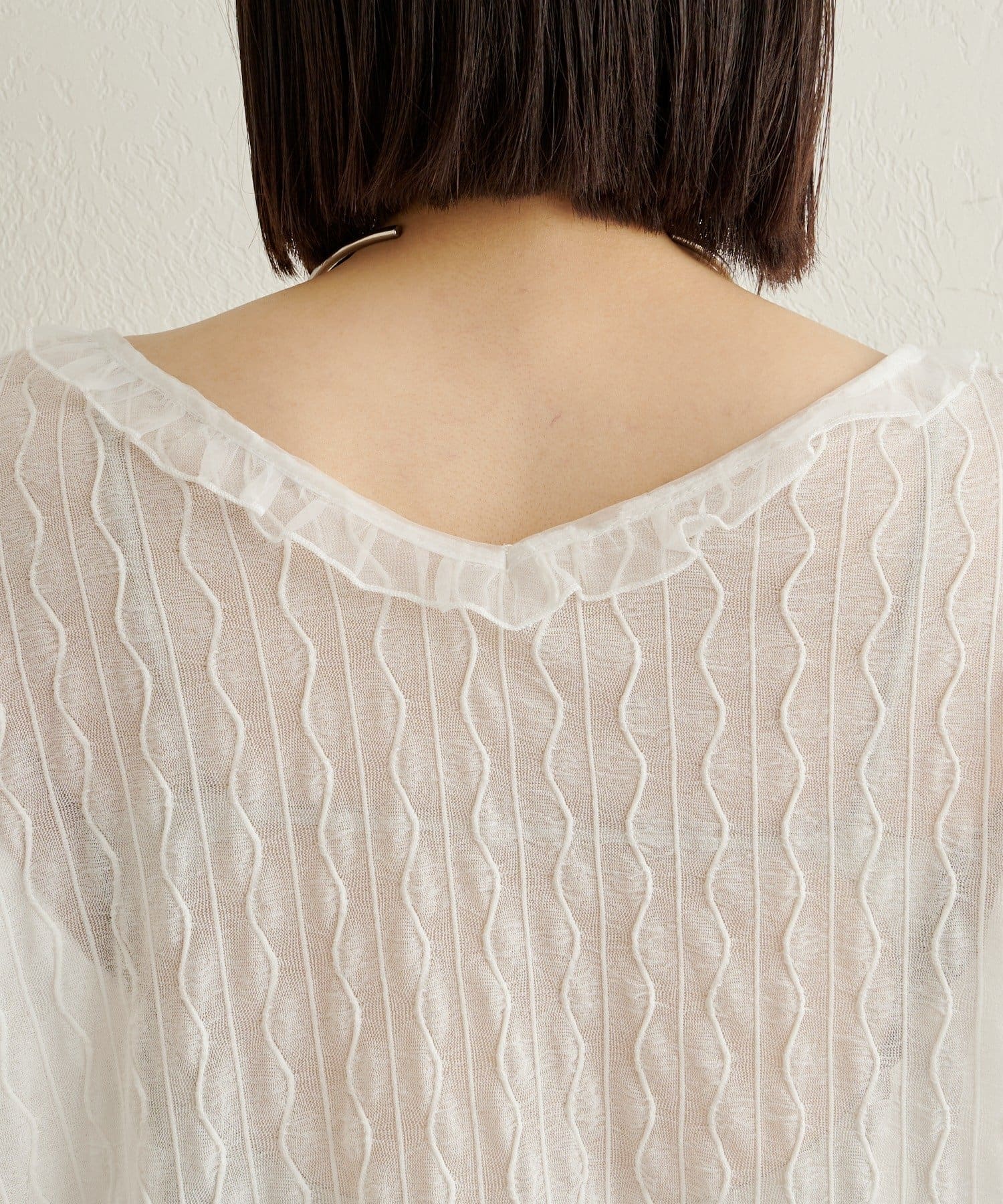 ・ウェーブの独特な柄とシアー感、フリルデザインが、スタイリングにフェミニンな印象をプラスしてくれるカーディガン