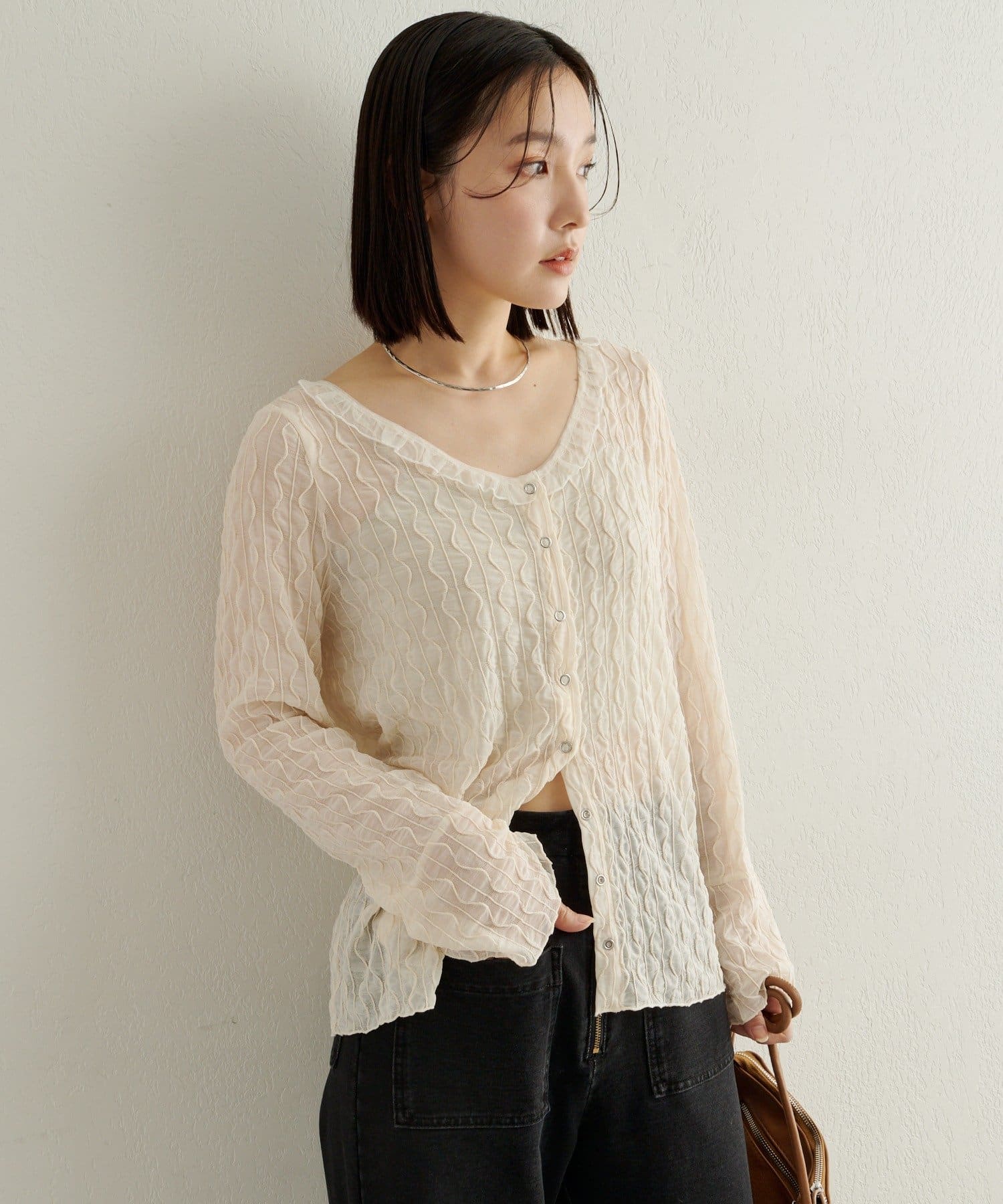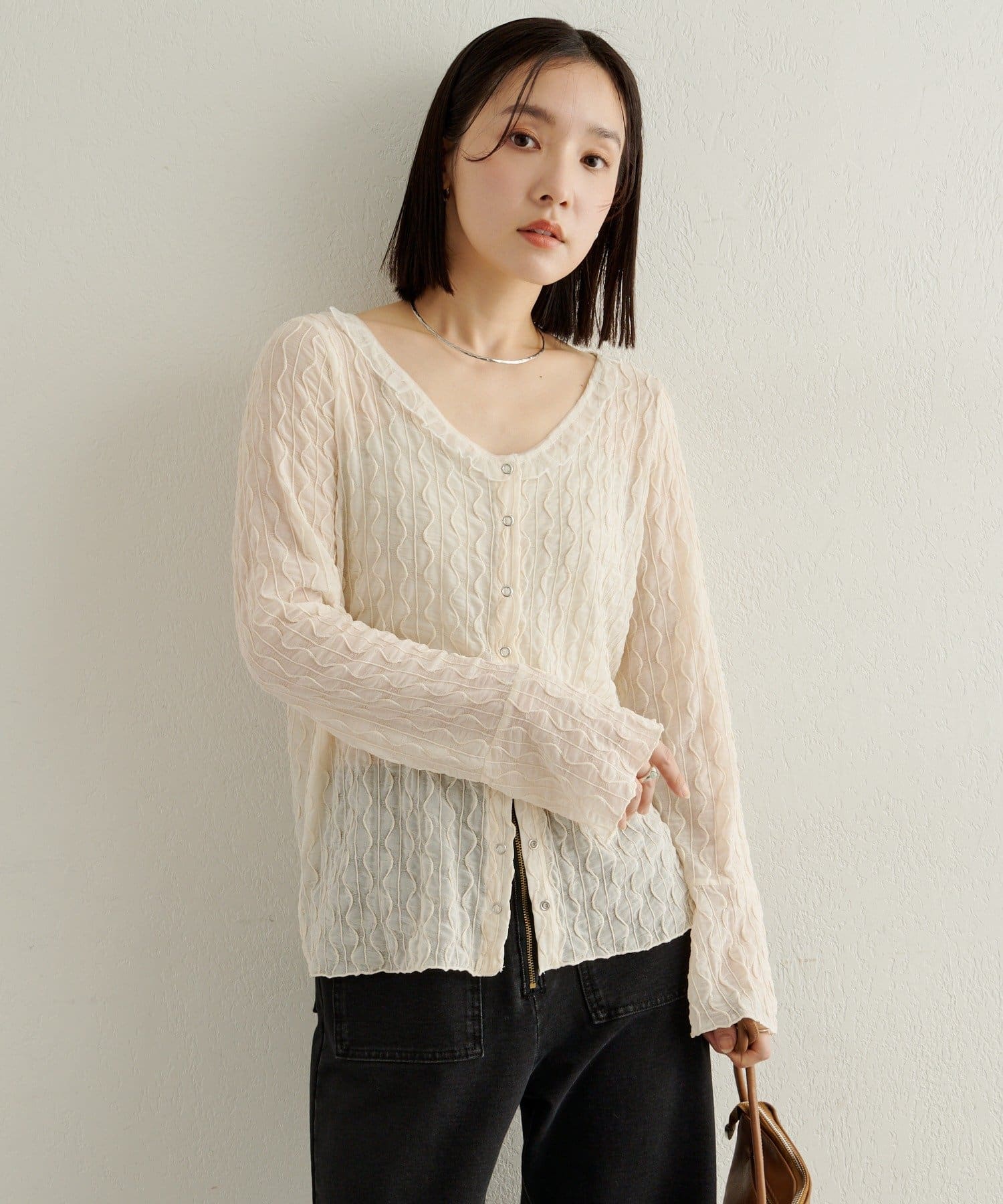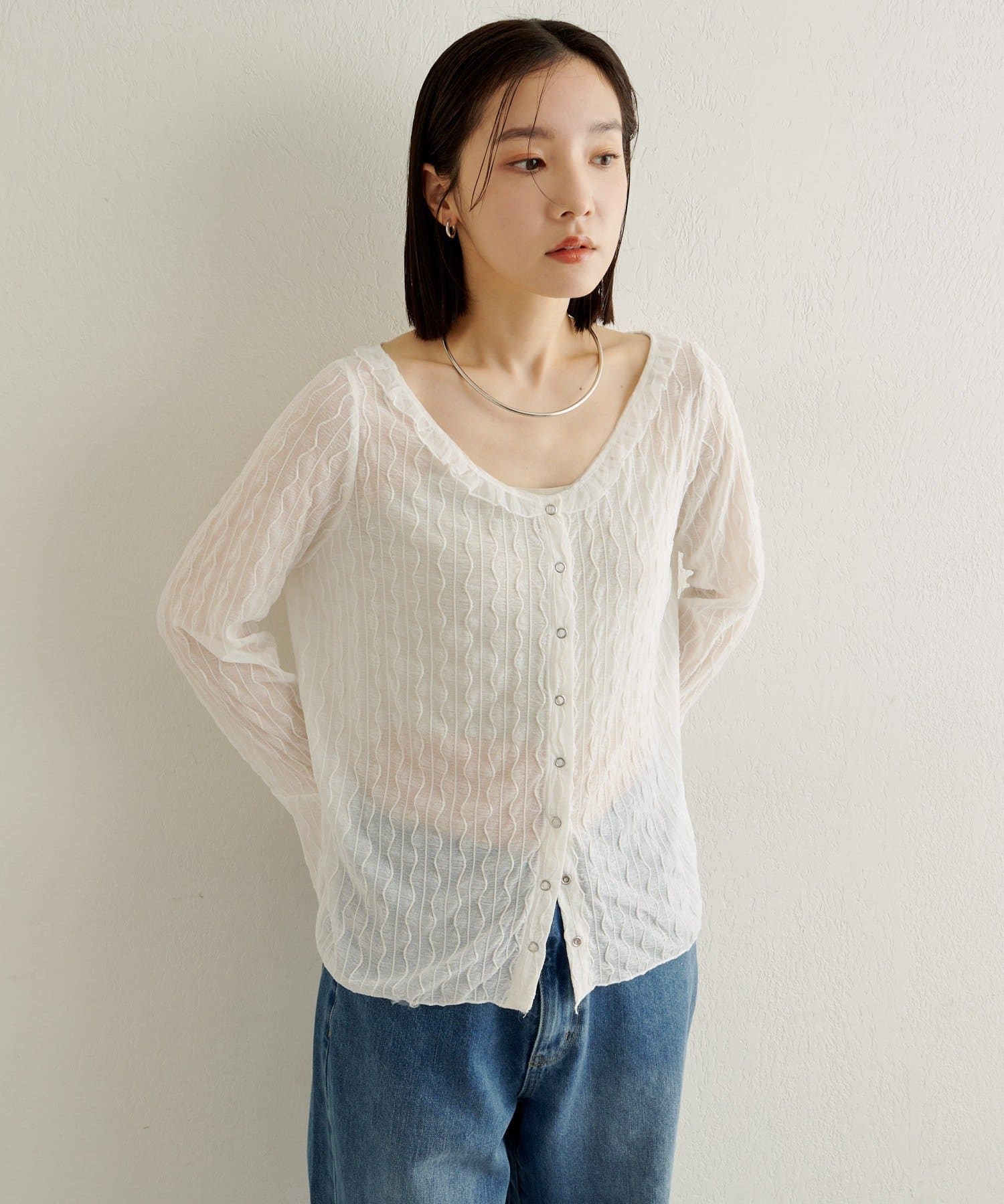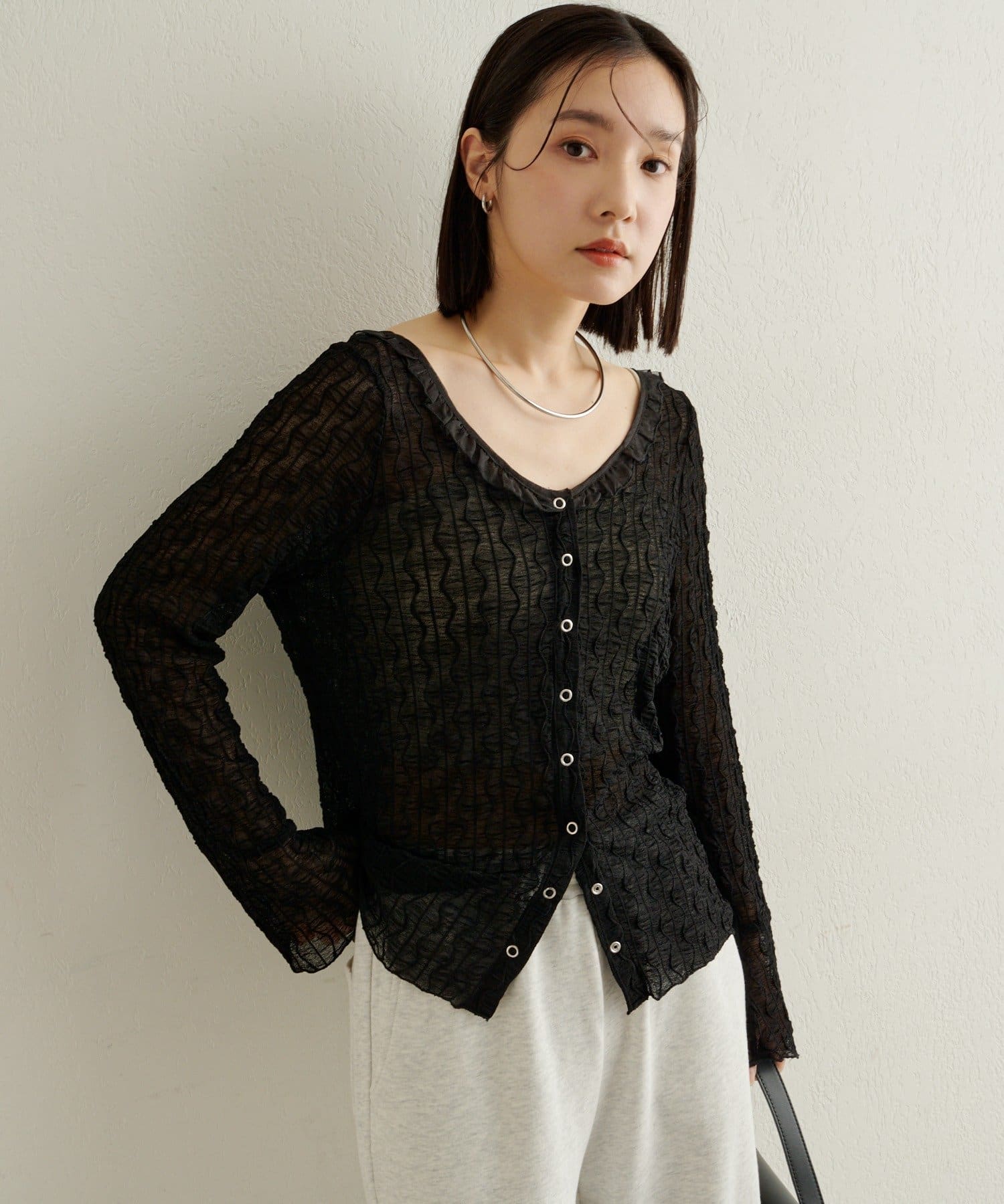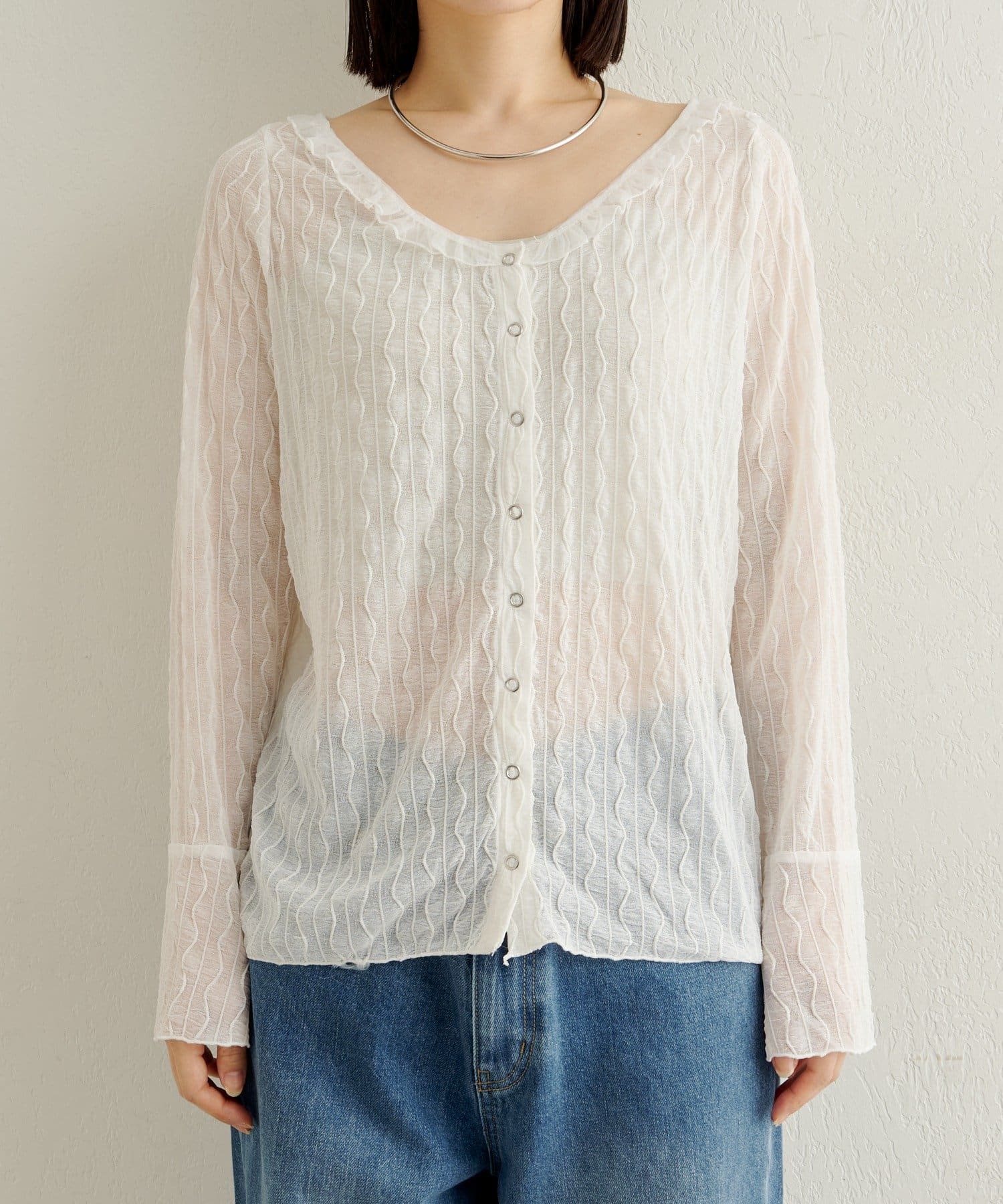 ・ウェーブの独特な柄とシアー感、フリルデザインが、スタイリングにフェミニンな印象をプラスしてくれるカーディガン