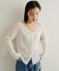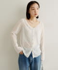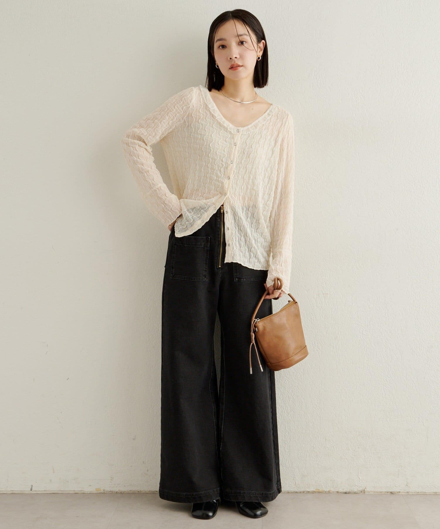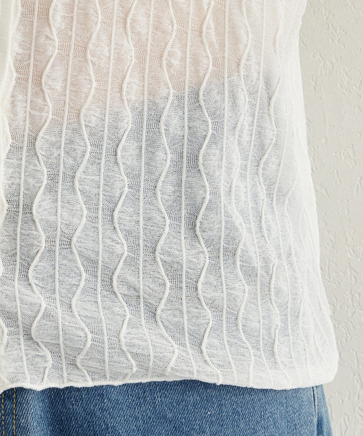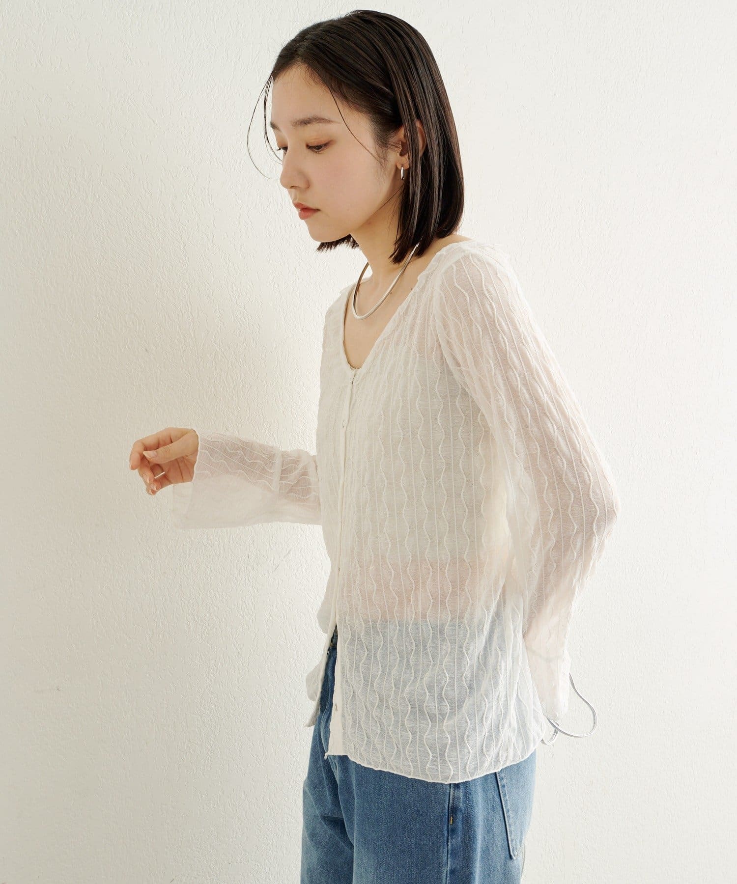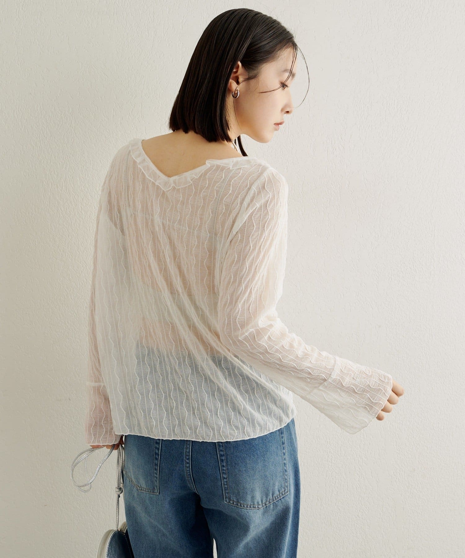 ・ウェーブの独特な柄とシアー感、フリルデザインが、スタイリングにフェミニンな印象をプラスしてくれるカーディガン