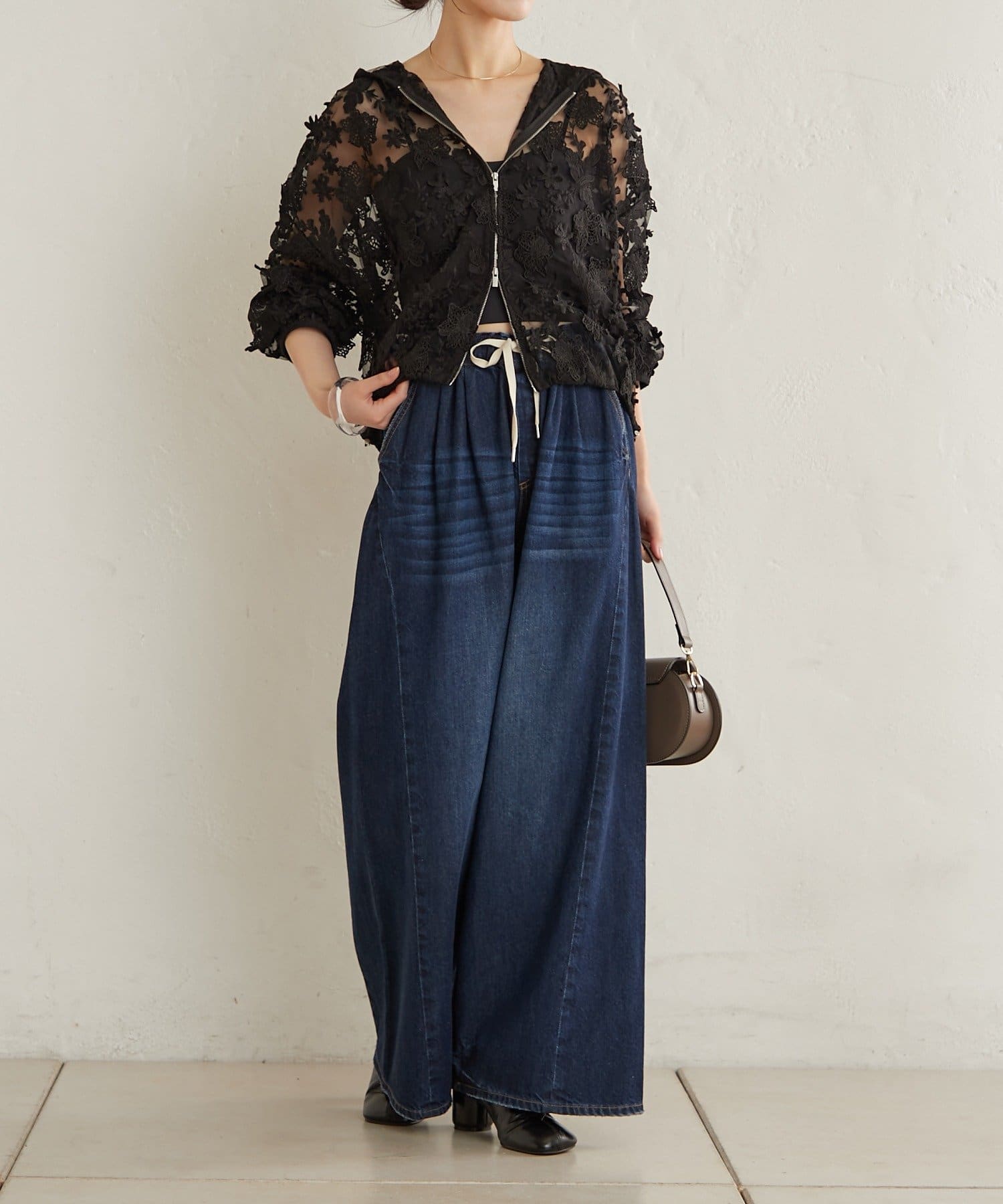 ・シアーな総レースが華やかで、キャミやタンクトップを合わせるだけでヘルシーな着こなしが叶います。