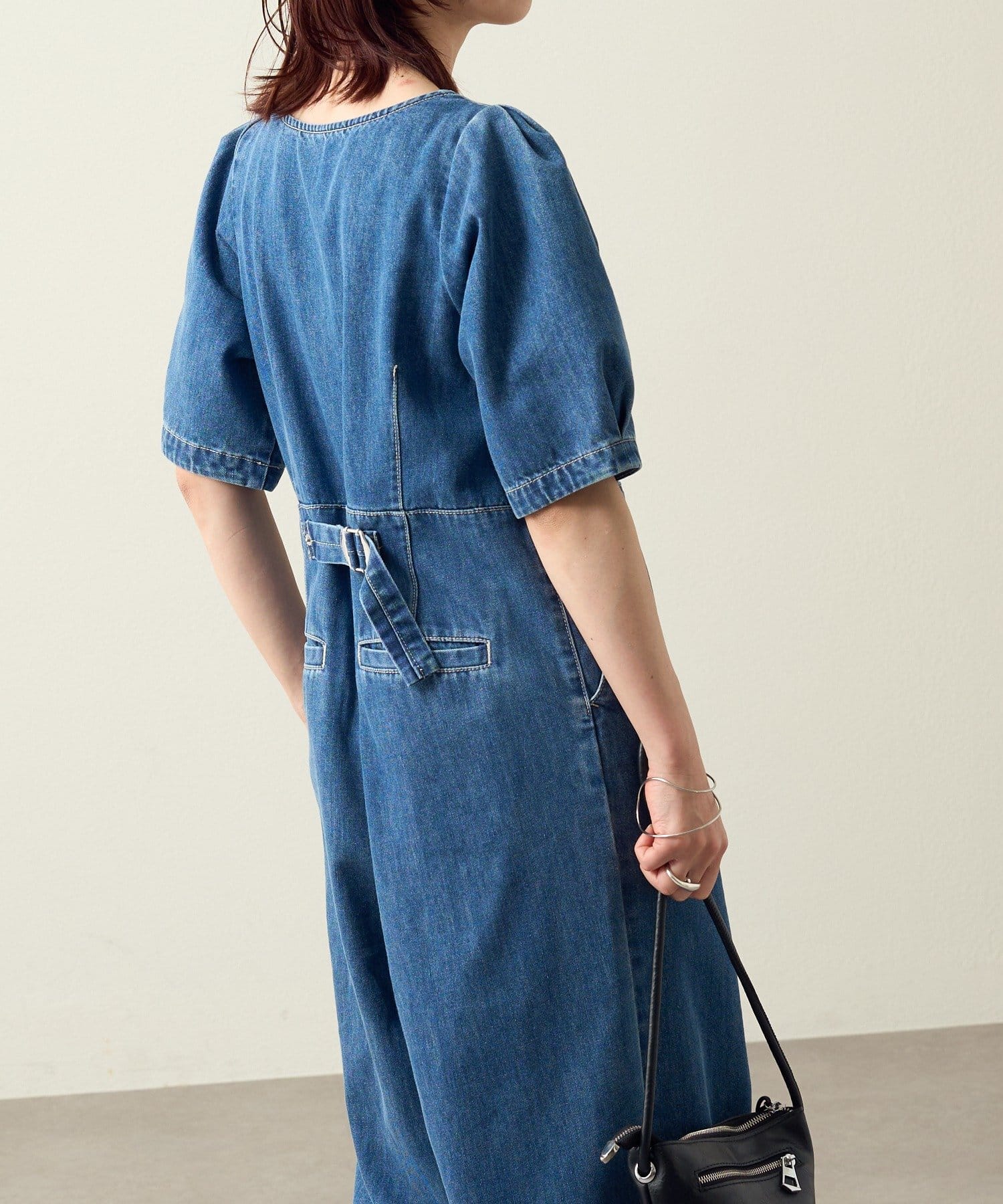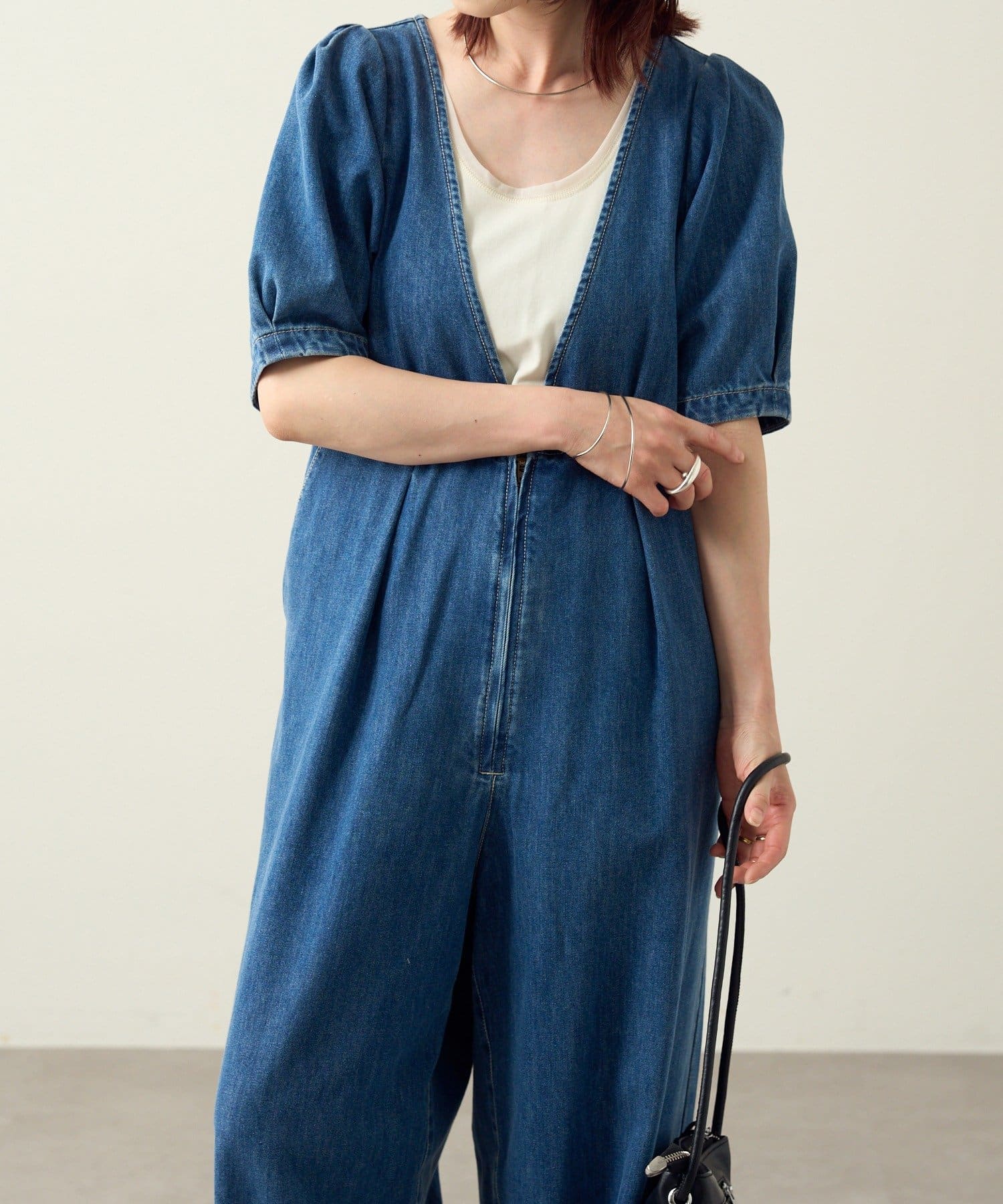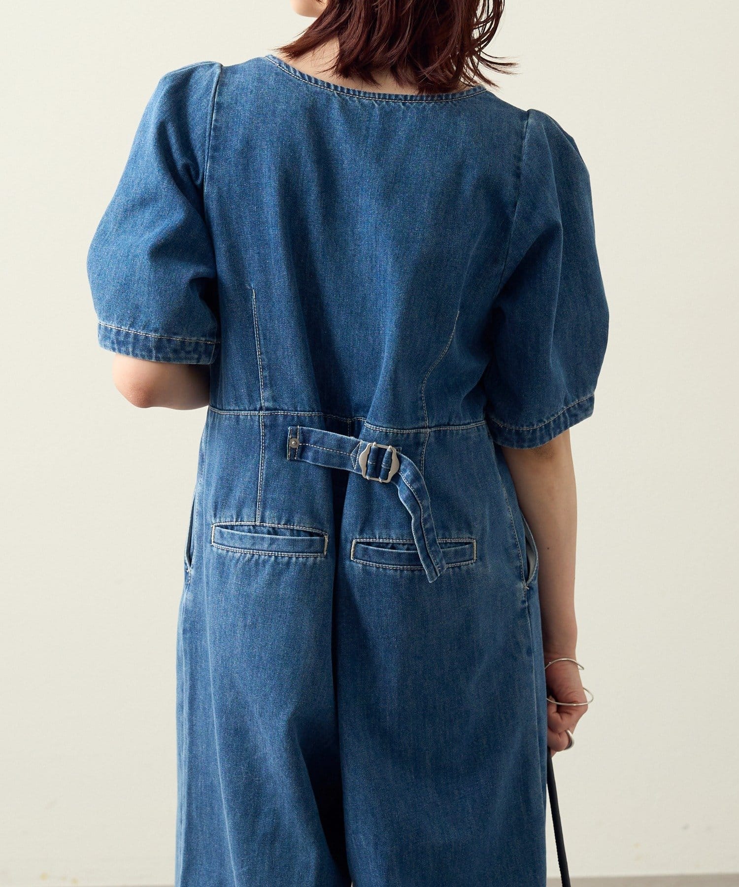 ・カジュアルなデニム素材にパフデザインが女性らしいオールインワン。