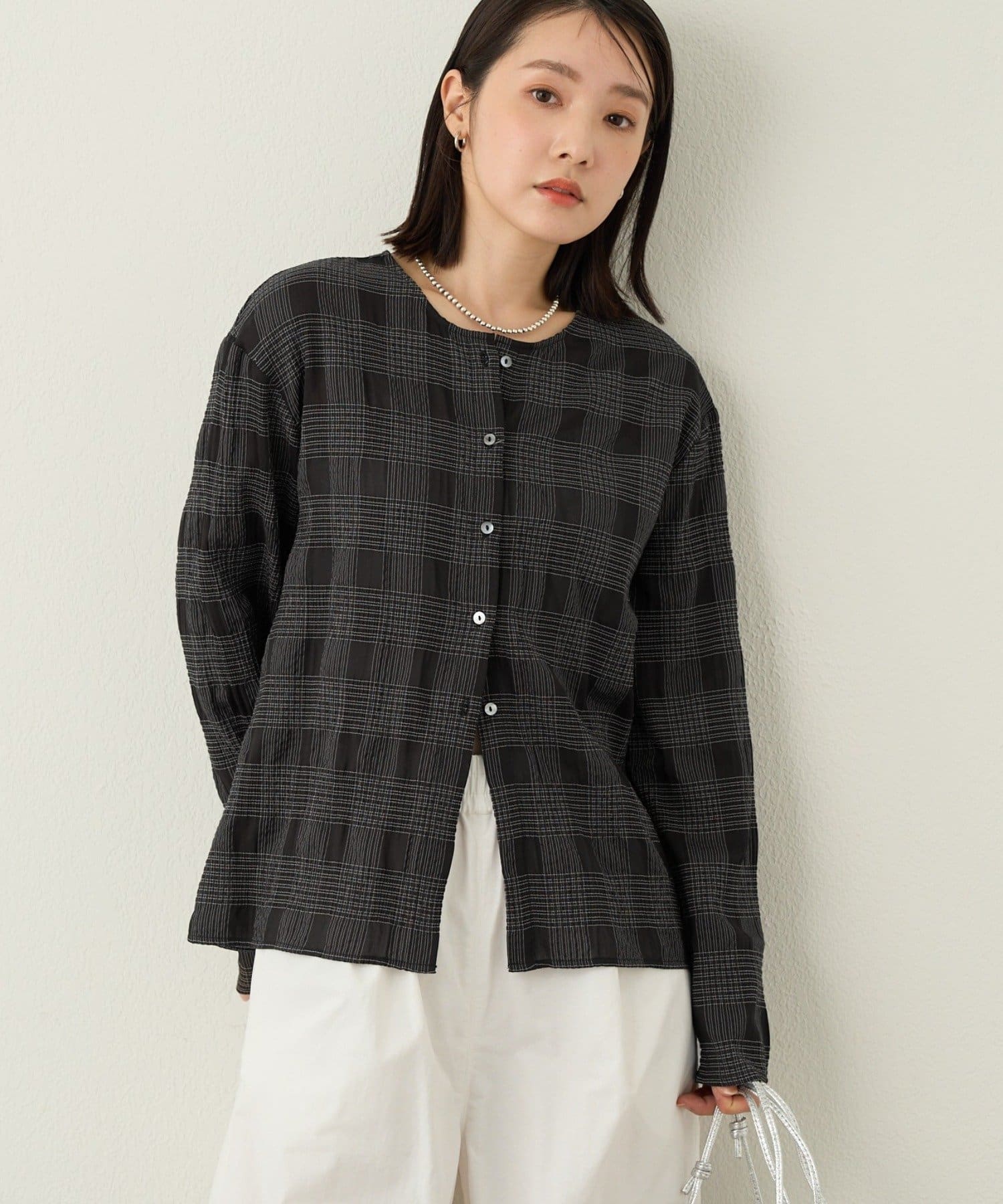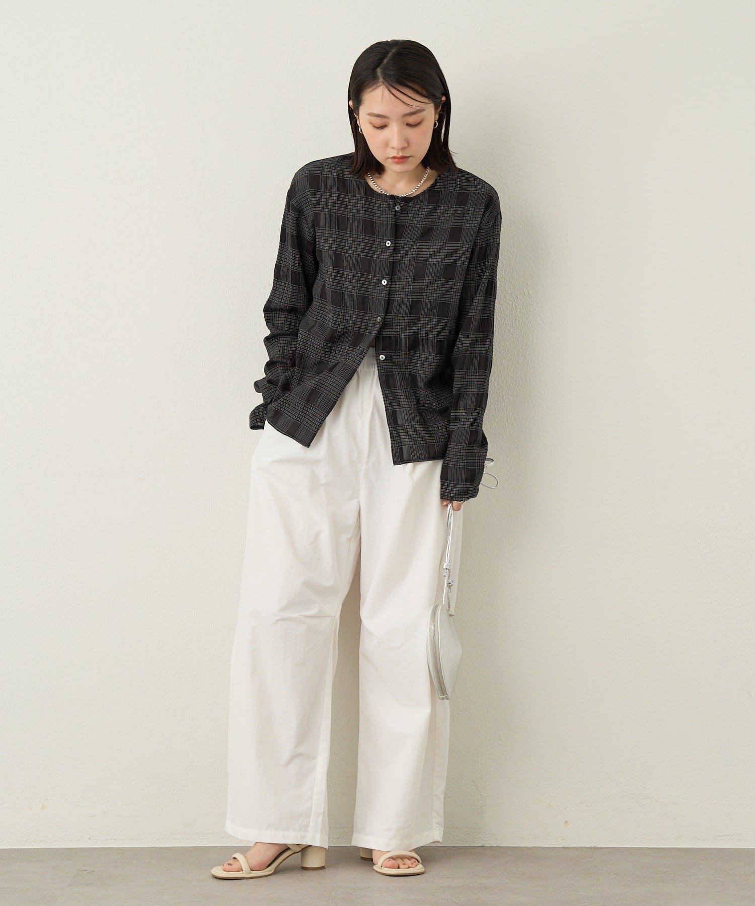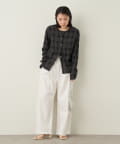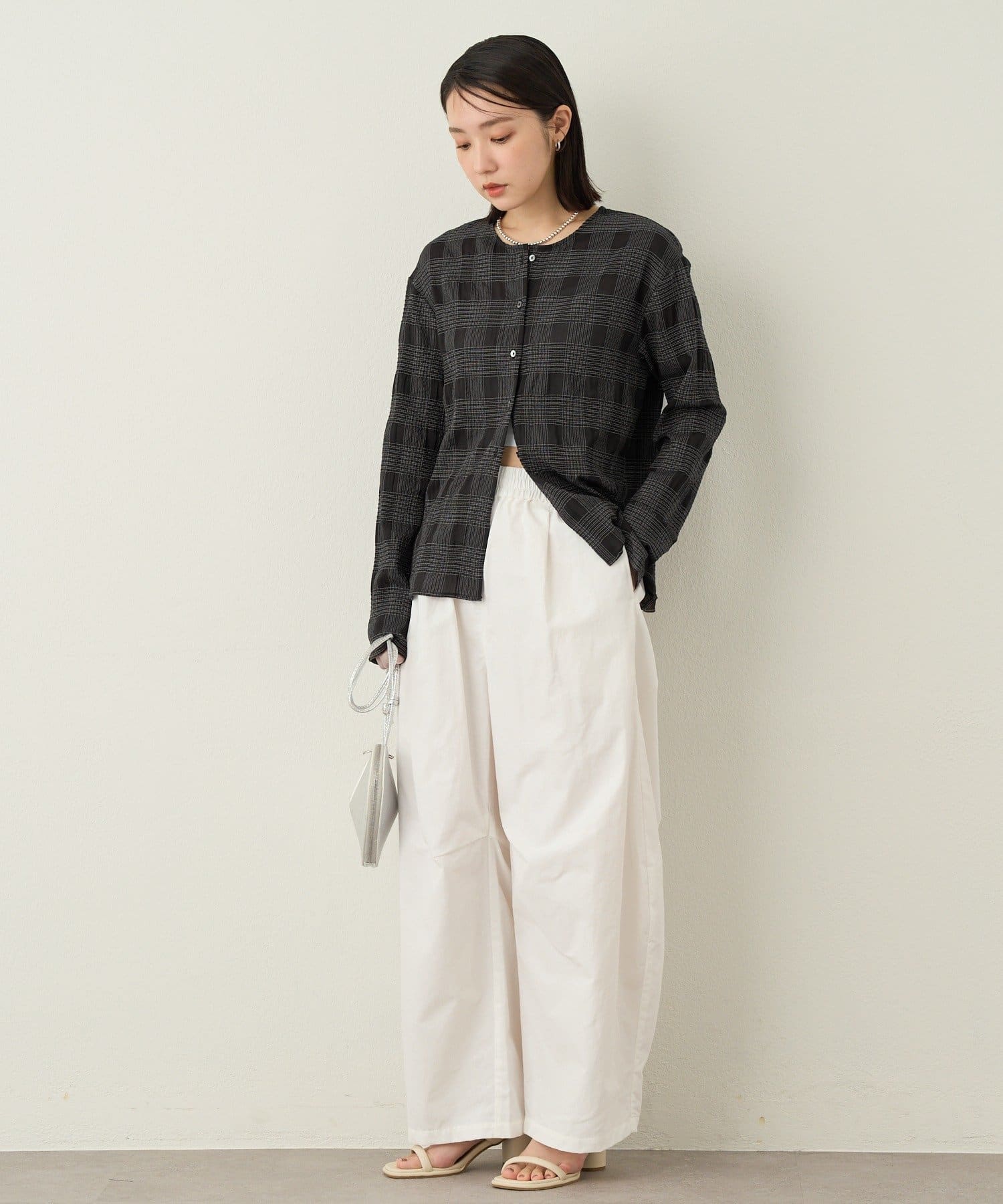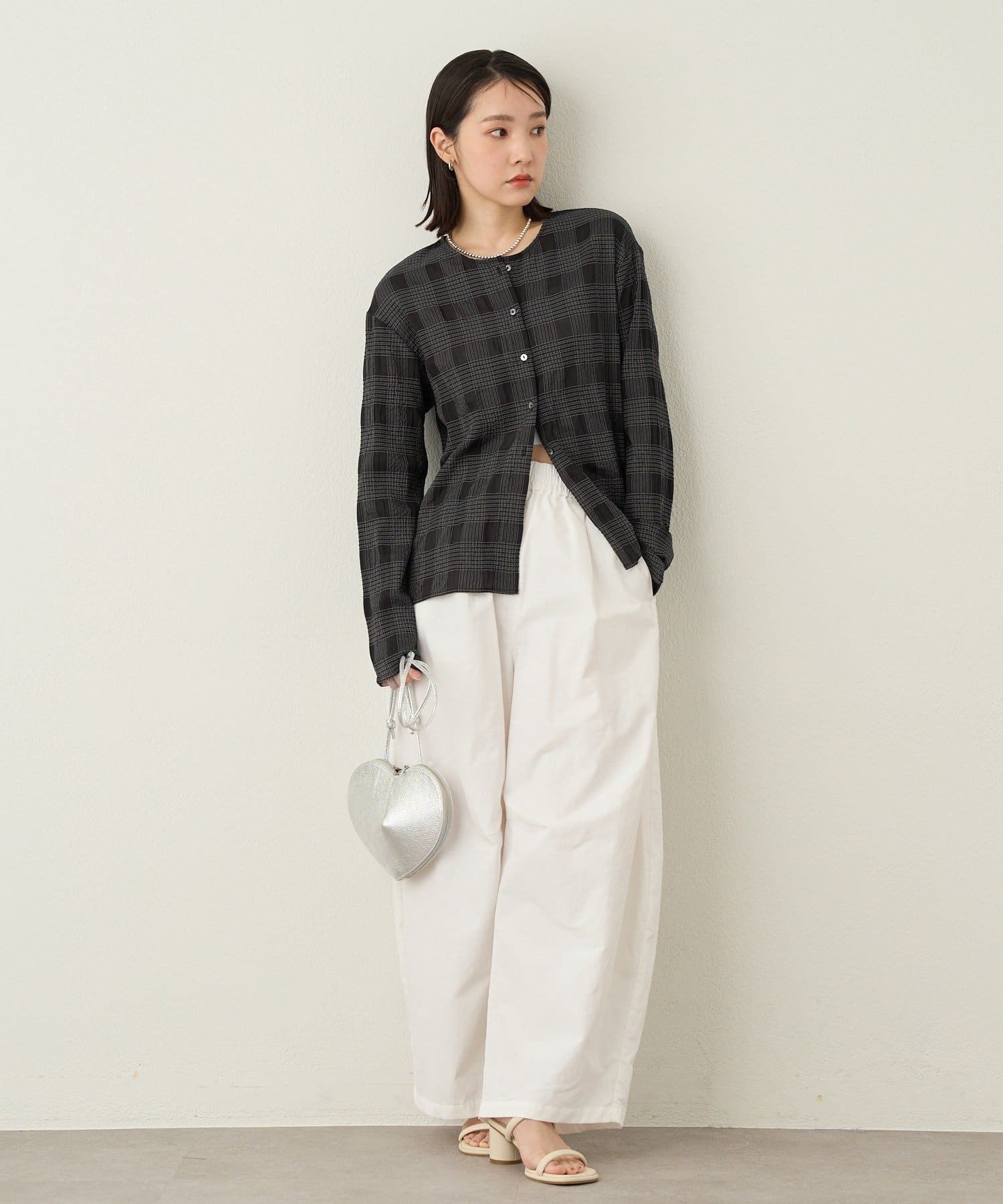 チェック柄がスタイリングのアクセントになるシアーカーディガン