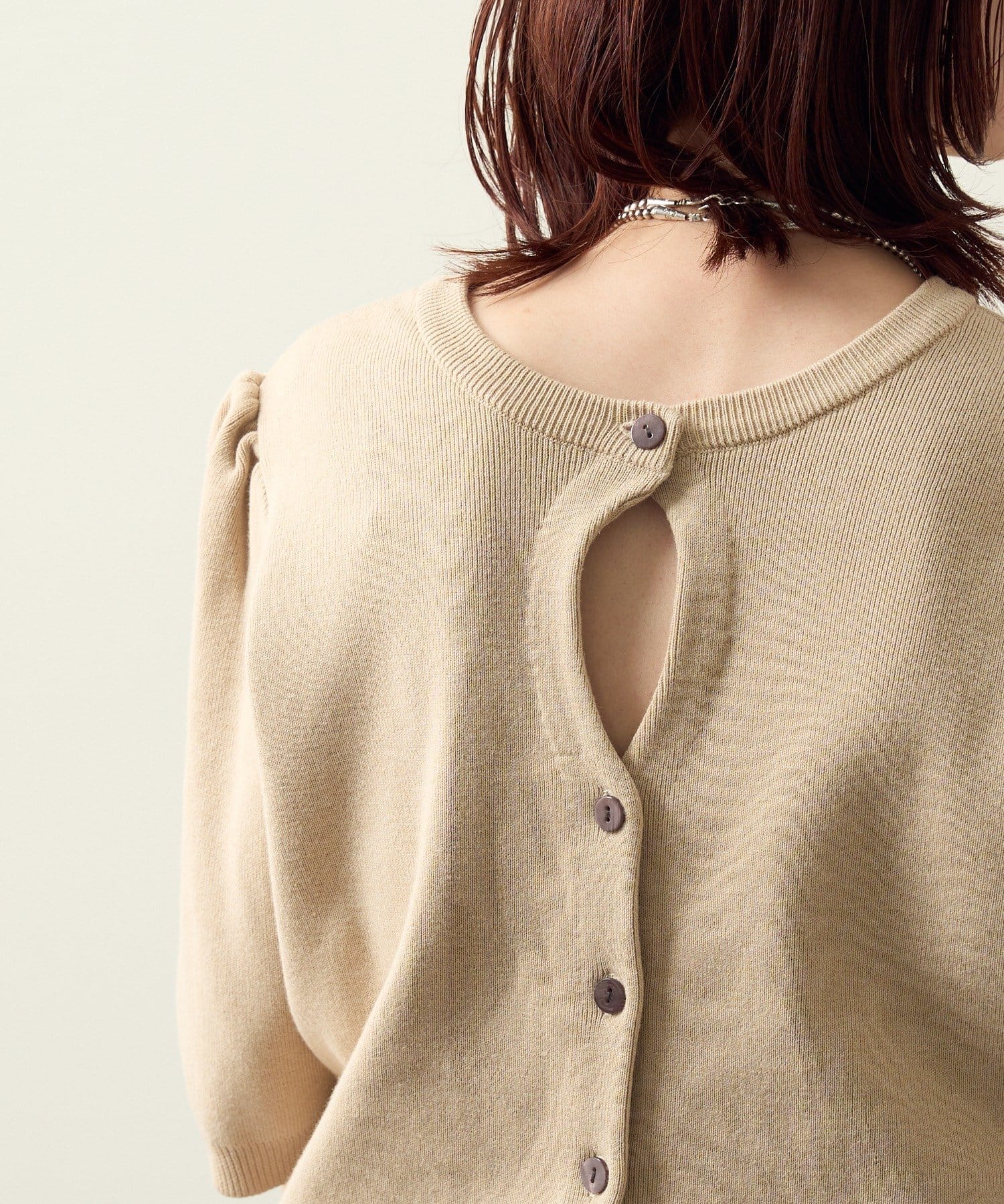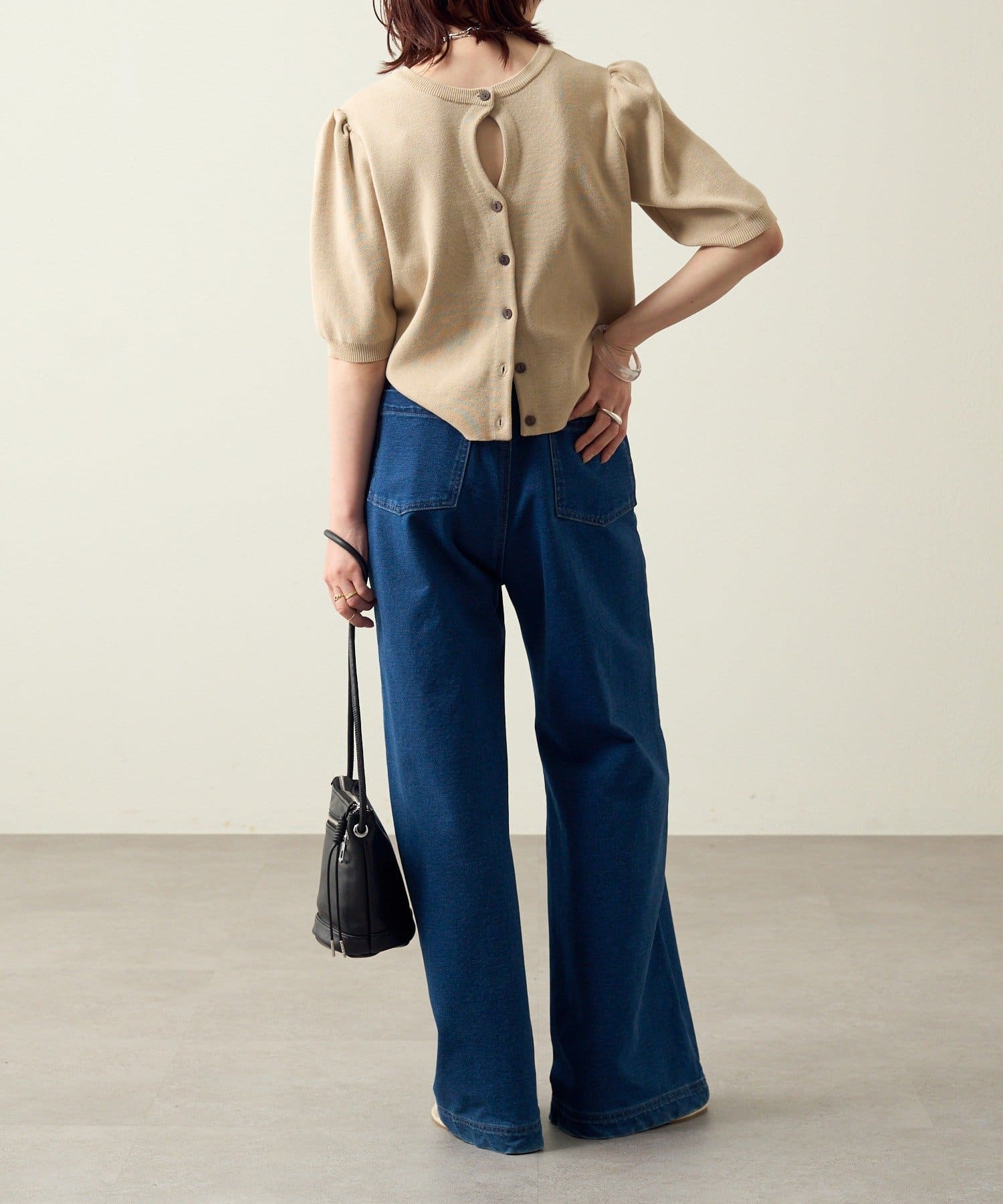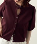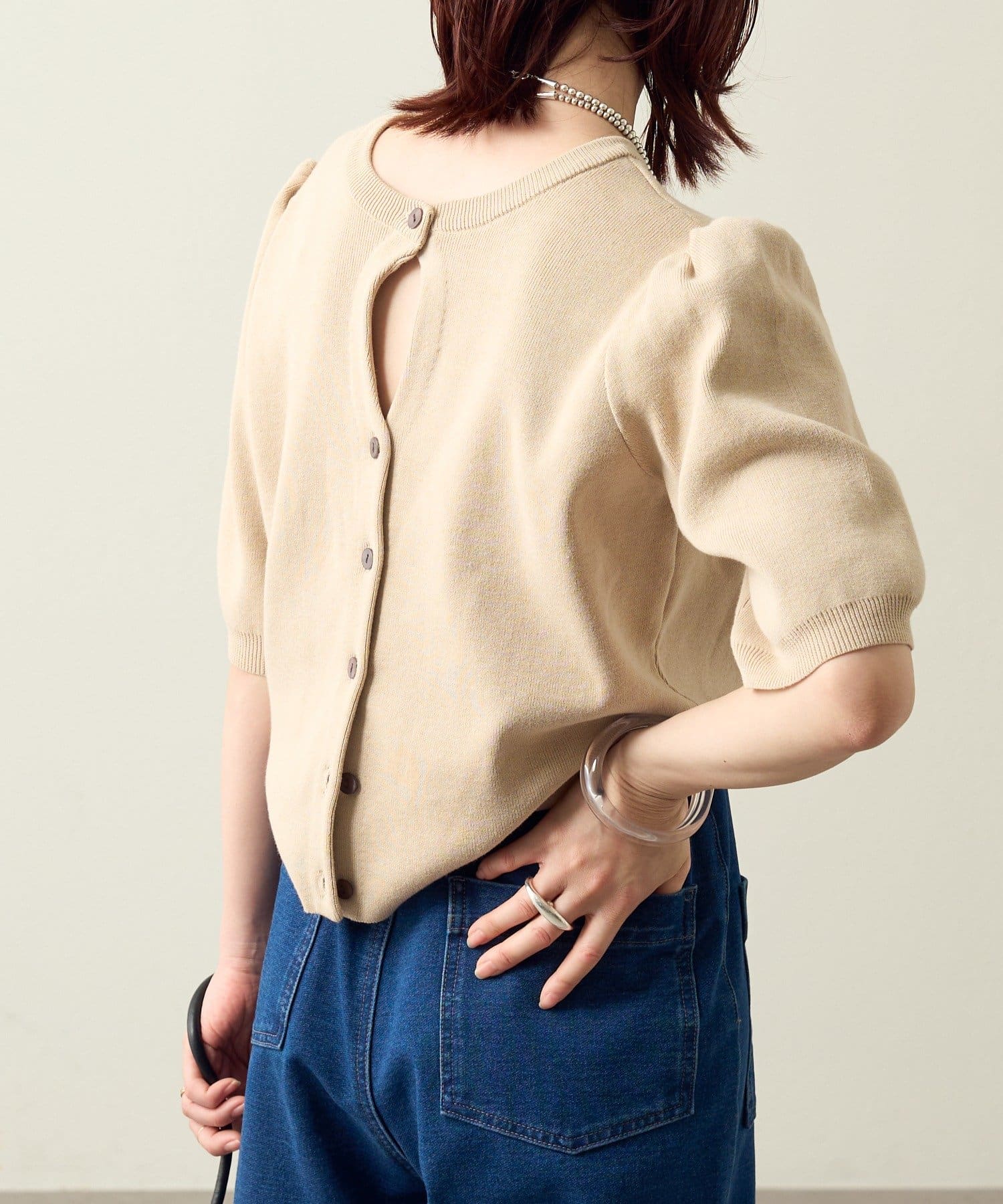 ・前後2WAY仕様なので、ボタンを前にしてホールデザインをポイントにした着こなしはもちろん、ボタンを後ろにしてバックスタイルにポイントを持ってくるスタイリングもおすすめです!