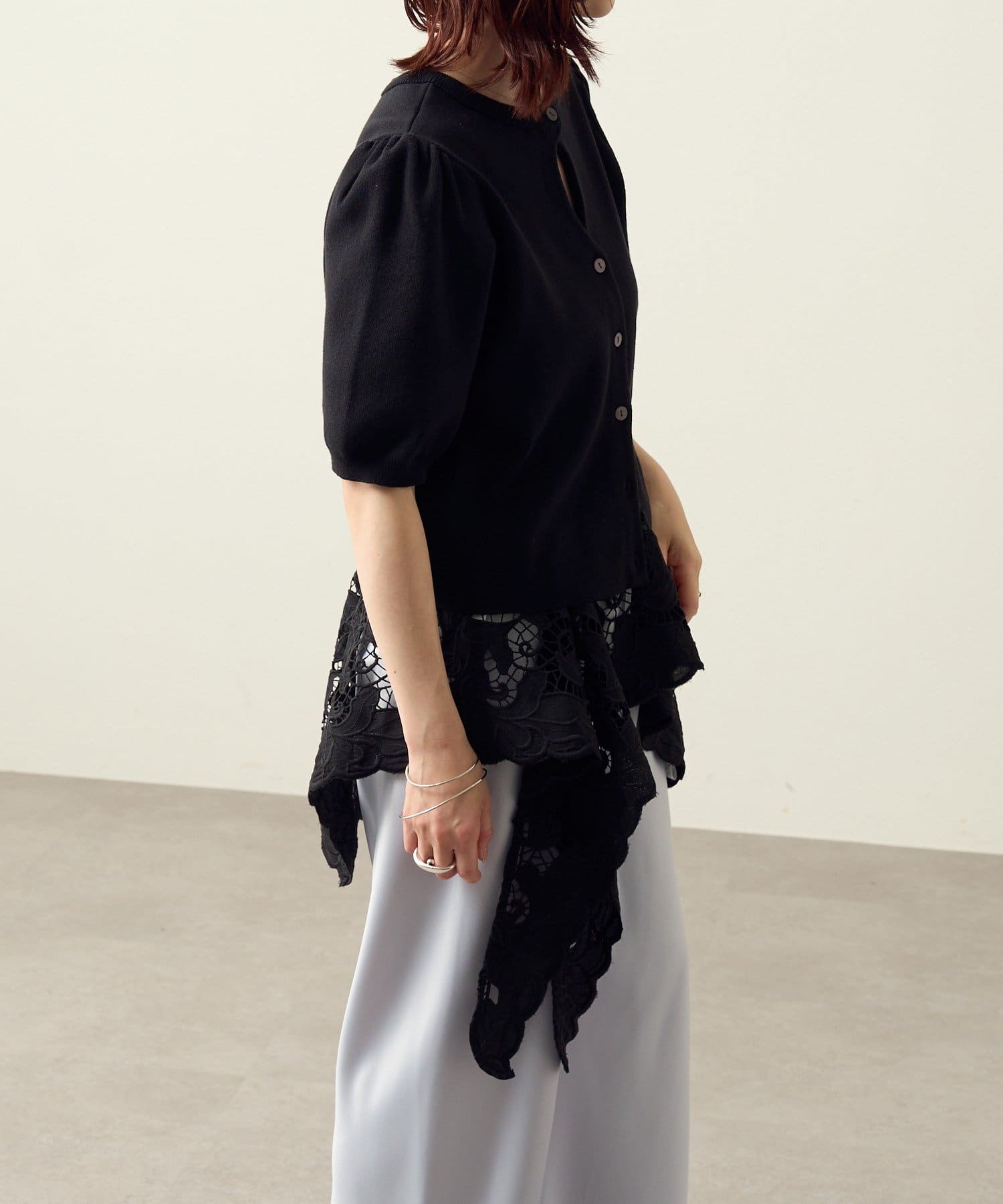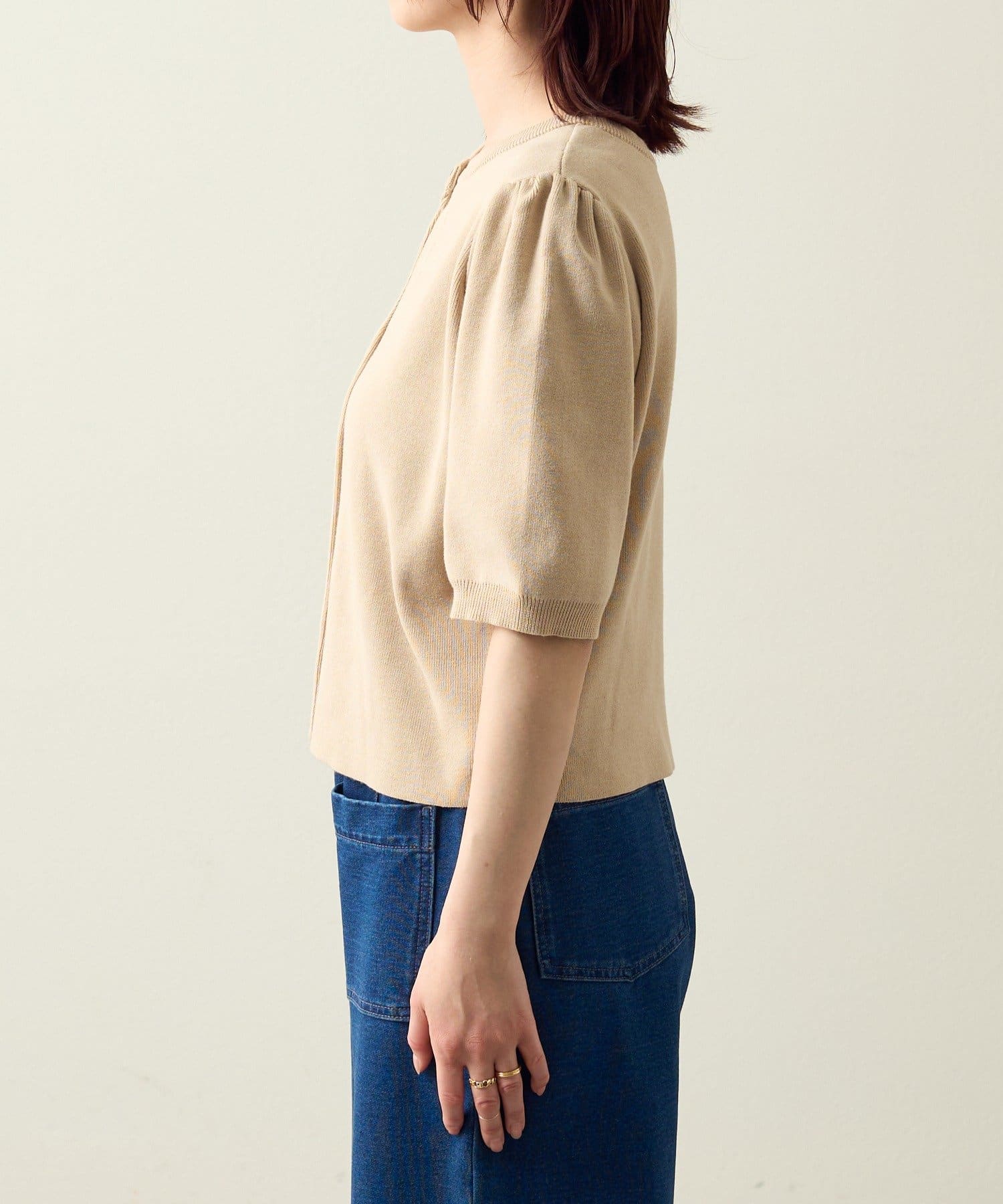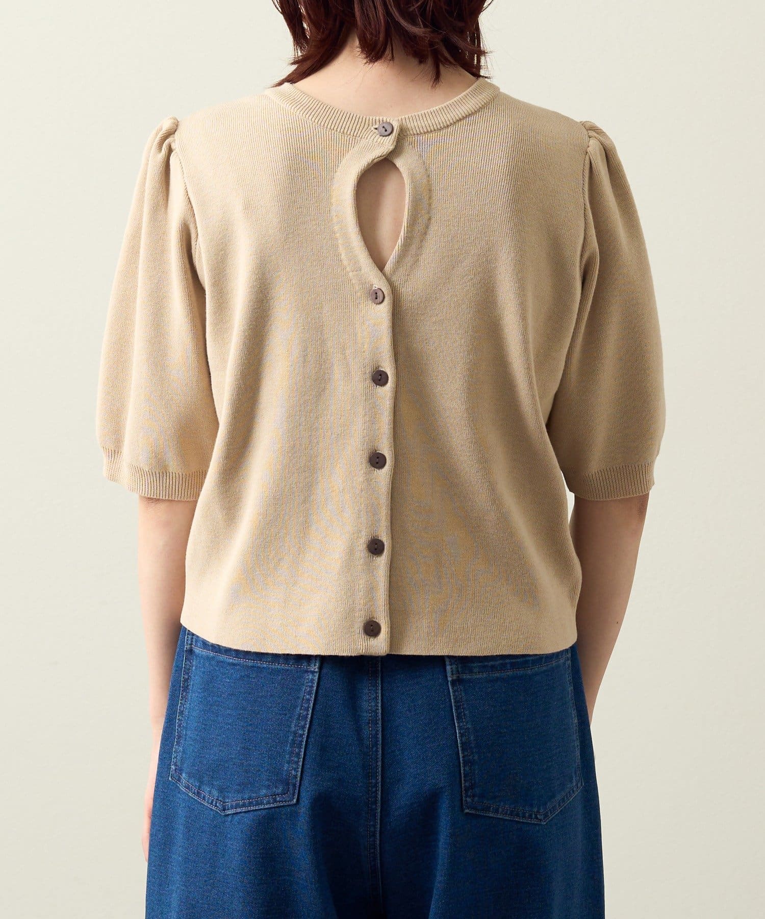 ・前後2WAY仕様なので、ボタンを前にしてホールデザインをポイントにした着こなしはもちろん、ボタンを後ろにしてバックスタイルにポイントを持ってくるスタイリングもおすすめです!