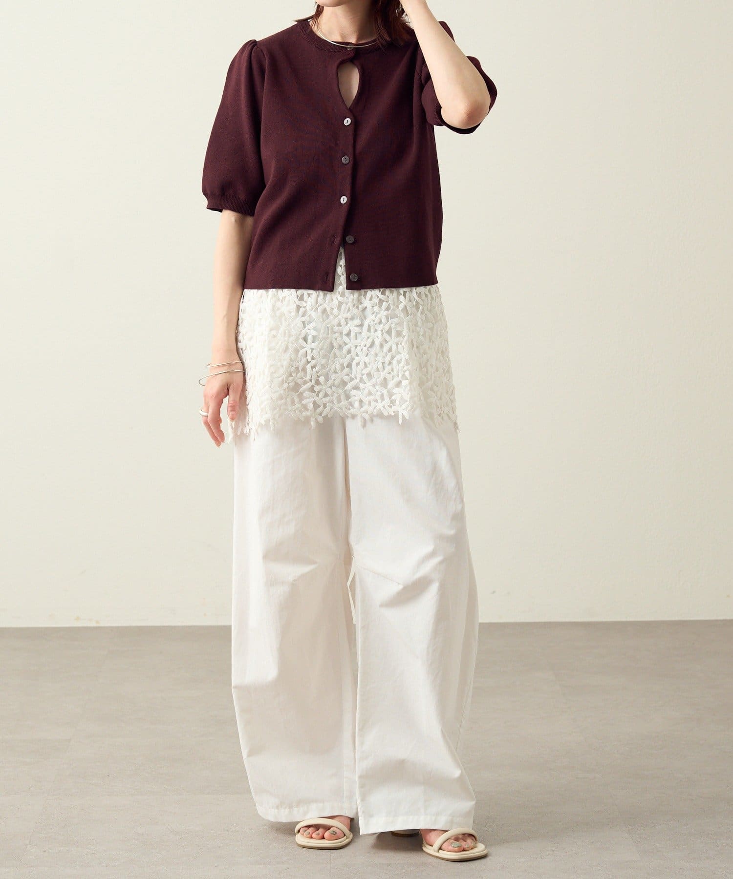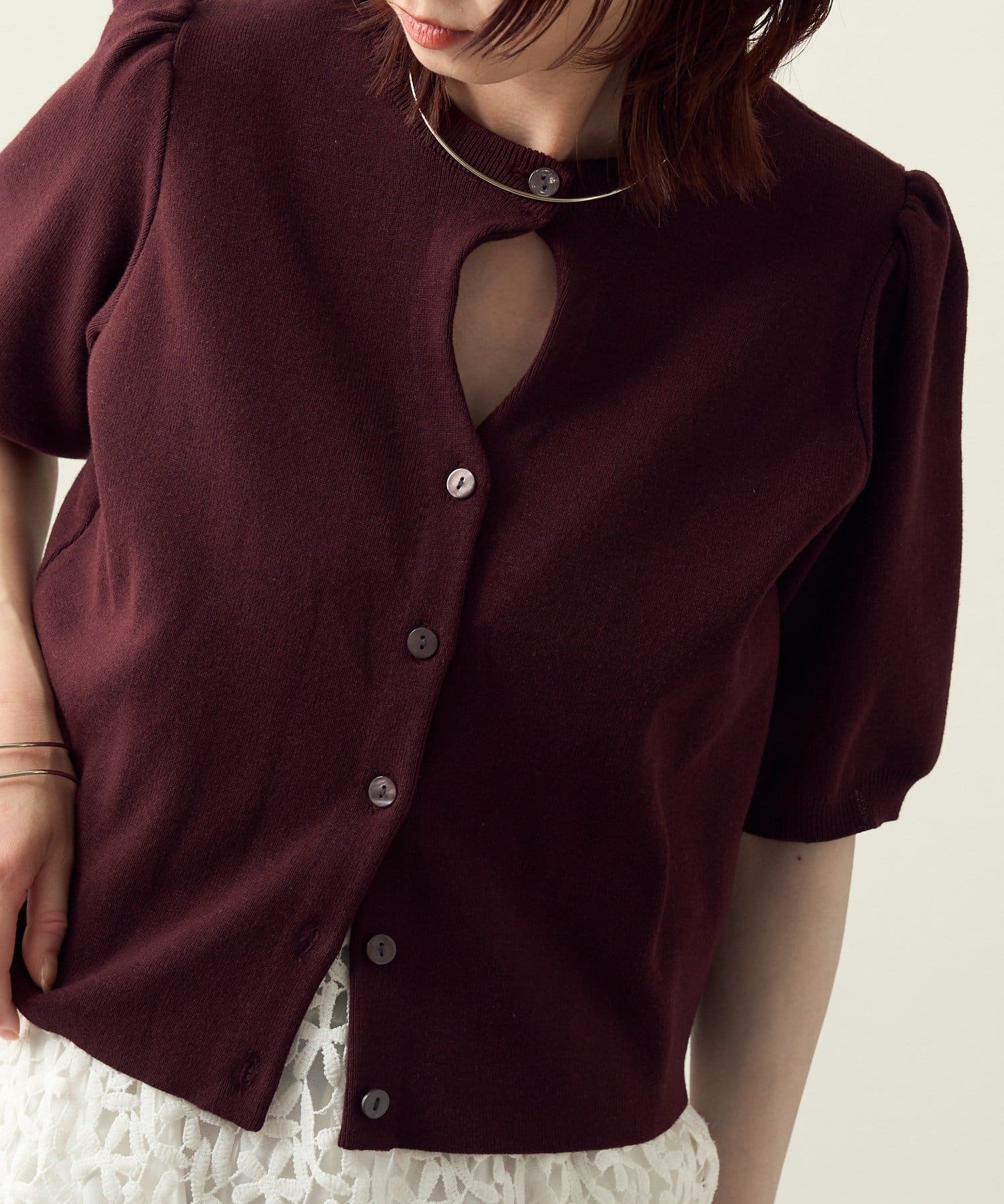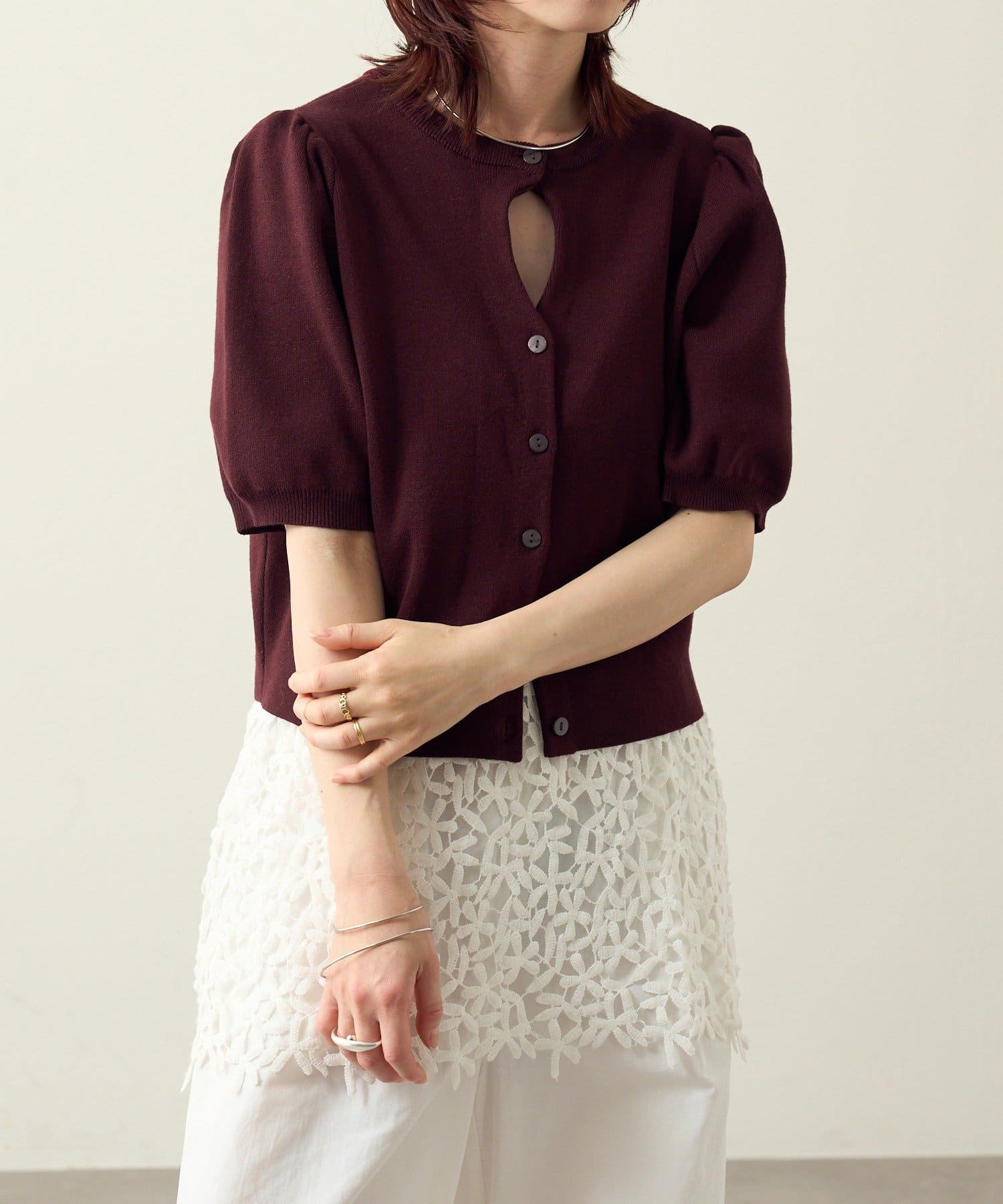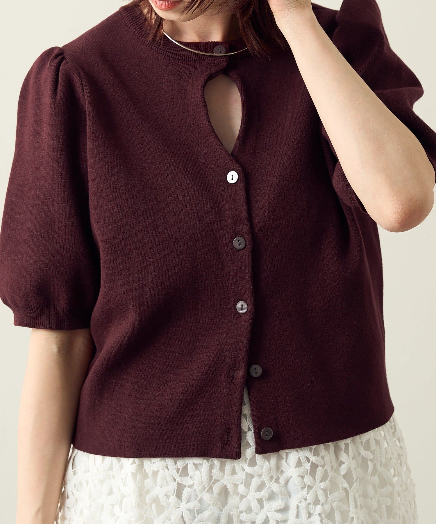 胸元のホールデザインがポイントに。オンオフ問わず活躍する大人の上品サマーニット