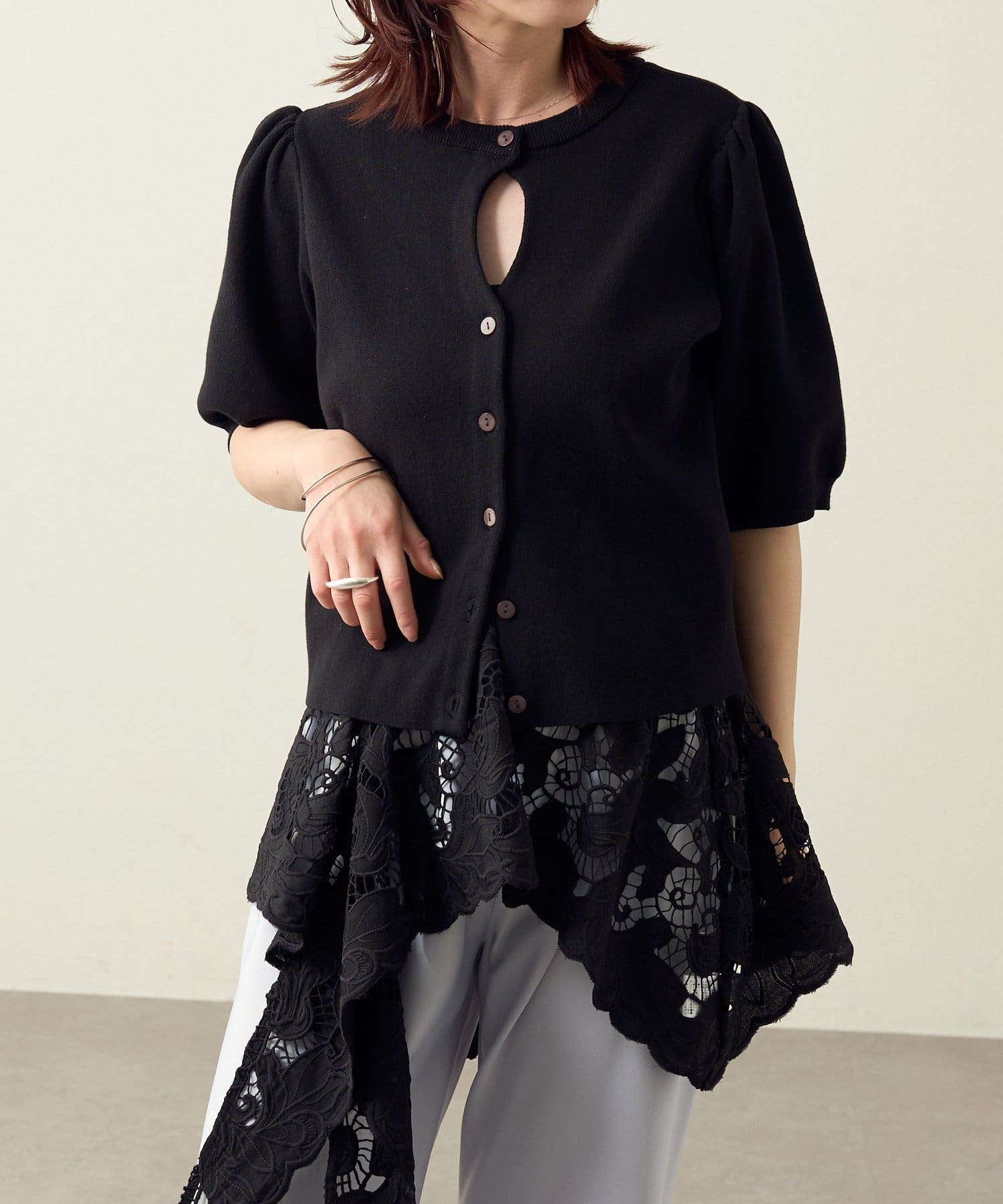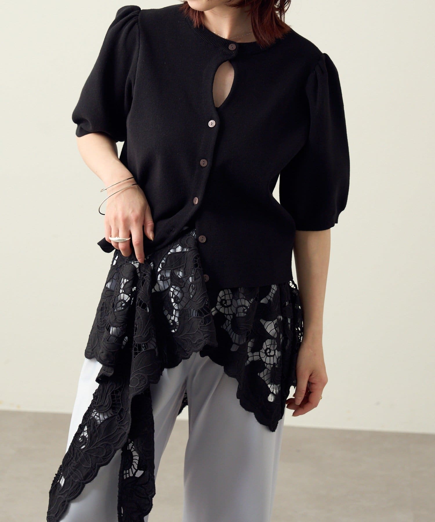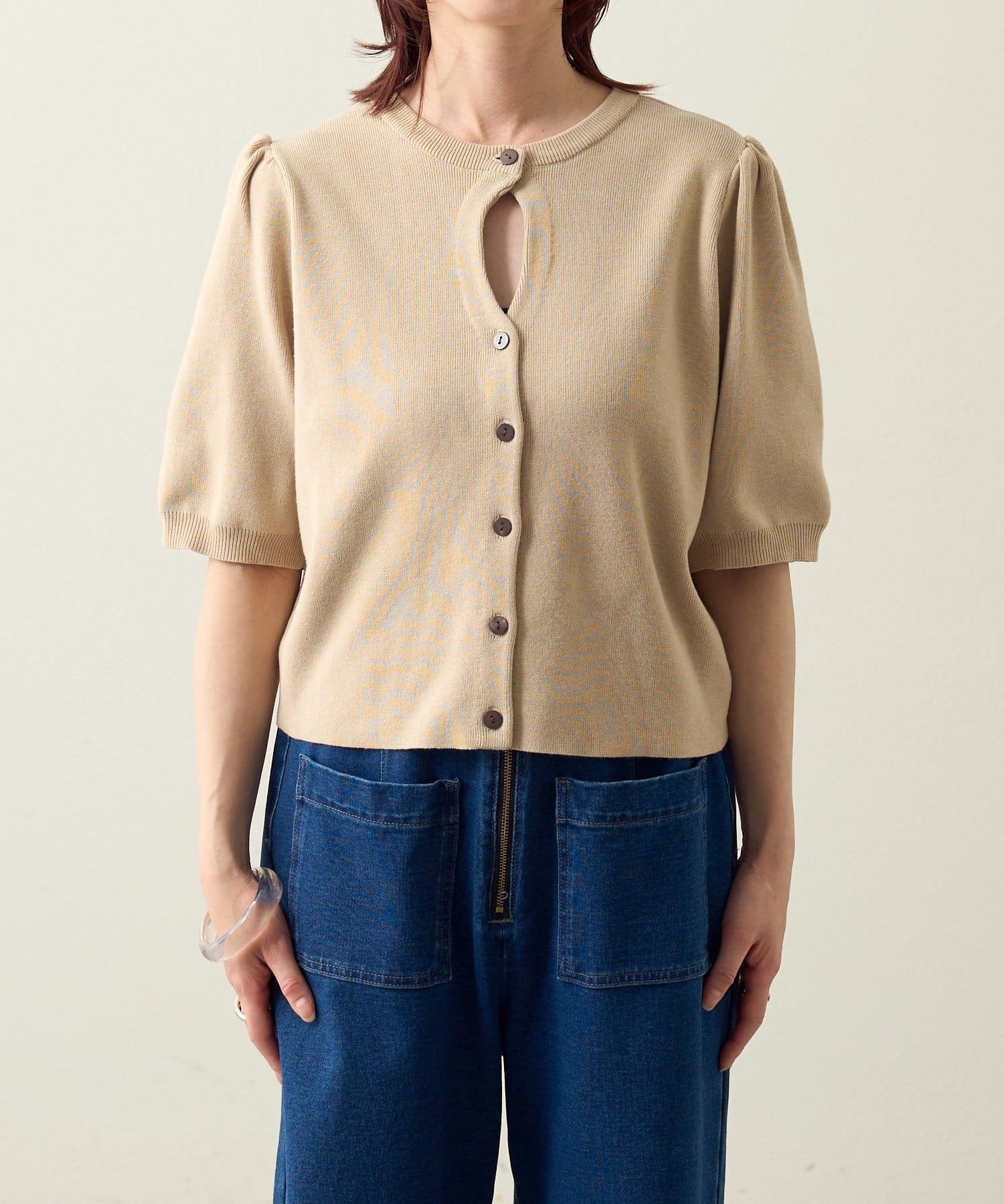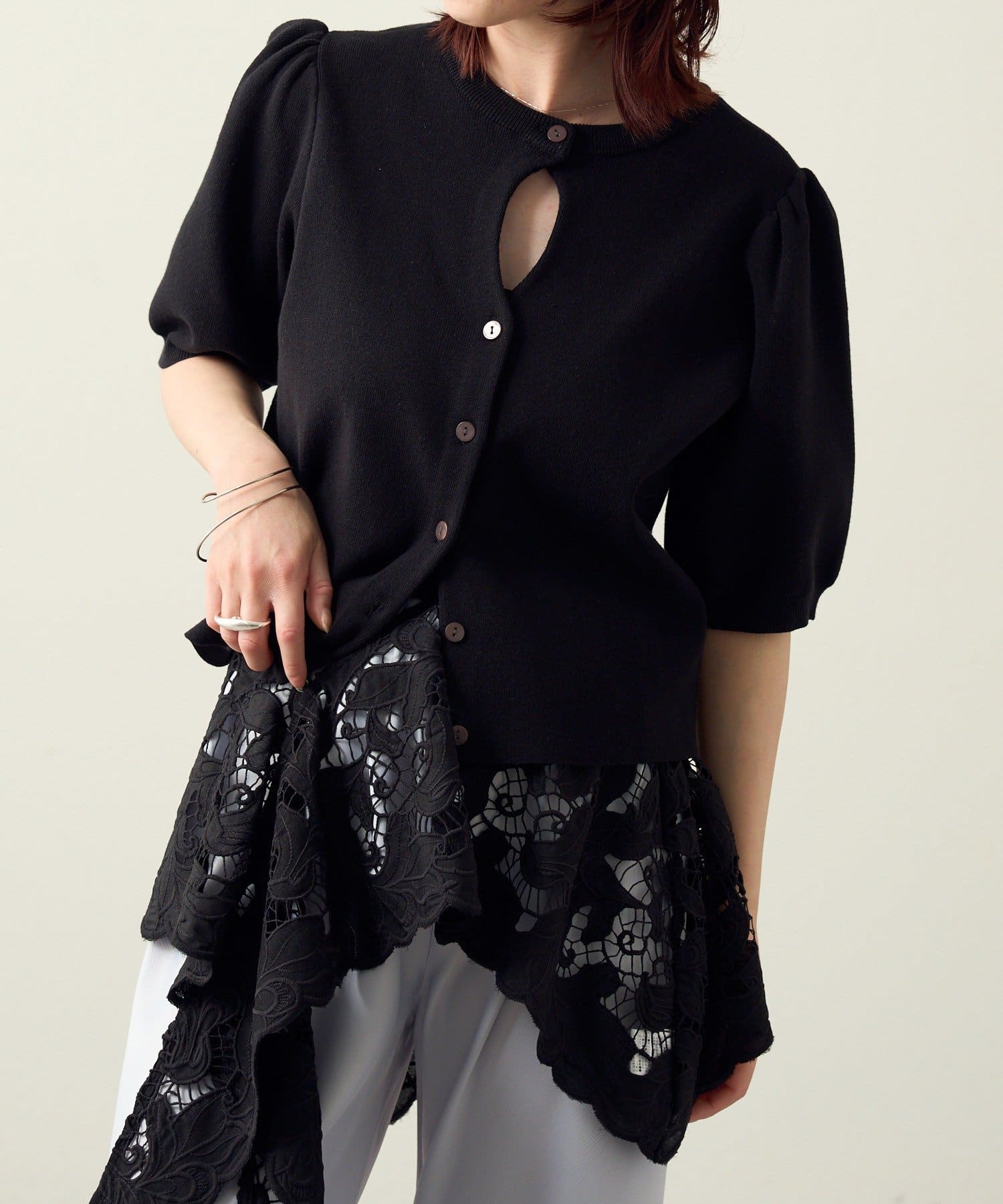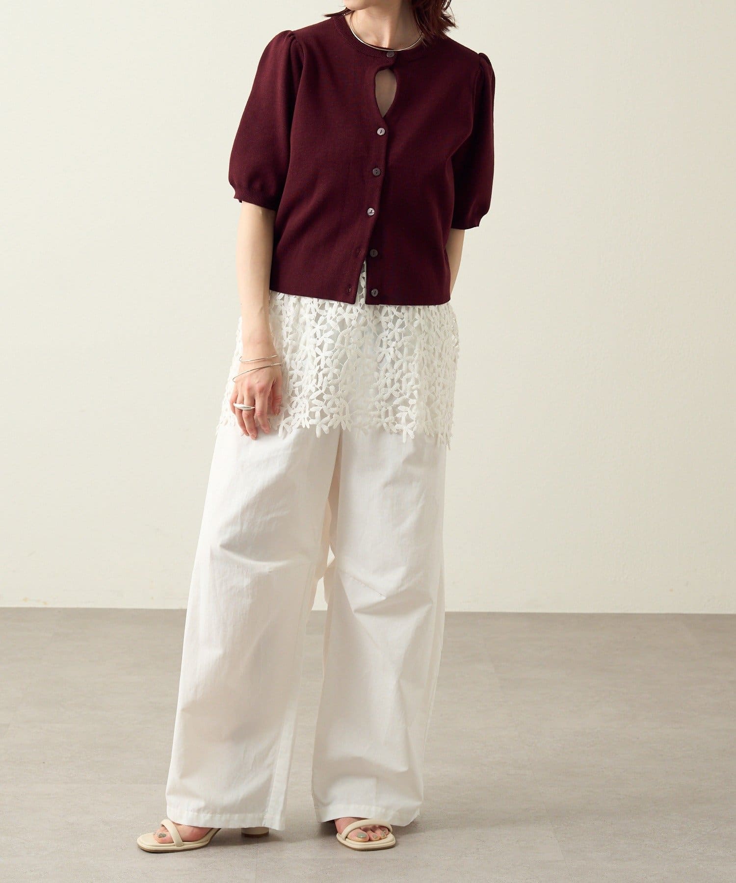 胸元のホールデザインがポイントに。オンオフ問わず活躍する大人の上品サマーニット