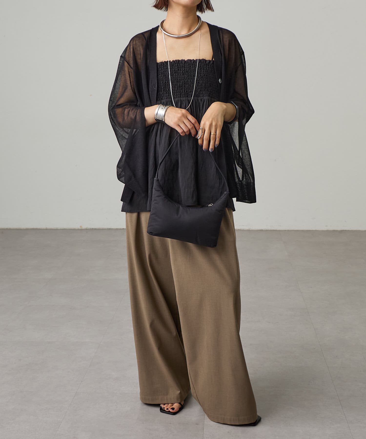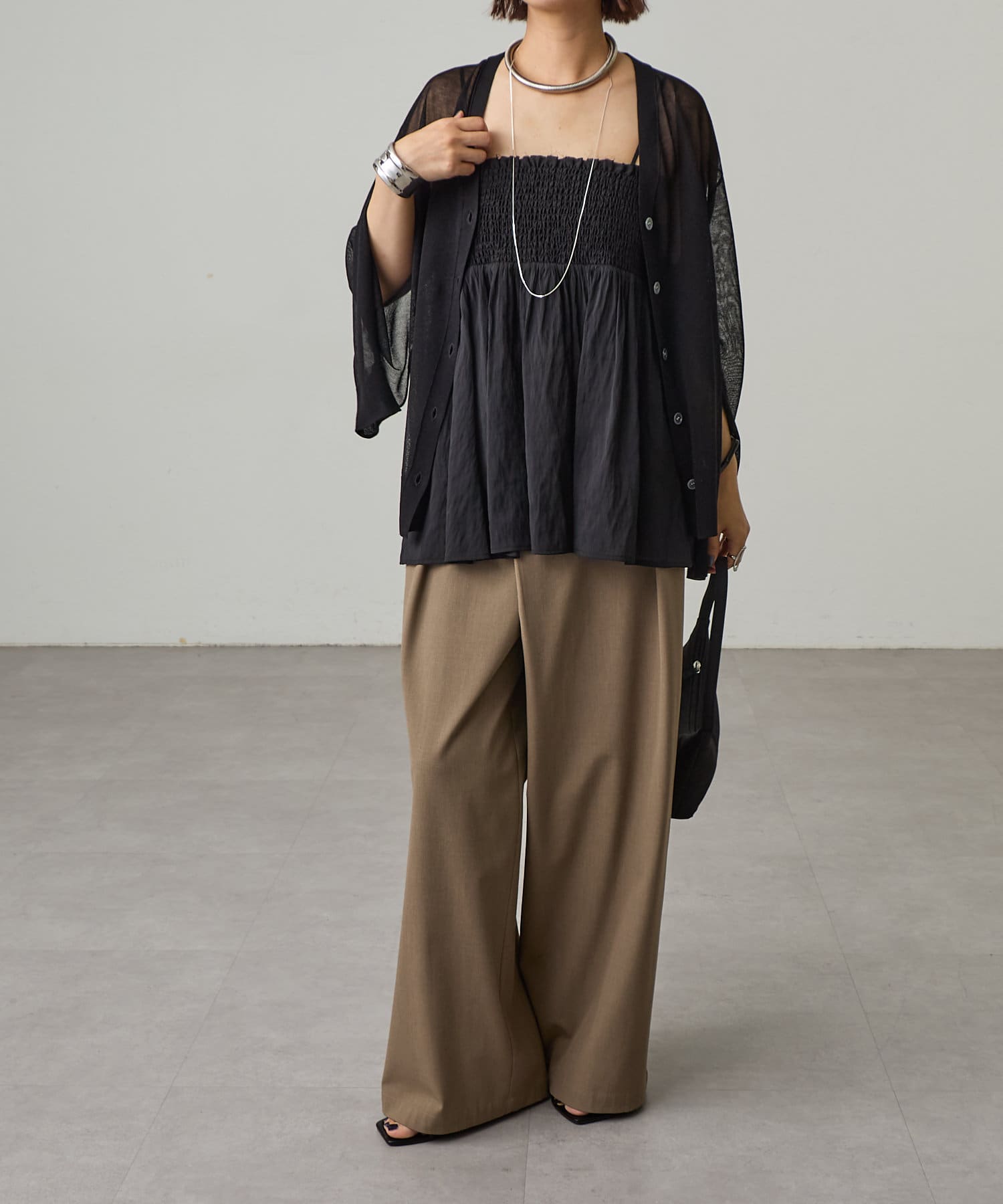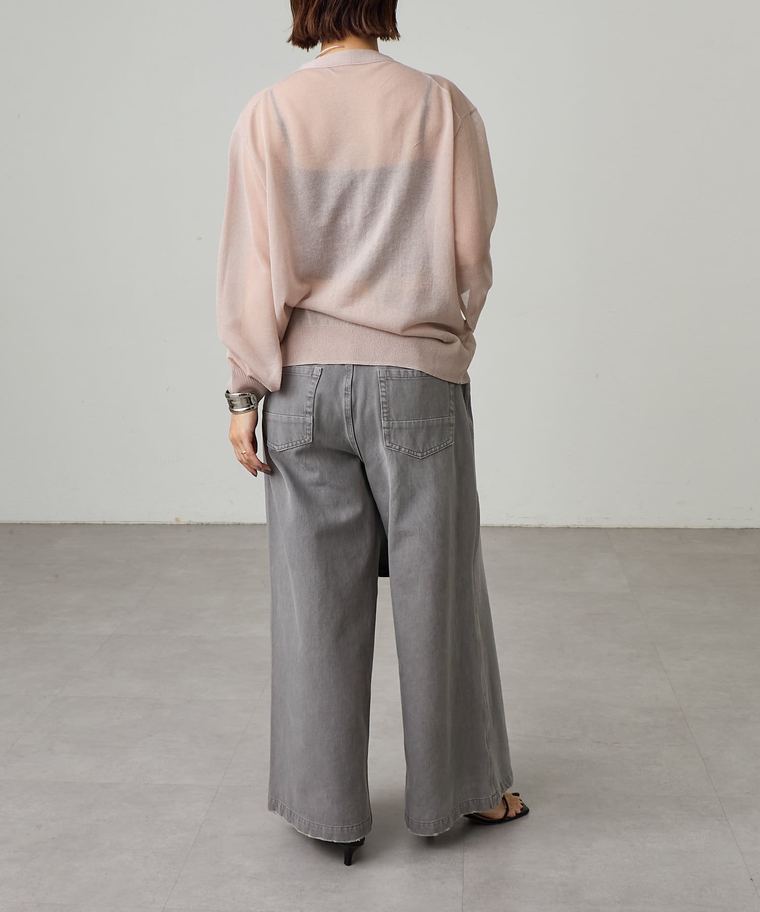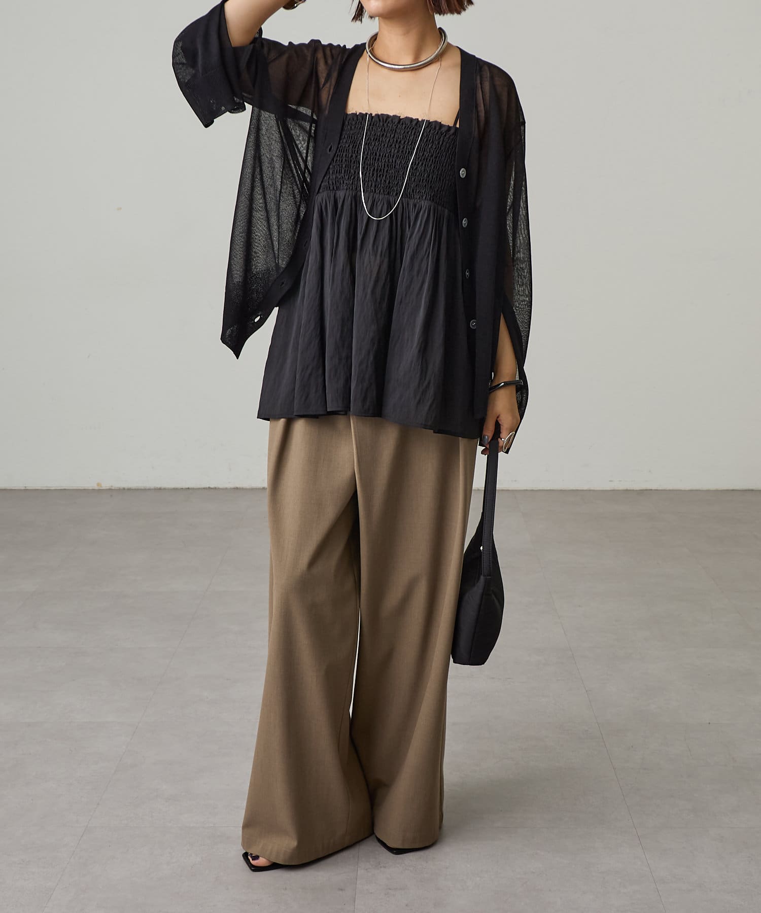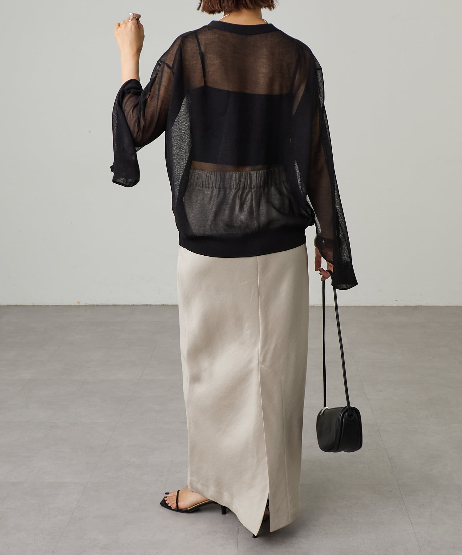 ・袖に入ったスリットから腕を出すことで抜け感を演出。
