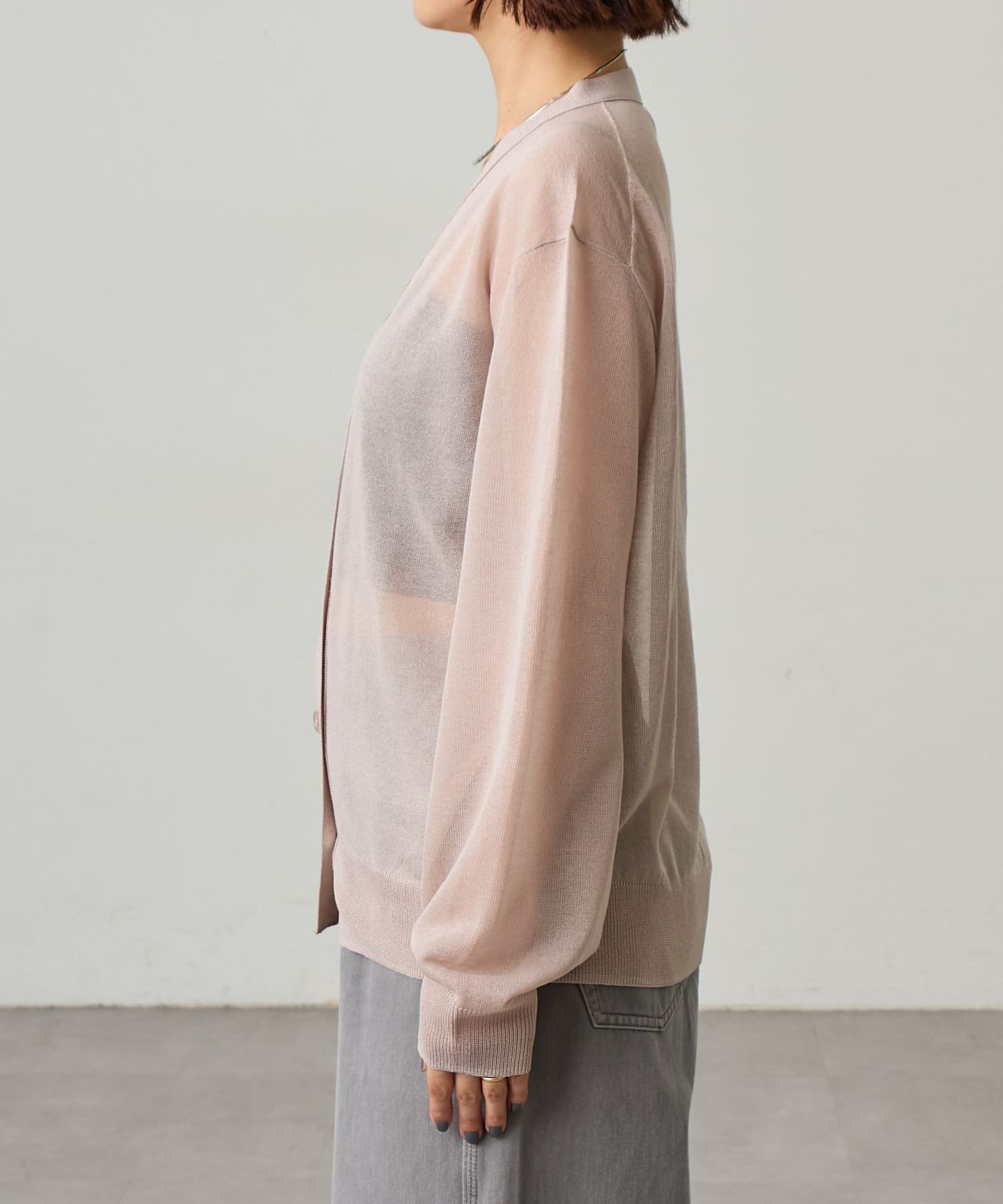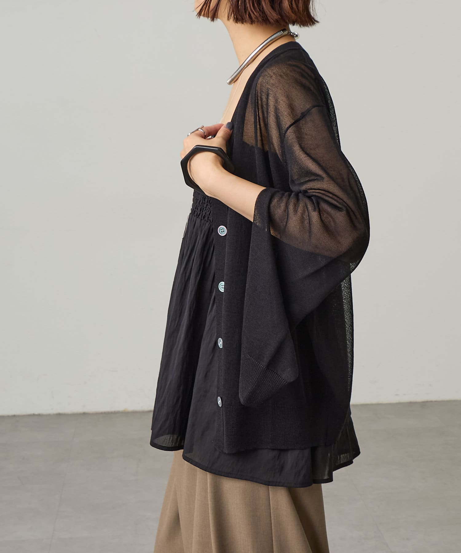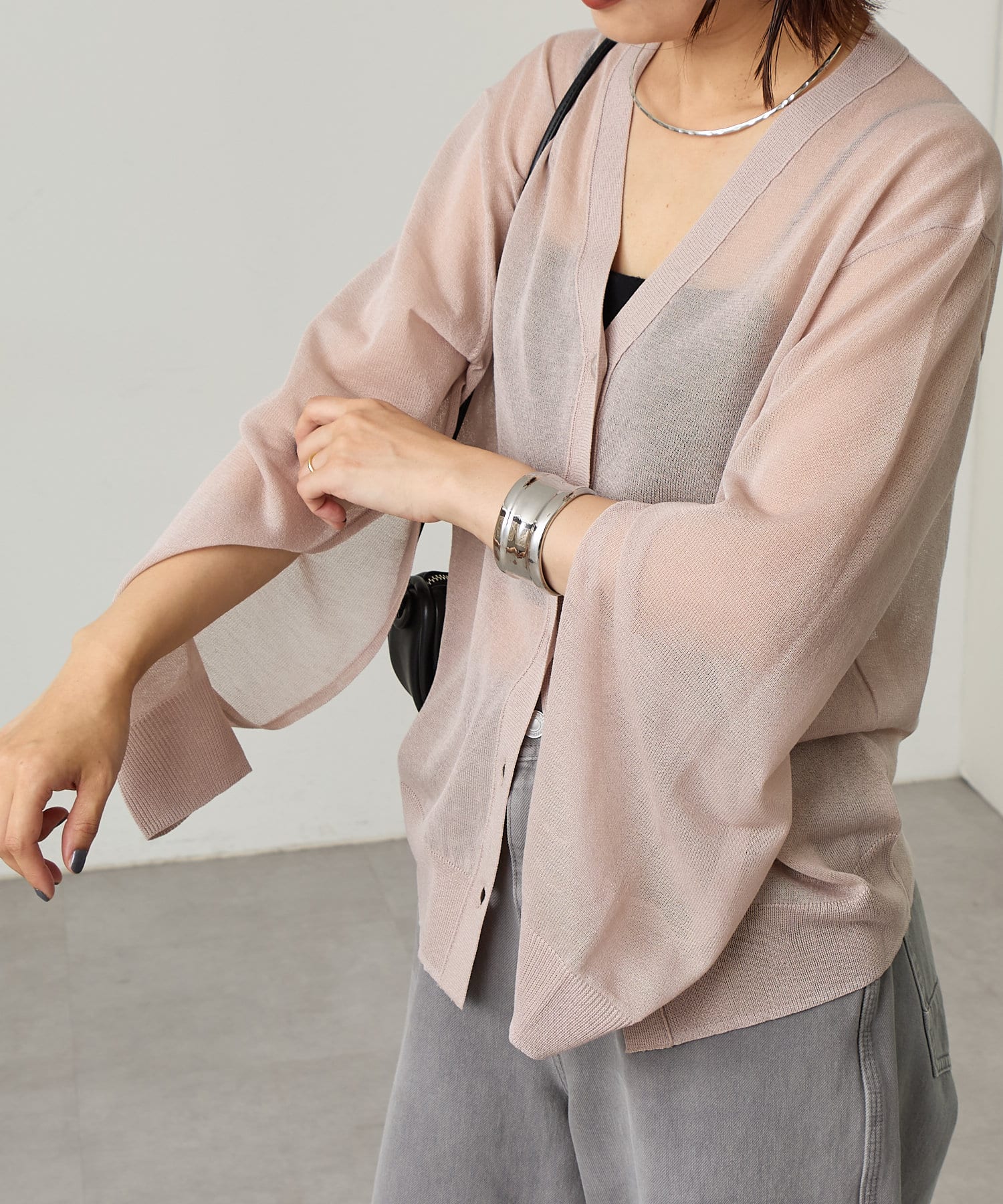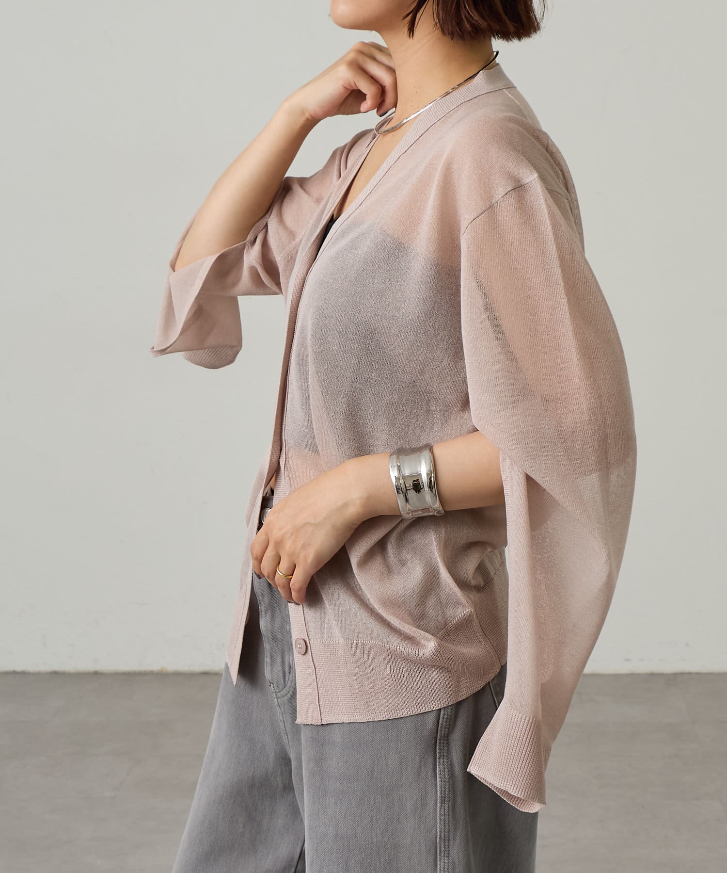 ・暑い時期にも着回せるシアー素材のカーディガン。