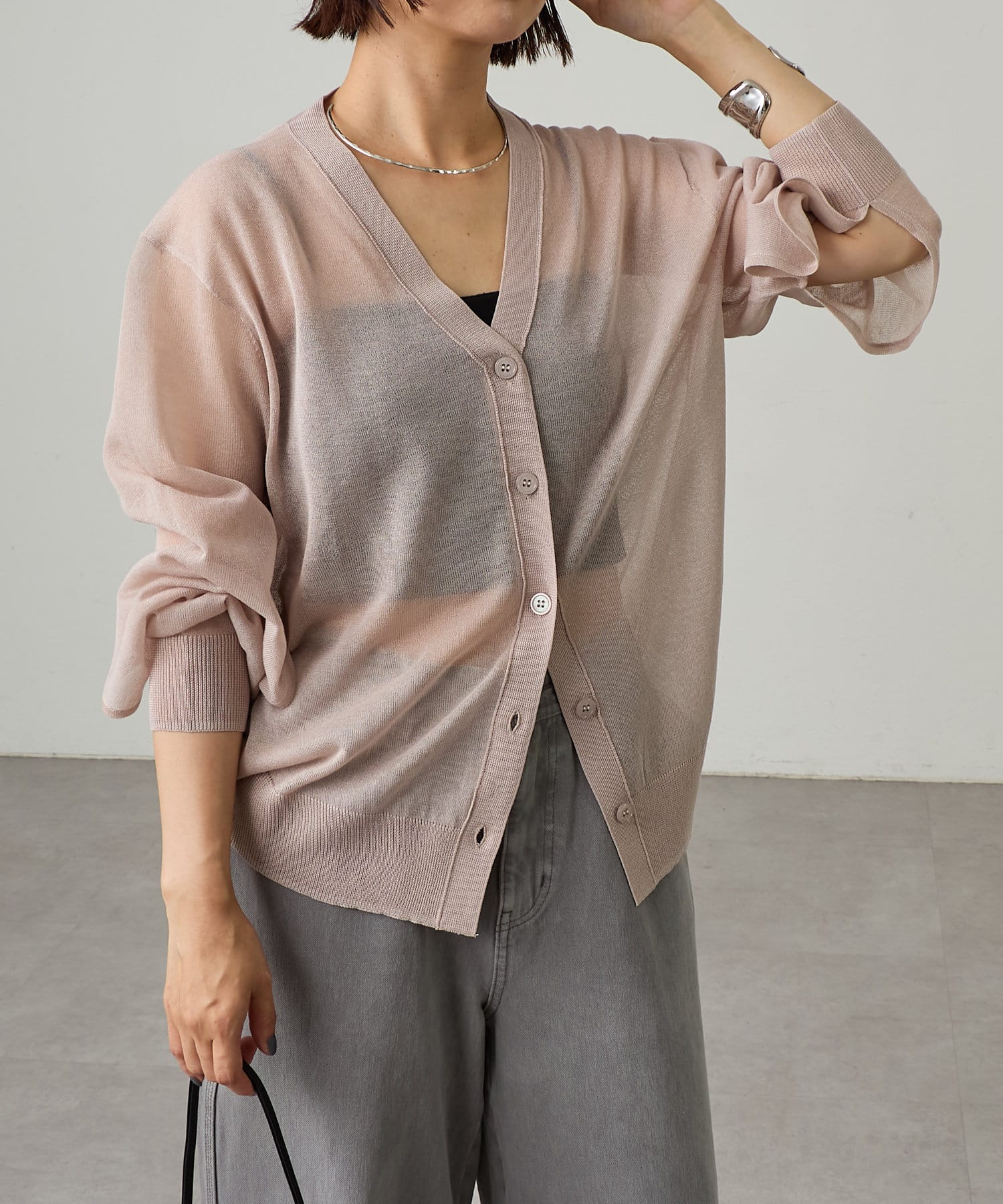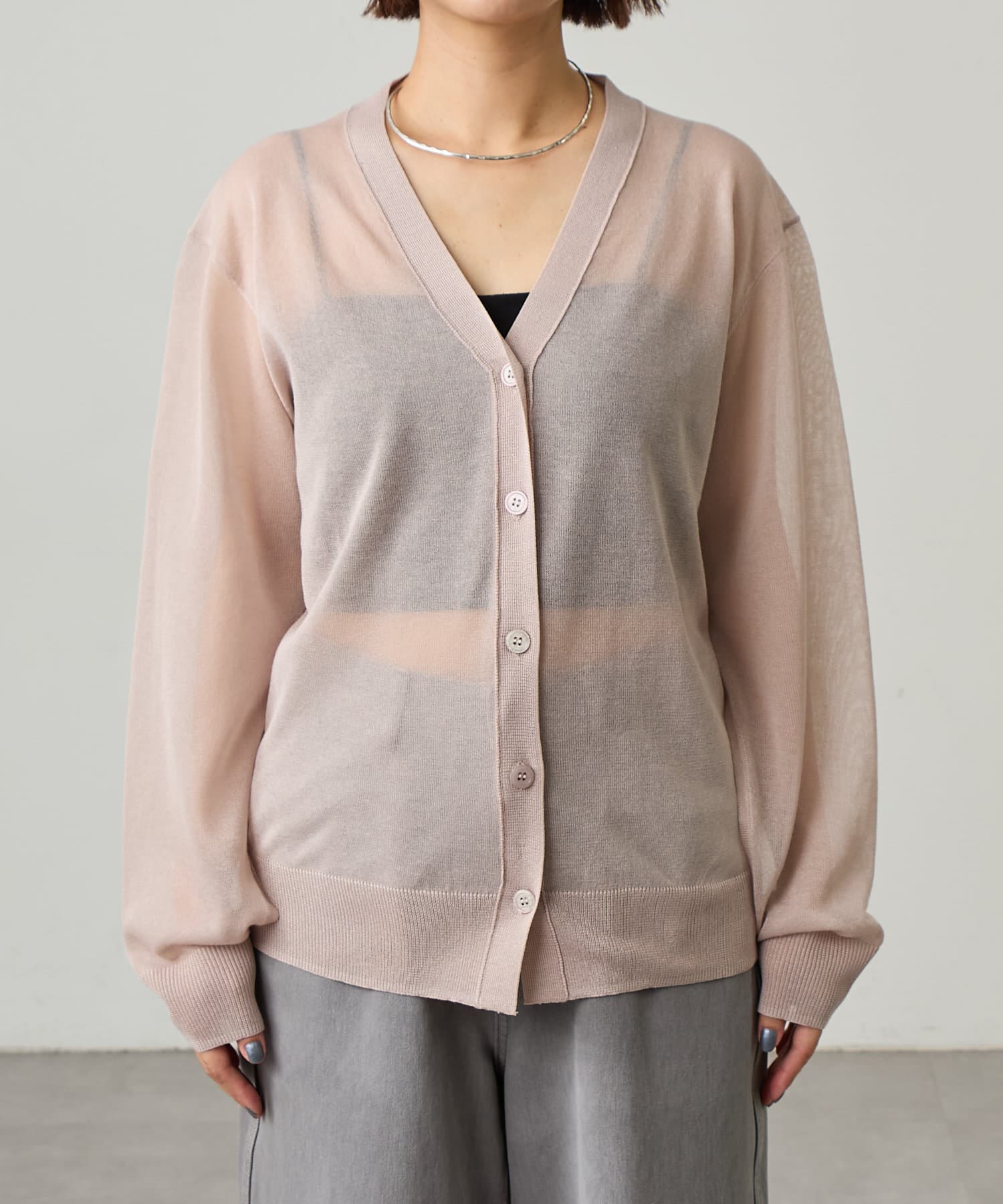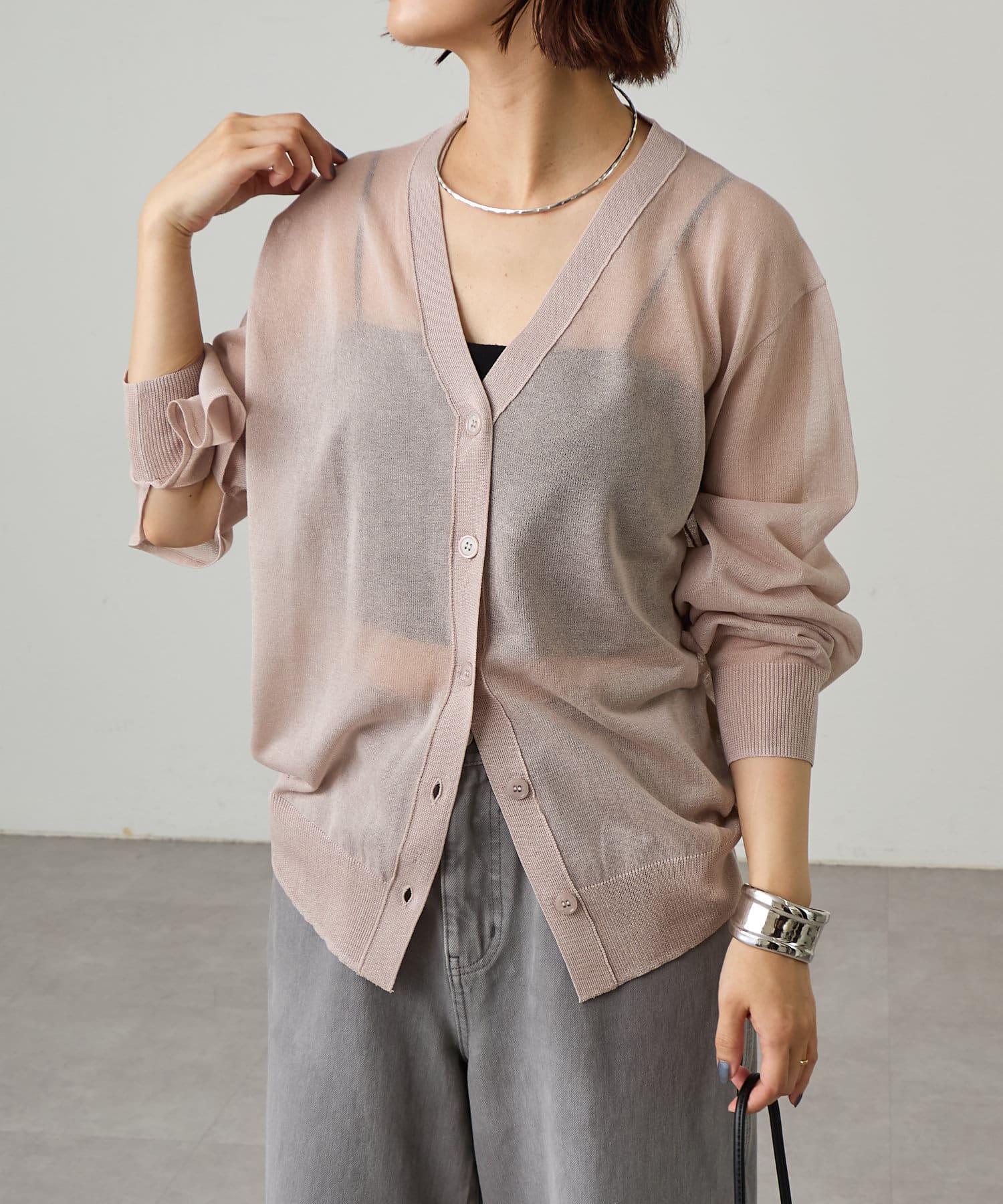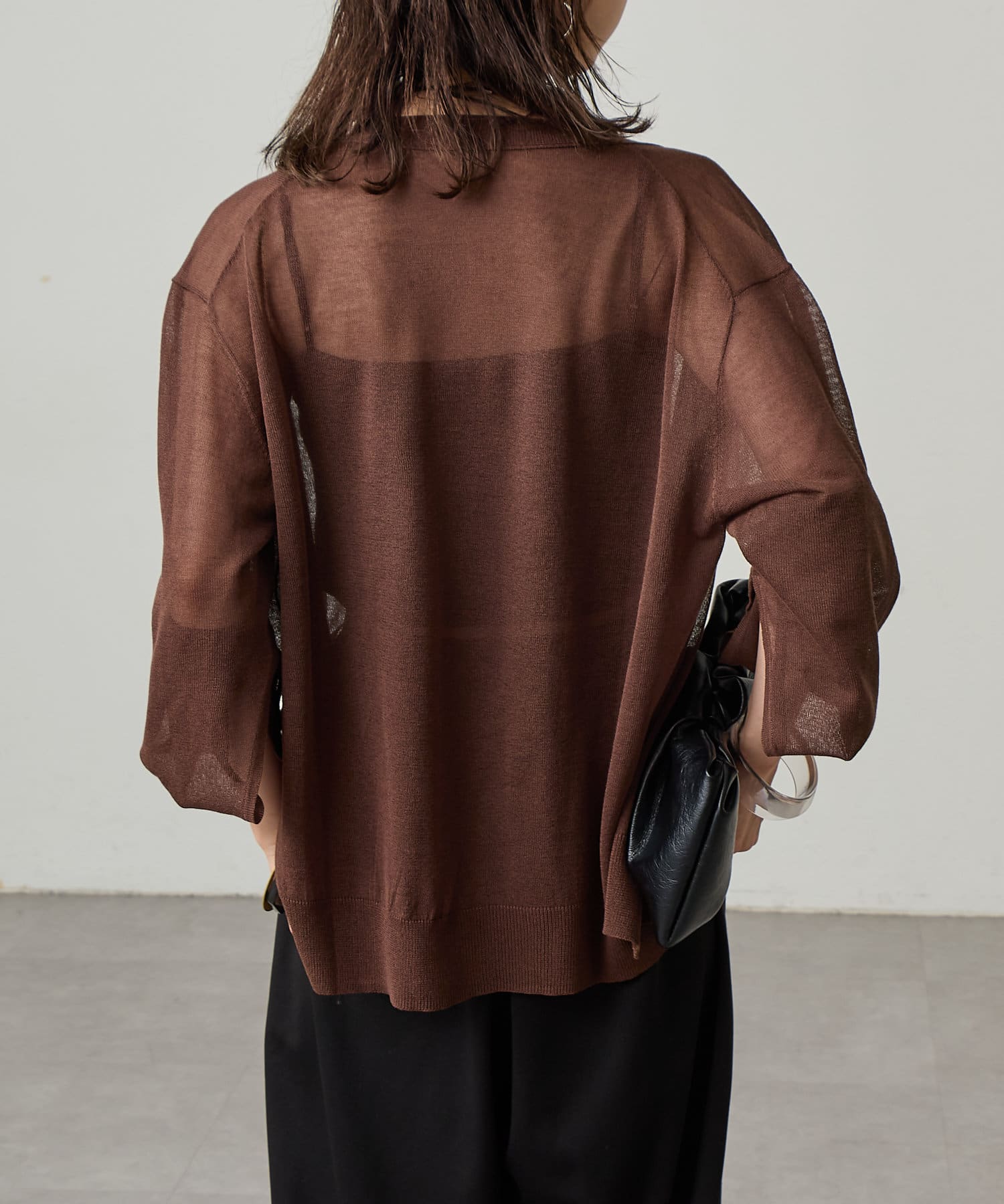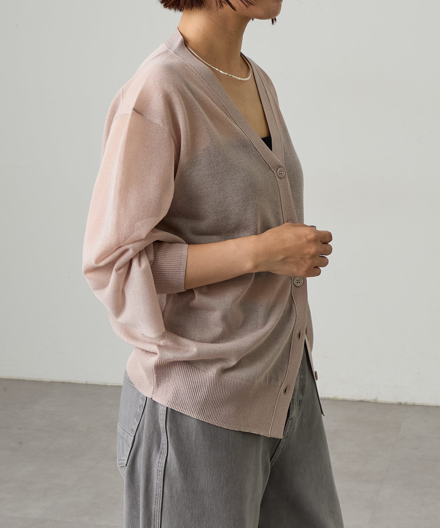 ・暑い時期にも着回せるシアー素材のカーディガン。
