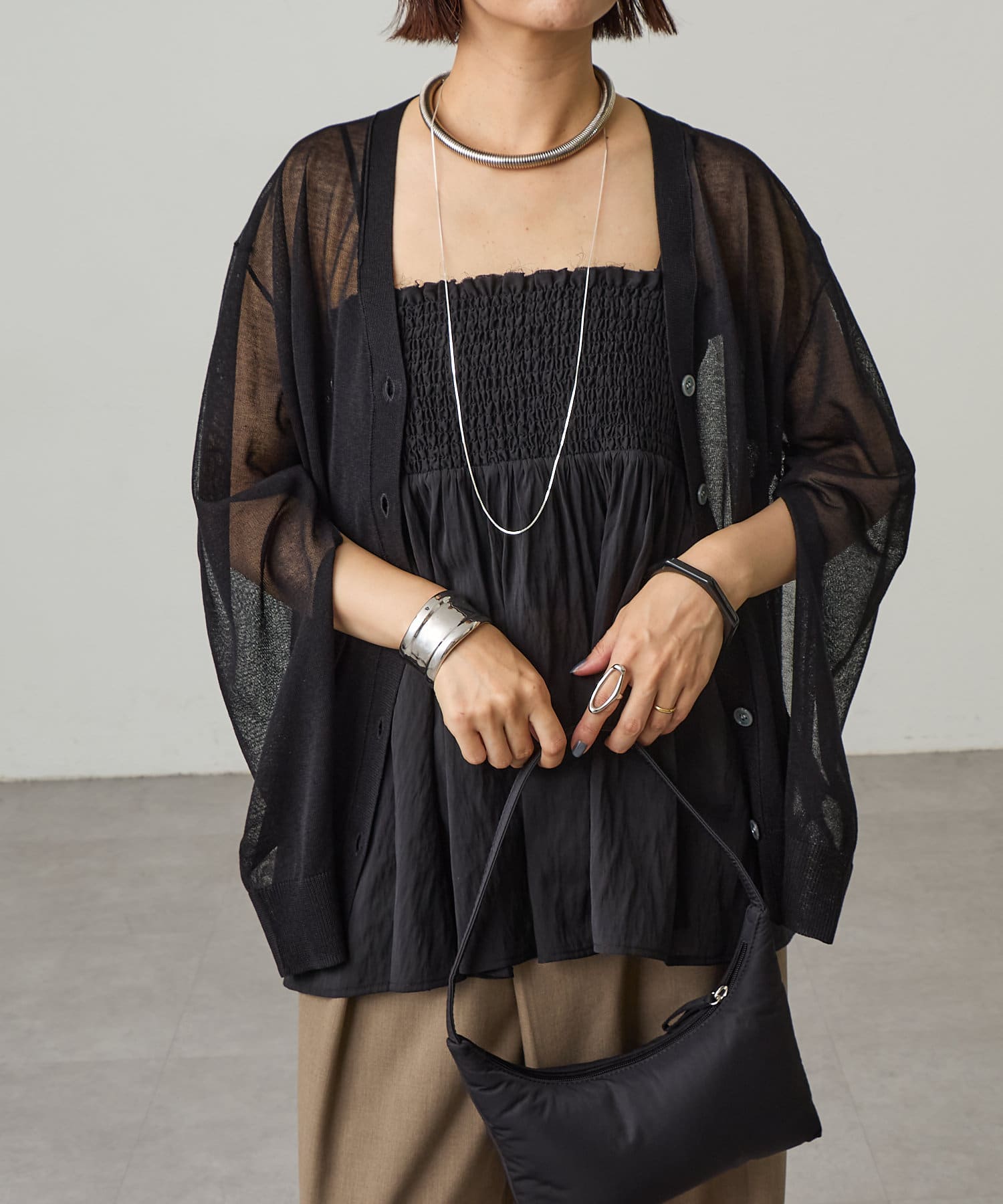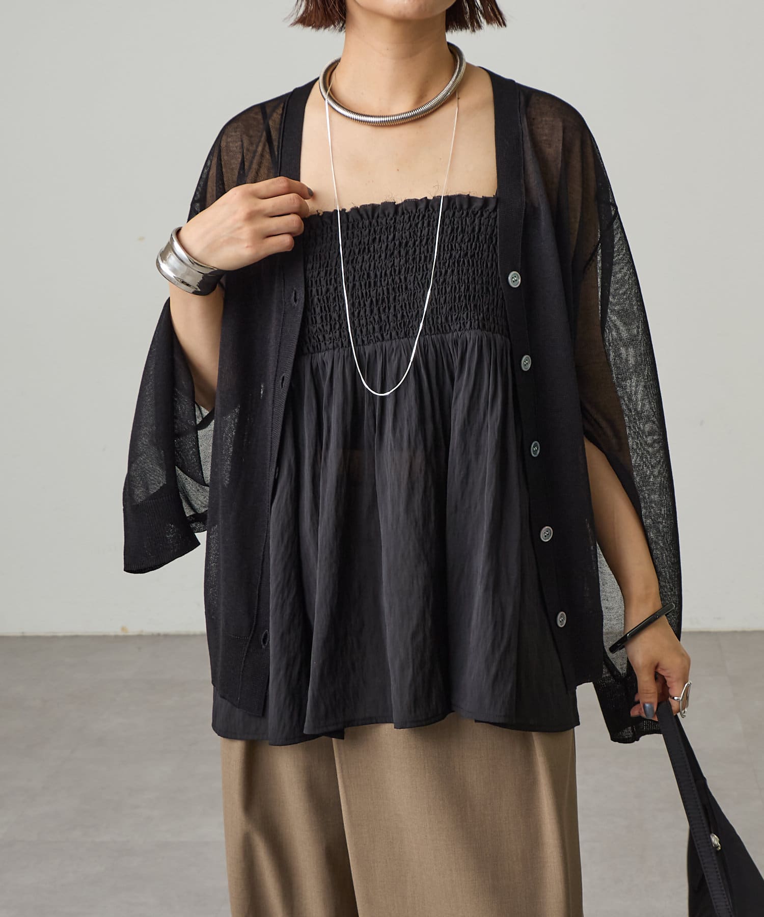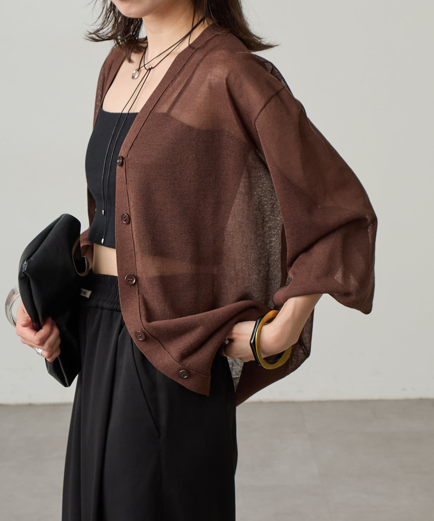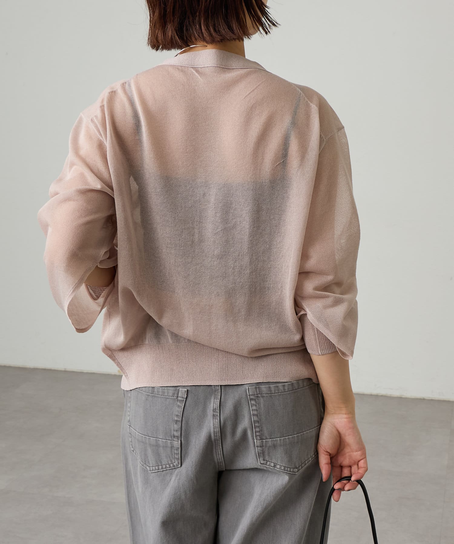 ・暑い時期にも着回せるシアー素材のカーディガン。