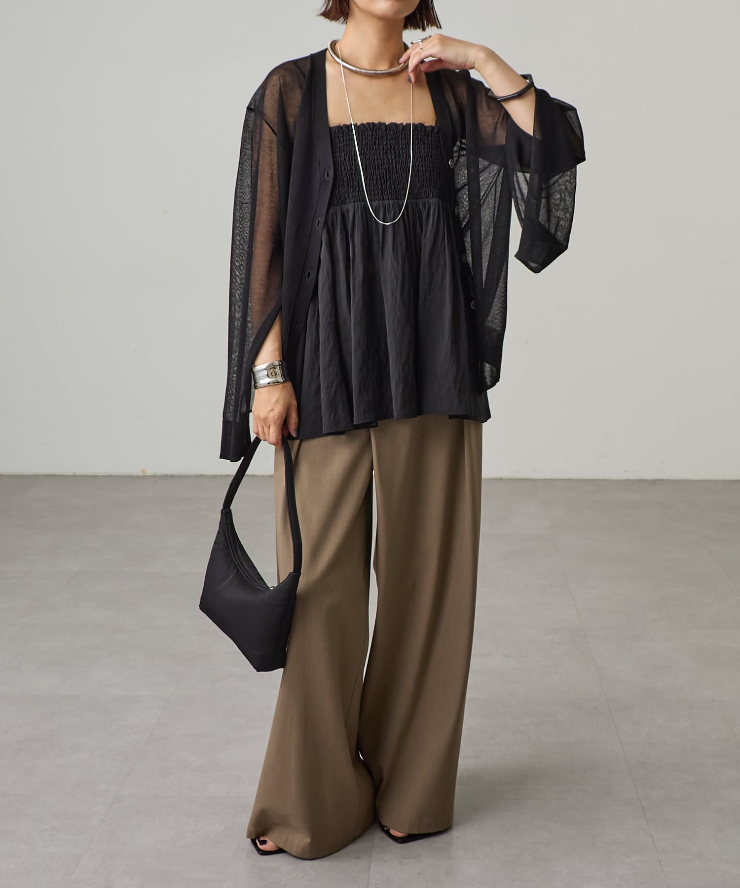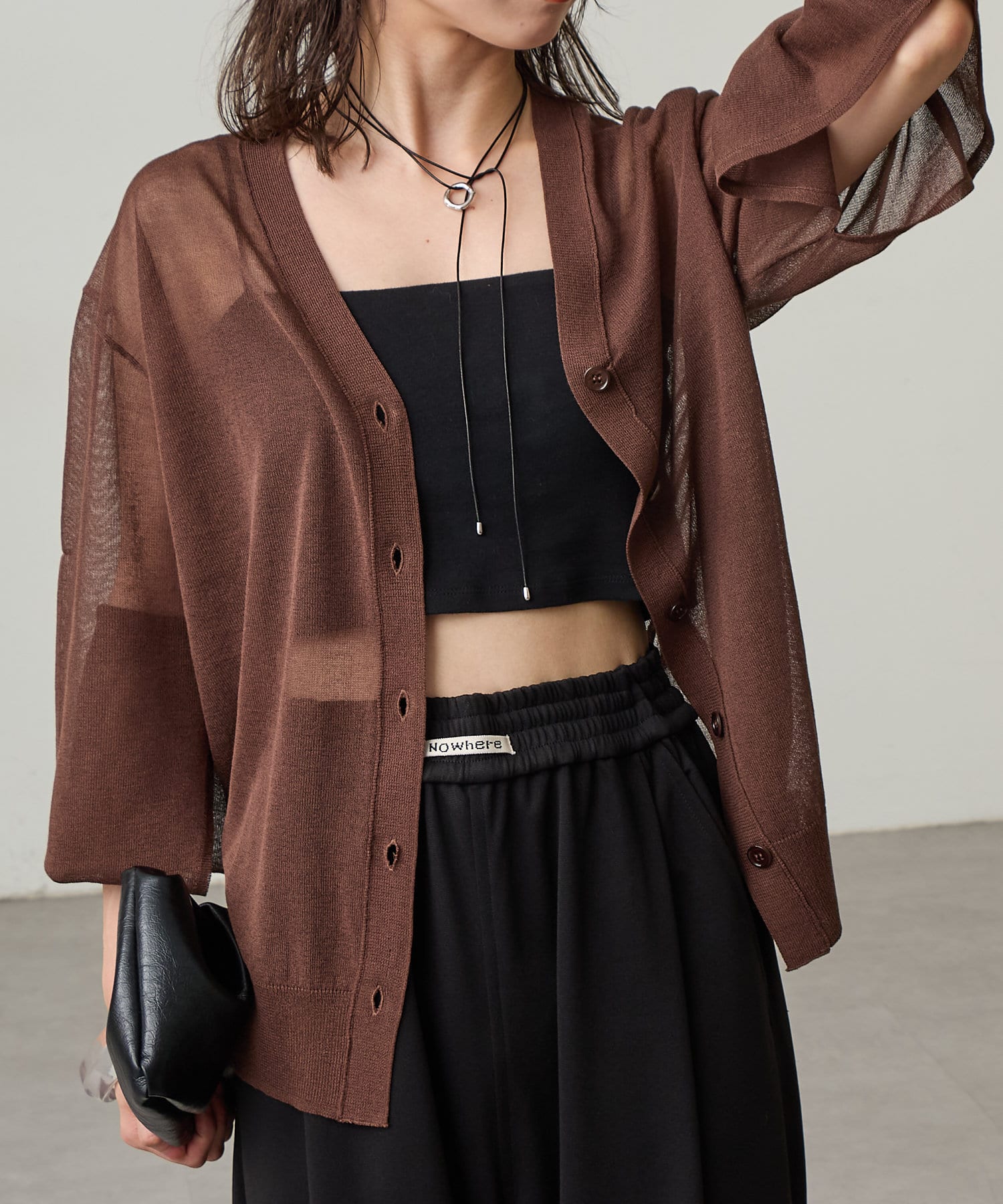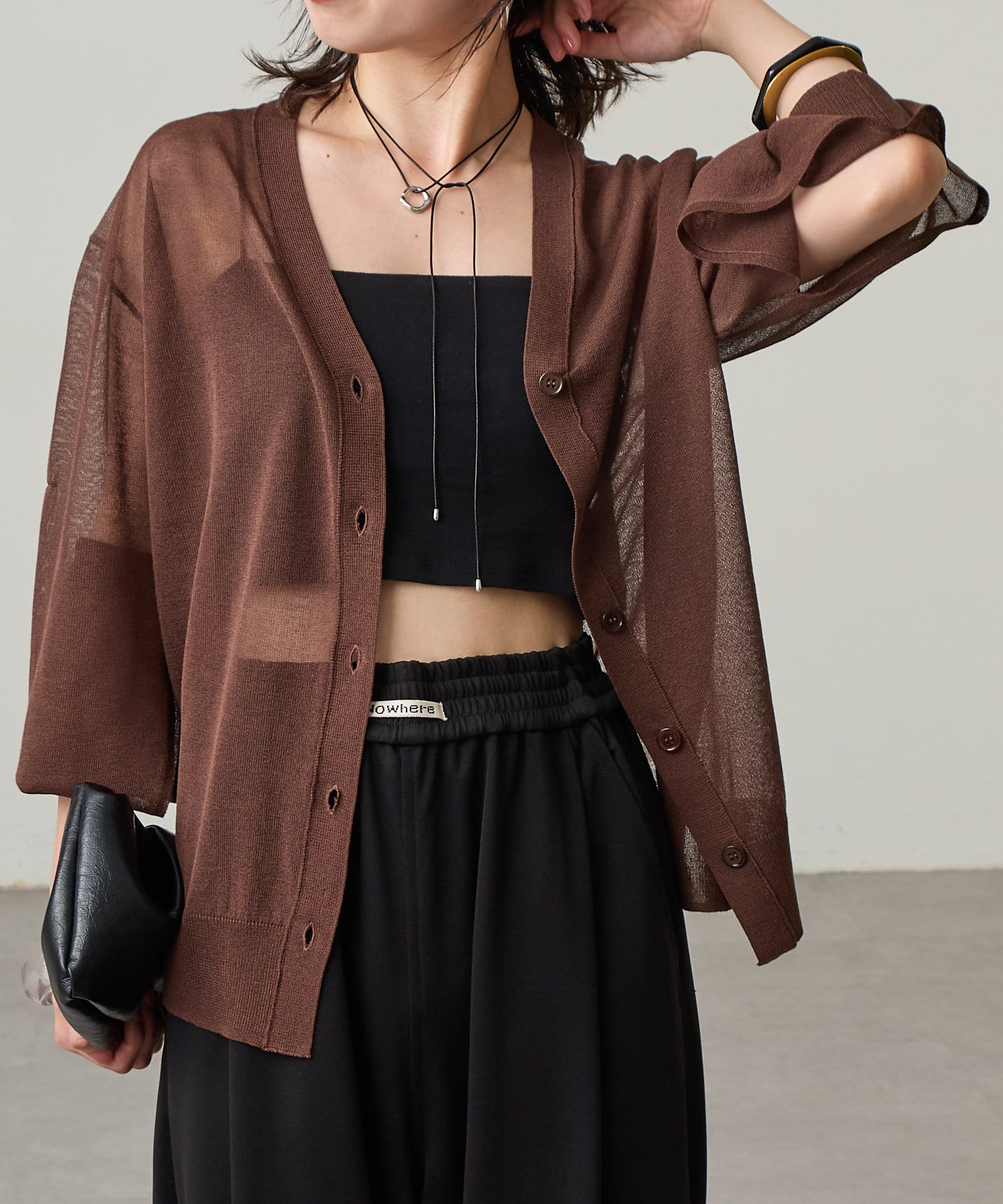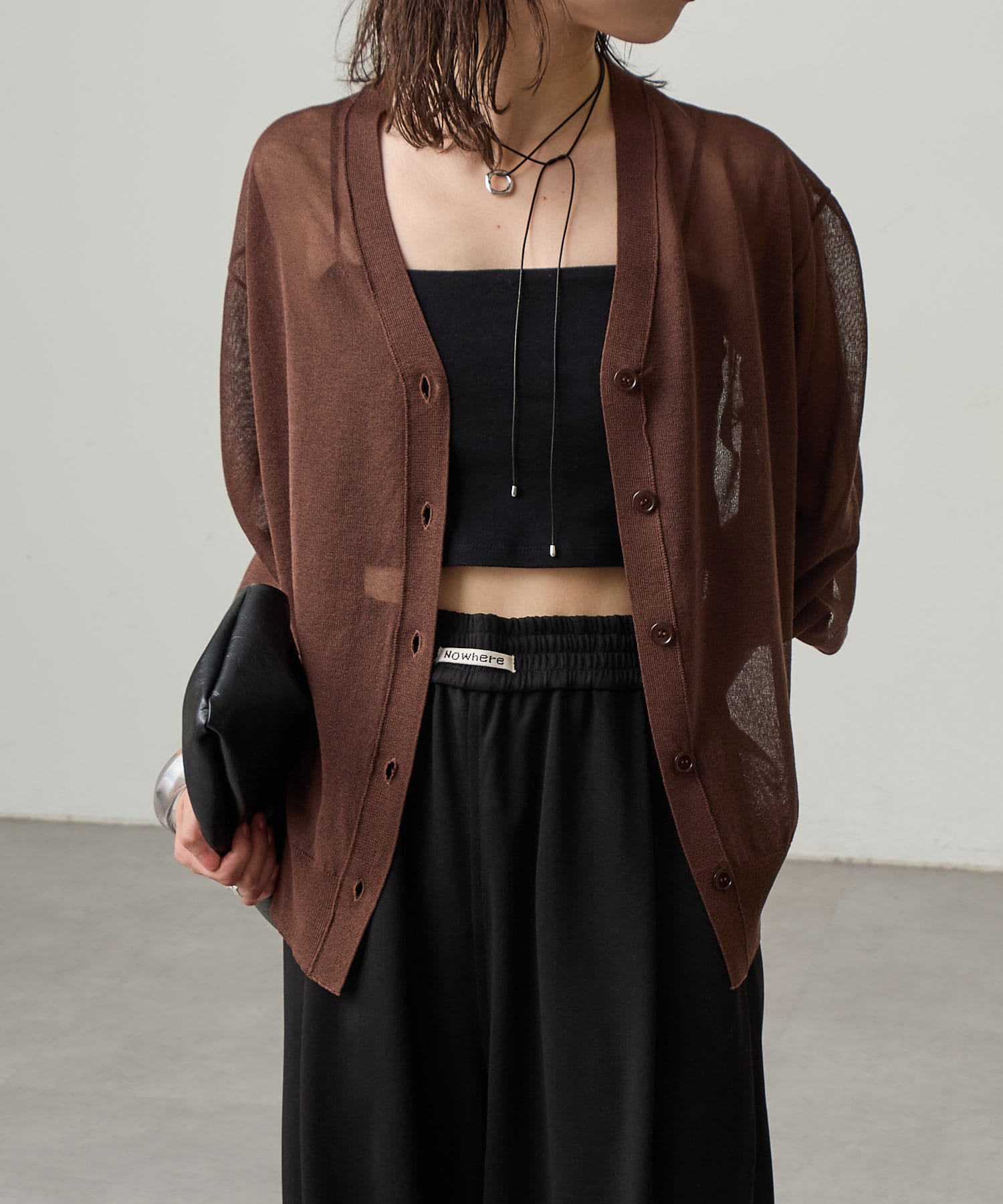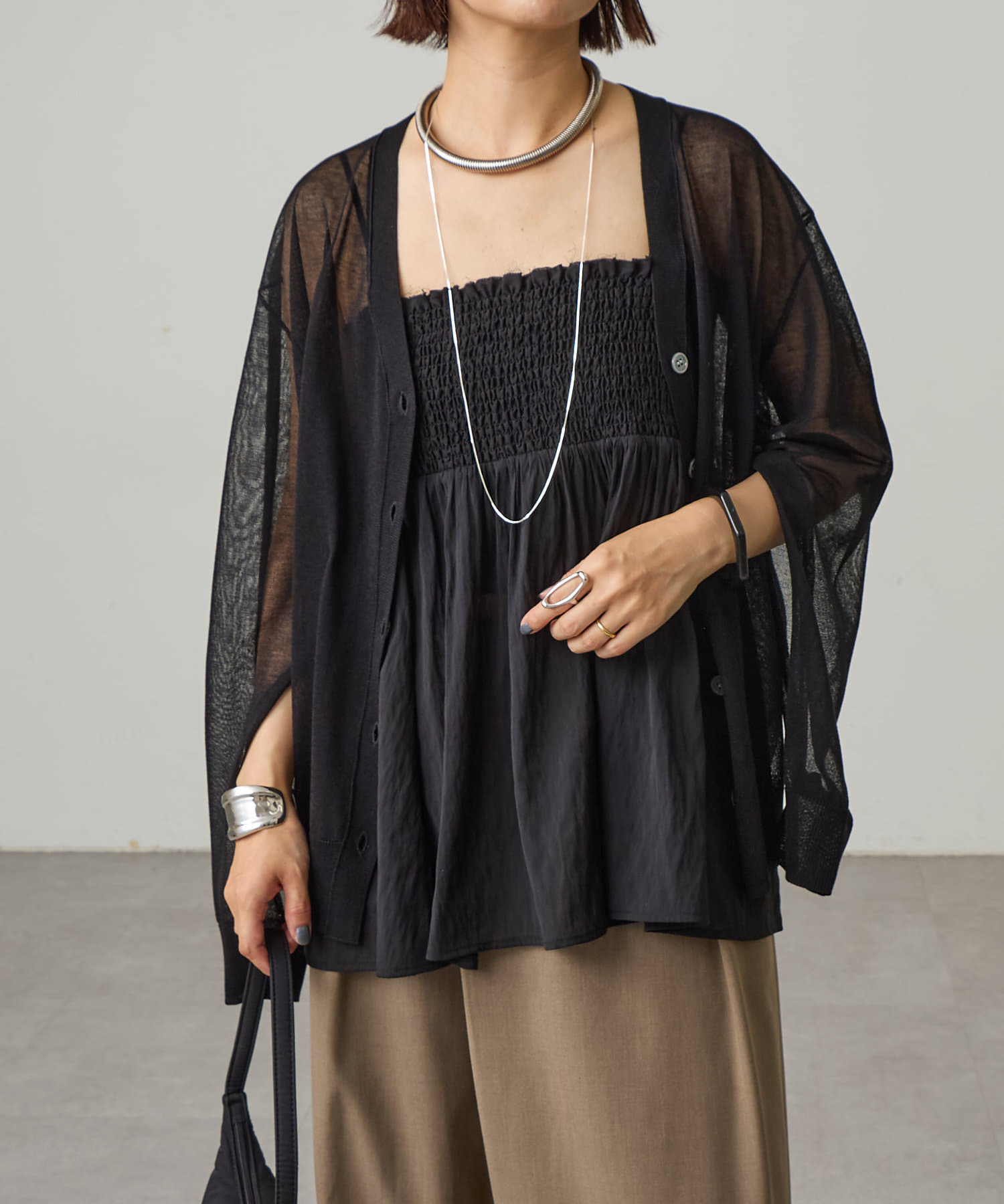 ・暑い時期にも着回せるシアー素材のカーディガン。