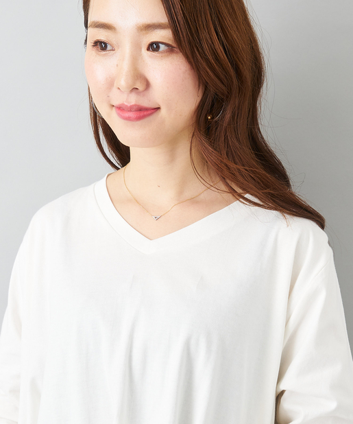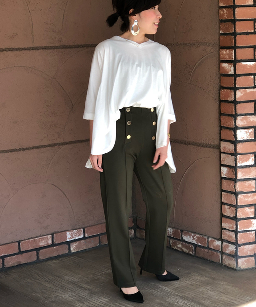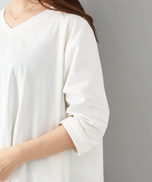 ・すっきりとしたVネックで引き締め、バランスよく見せてくれます。