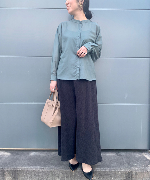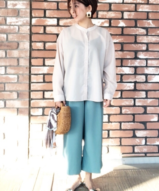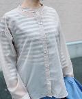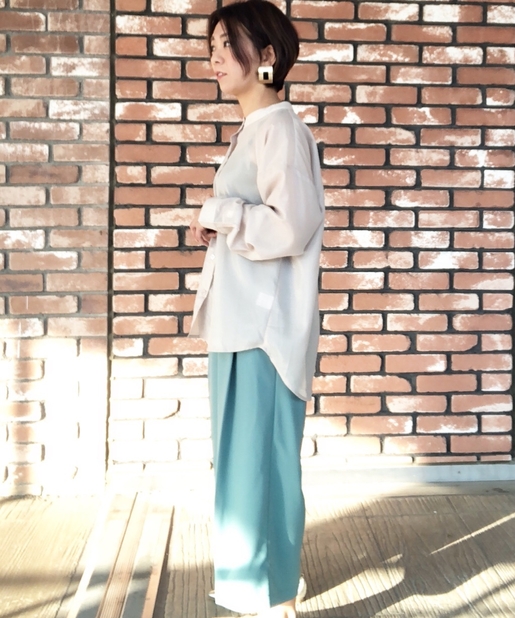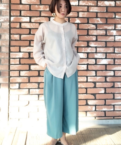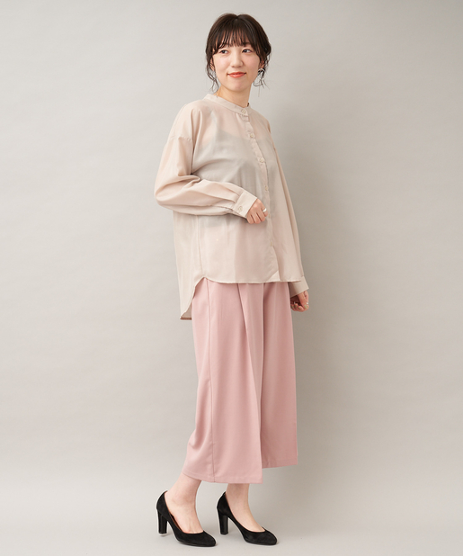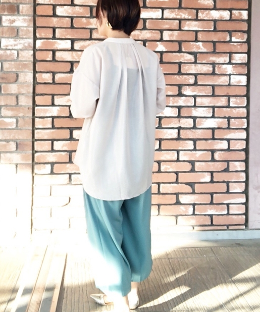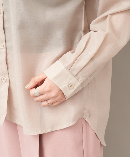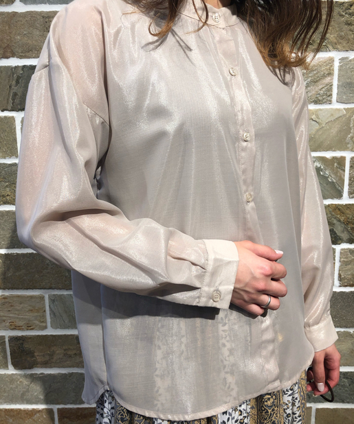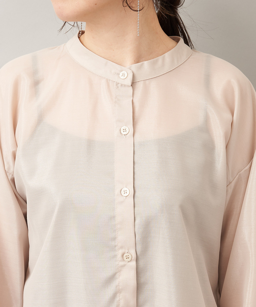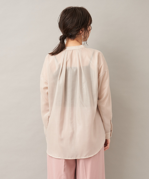 ・襟はバンドカラーで知的で大人雰囲気のシアーシャツ。