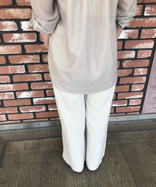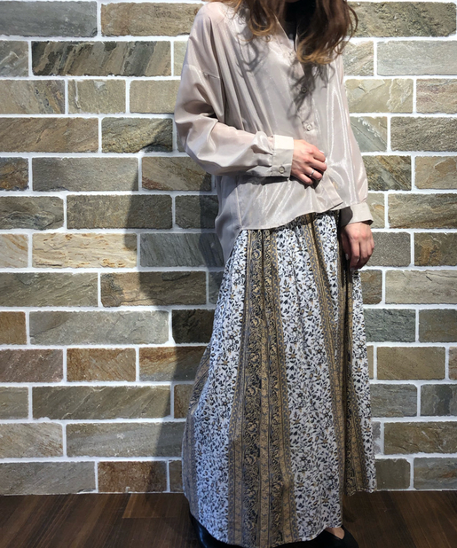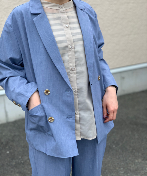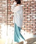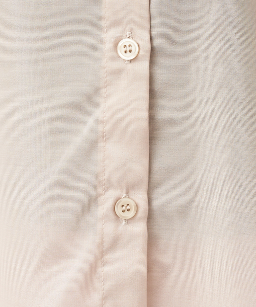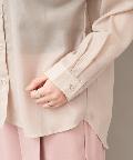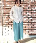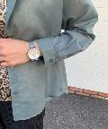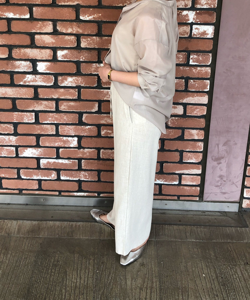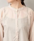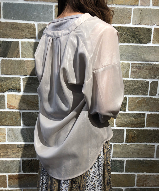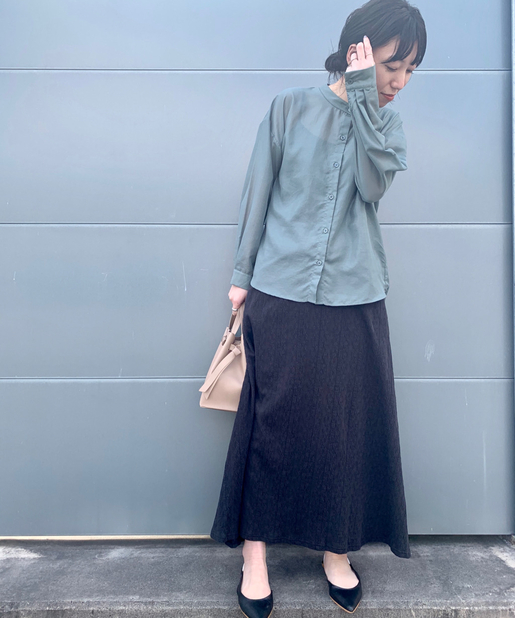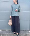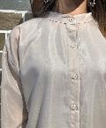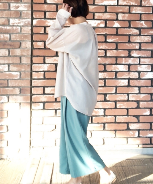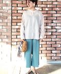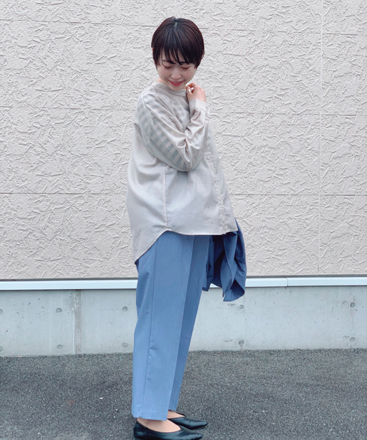 ・襟はバンドカラーで知的で大人雰囲気のシアーシャツ。