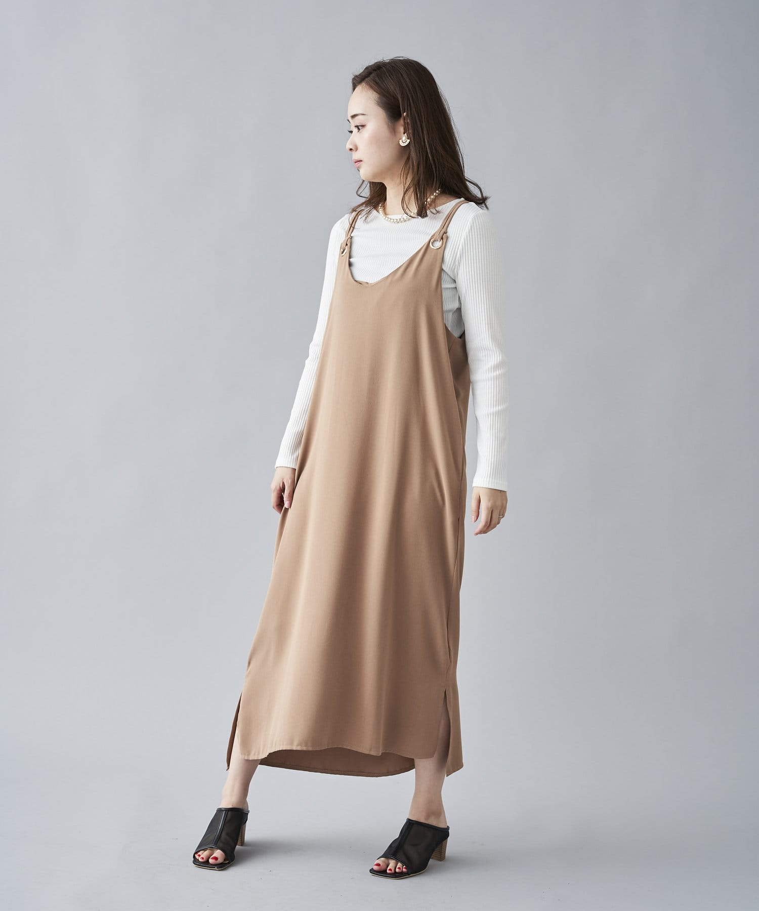 Chez toi(シェトワ) 【インナ―付きセットアイテム】2本ハトメキャミワンピース×長袖カットリブT