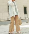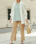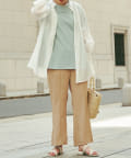 パンツはワイドパンツ、デニム、スキニーパンツなど幅広く合わせて着て頂けますがスカートでも羽織りとして合わせて頂くかインして着用できますのでコーデを選ばないです