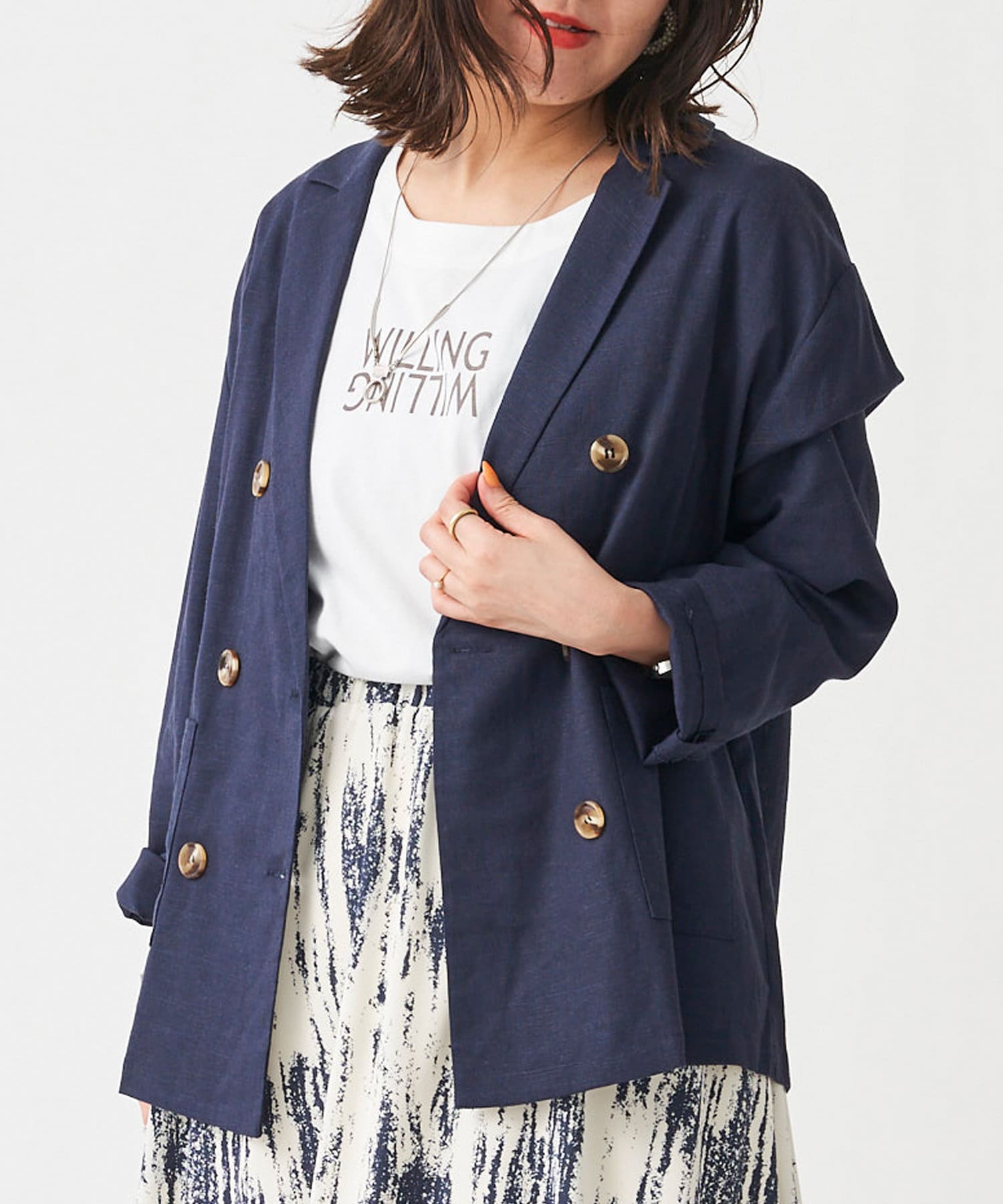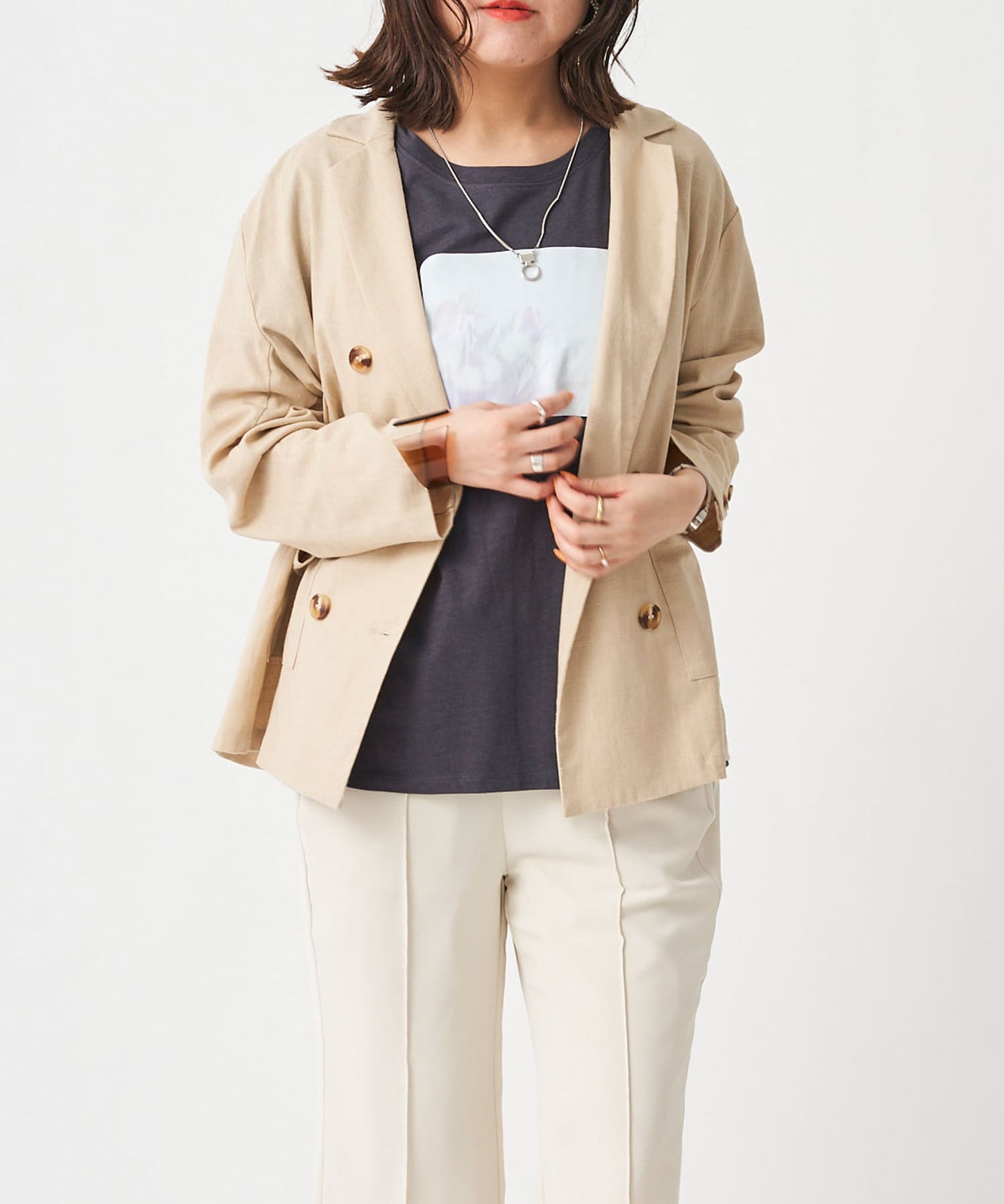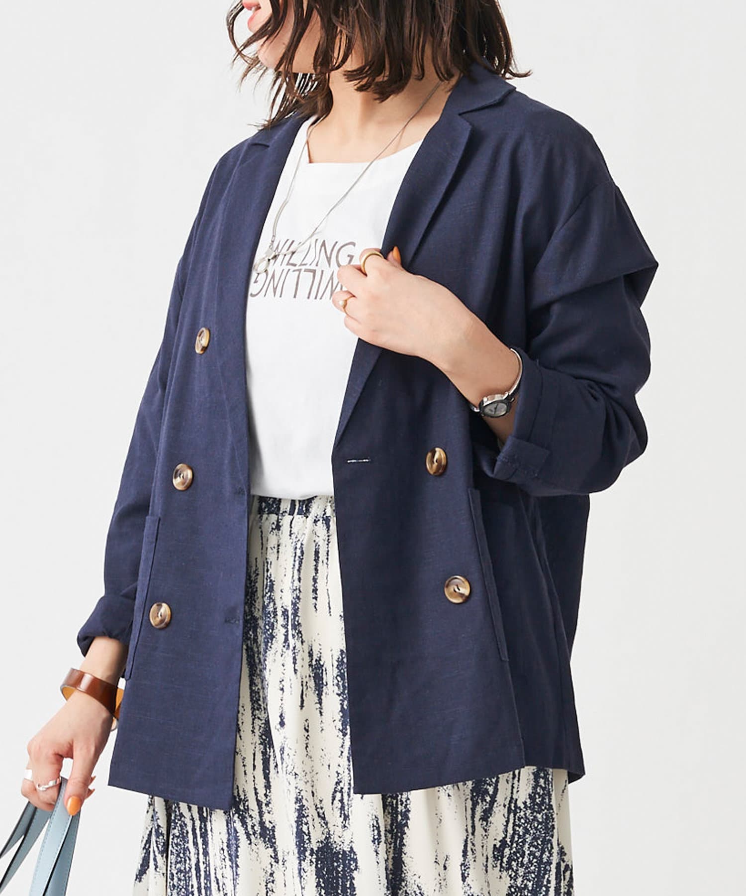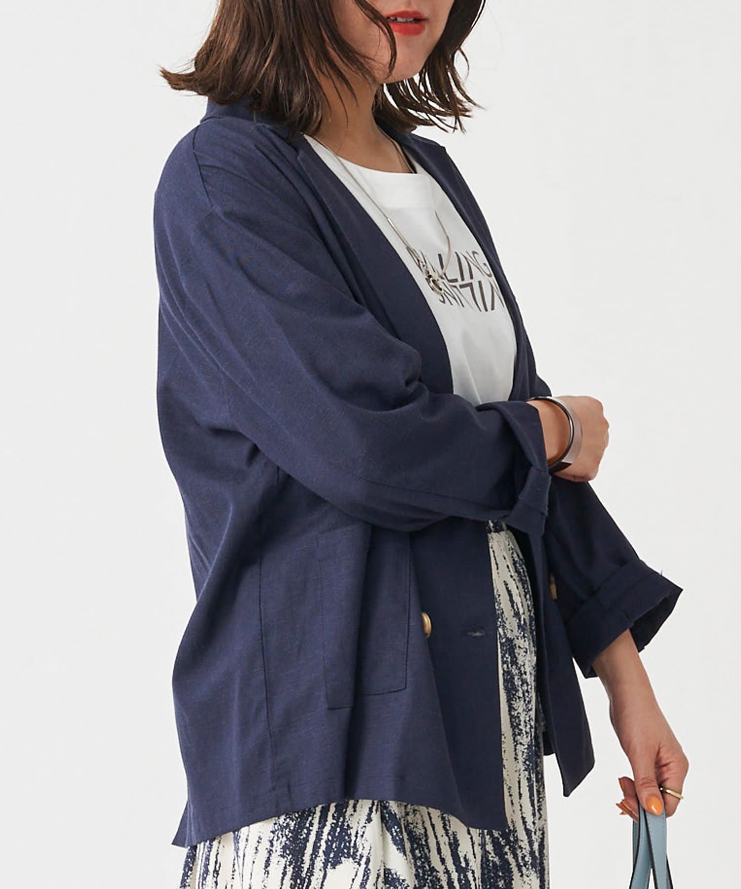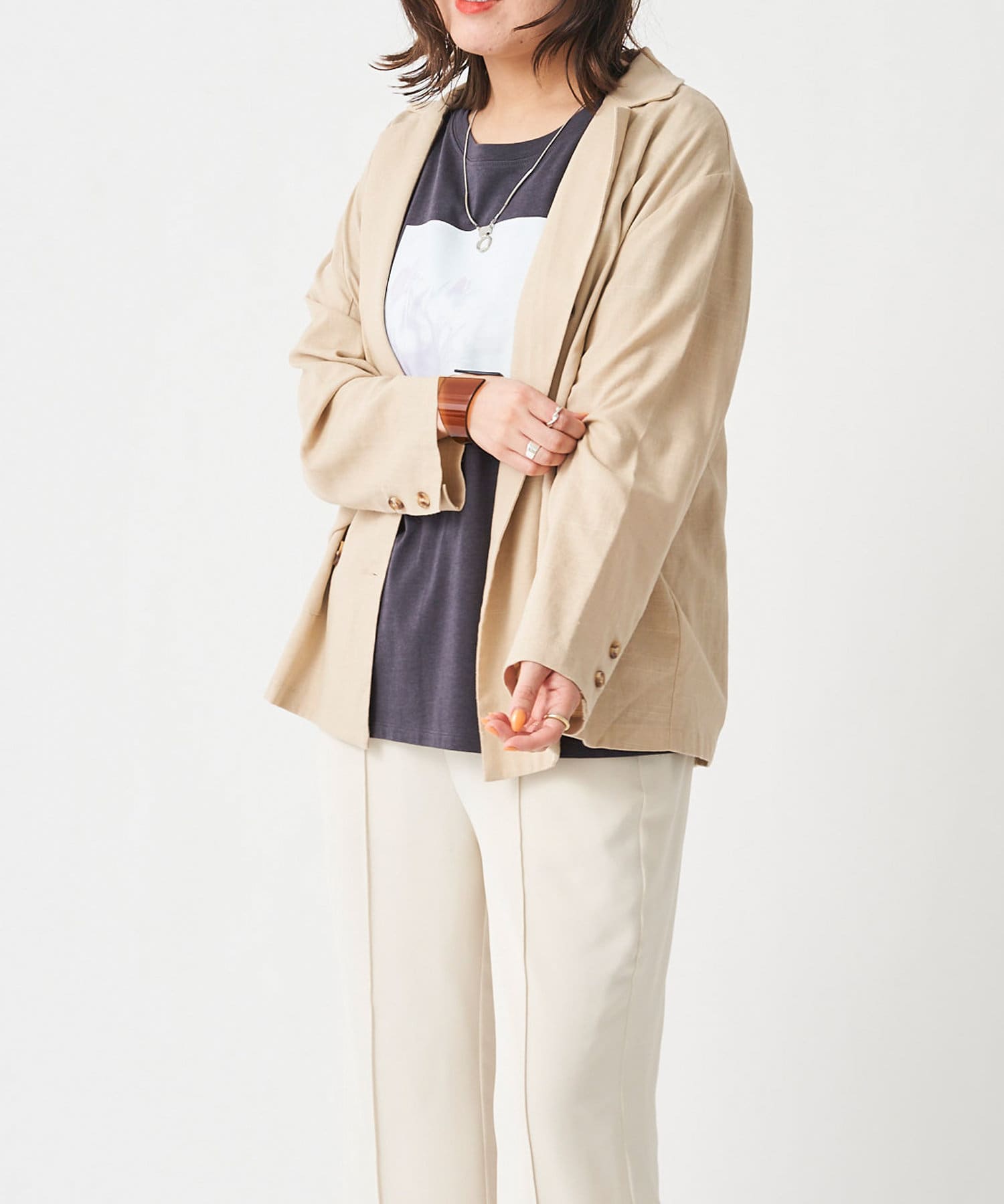 麻レーヨンの柔らかい素材。ゆったりしたサイズ感が普段使いもしやすいテーラードジャケット