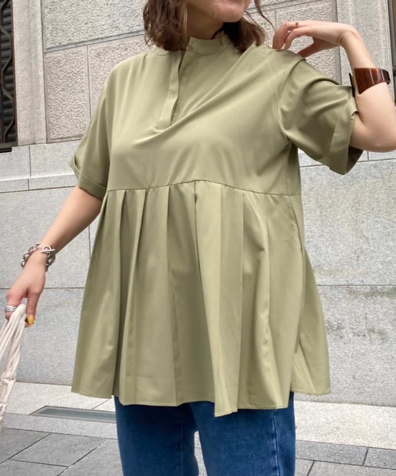 バンドカラー×プリーツ切替が最近らしいデザイン。袖もターンバックになっているので、