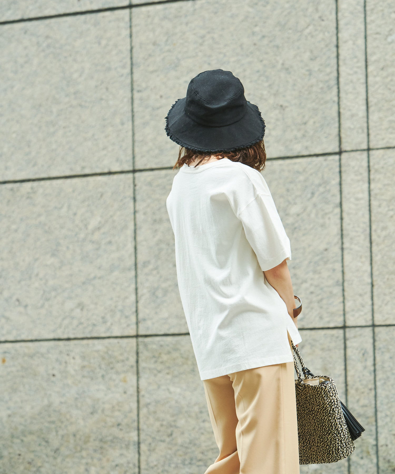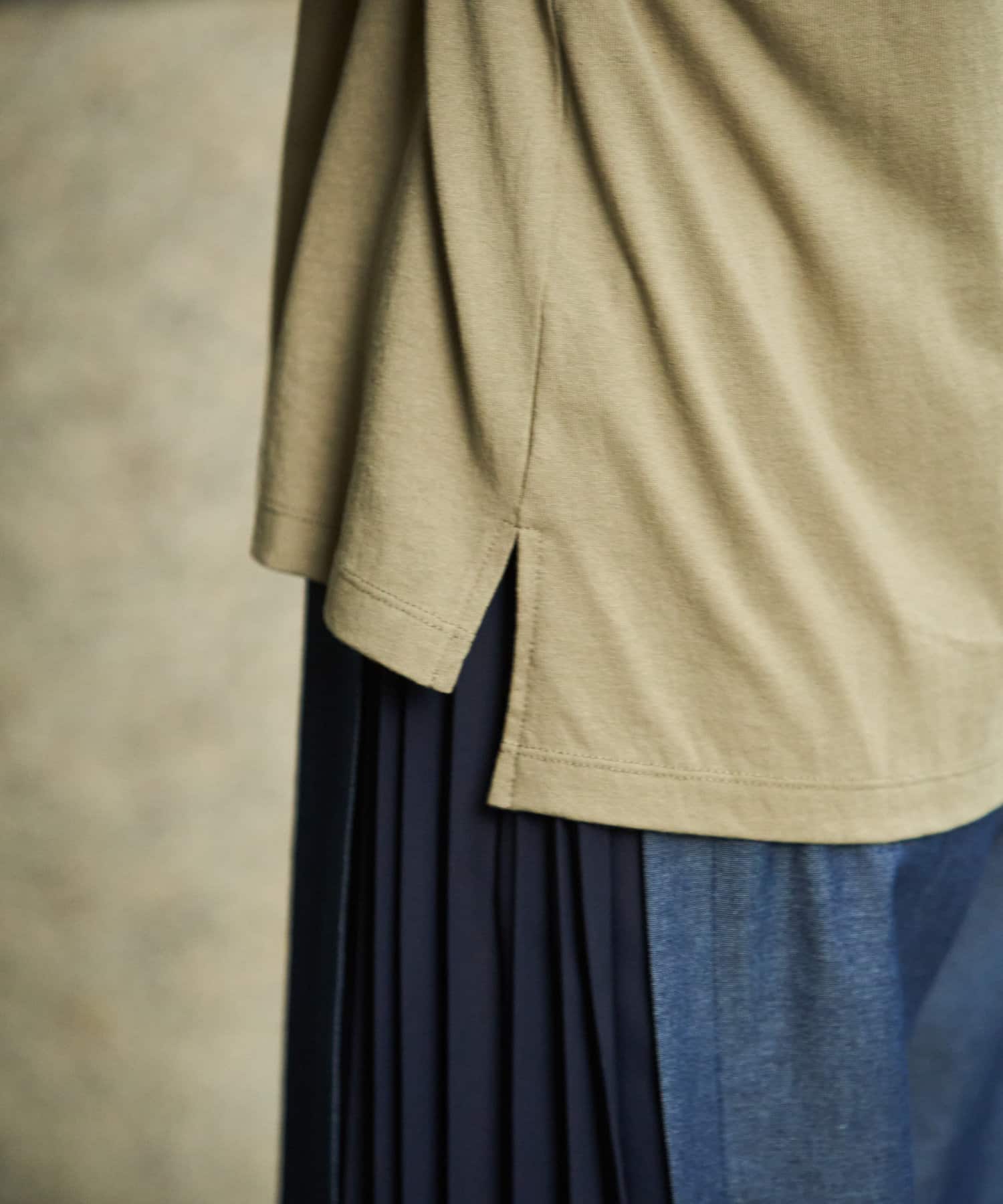 ベーシックなクルーネックのTシャツで、体のラインを拾いづらいです。前後差がありスリット