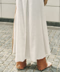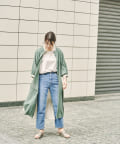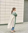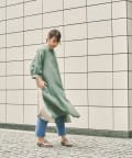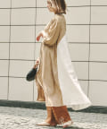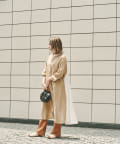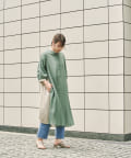 体のラインを拾わないゆったりしたサイズ感。程よく広がるAラインのシルエットは歩くたびに