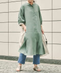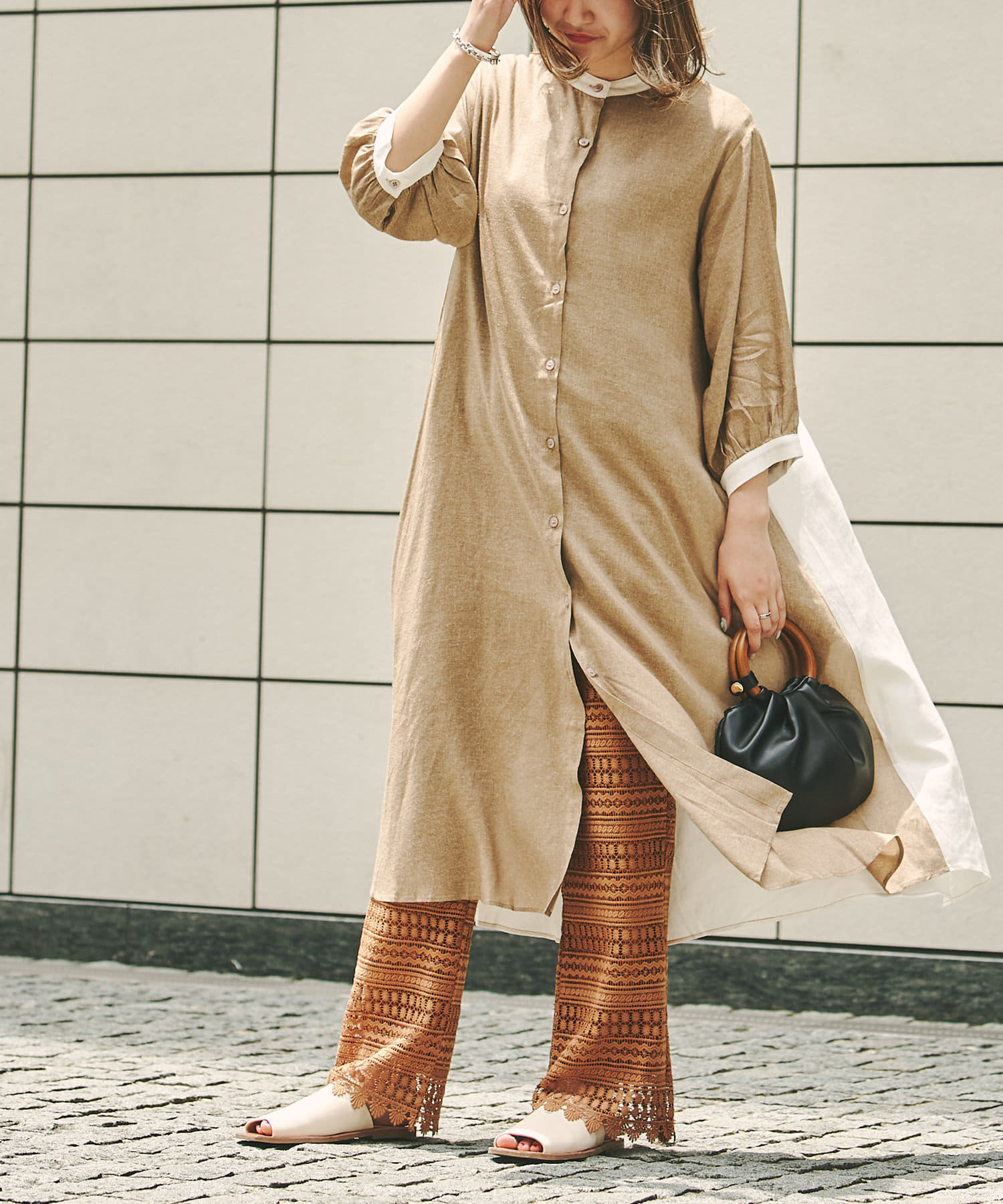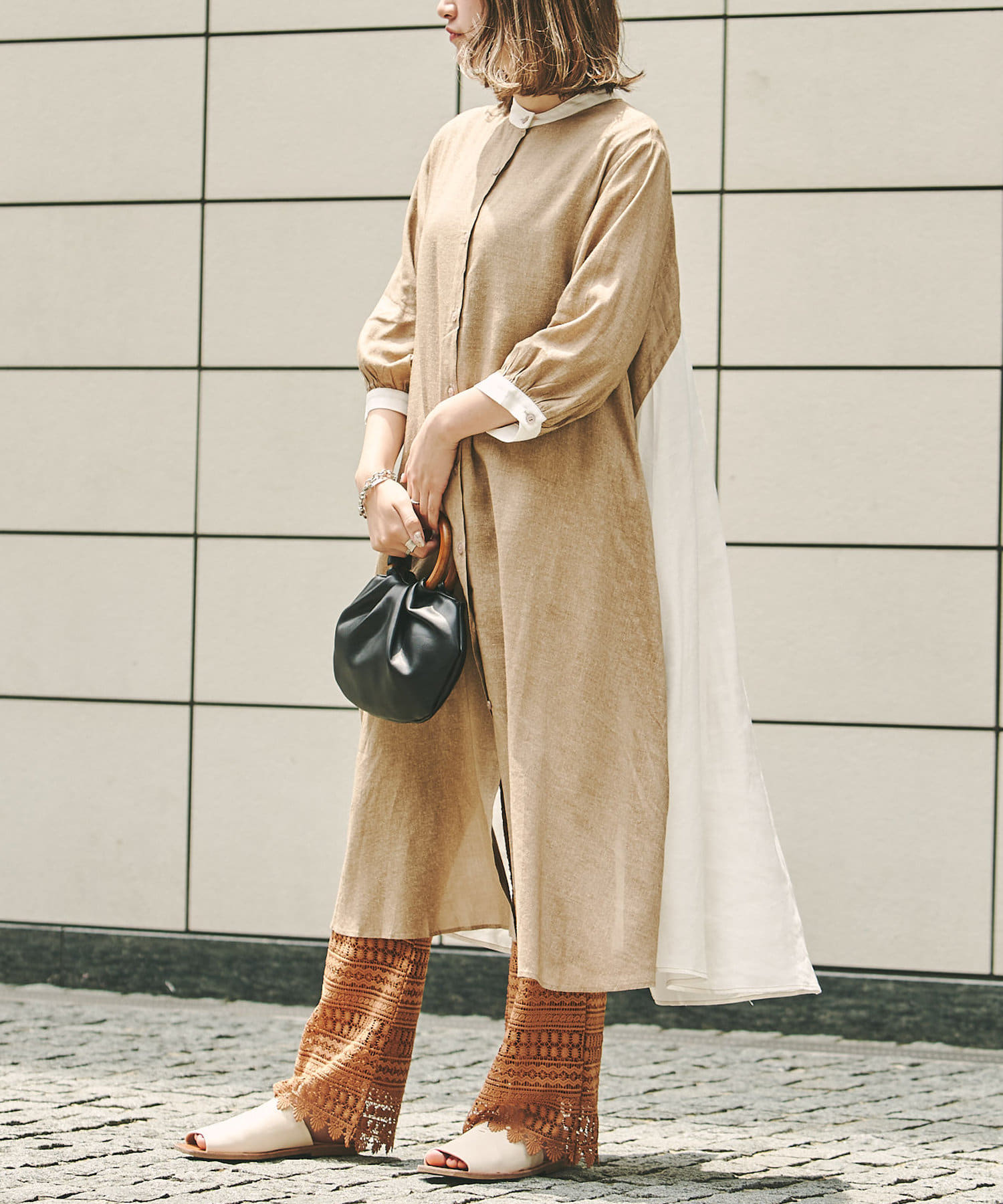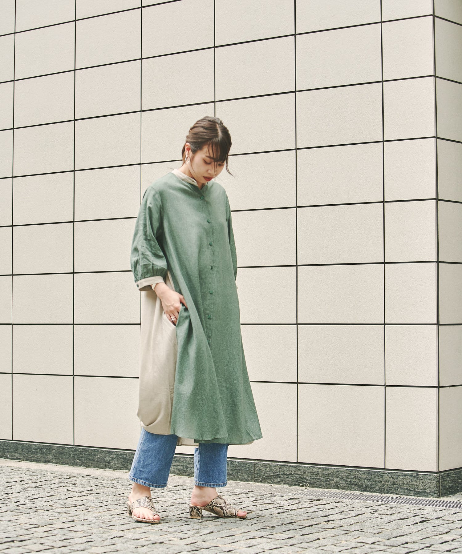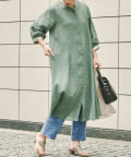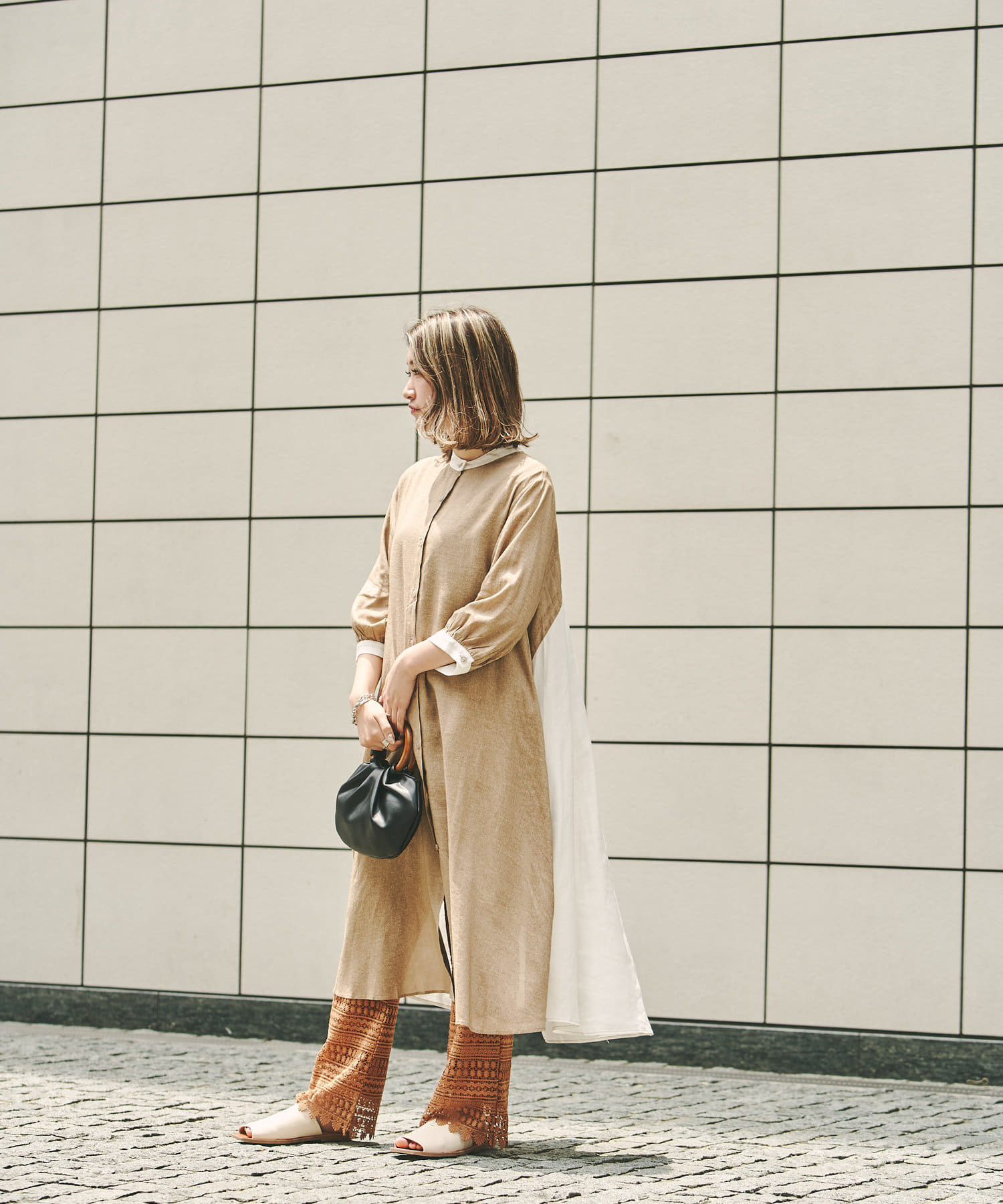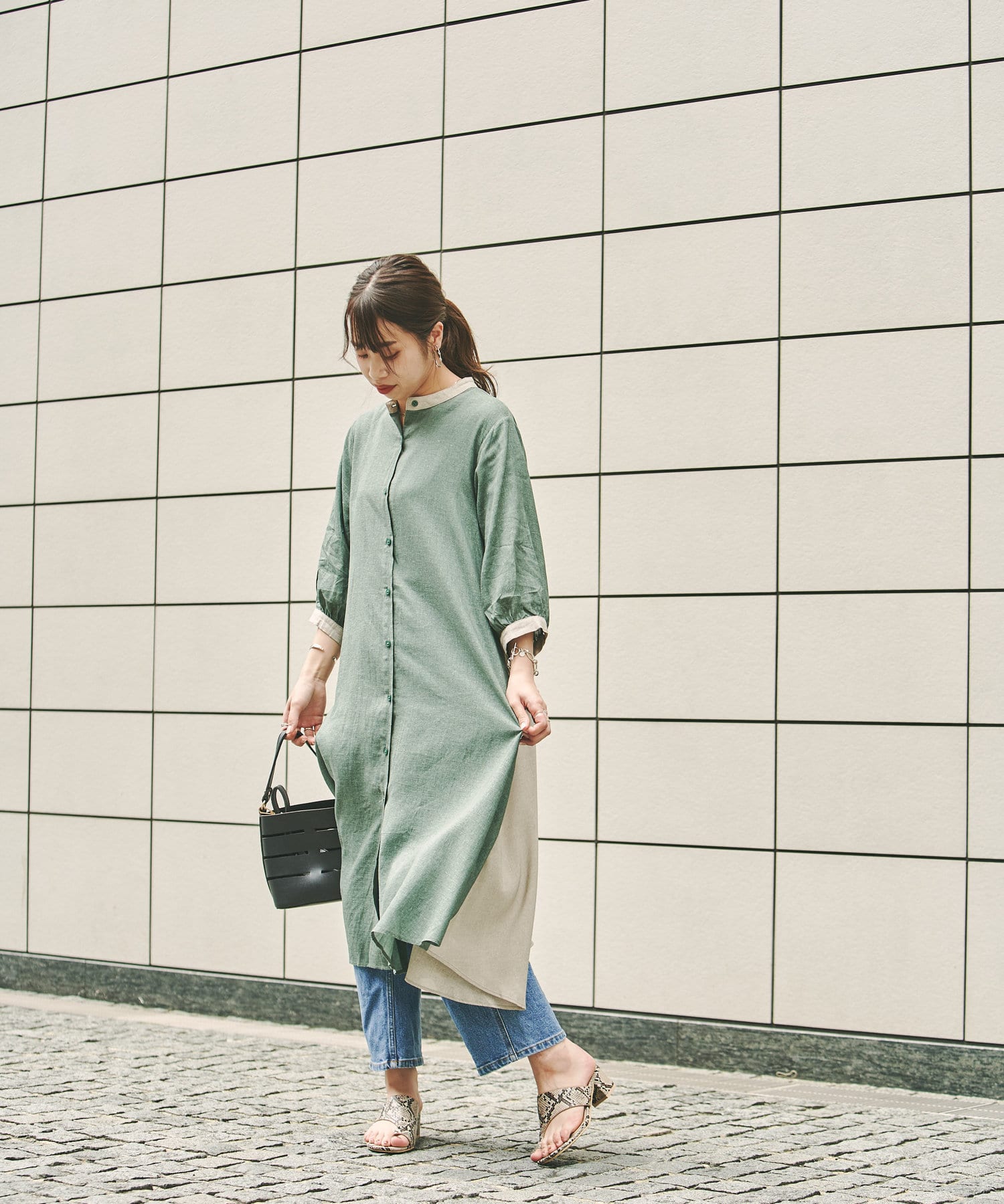 レイヤードスタイルで軽快なニュアンスをつけるシャツワンピース。閉めて着用してもこなれた印象に