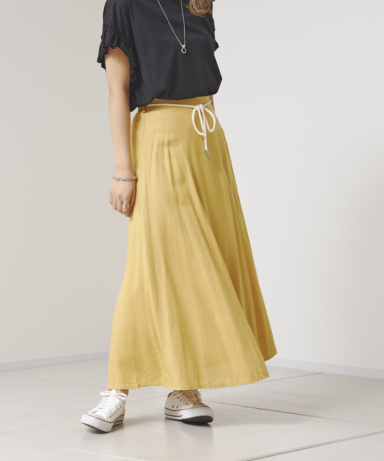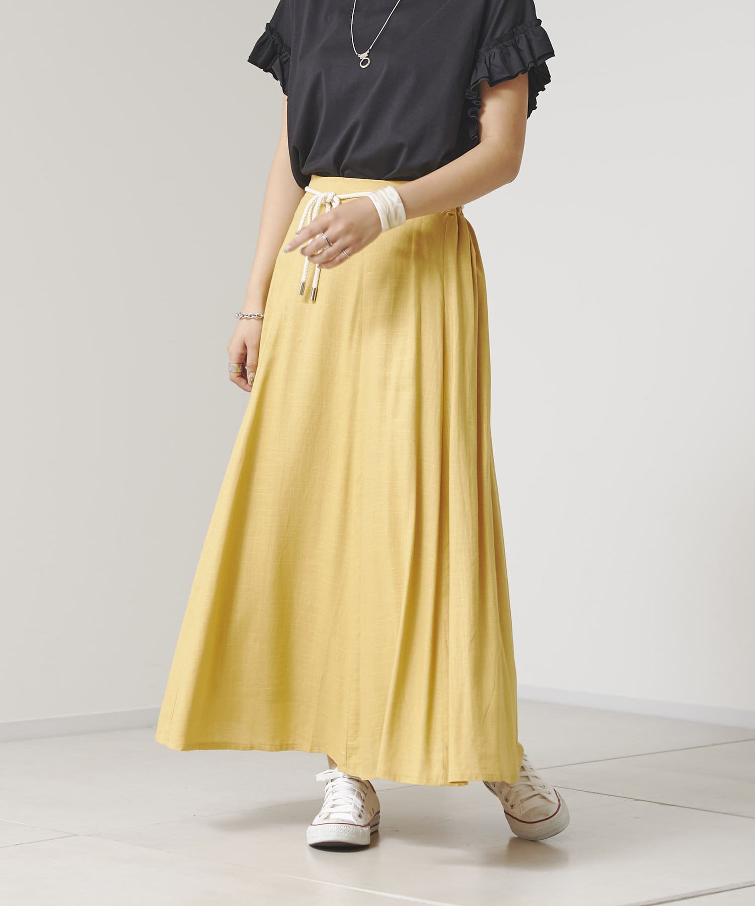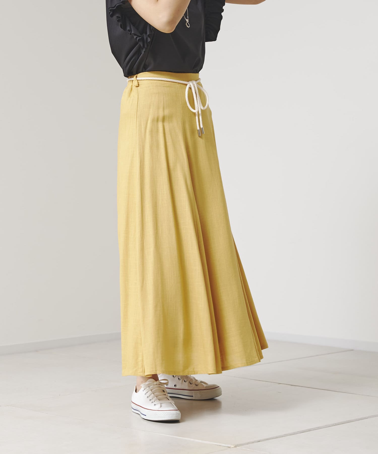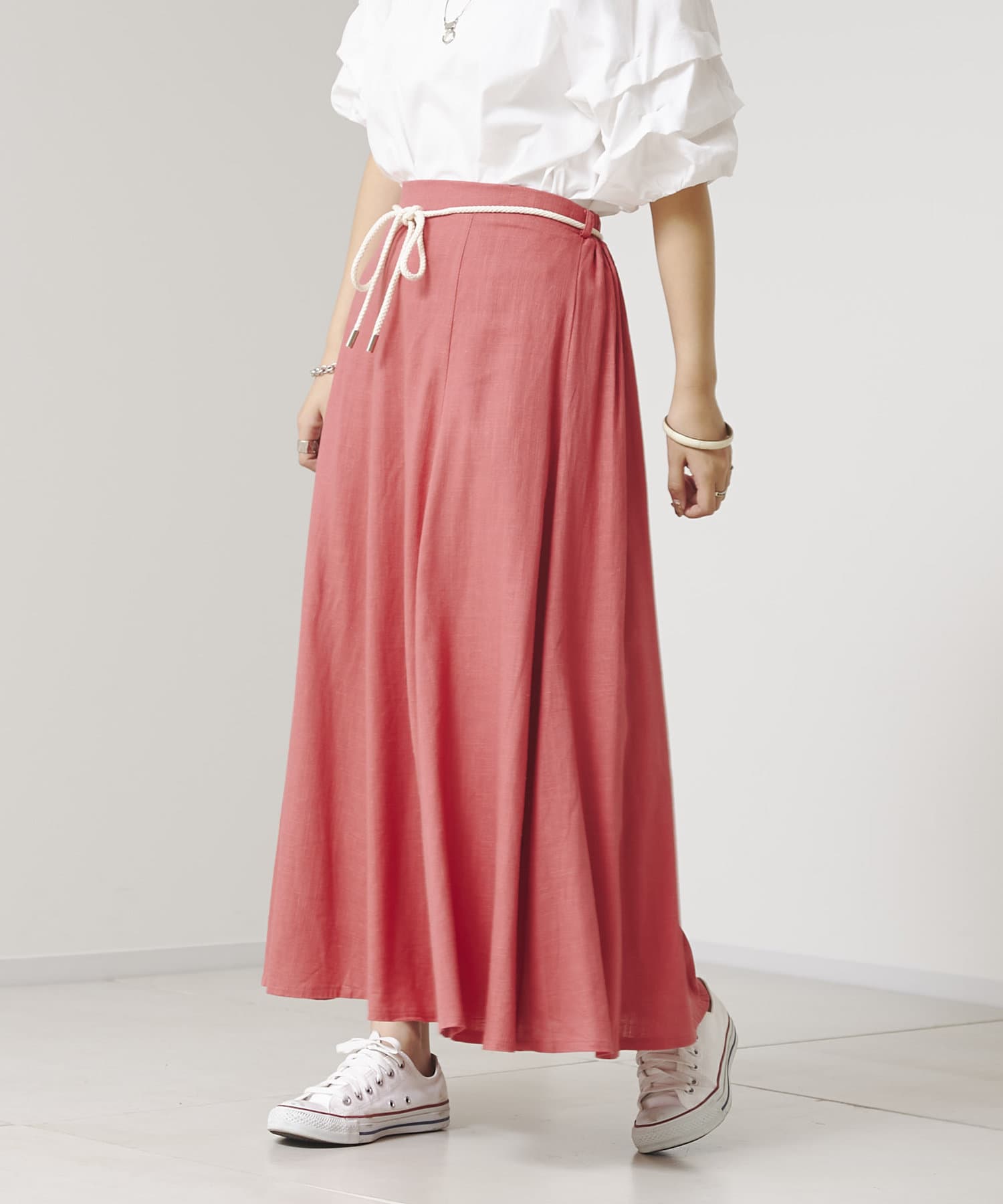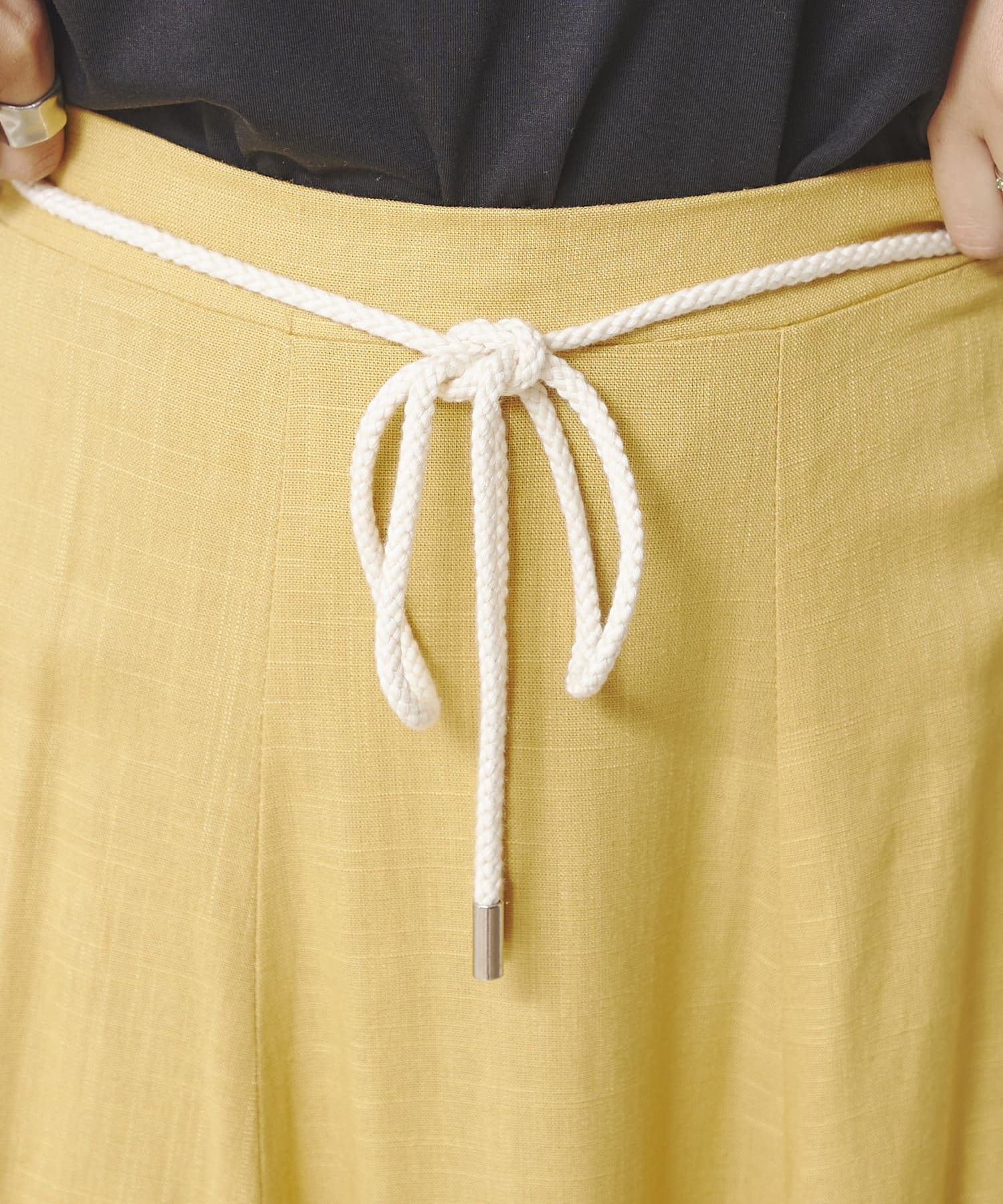 ロープ紐のアクセントと気分の上がる明るいカラーが特徴的なスカート