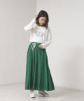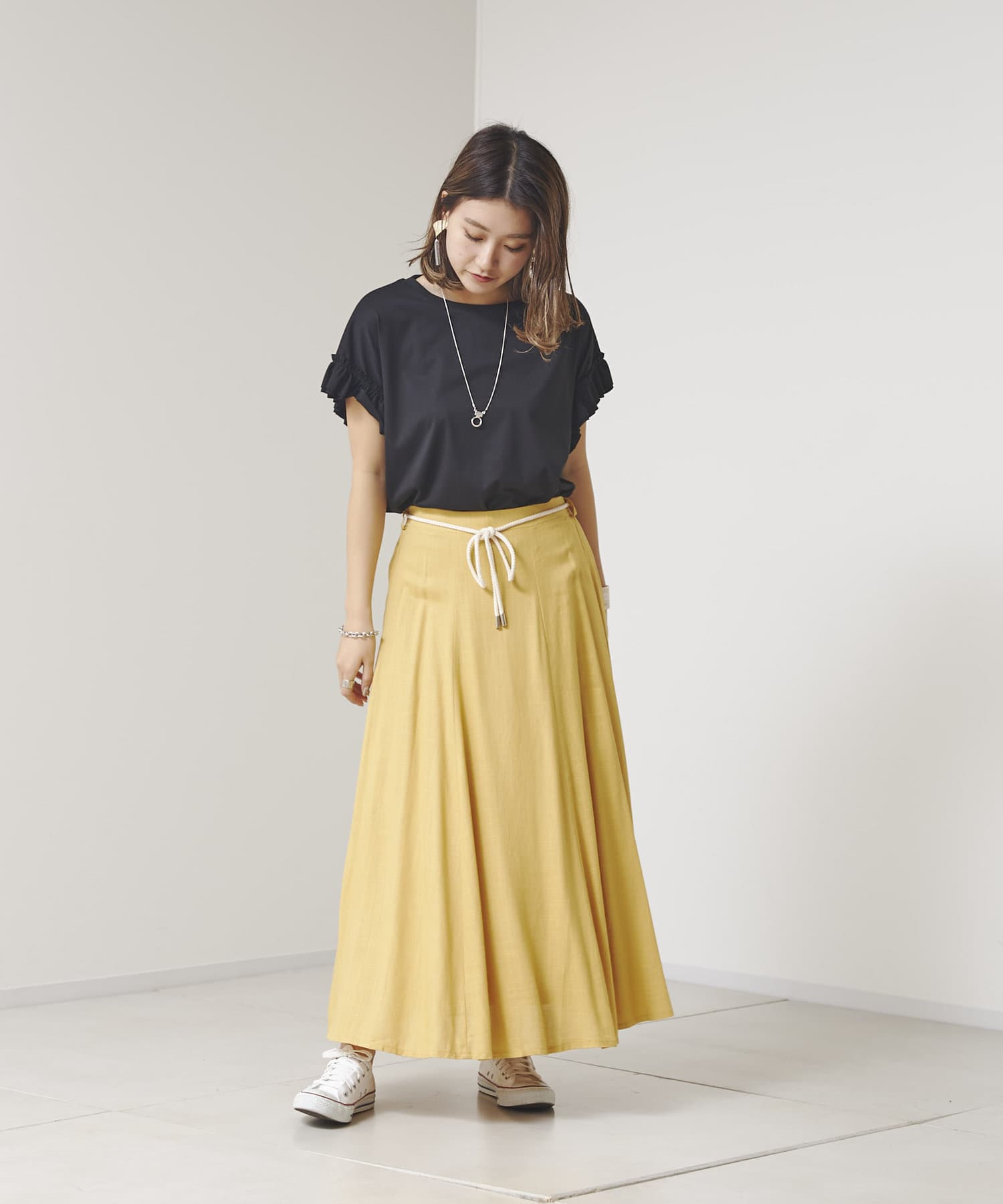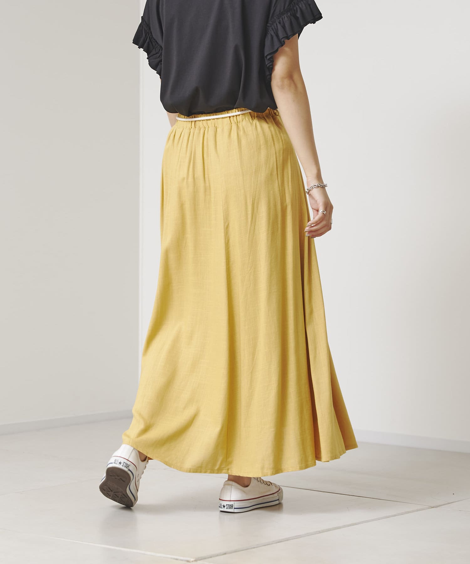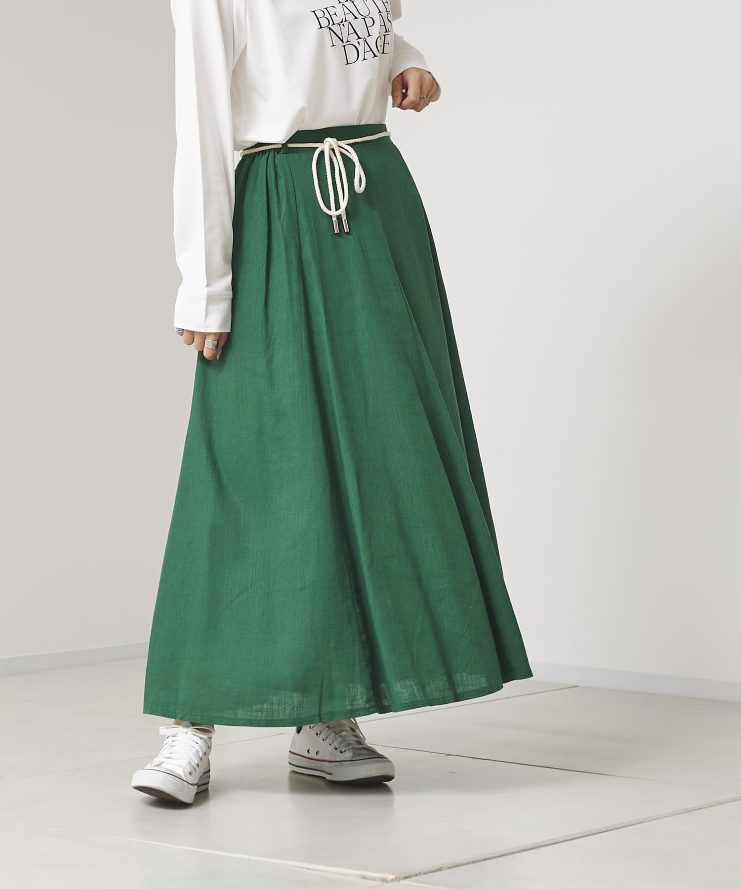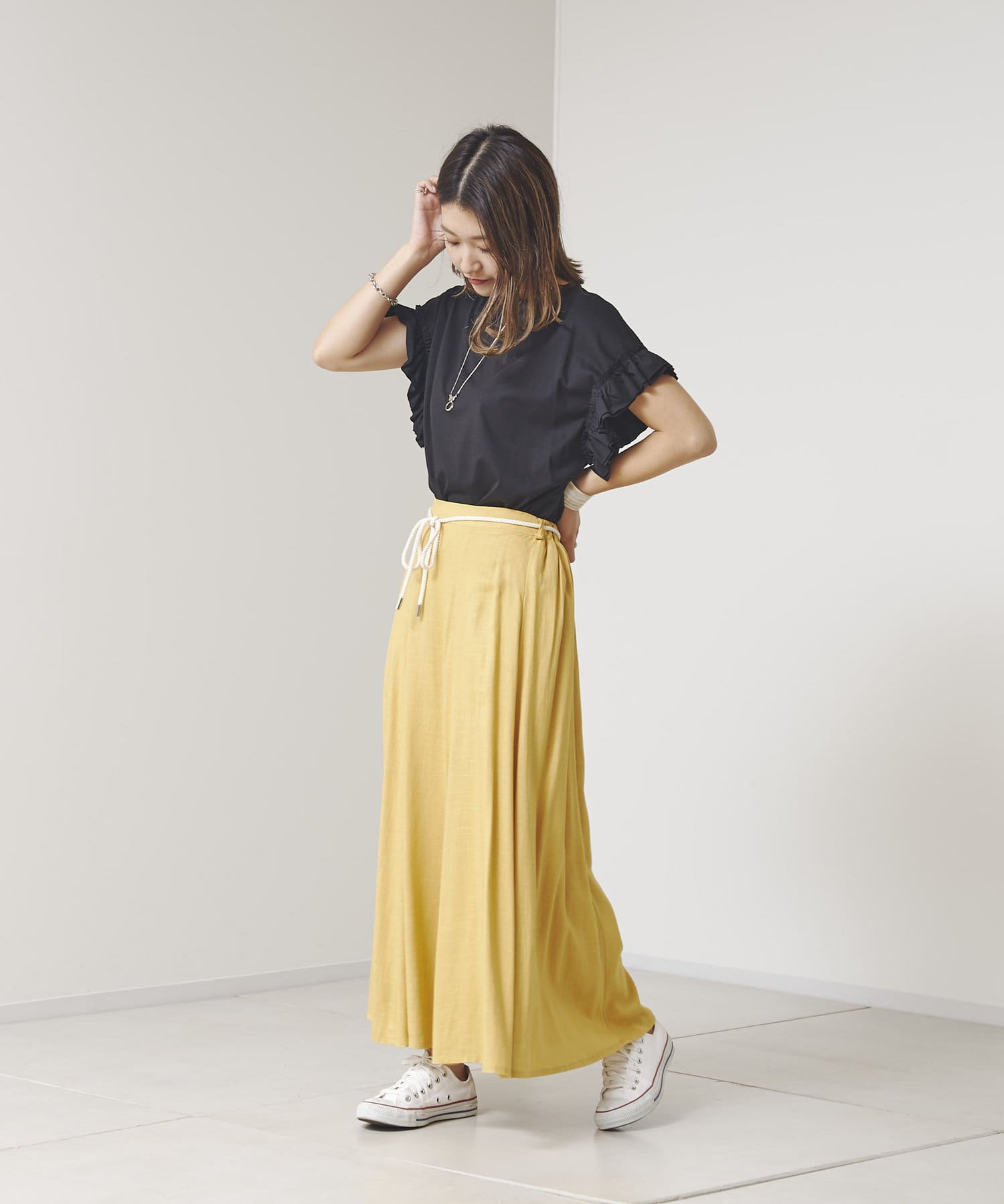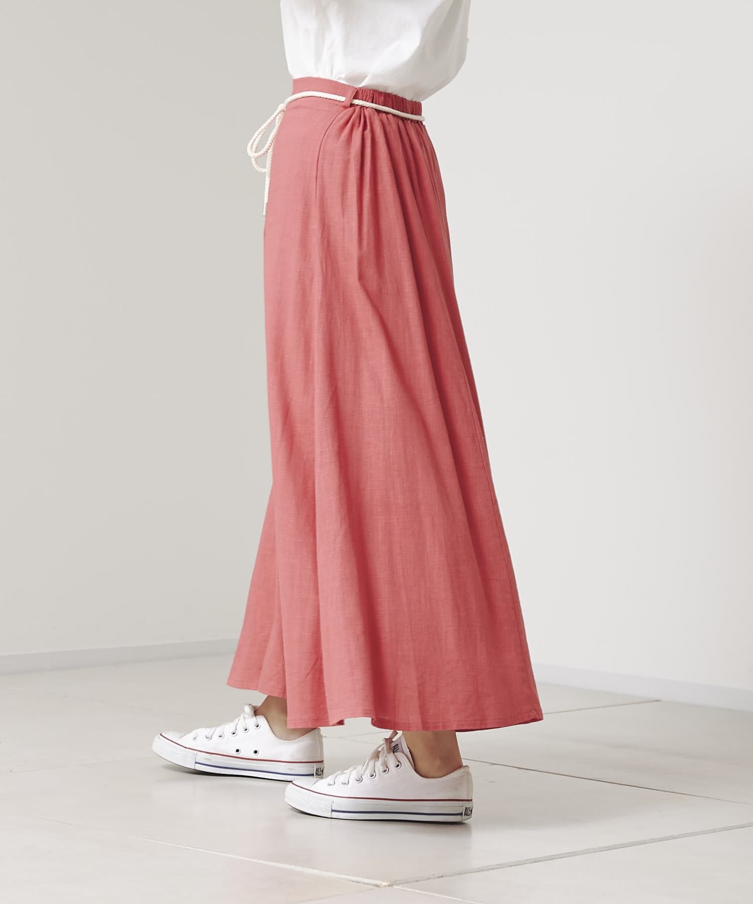 ロープ紐のアクセントと気分の上がる明るいカラーが特徴的なスカート