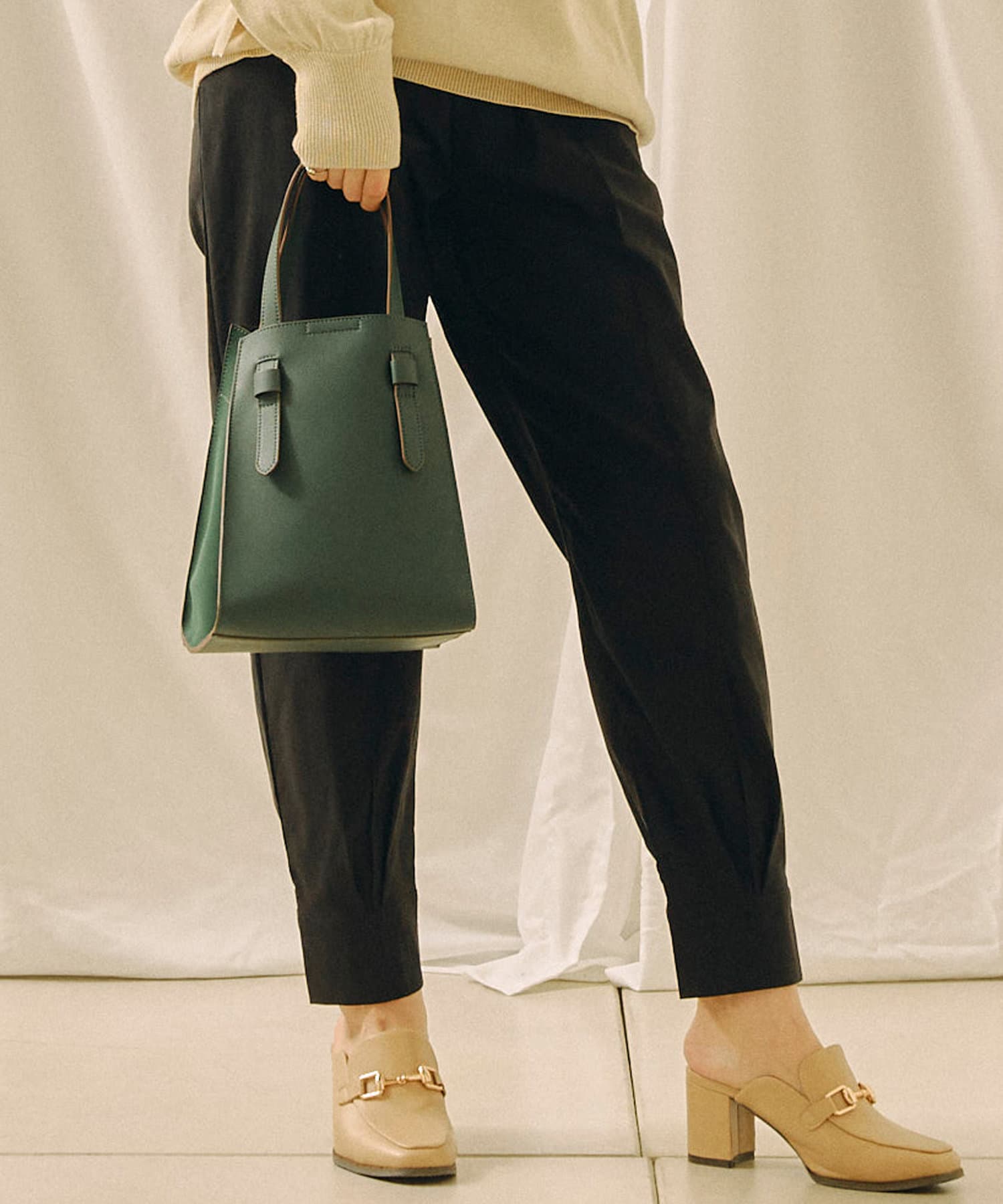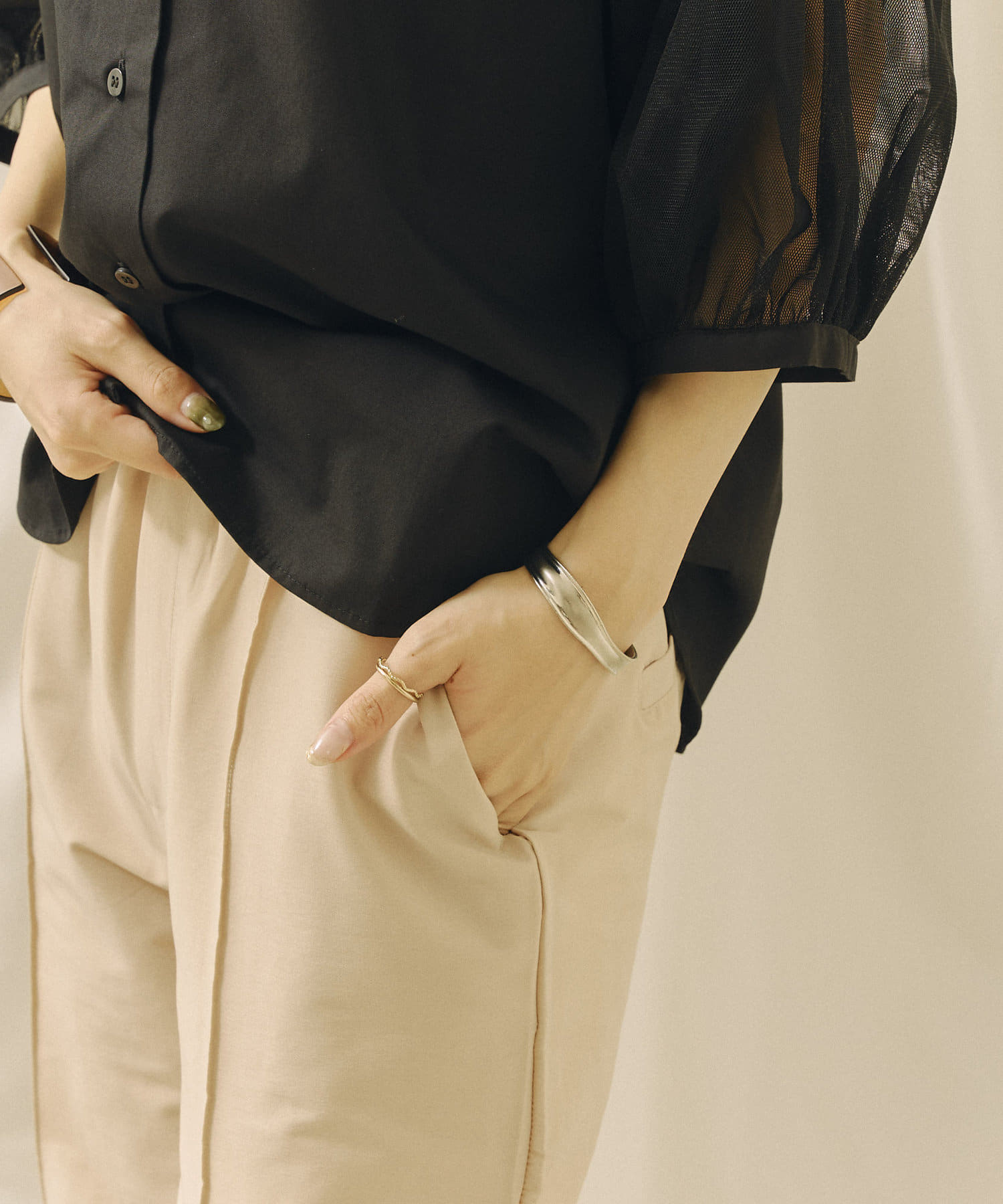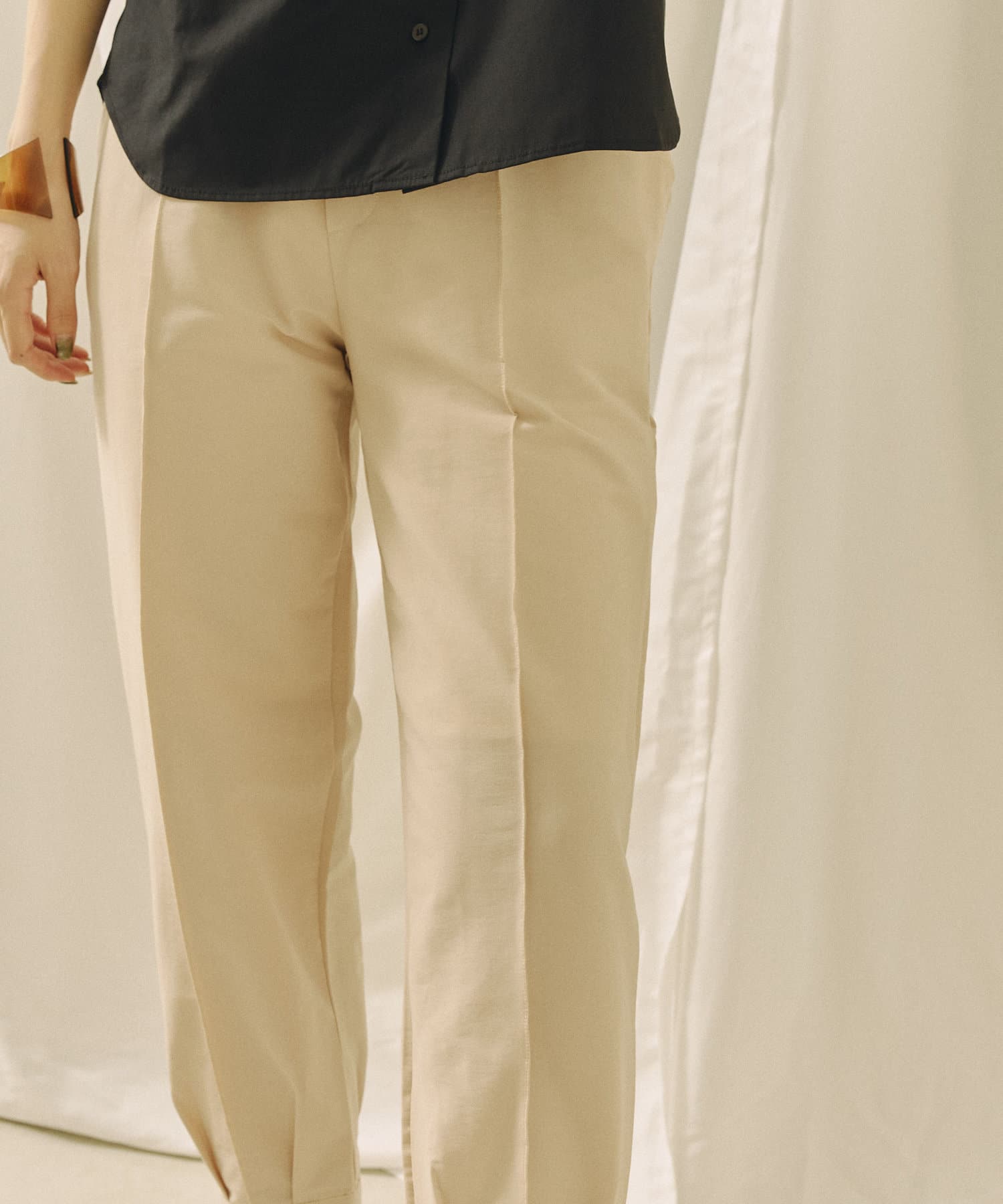 光沢感とセンタープレスのラインで程よくきれいめ見えするので普段使いもしやすいデザインです