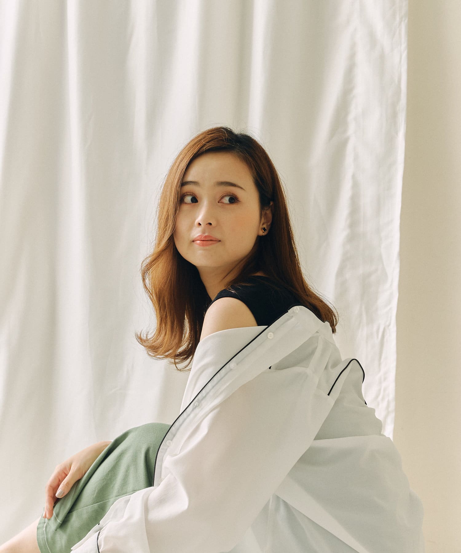 ゆるっとした素材で、体のラインを拾いづらいです。後ろに抜いて抜け感を出して