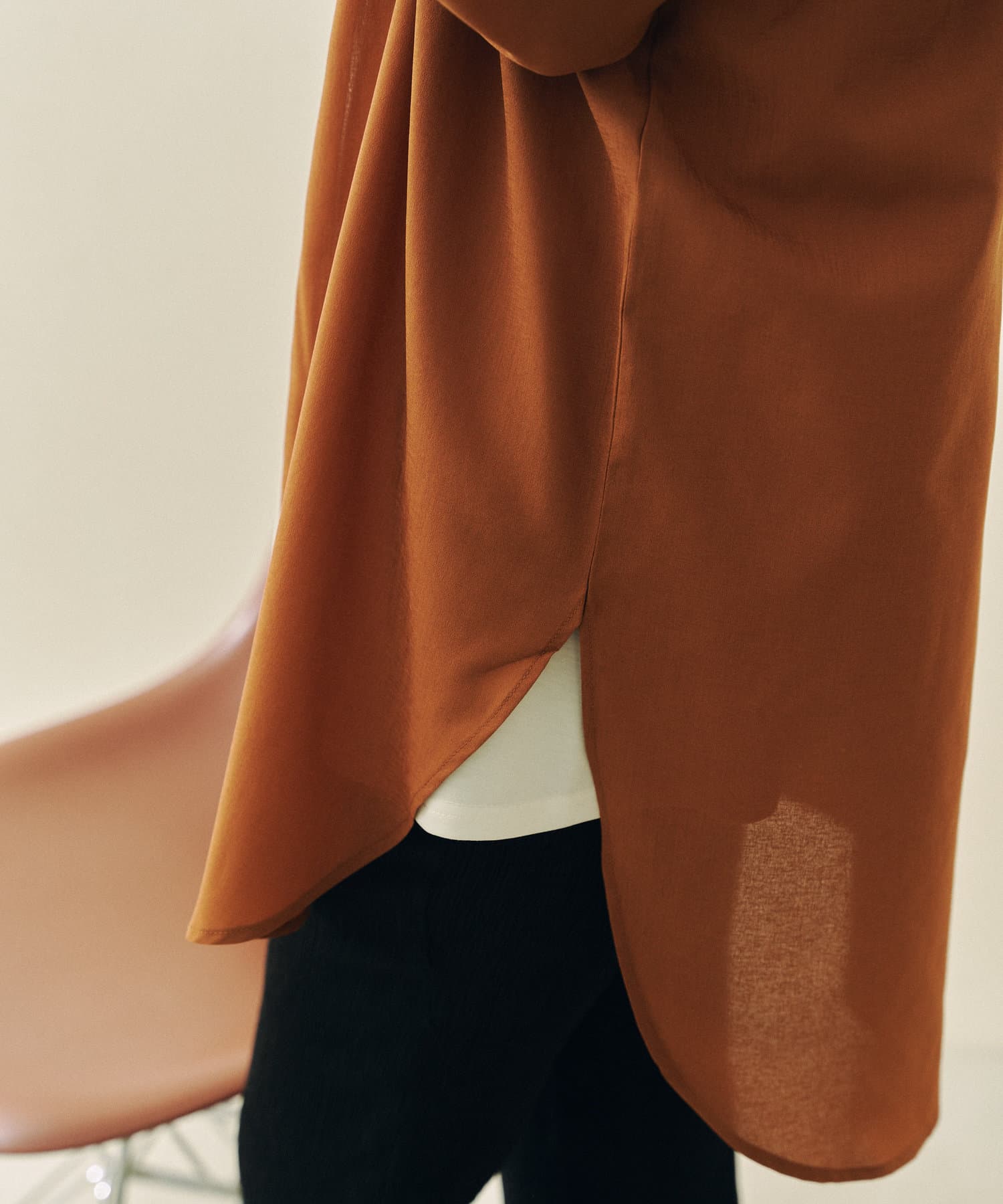 ・ゆったりとしたシルエットと落ち感のある素材感のシャツ。