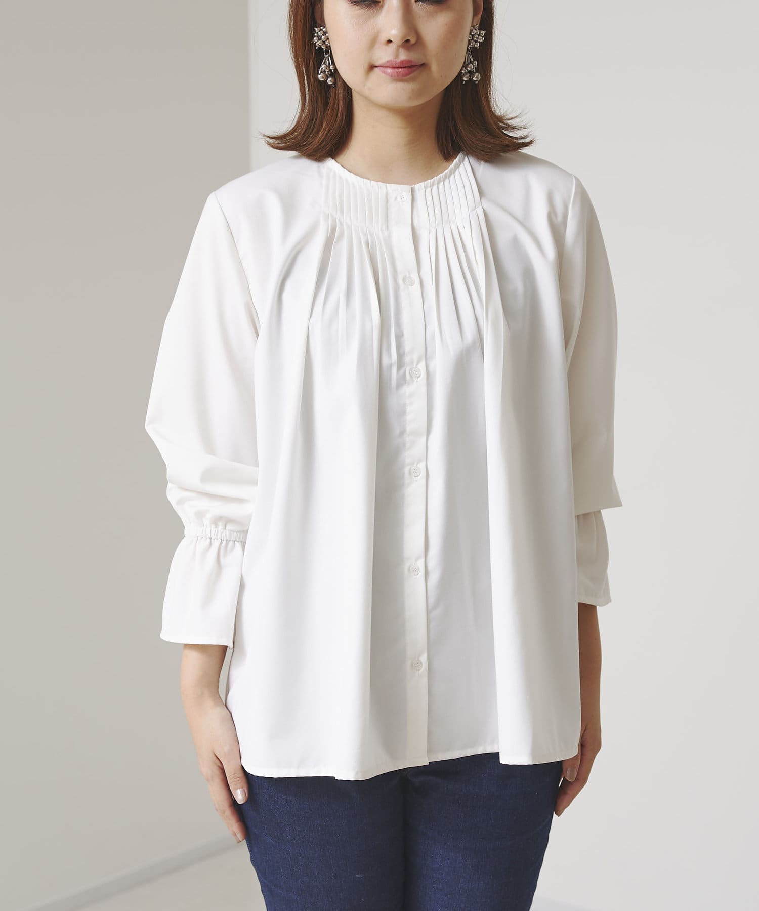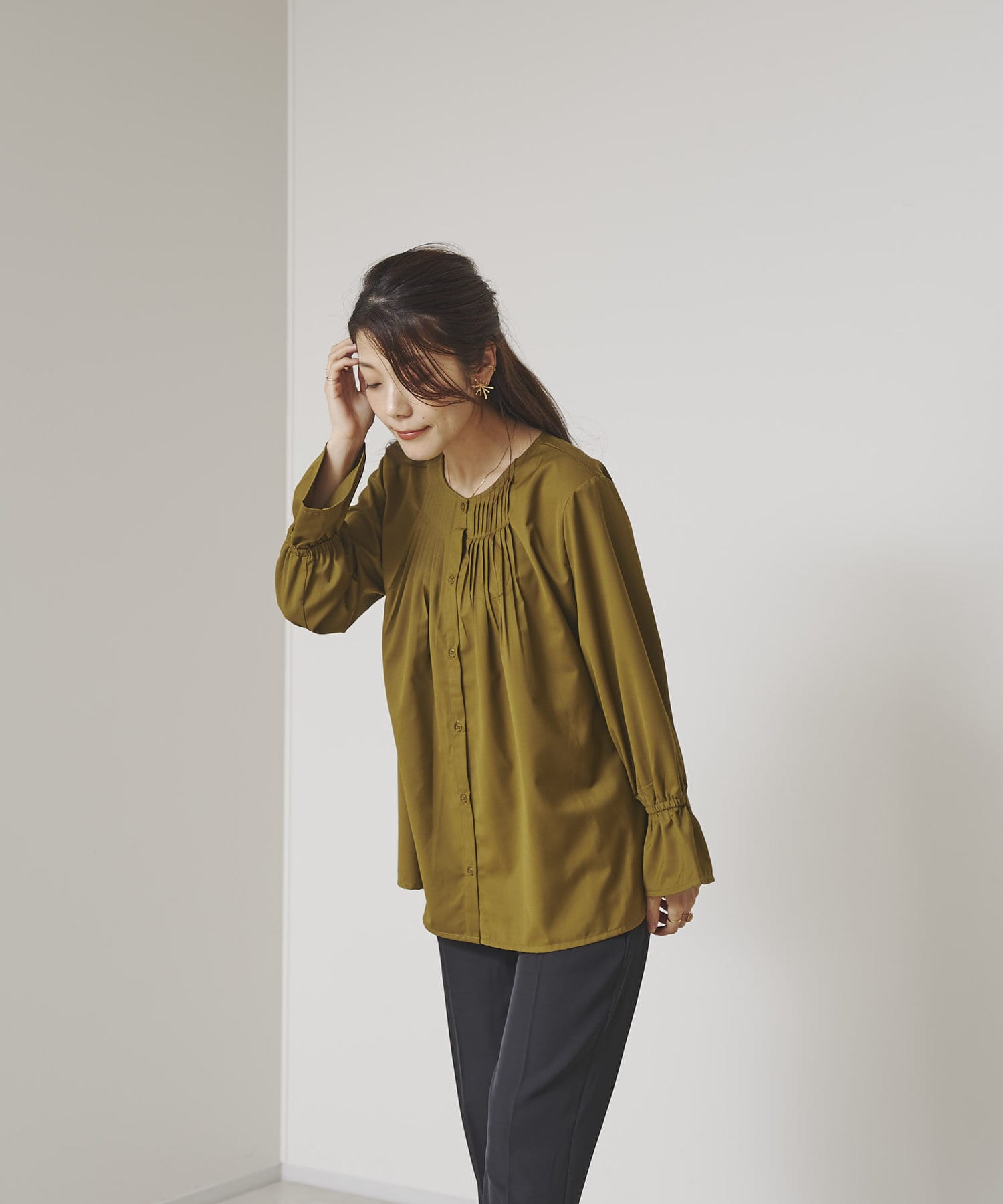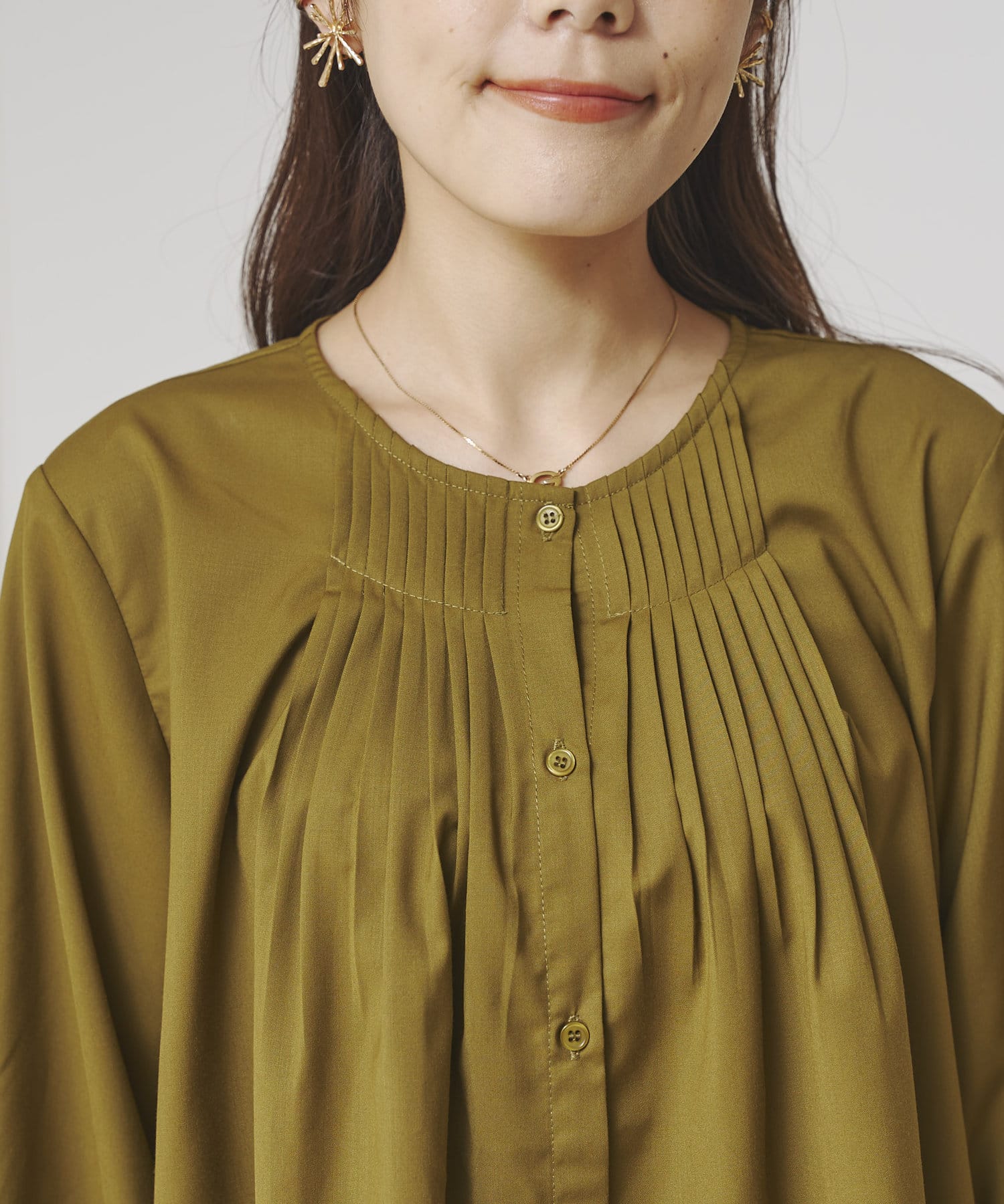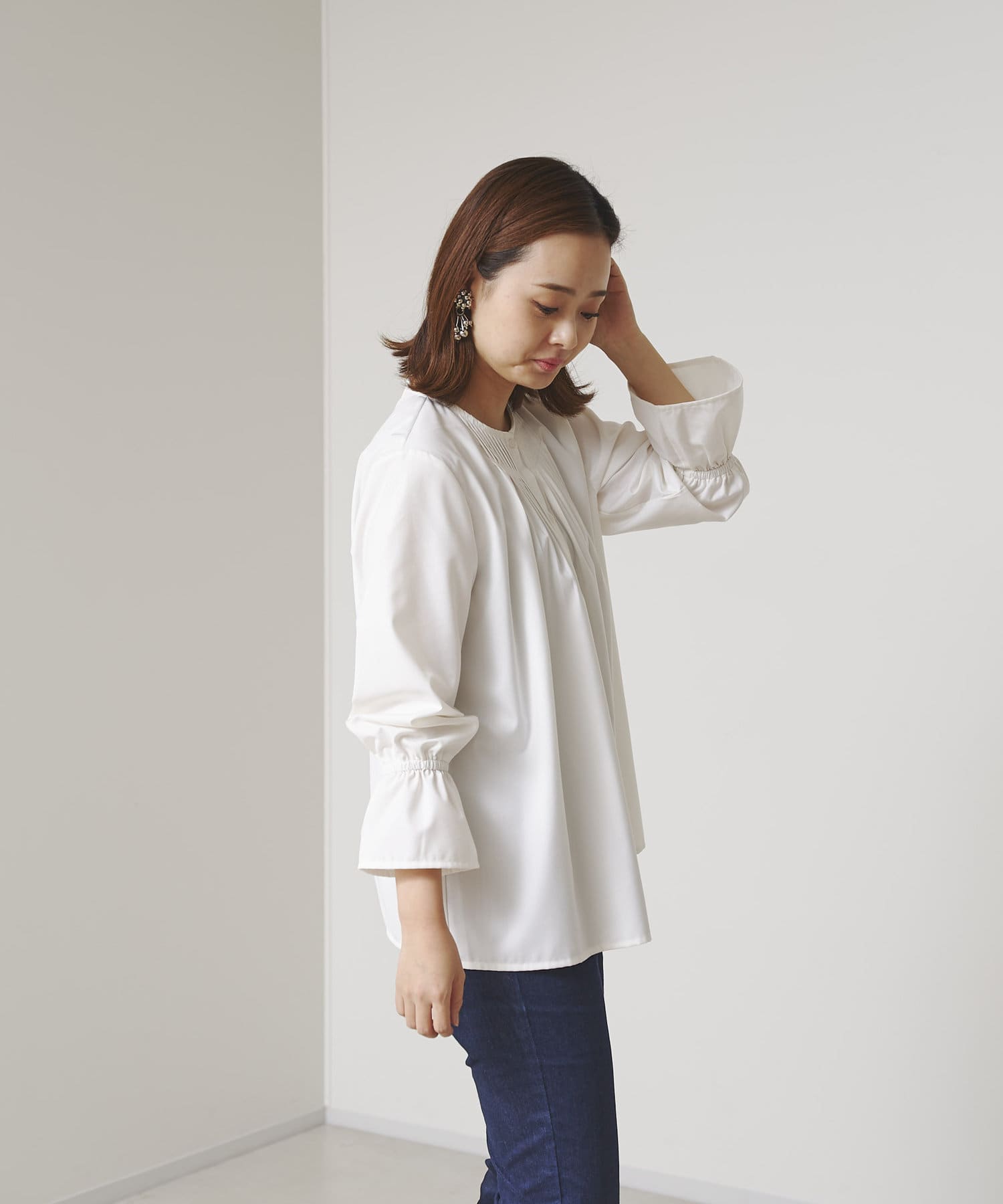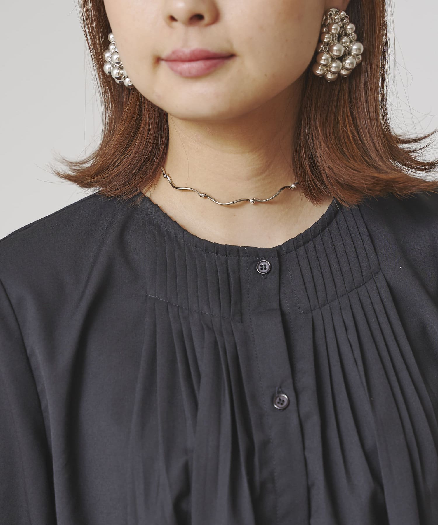 ・フロントのピンタックがネックレスなどなくても華やかな印象に。