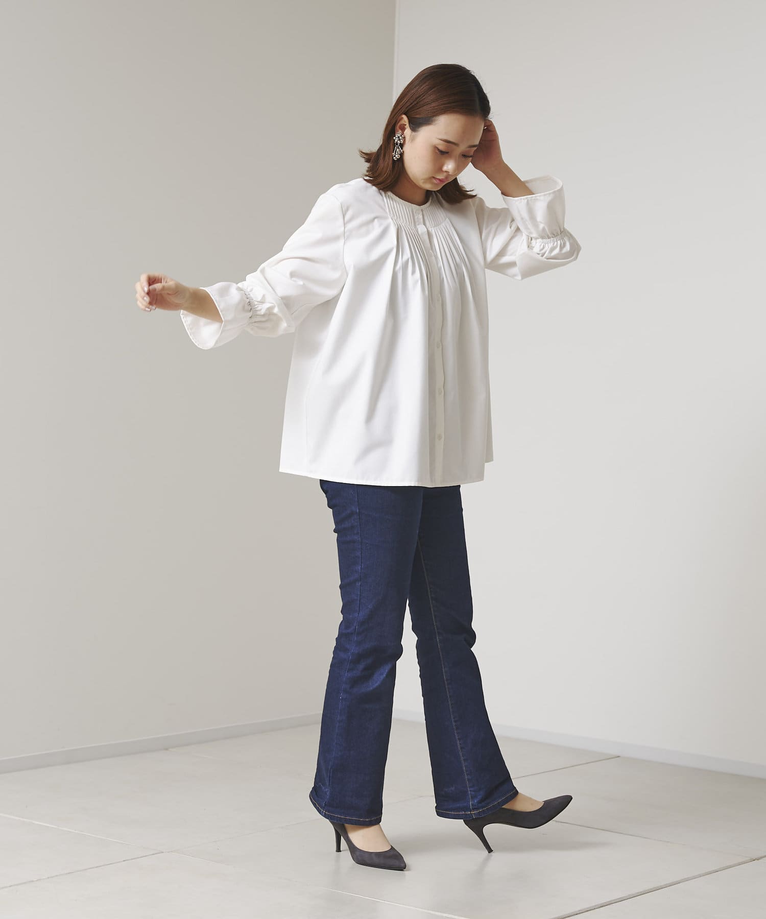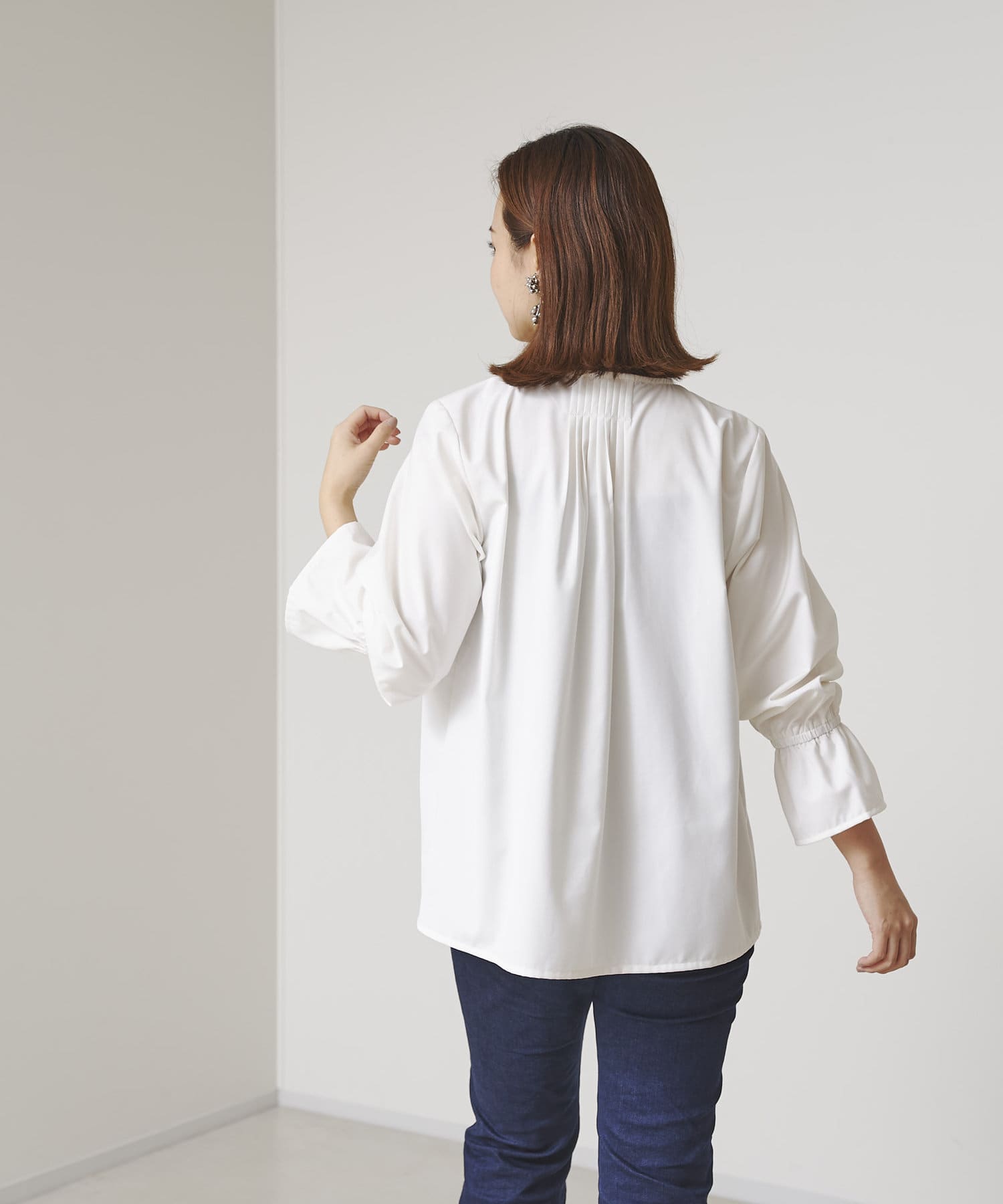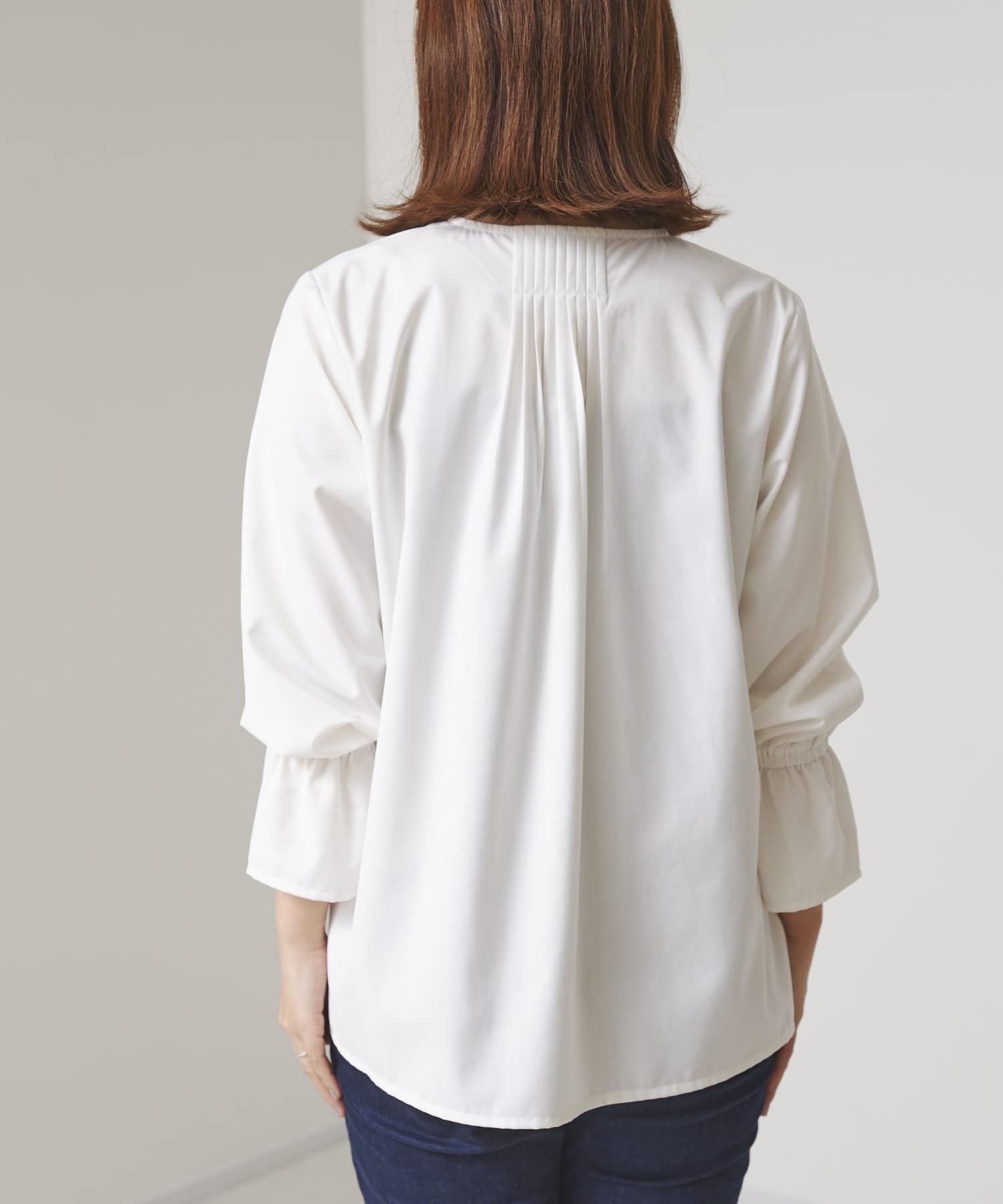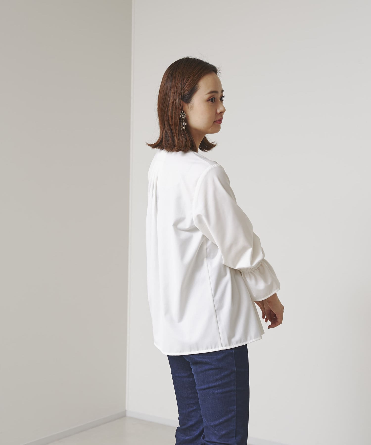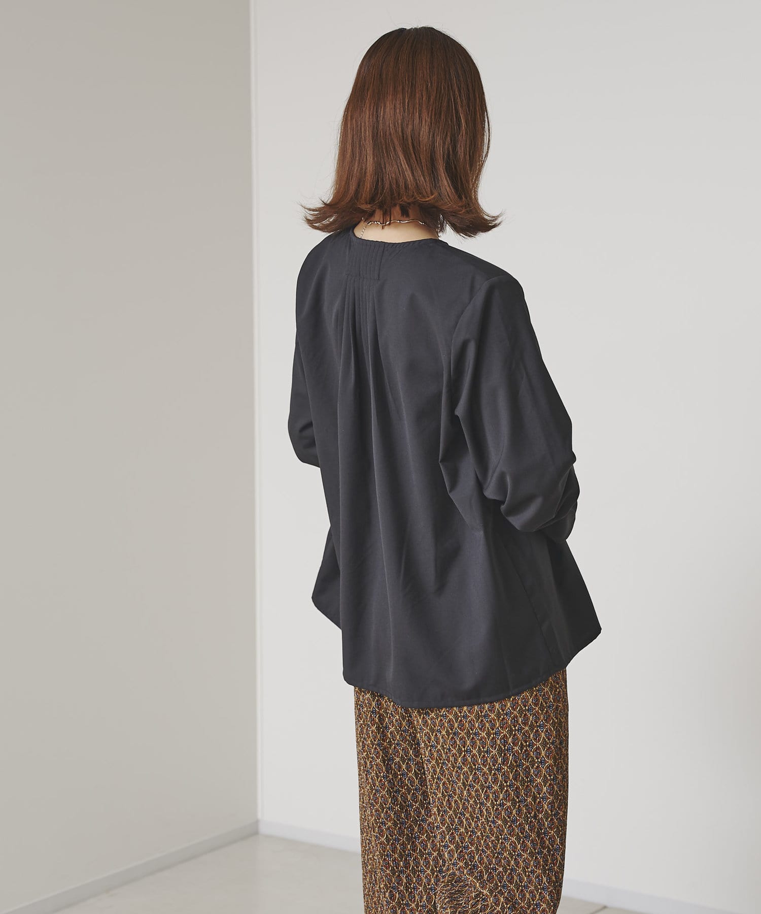 ・フロントのピンタックがネックレスなどなくても華やかな印象に。
