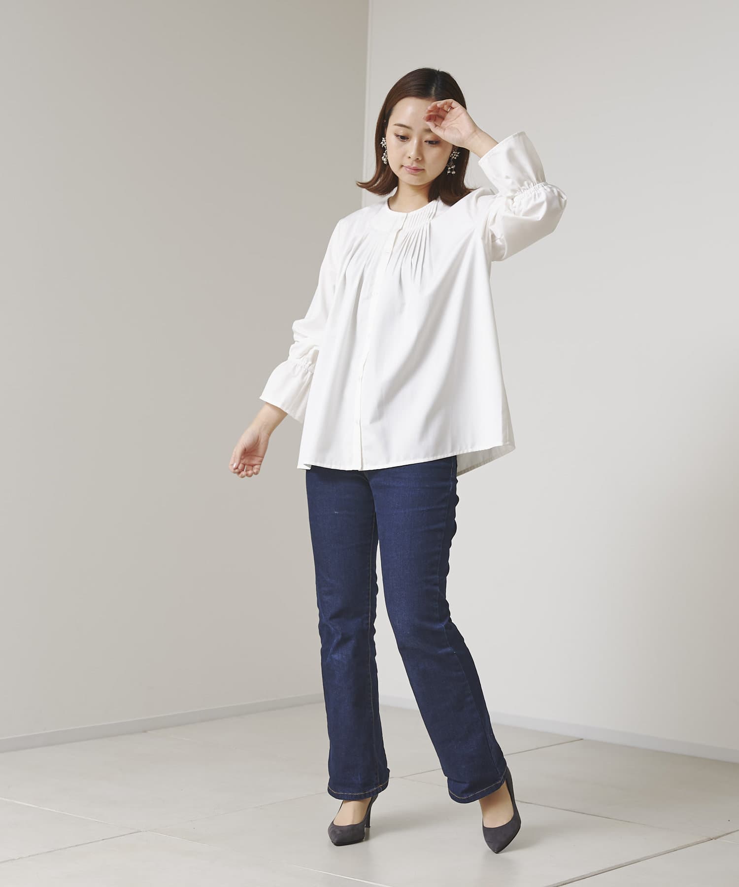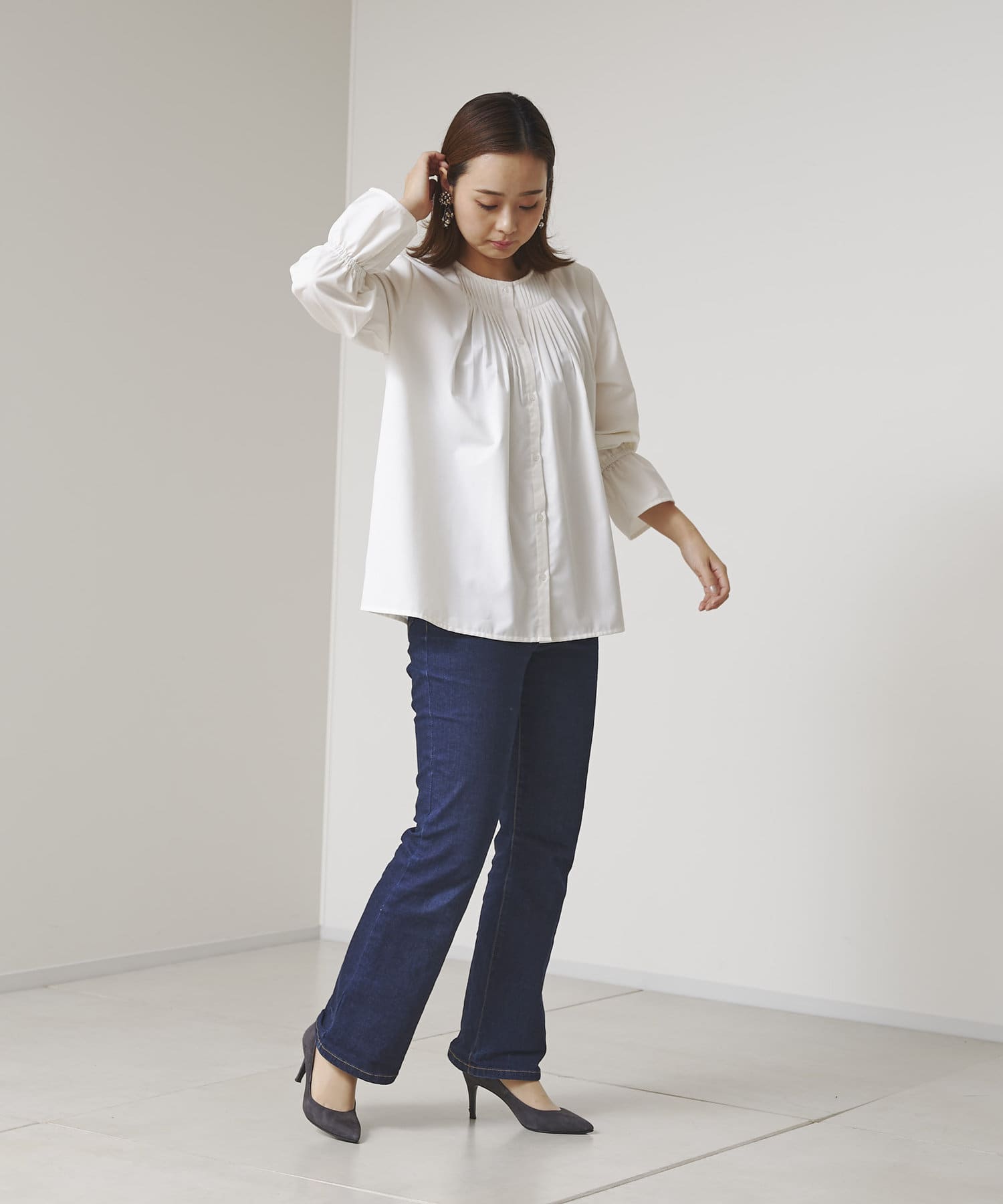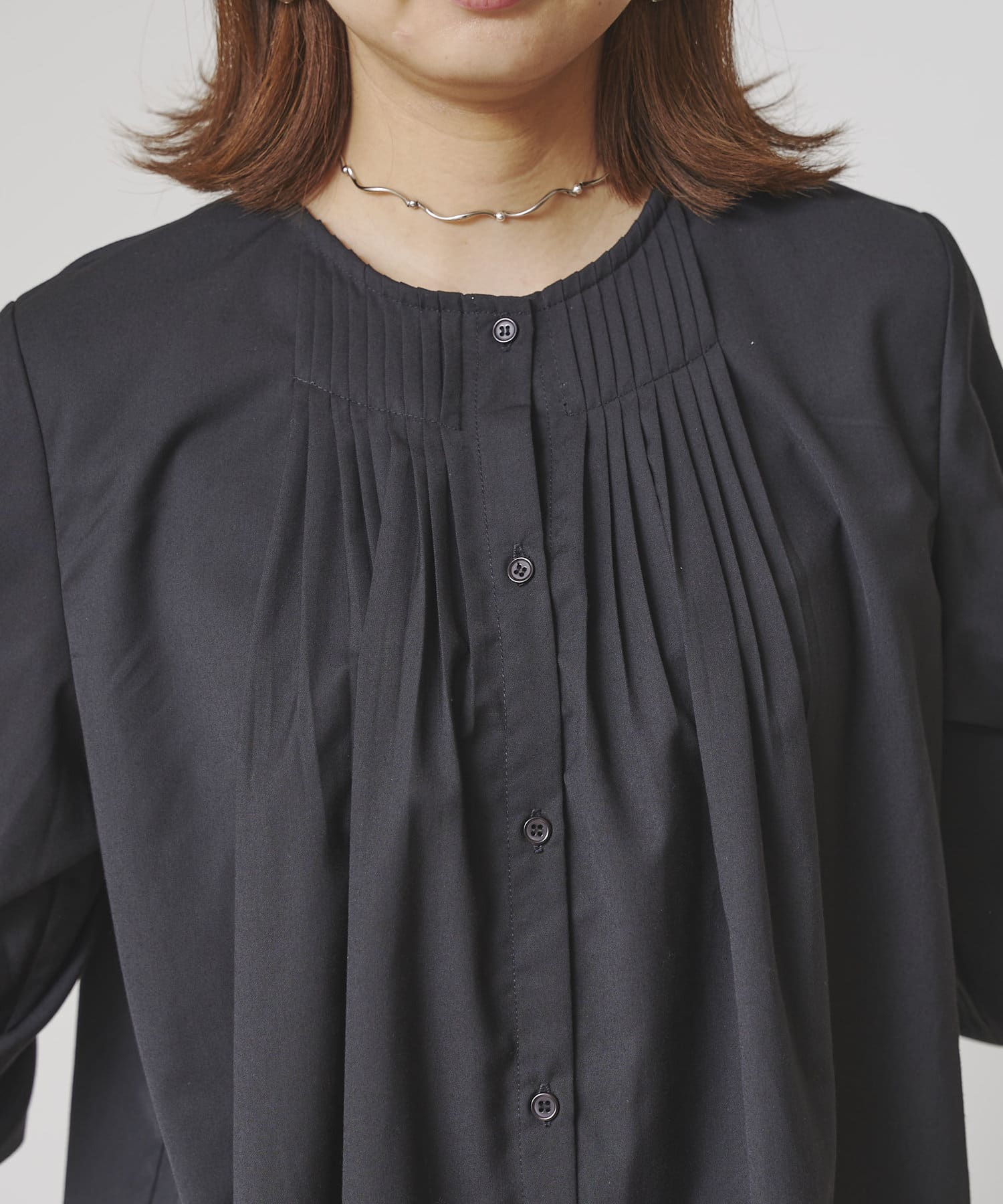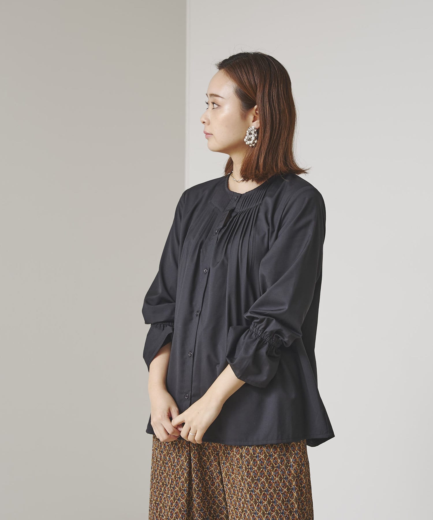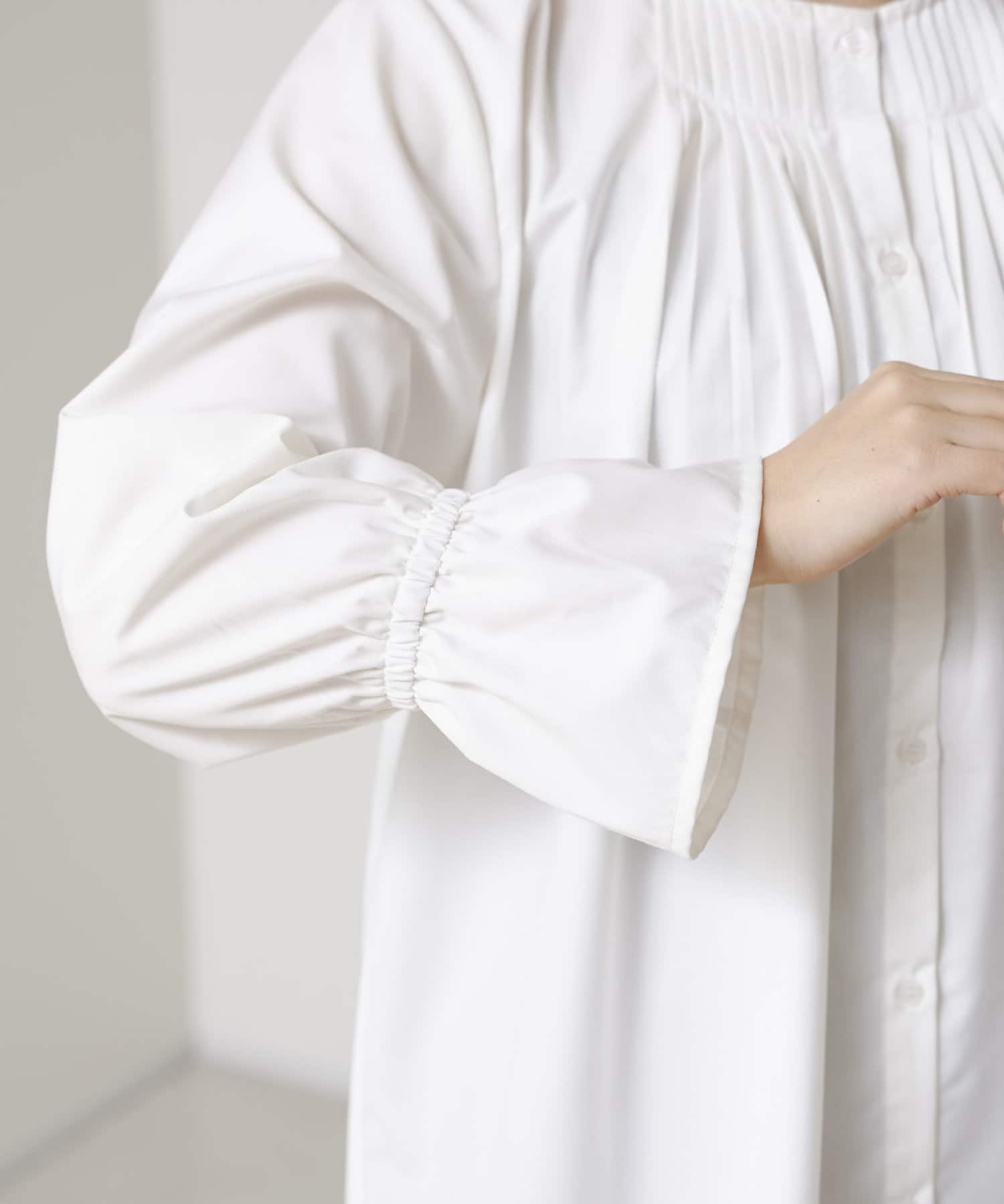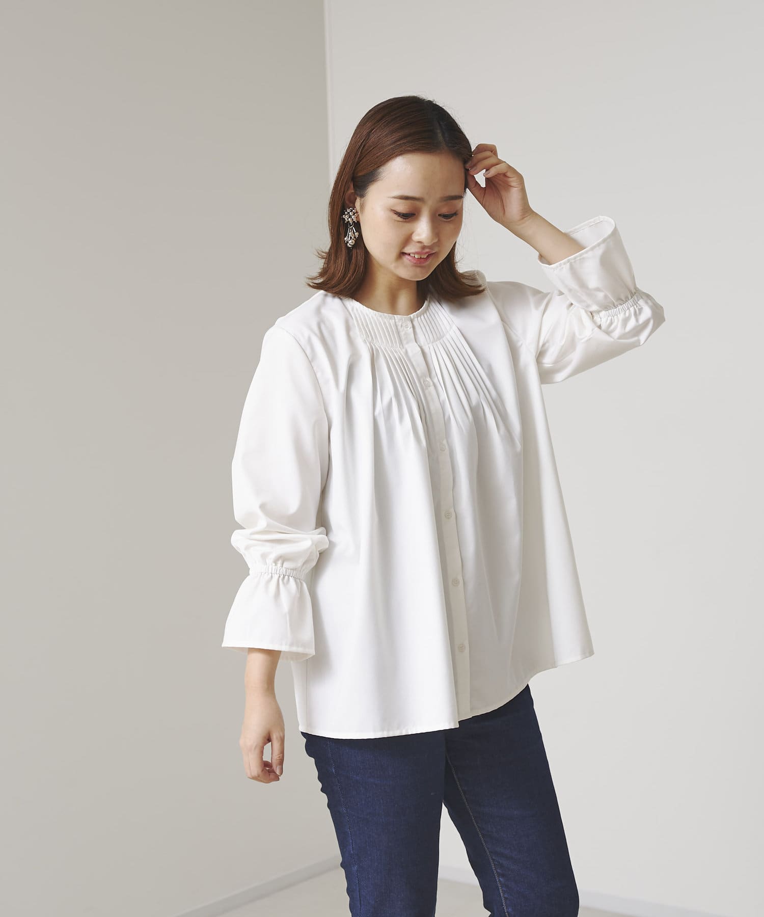 ・フロントのピンタックがネックレスなどなくても華やかな印象に。